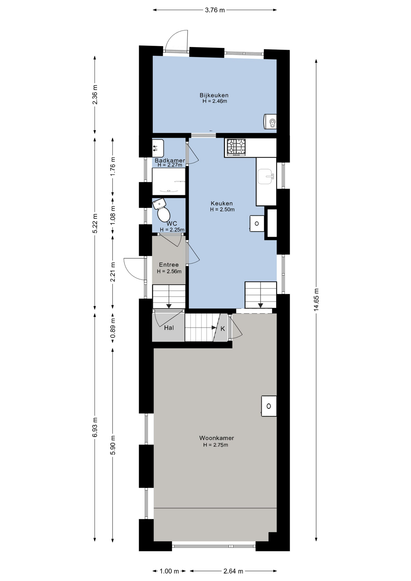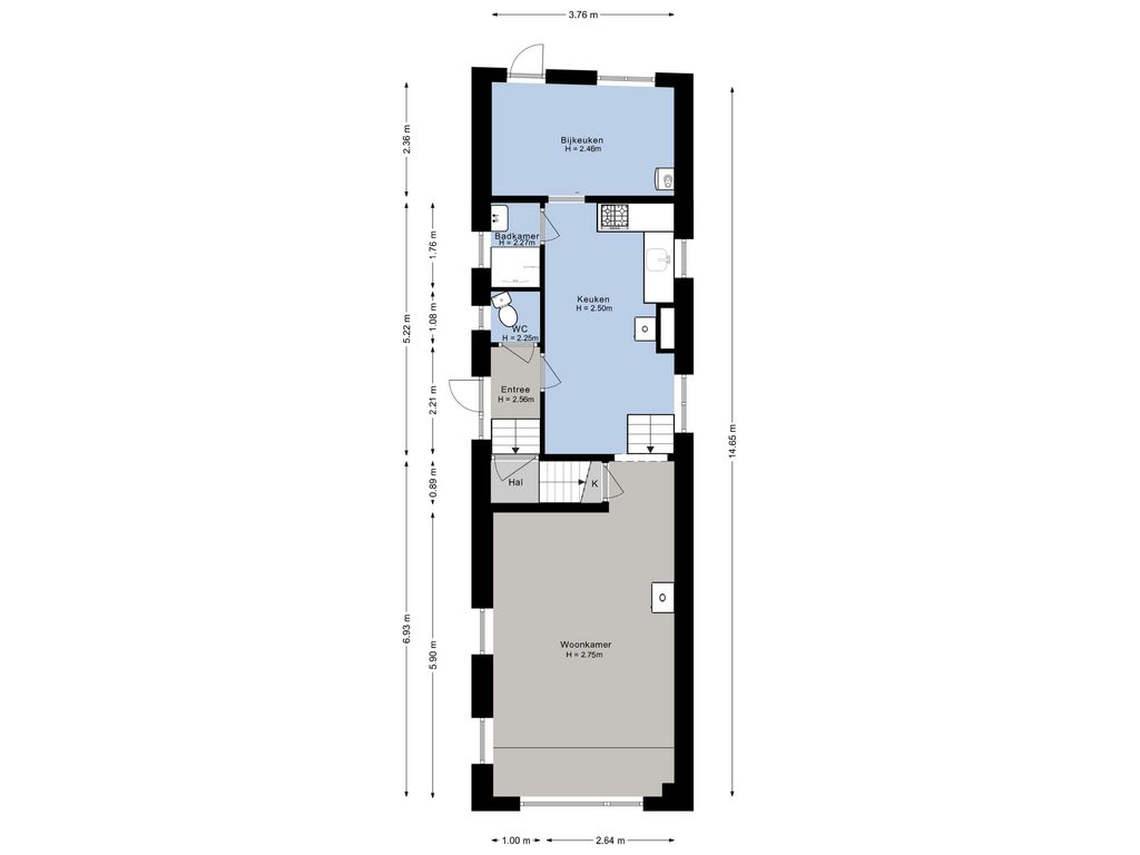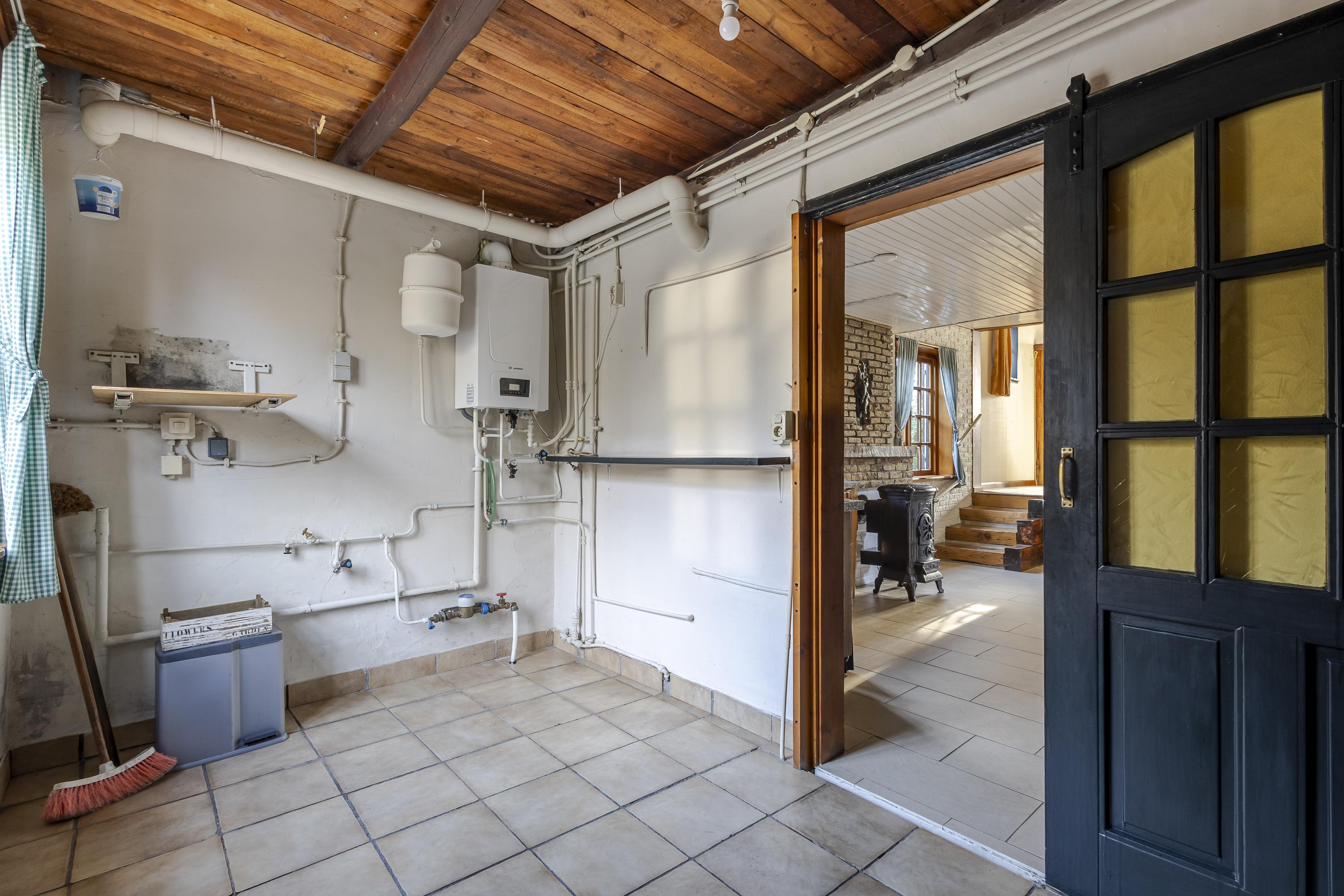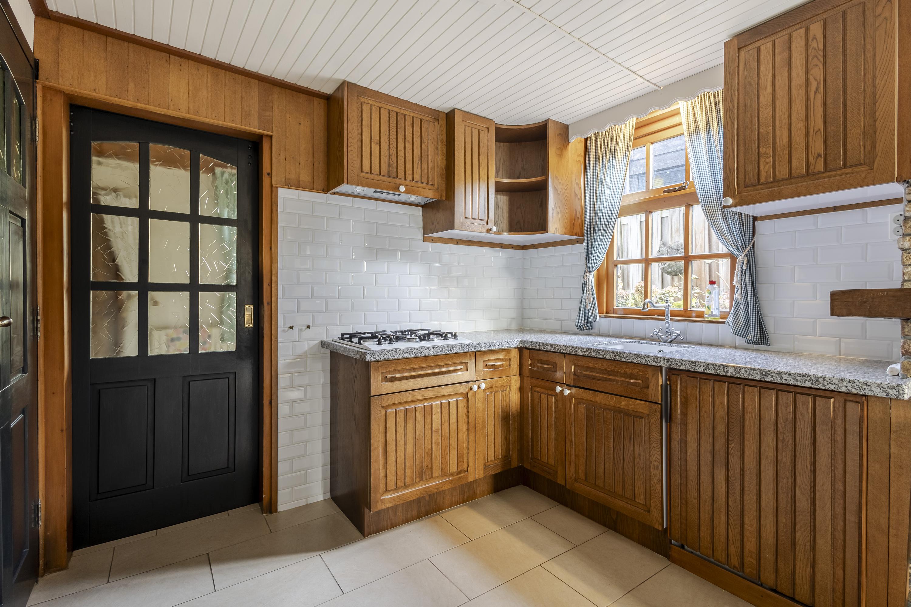 De begane grond is bestaat uit een woonkamer, keuken, badkamer, separaat toilet en bijkeuken. De woonkamer ligt aan de voorzijde en heeft door de grote raampartij veel lichtinval. Extra bijzonder zijn de glas in lood ramen in de woonkamer en het zichtbare balkenplafond. Zowel de keuken als de woonkamer zijn voorzien van een gashaard.