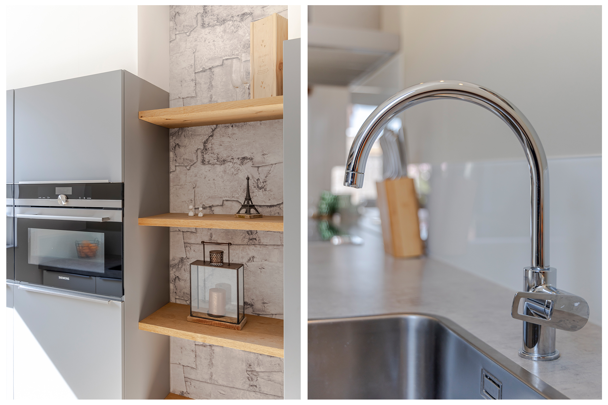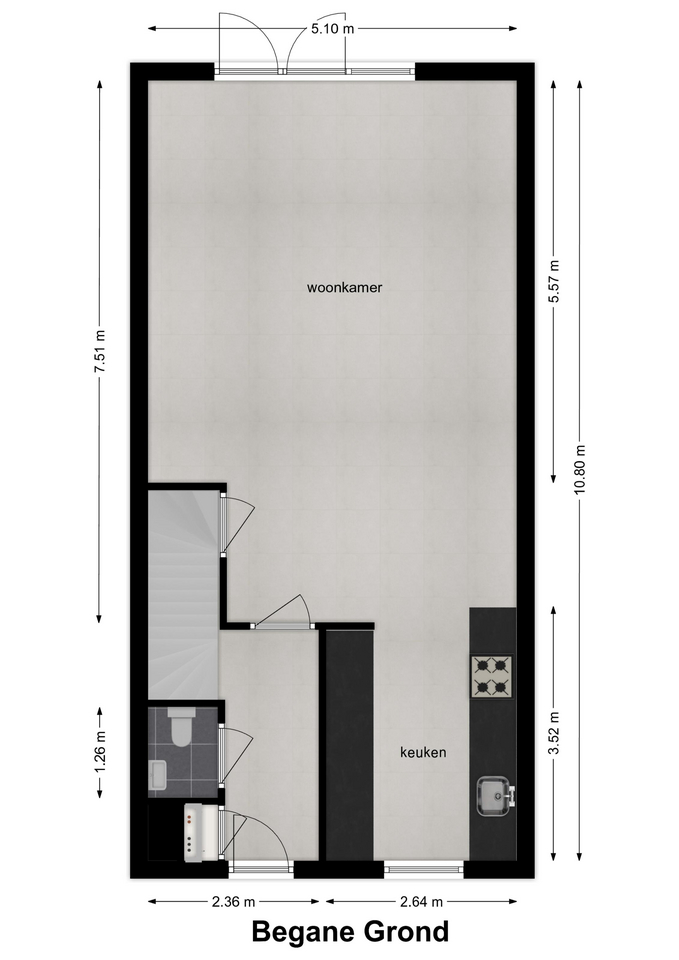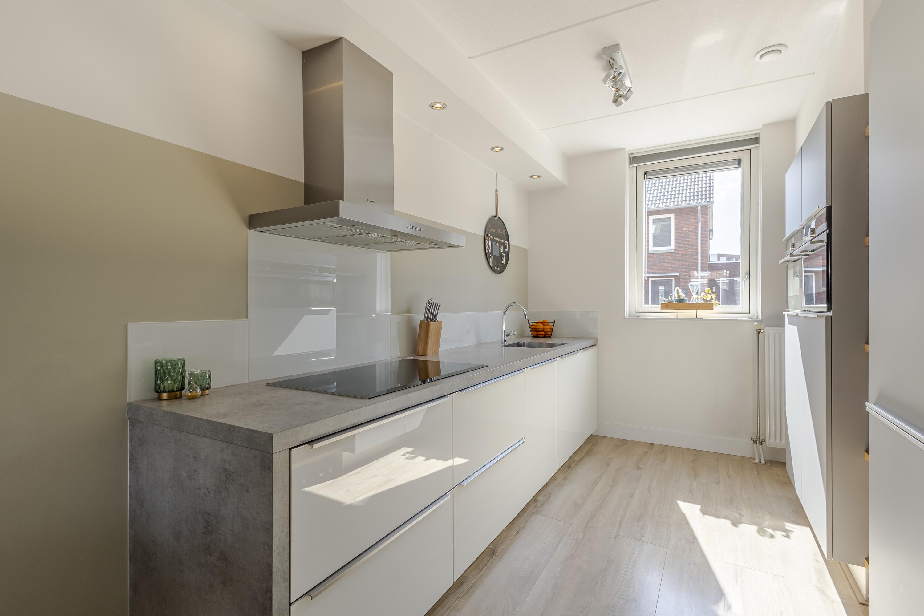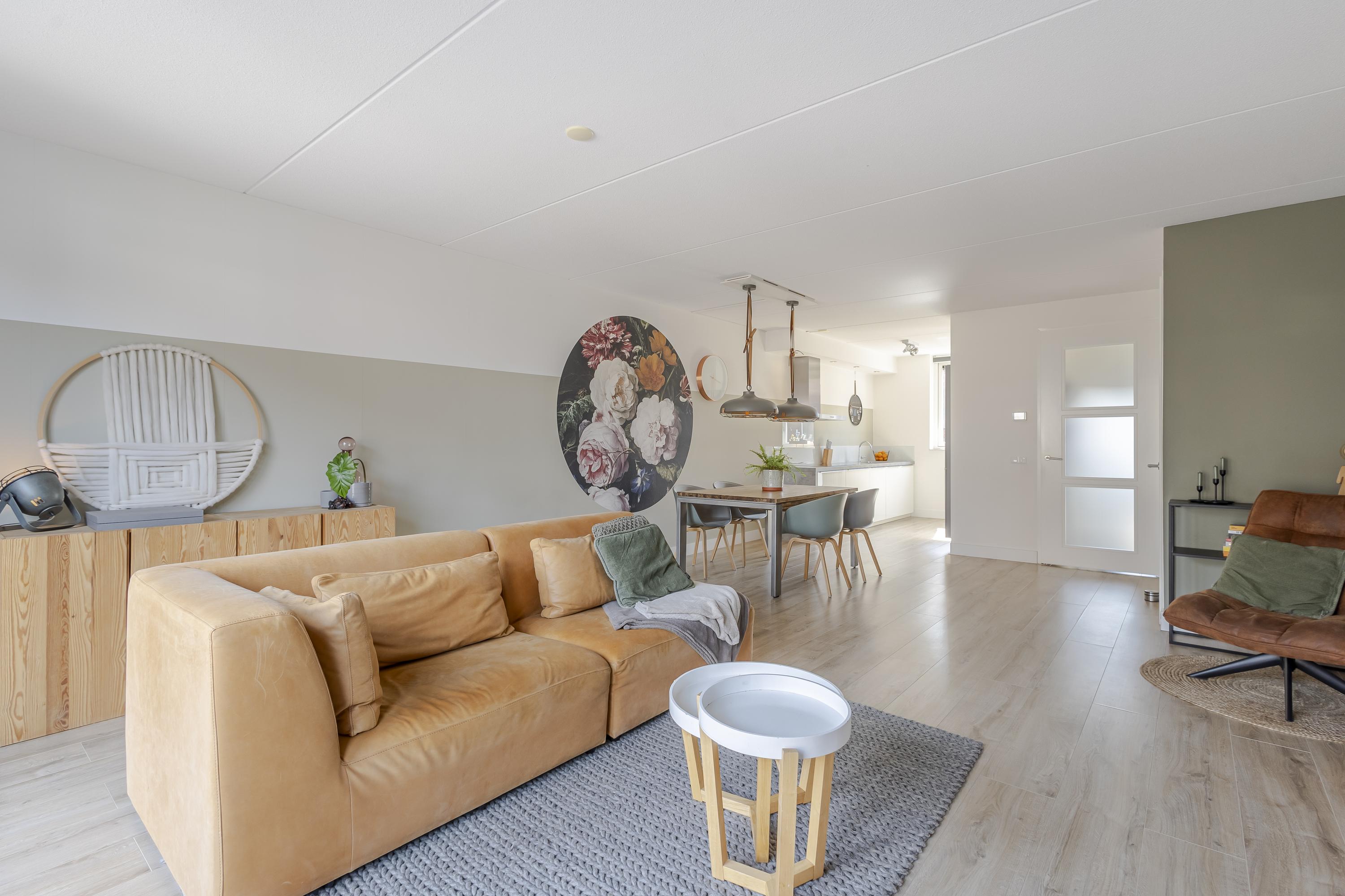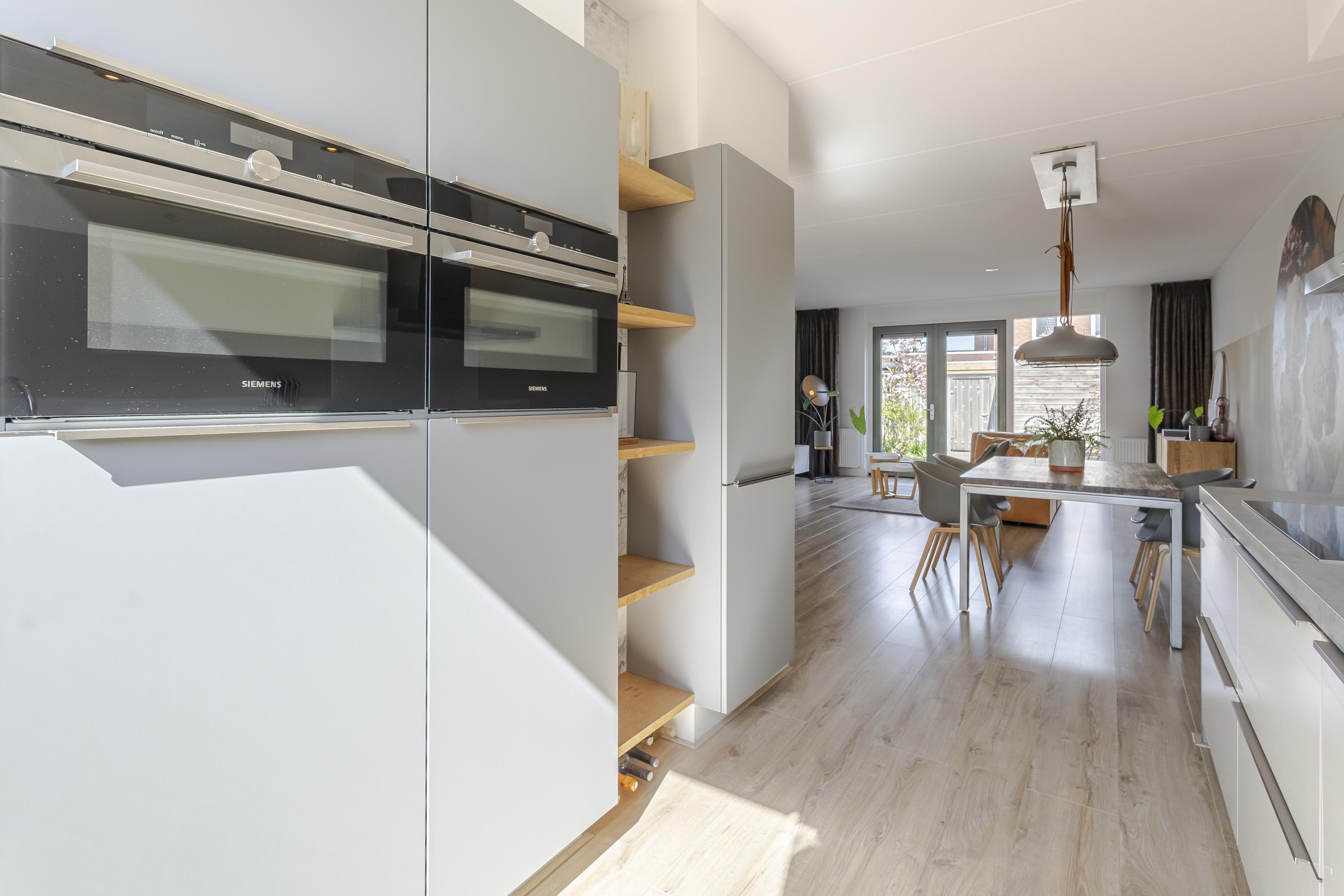 Vanuit de hal is, naast het toilet, de meterkast en trapopgang de royale woonkamer bereikbaar. De fraaie glaspartij in de aanbouw valt direct in het zicht evenals de moderne open keuken aan de voorzijde. Deze is uiteraard van allerlei inbouwapparatuur voorzien. Onder de trap is een ruime kast gerealiseerd.