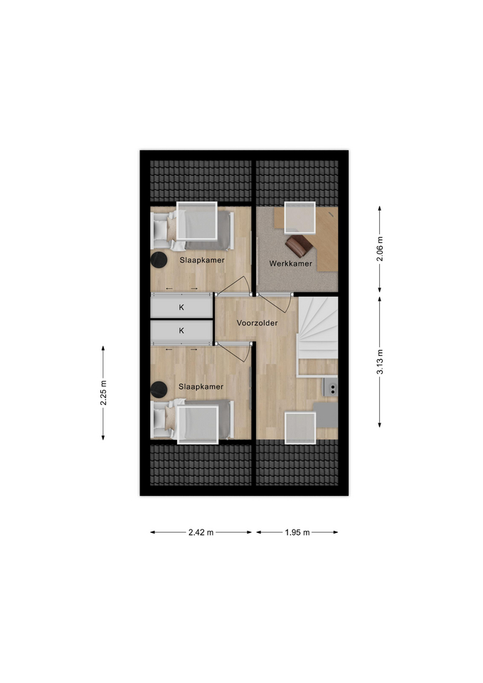De tweede verdieping biedt nog eens twee slaapkamers, een aparte werkkamer (ook geschikt als extra slaapkamer) én een ruime voorzolder. Deze voorzolder is momenteel in gebruik als wasruimte, maar biedt daarnaast volop bergruimte.