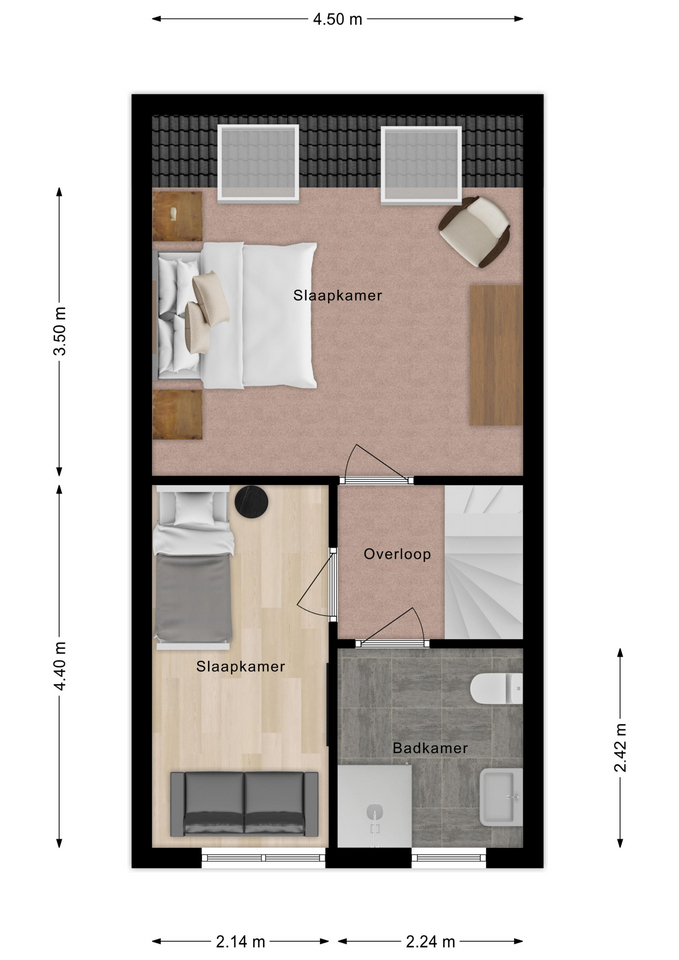Op de eerste verdieping zijn twee grote slaapkamers en een moderne badkamer. De kamers zijn licht en praktisch ingedeeld, met voldoende ruimte voor kasten of werkplekken.