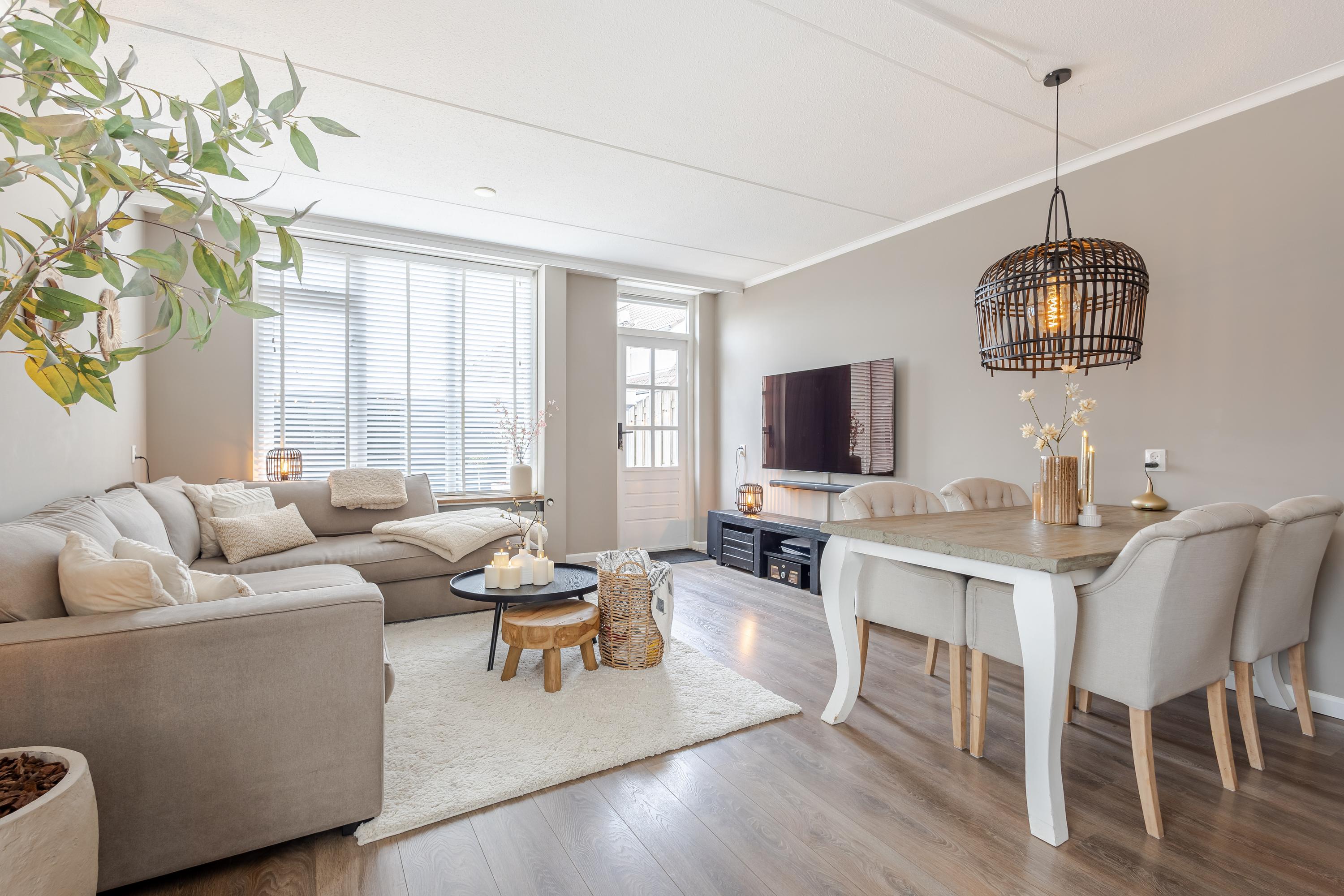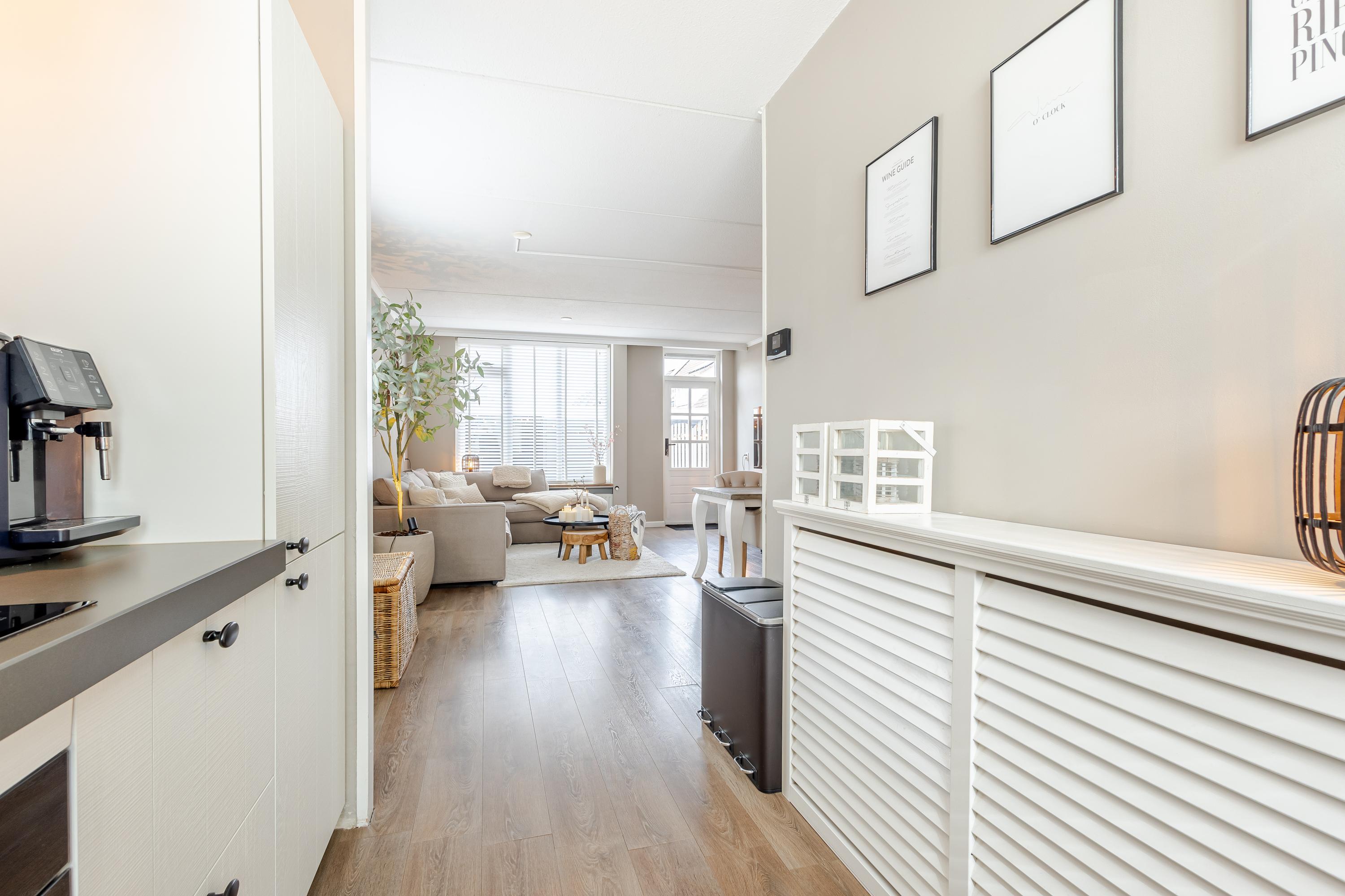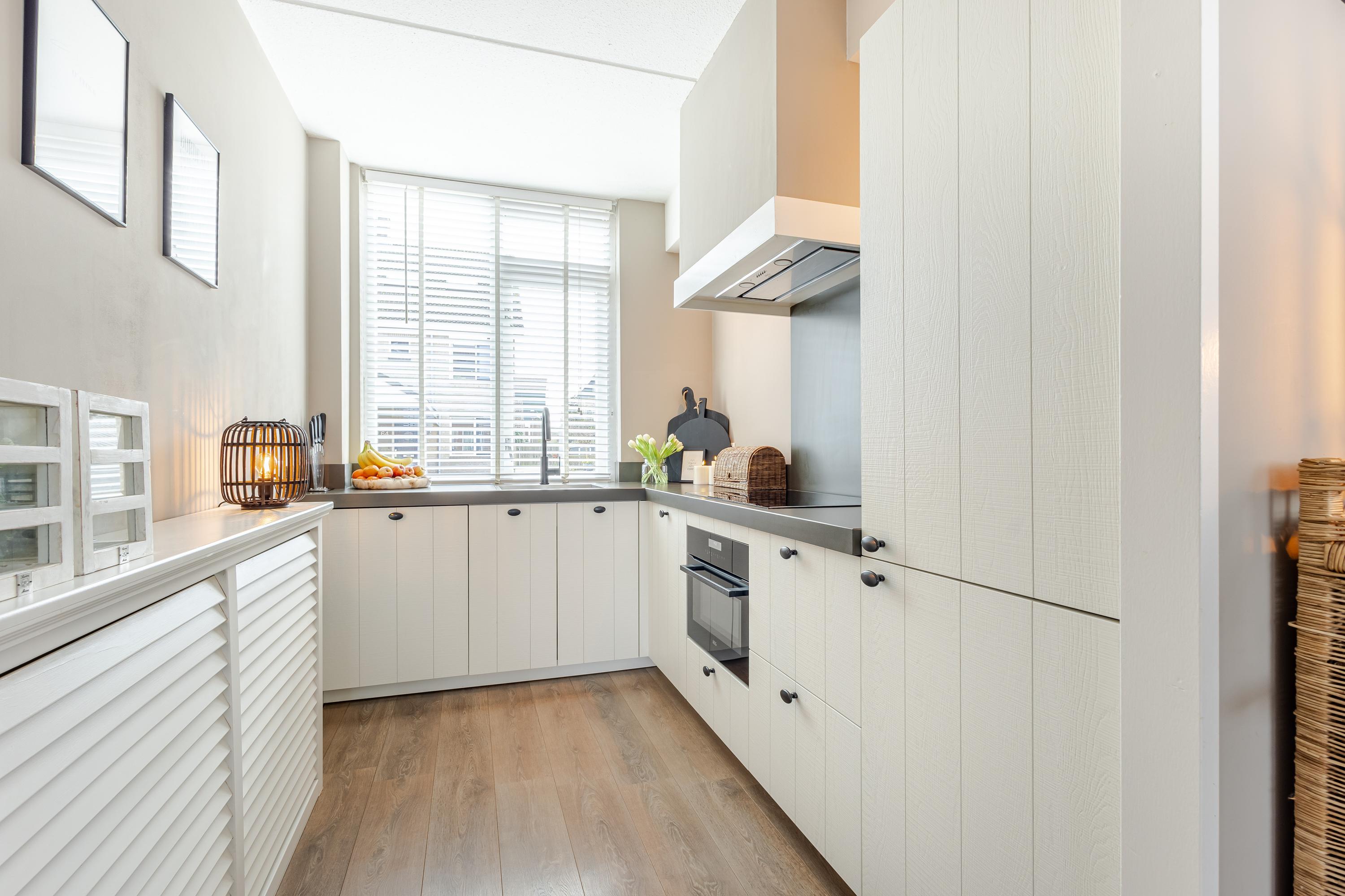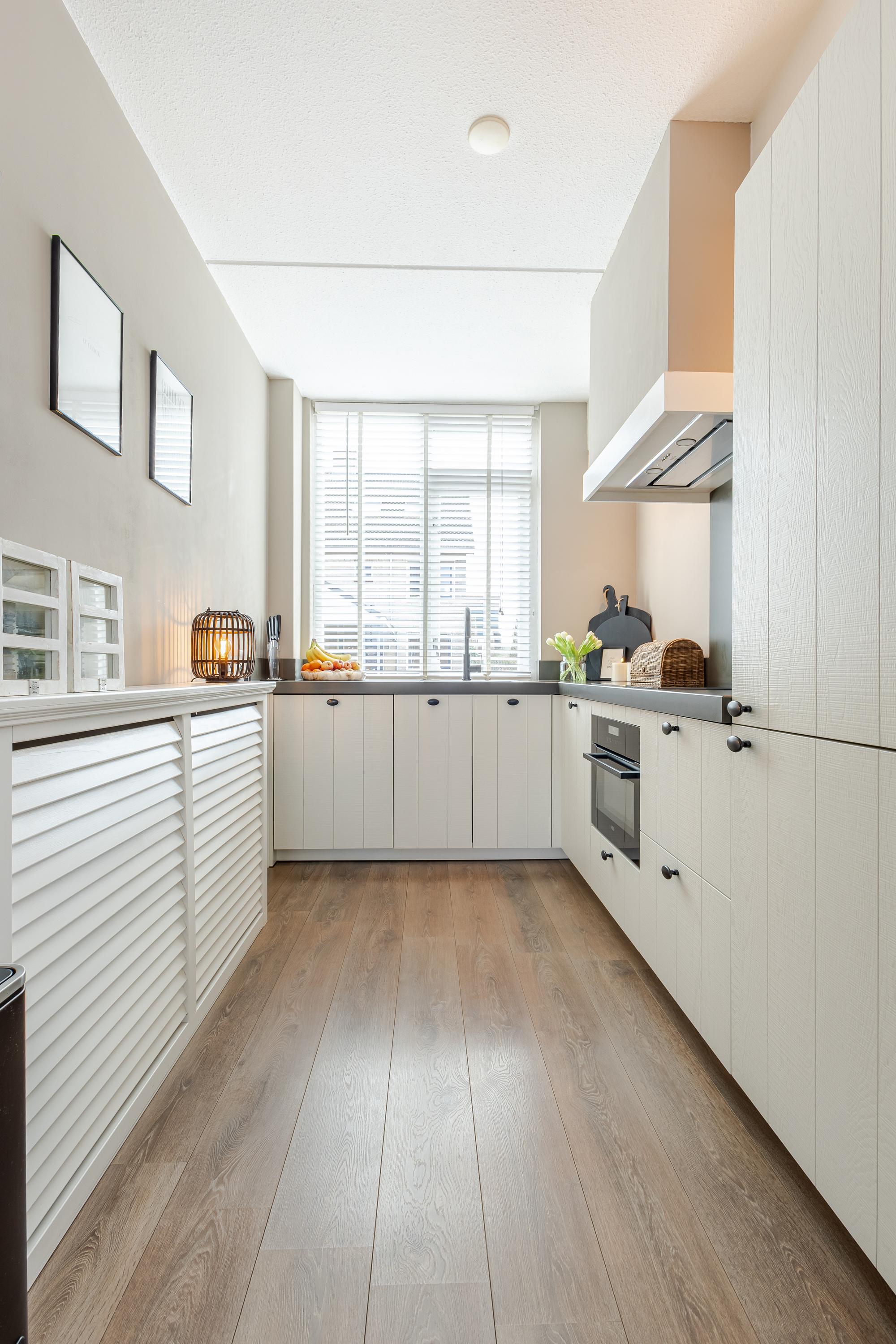 Via de ruime hal met moderne meterkast, toilet en trapopgang kom je in de verrassend lichte woonkamer. Het extra raam in de zijgevel zorgt voor een prachtige, natuurlijke lichtinval. Aan de voorzijde bevindt zich de open keuken in een lichte hoekopstelling, voorzien van diverse inbouwapparatuur. Een fijne plek waar koken en gezelligheid moeiteloos samenkomen.