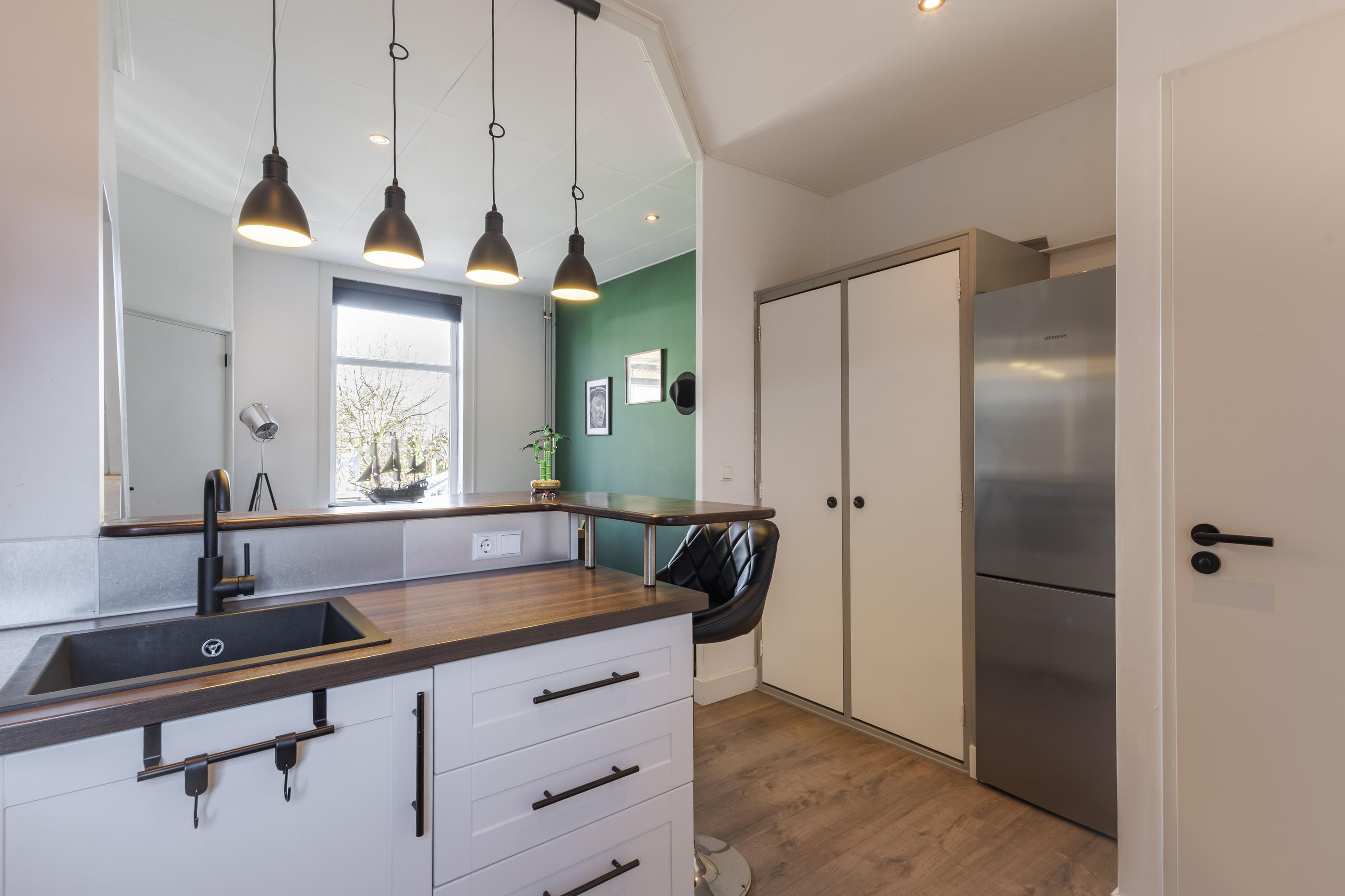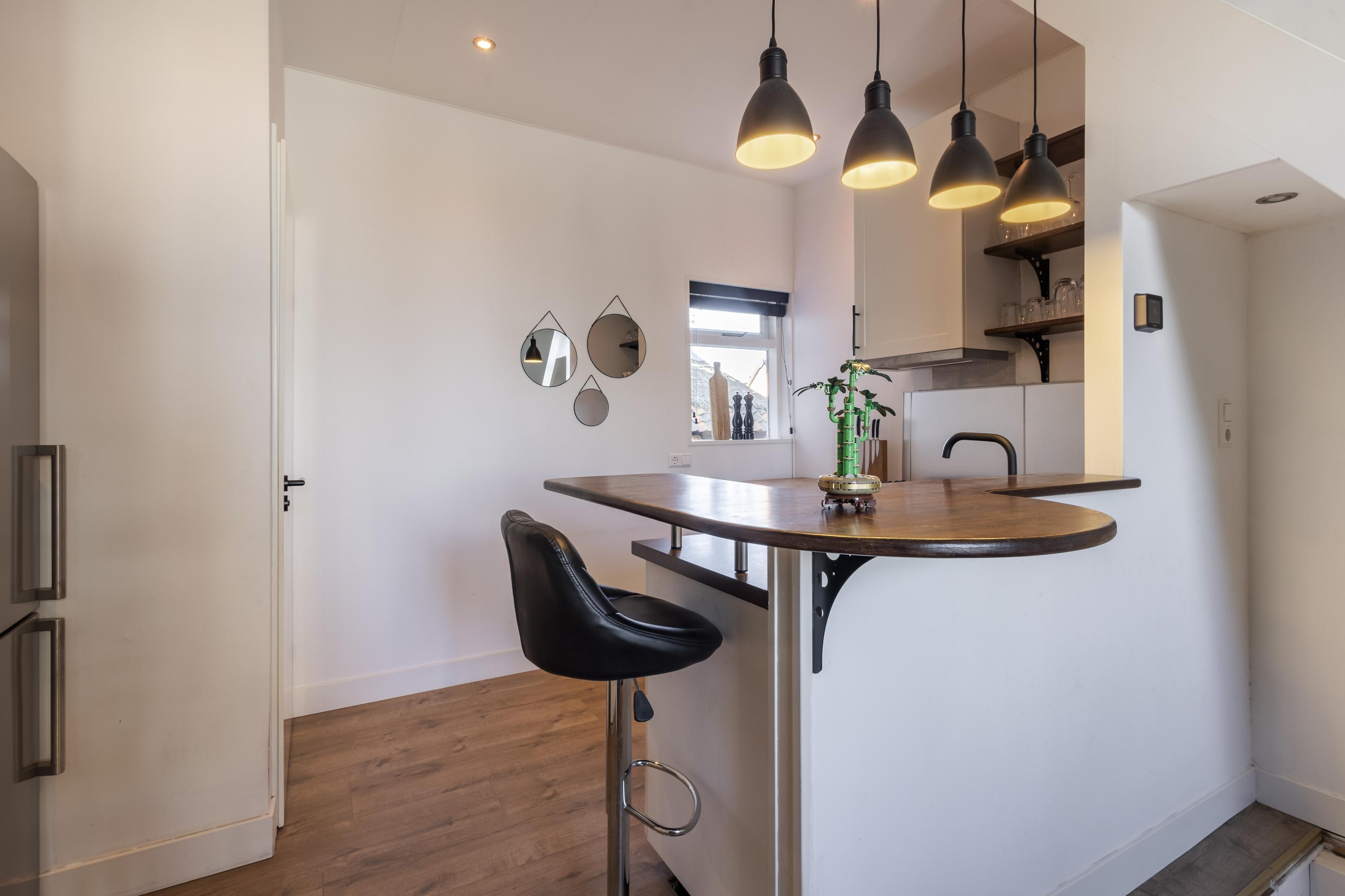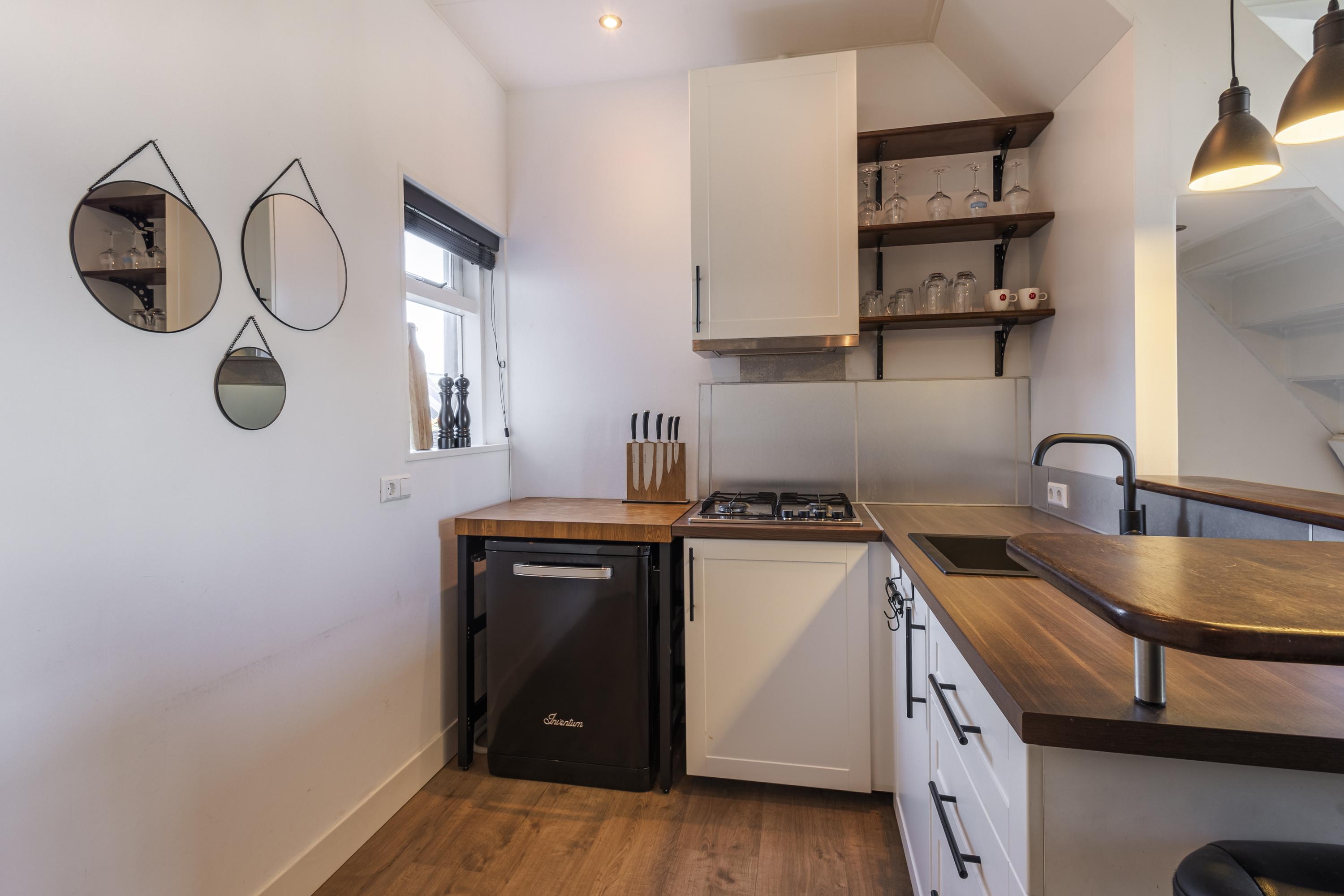 Op dijkniveau stap je via een kleine hal met meterkast binnen in de gezellige keuken met eethoek. Echt zo’n plek waar je ’s ochtends rustig wakker wordt met een kop koffie of ’s avonds lekker lang natafelt. Ook vind je hier een separaat toilet.