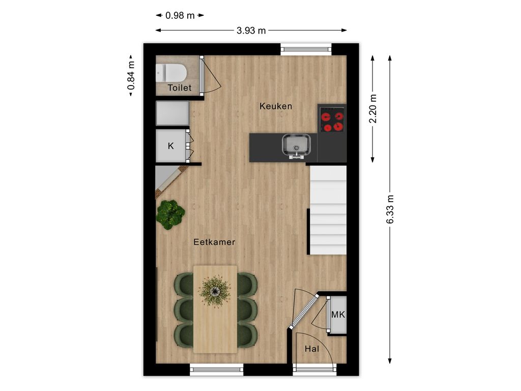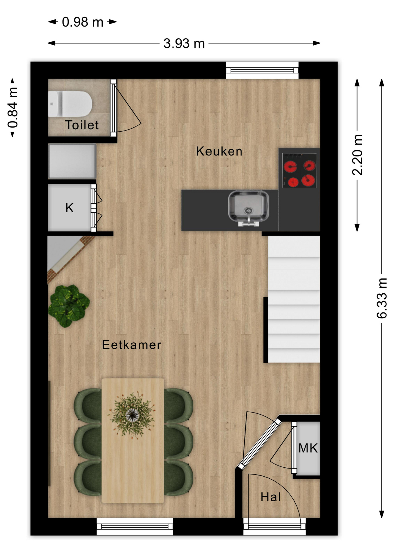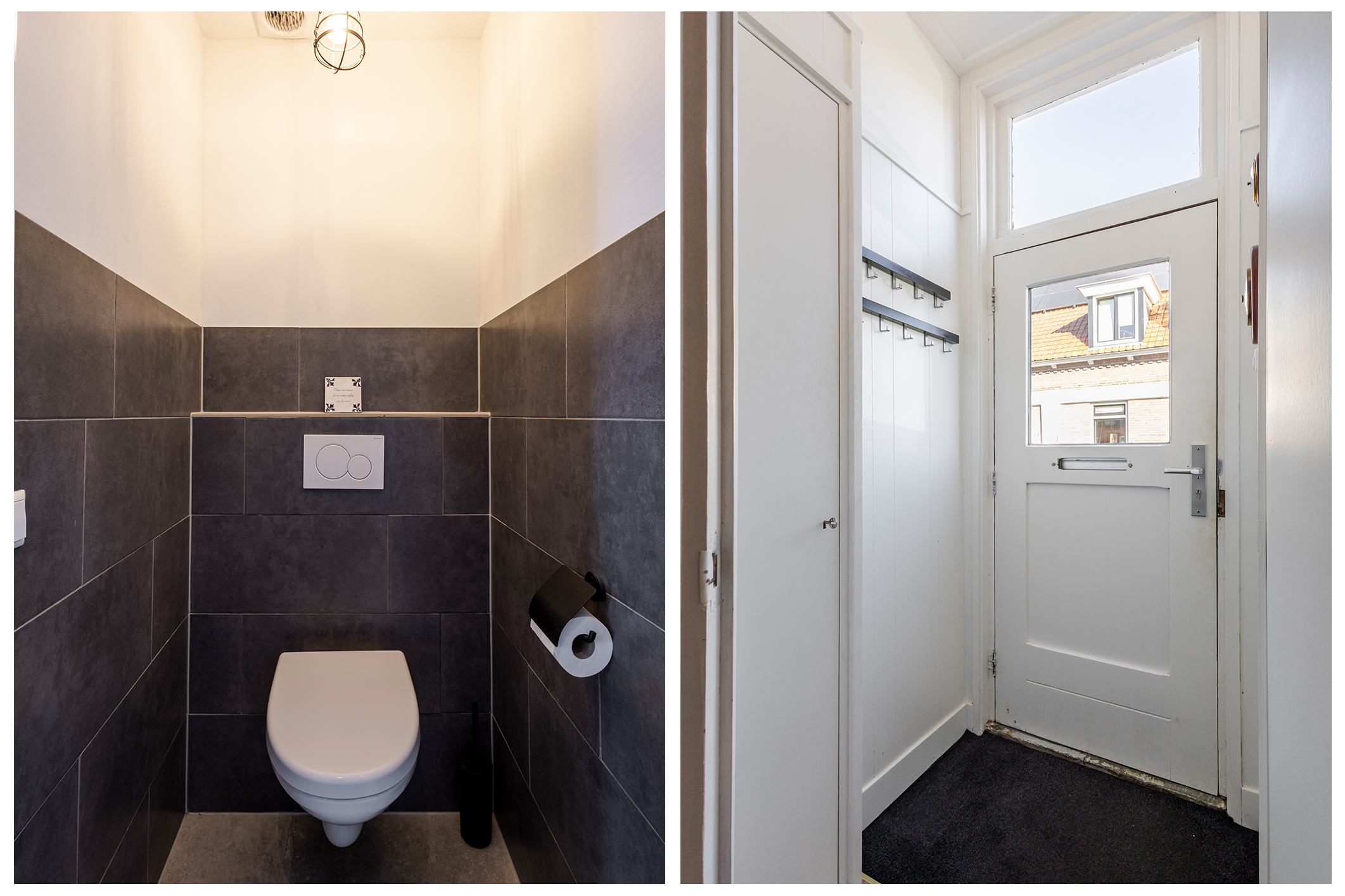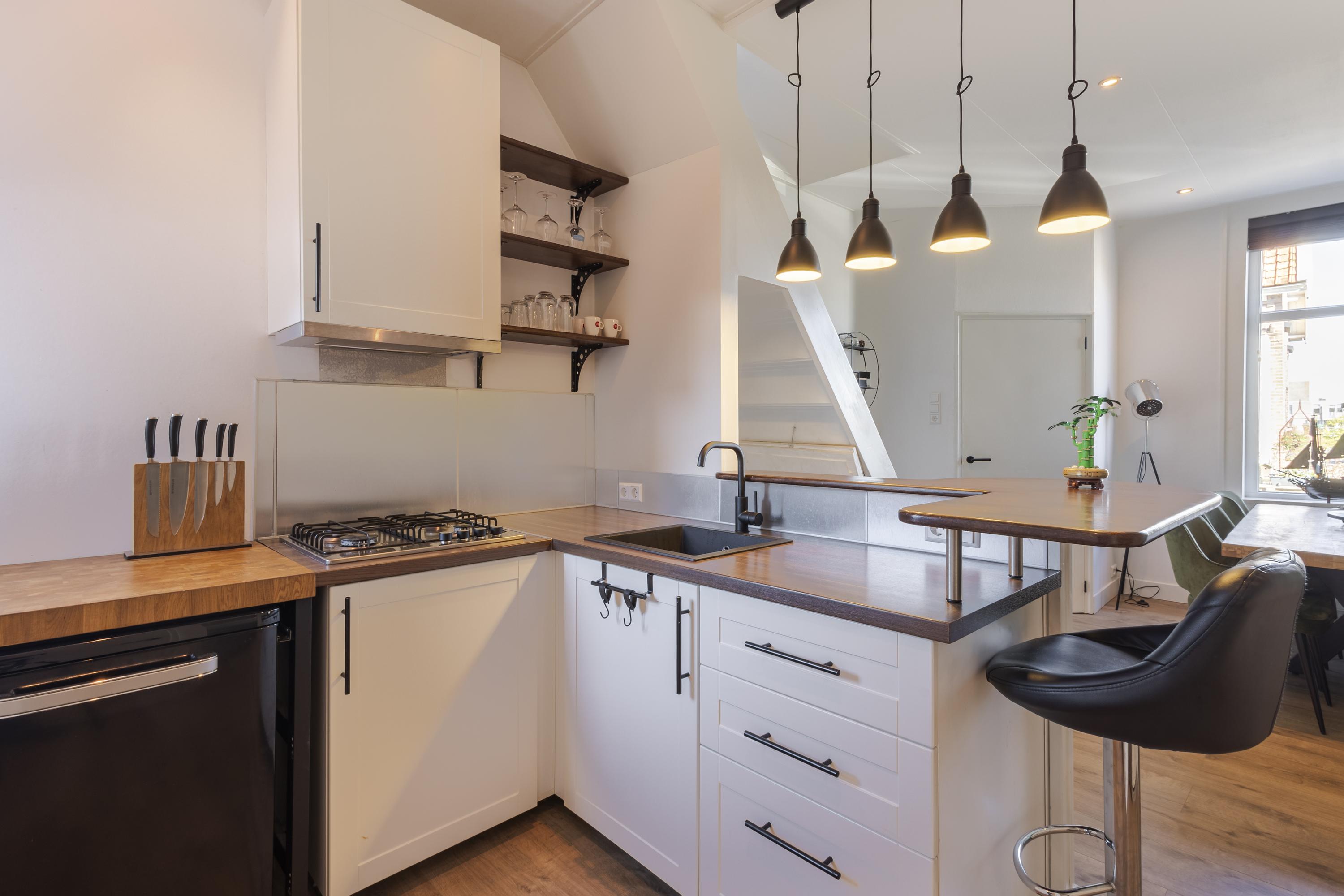 Op dijkniveau stap je via een kleine hal met meterkast binnen in de gezellige keuken met eethoek. Echt zo’n plek waar je ’s ochtends rustig wakker wordt met een kop koffie of ’s avonds lekker lang natafelt. Ook vind je hier een separaat toilet.