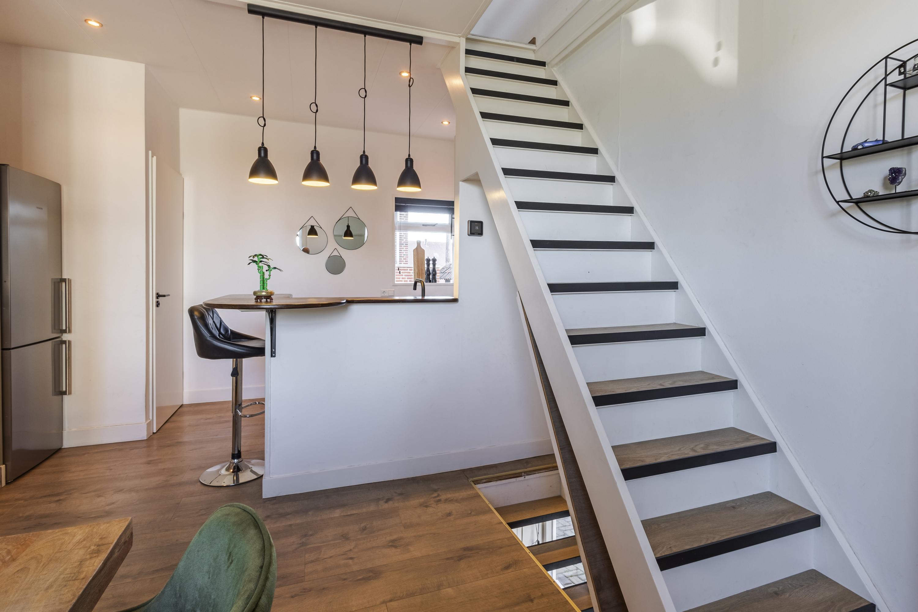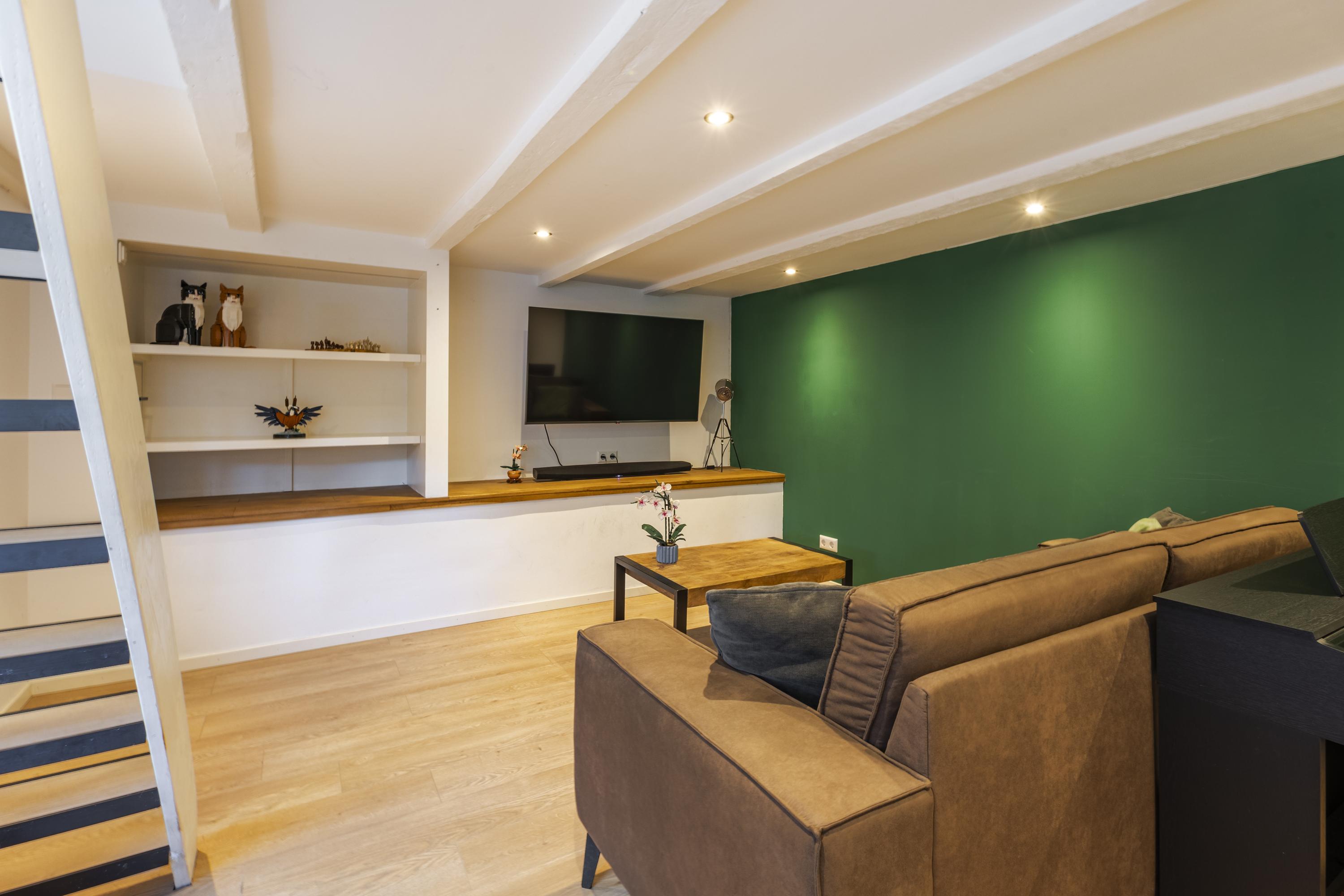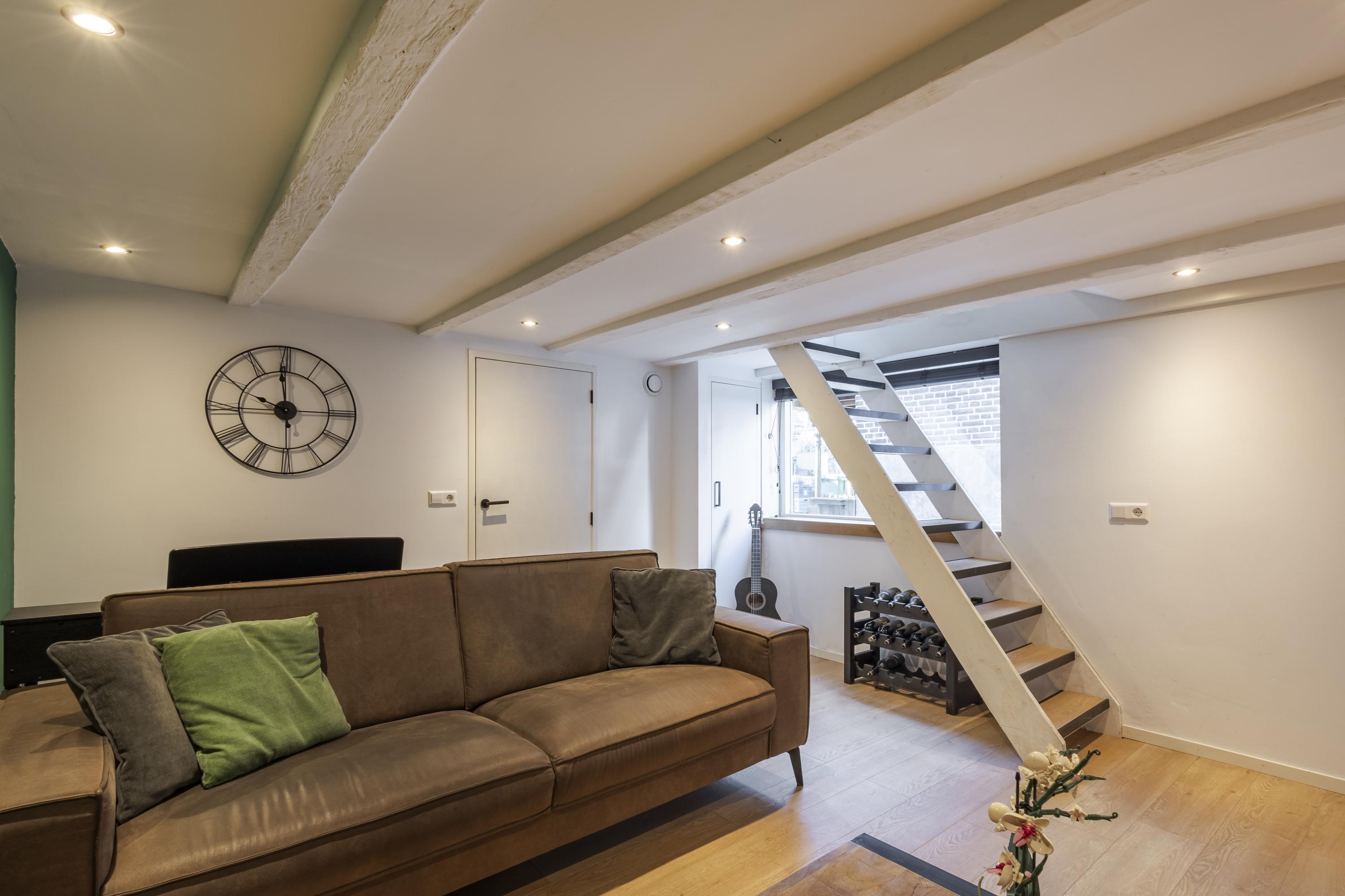 De plafondhoogte van de woonkamer is net onder de 2.00 meter, waardoor het officieel niet als woonoppervlakte telt, maar in de praktijk is dit juist een verrassend fijne en goed bruikbare woonlaag.