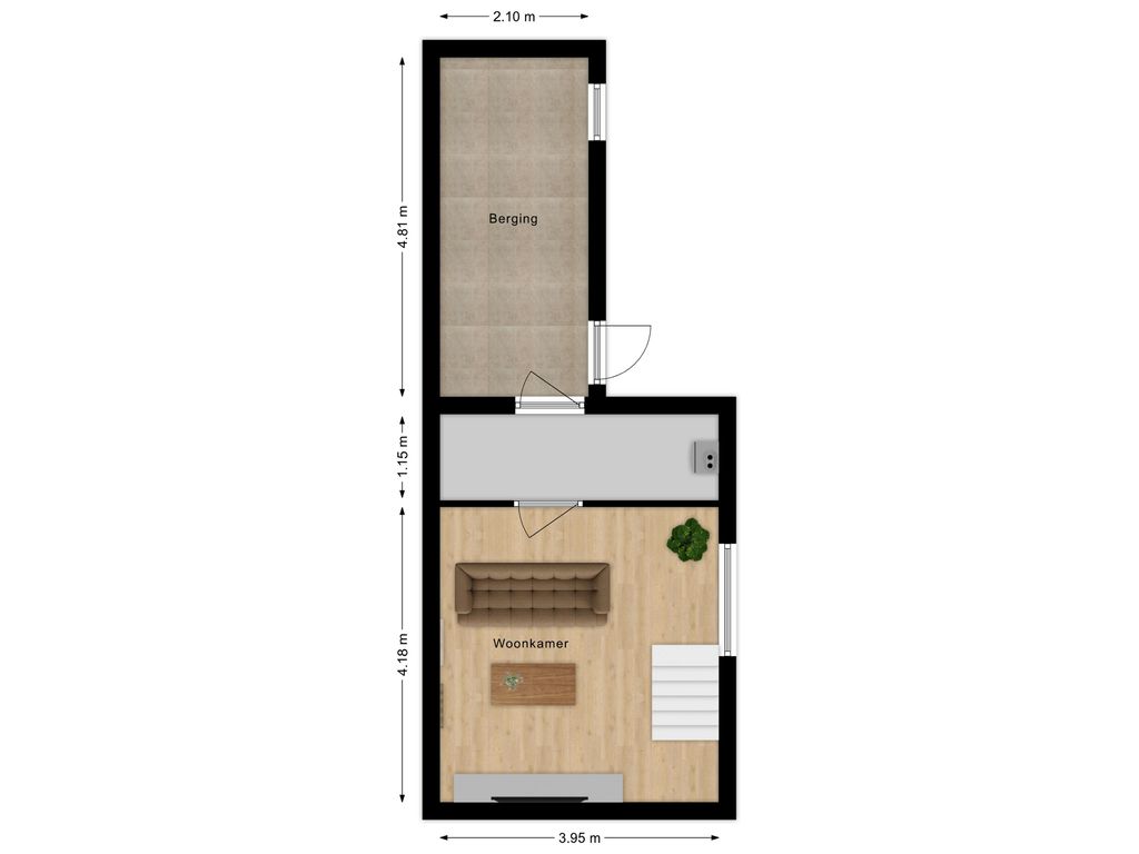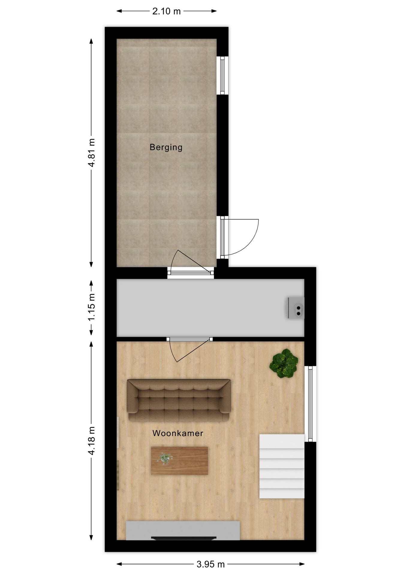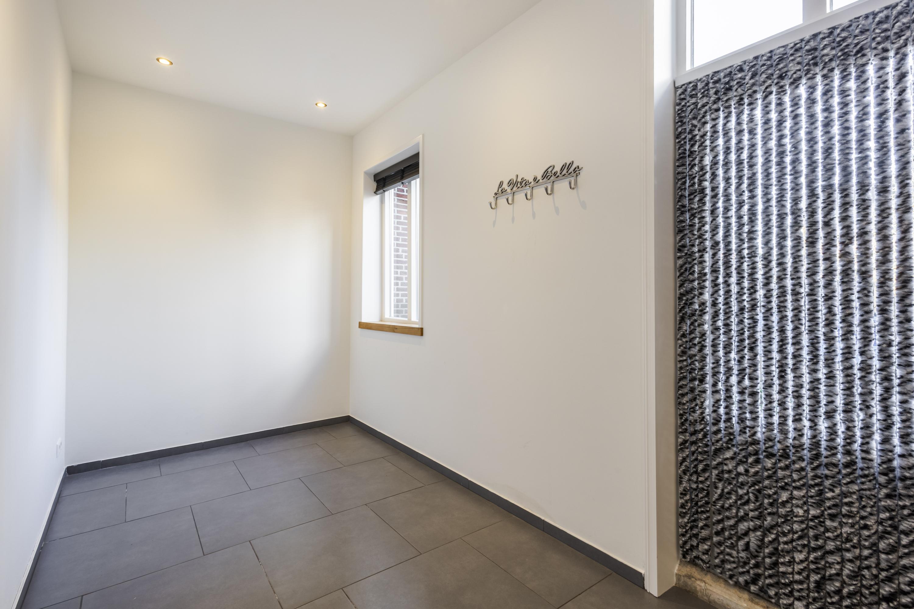Een verdieping lager, in het souterrain, bevindt zich de knusse woonkamer. Door het venster in de zijgevel voelt dit als volwaardige leefverdieping. Aangrenzend ligt een goed afgewerkte inpandige berging/bijkeuken. Deze is super praktisch! Vanuit hier loop je zo het terrasje naast de woning op. Een fijne plek om even buiten te zitten.