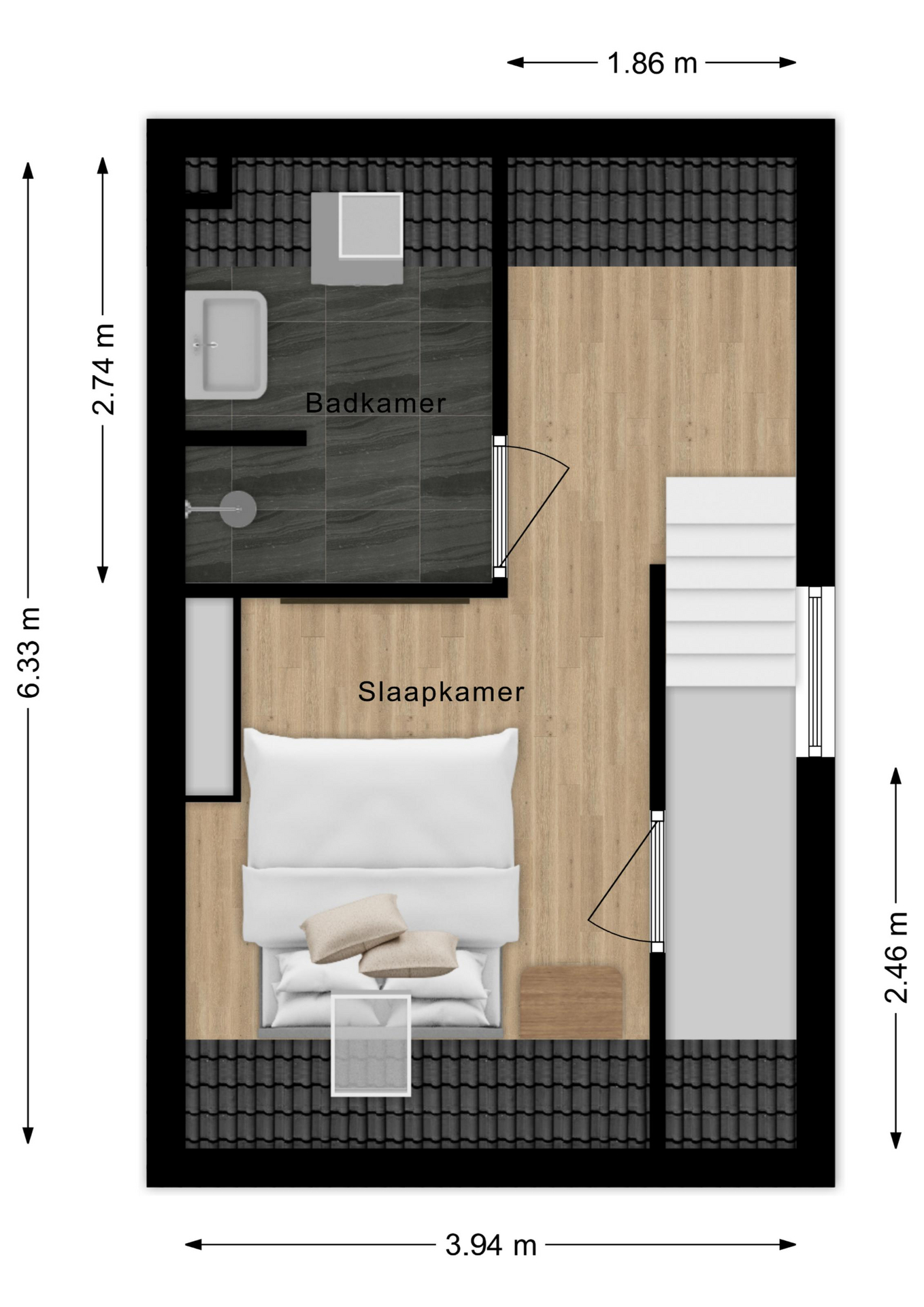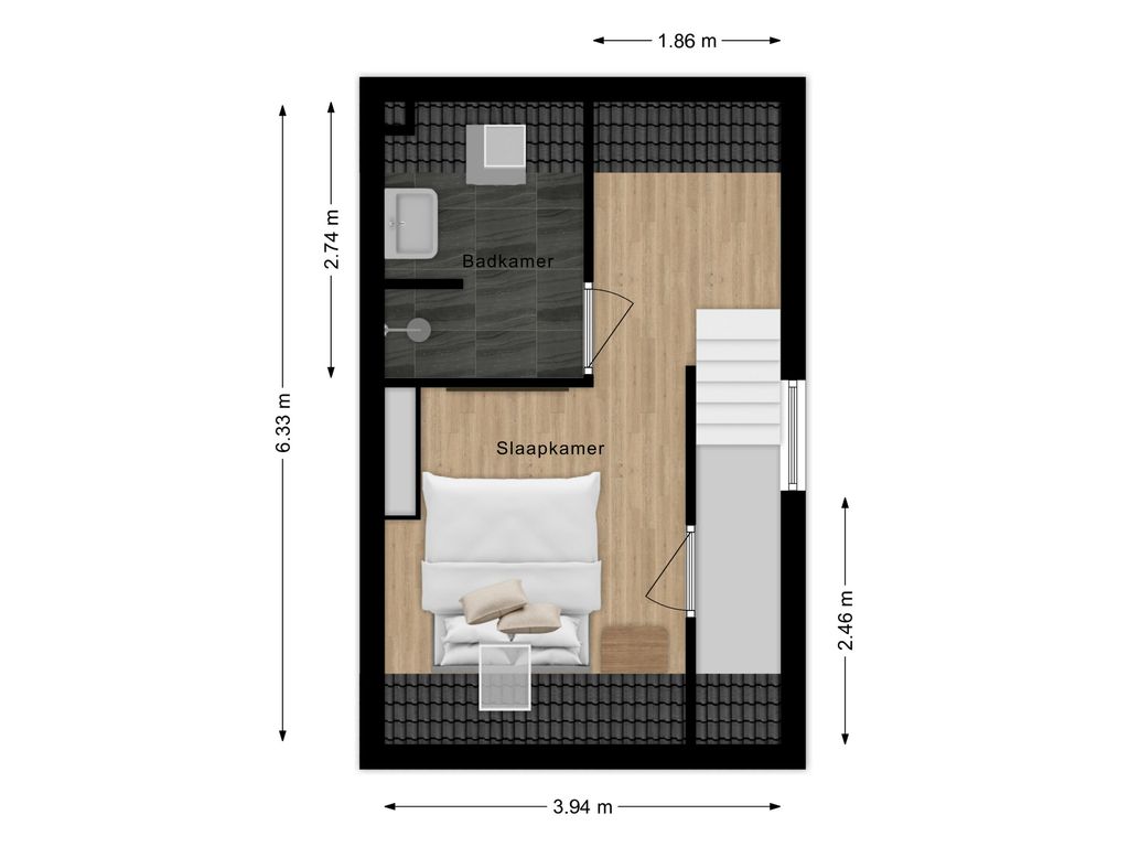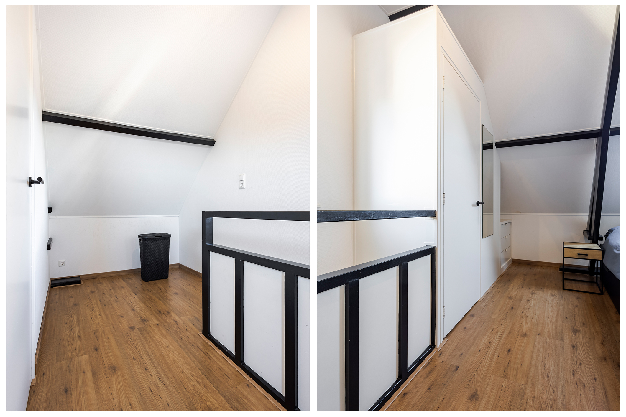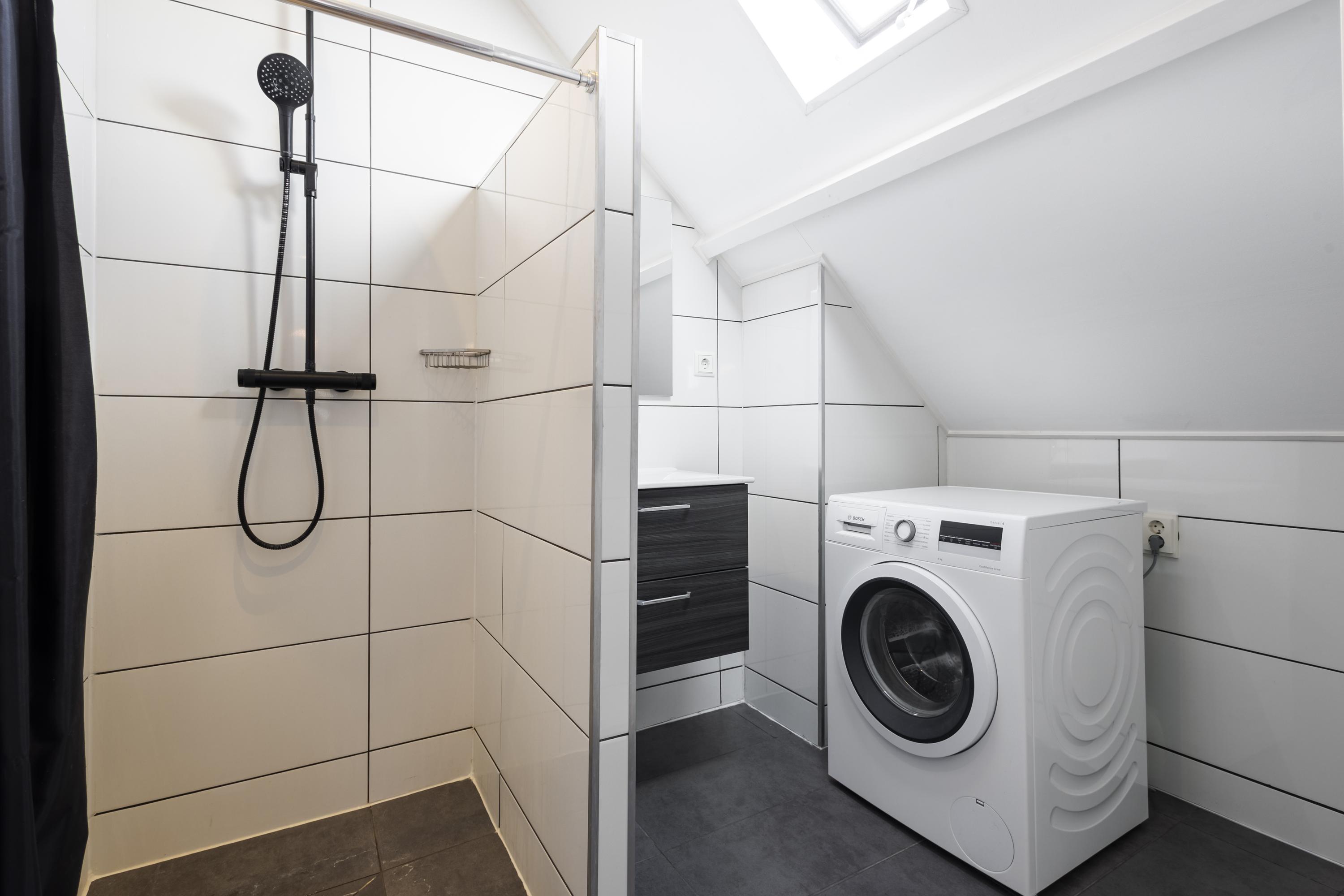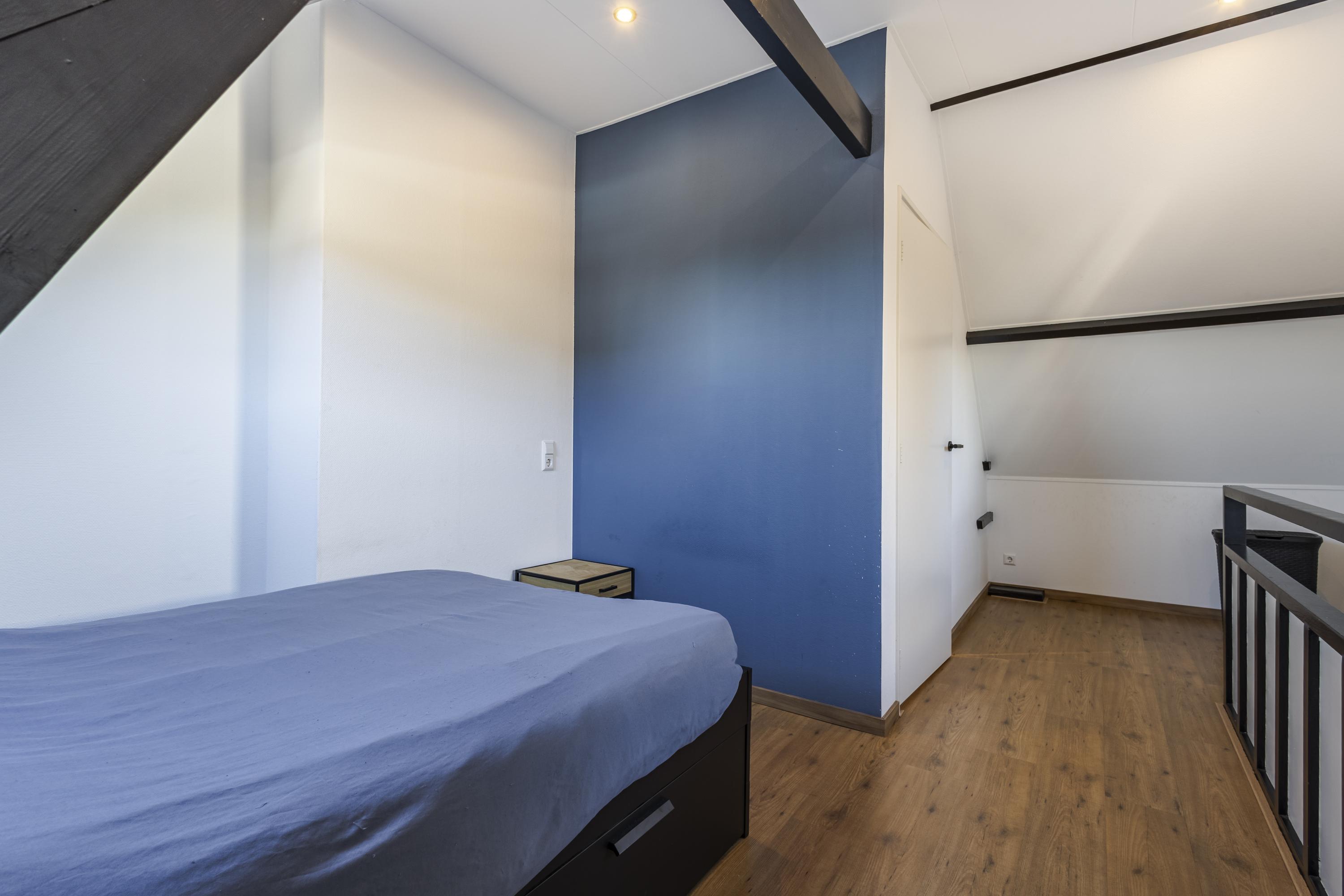 Op de bovenste verdieping vind je de slaapverdieping: een overloop, een ruime slaapkamer met een prachtige nokhoogte en balken in het zicht Sfeervoller wordt het bijna niet! Daarnaast is er een fijne badkamer met douche, wastafel en witgoedaansluitingen.