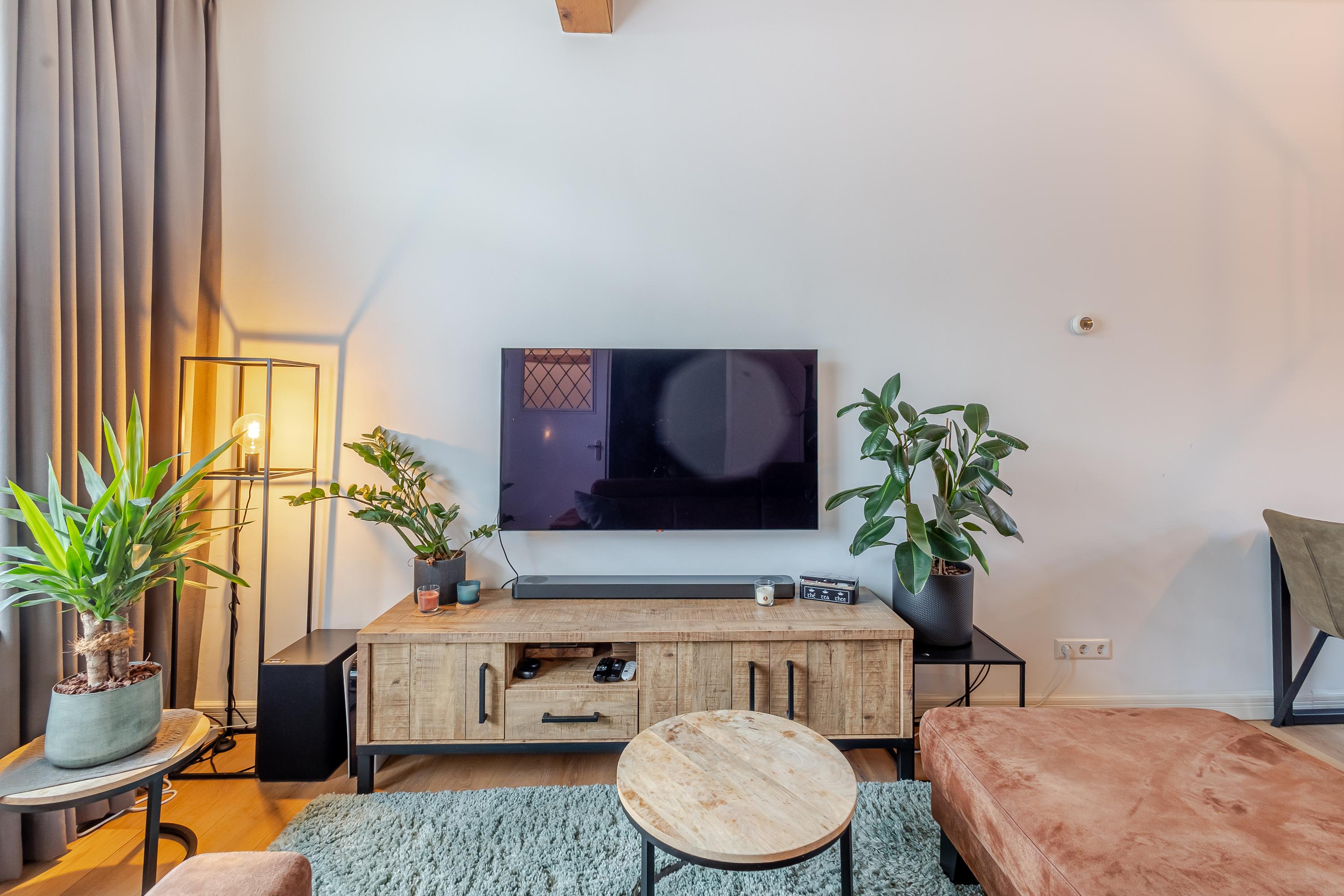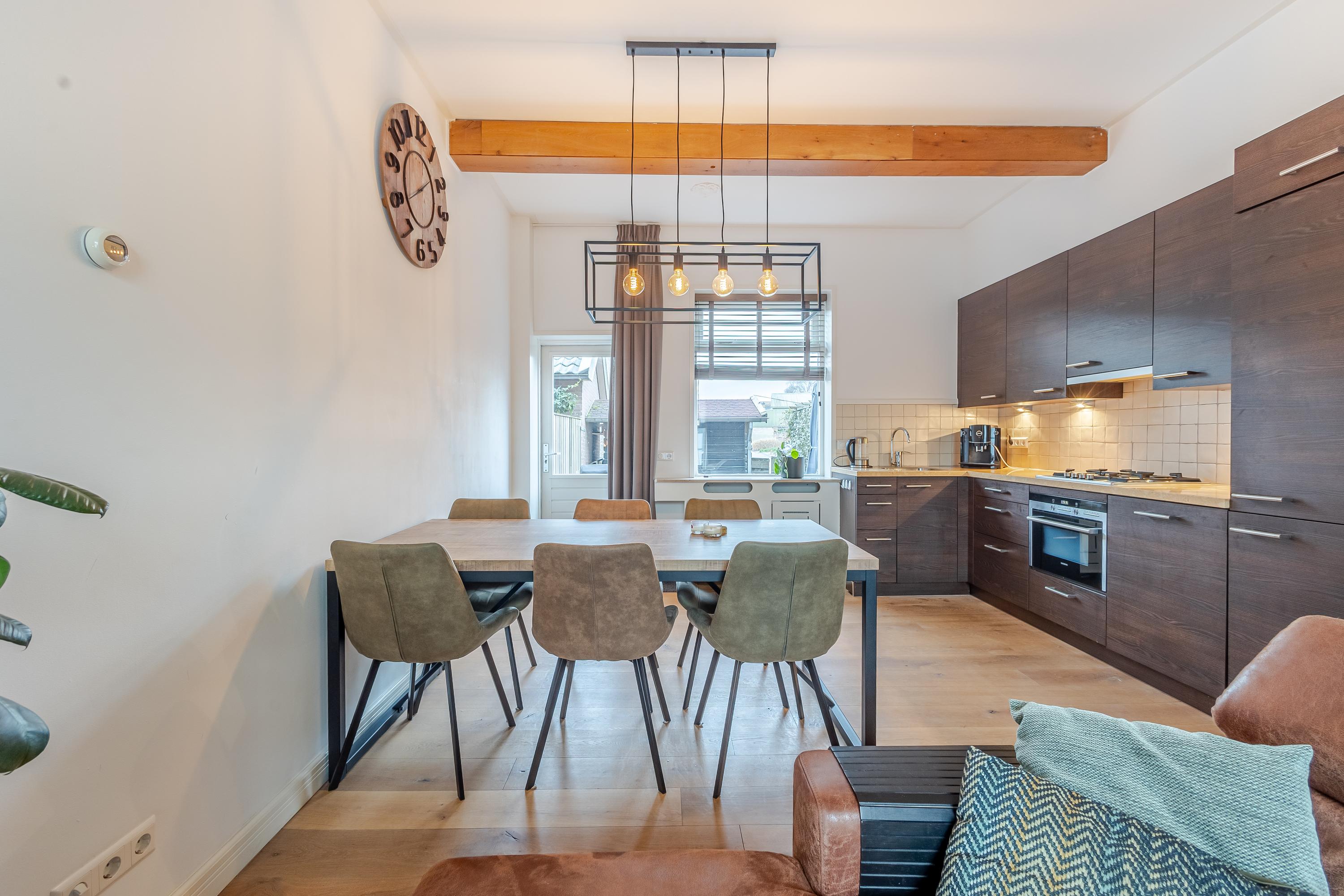 De hal biedt toegang tot het toilet en de lichte woonkamer. Door de open indeling gaat de woonkamer naadloos over in de keuken, die is voorzien van een complete hoekopstelling, inbouwapparatuur en een composiet aanrechtblad. De keuken heeft direct toegang tot de zonnige westgerichte tuin.