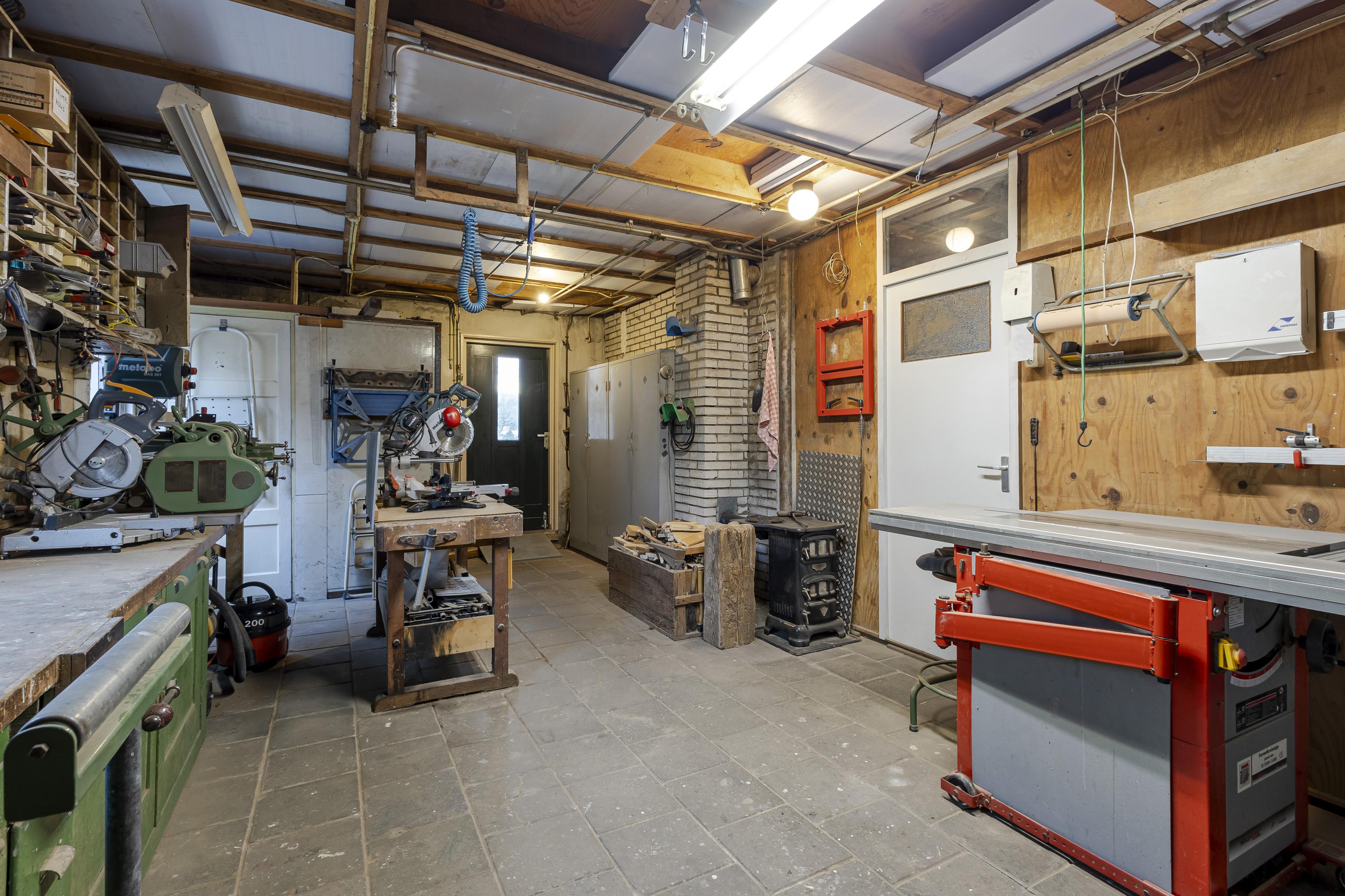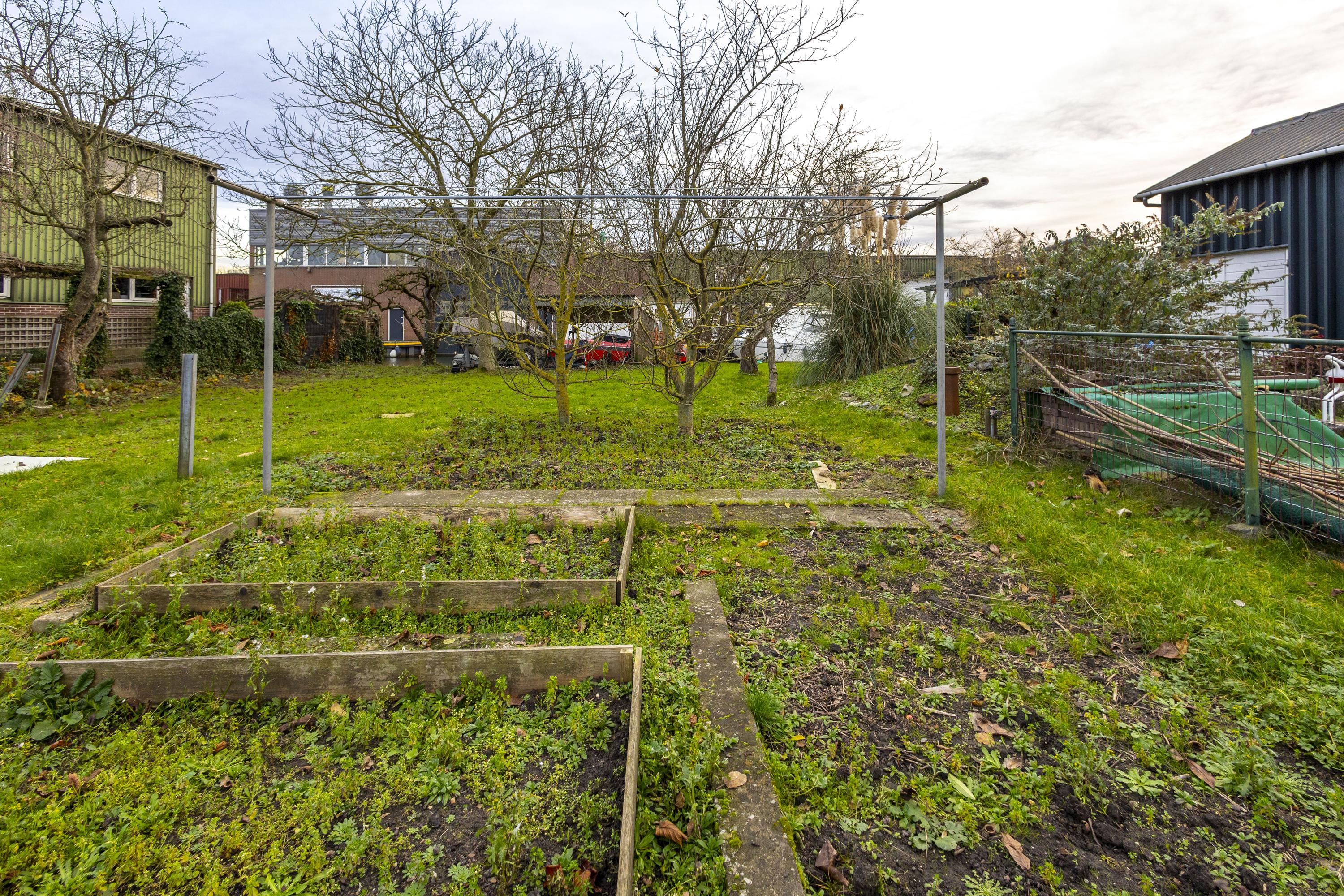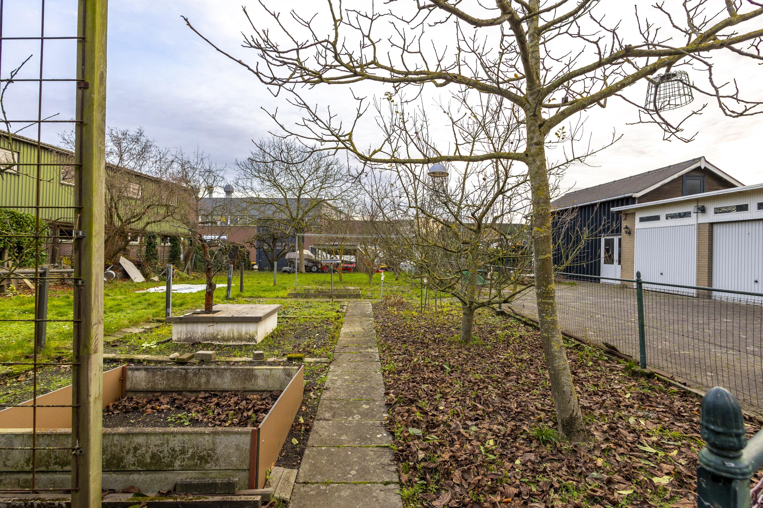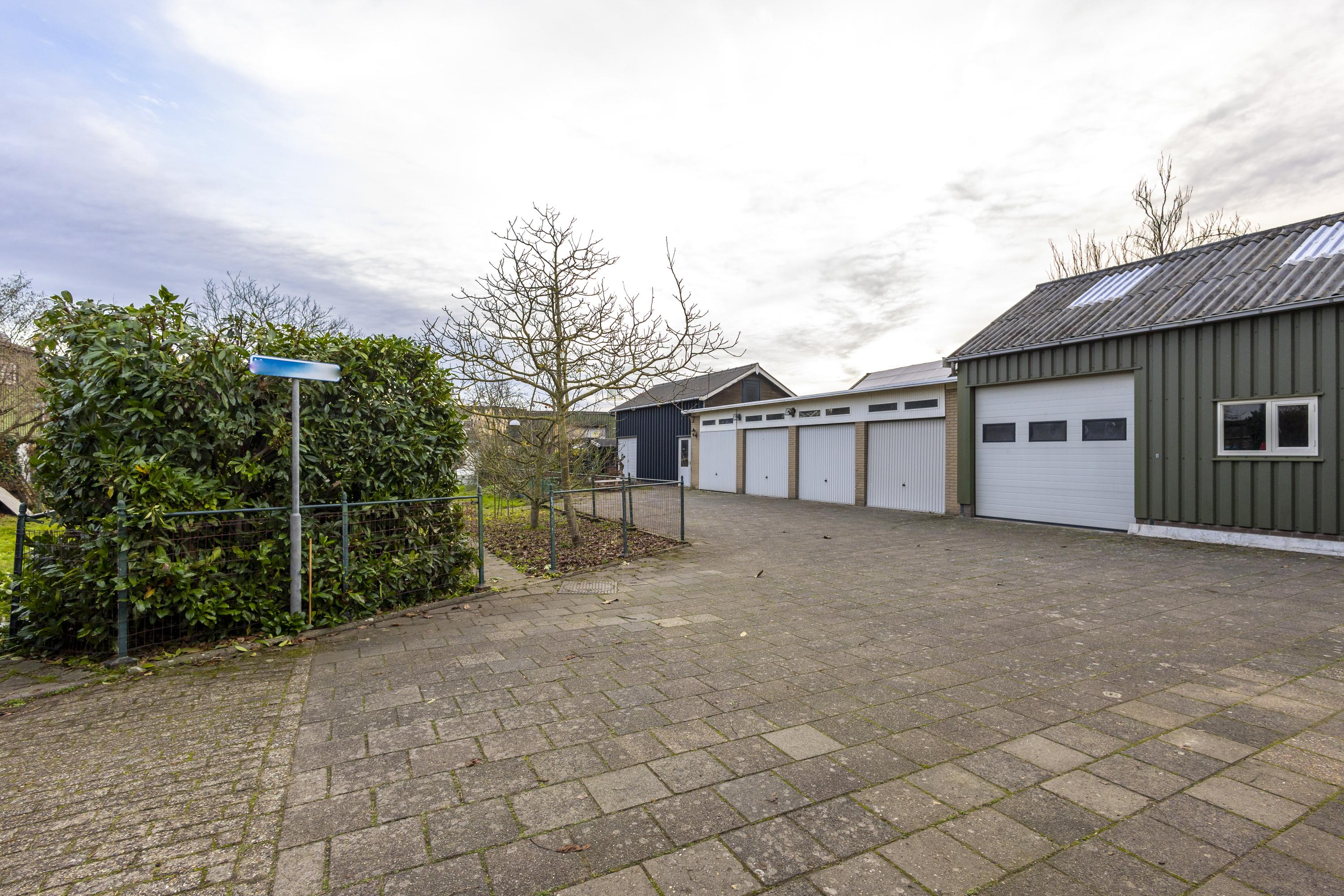 Op het terrein bevinden zich drie schuren/garages met een gezamenlijke oppervlakte van ruim 135 m² (exclusief zolders). Het buitenterrein is deels verhard en perfect voor opslag of parkeren. Verder is het perceel ingericht als siertuin met gazon, fruitbomen en een blokhut, wat zorgt voor een fijne balans tussen werken en ontspannen.