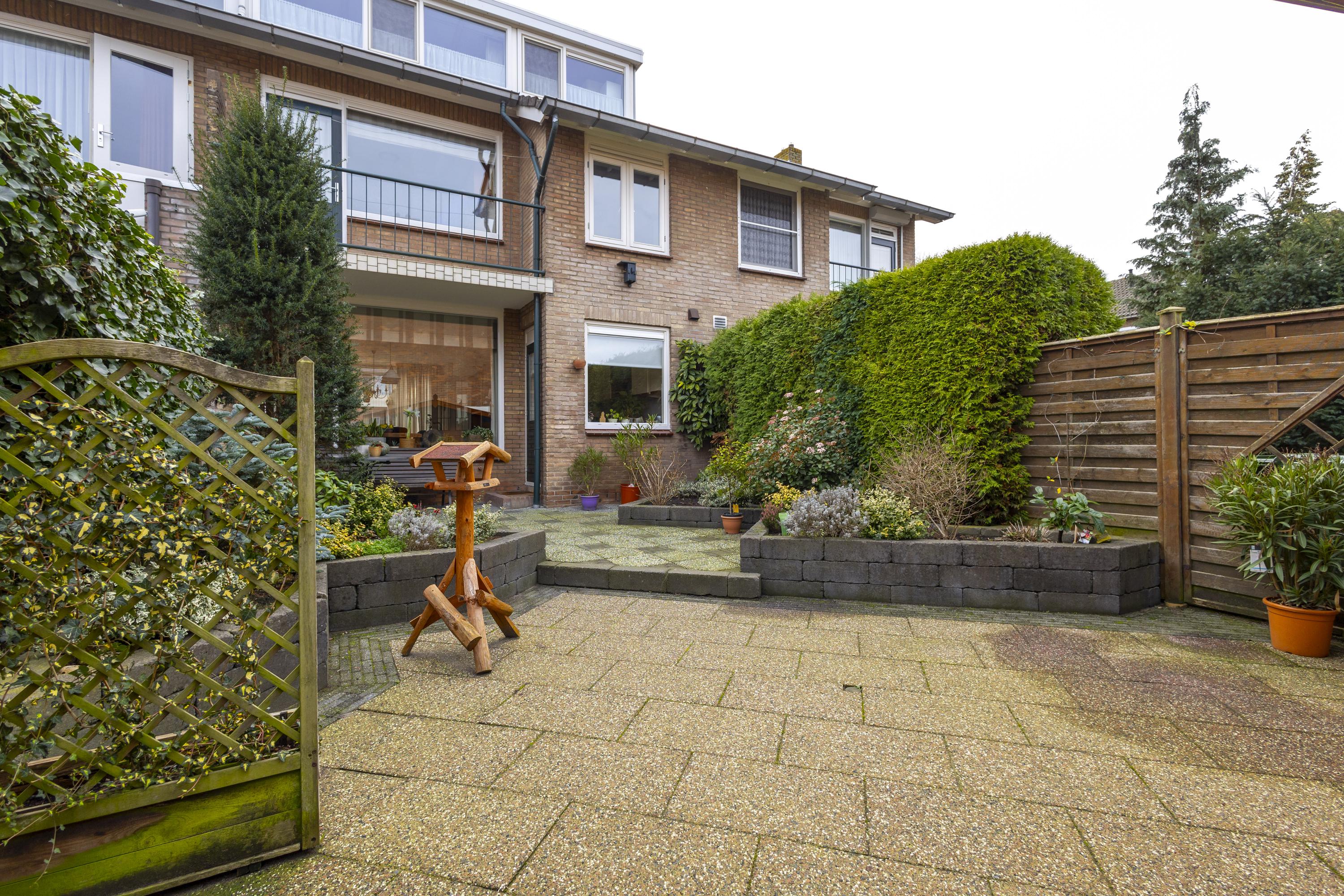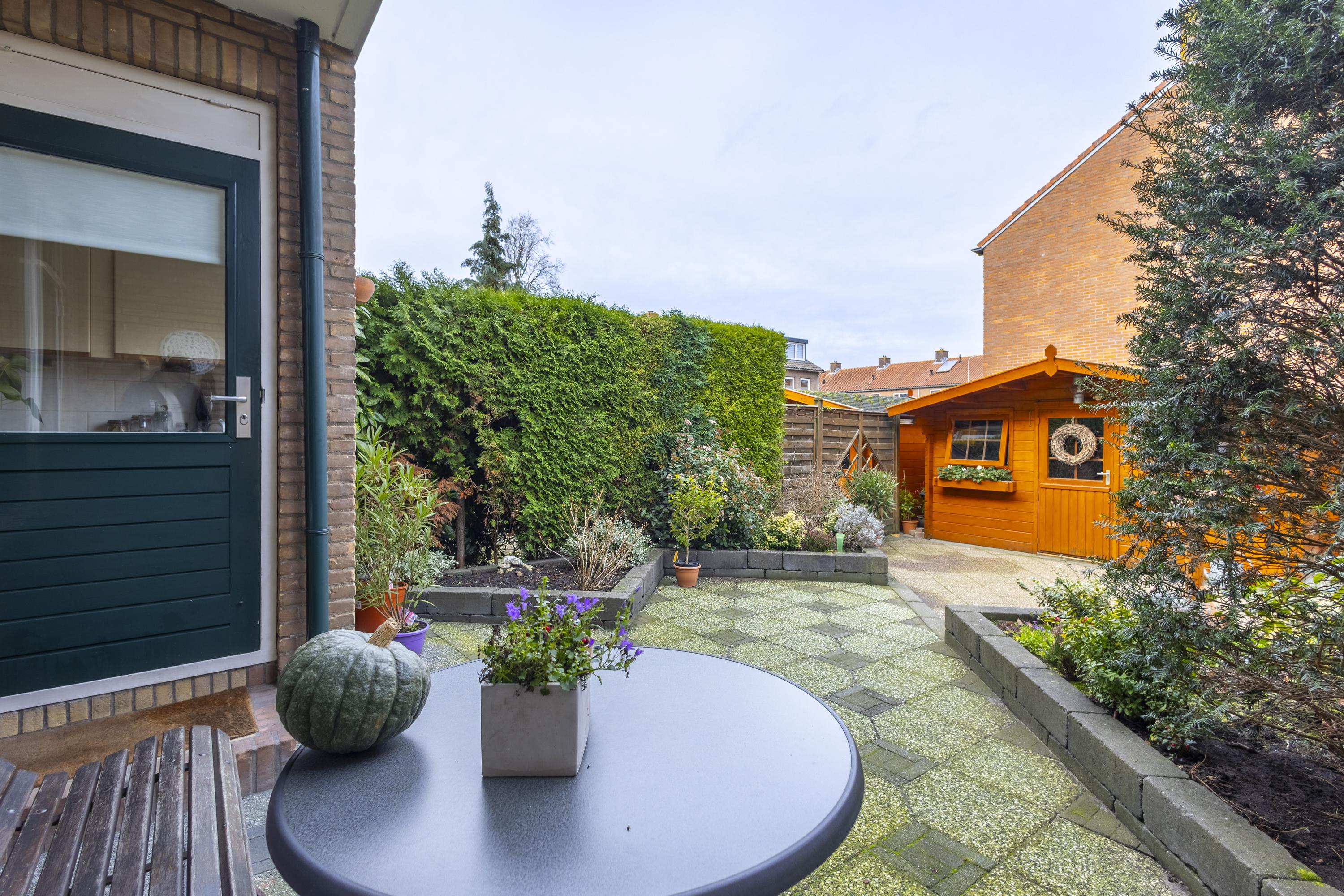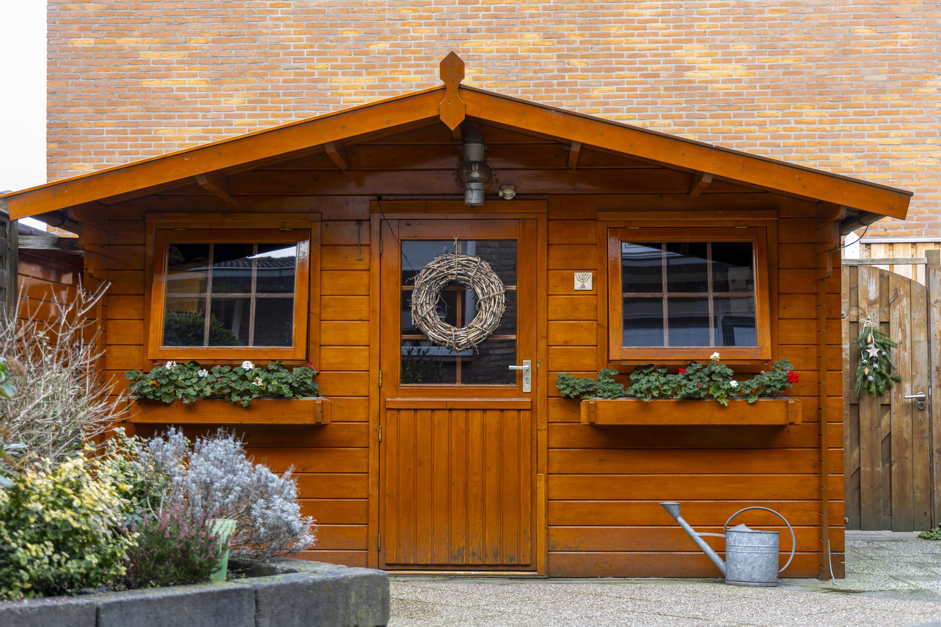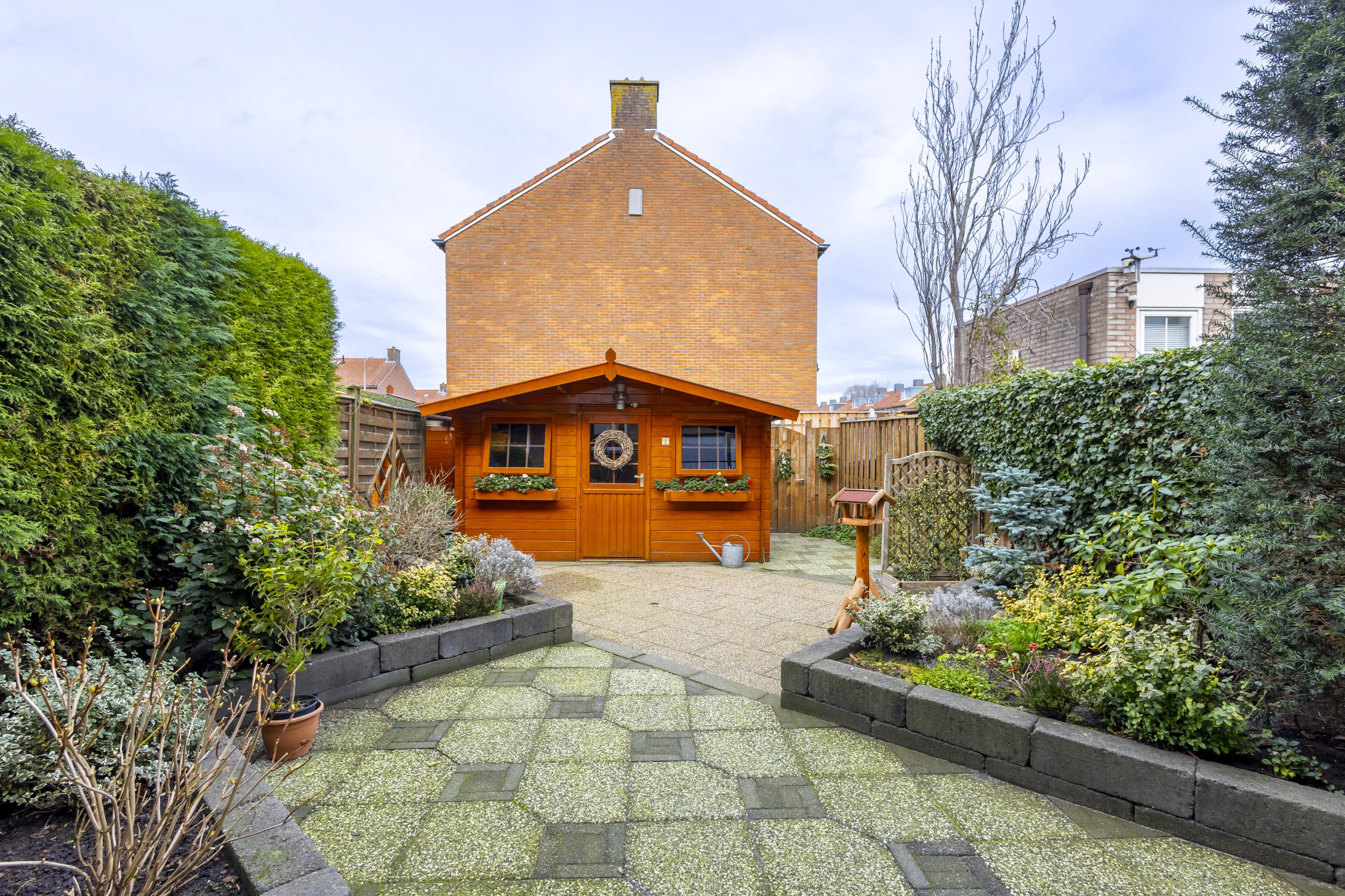De achtertuin is verzorgd aangelegd met sierbestrating en groen. Achter op het perceel staat een ruime houten blokhut: ideaal voor het opbergen van fietsen, tuingereedschap of als extra opslagruimte.