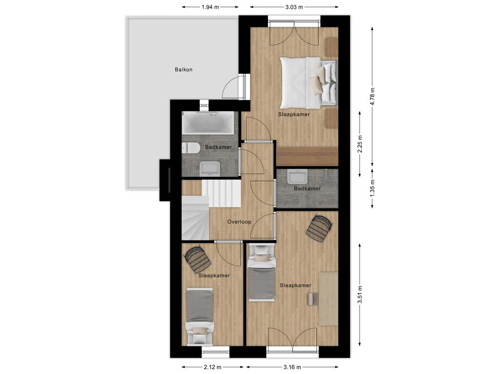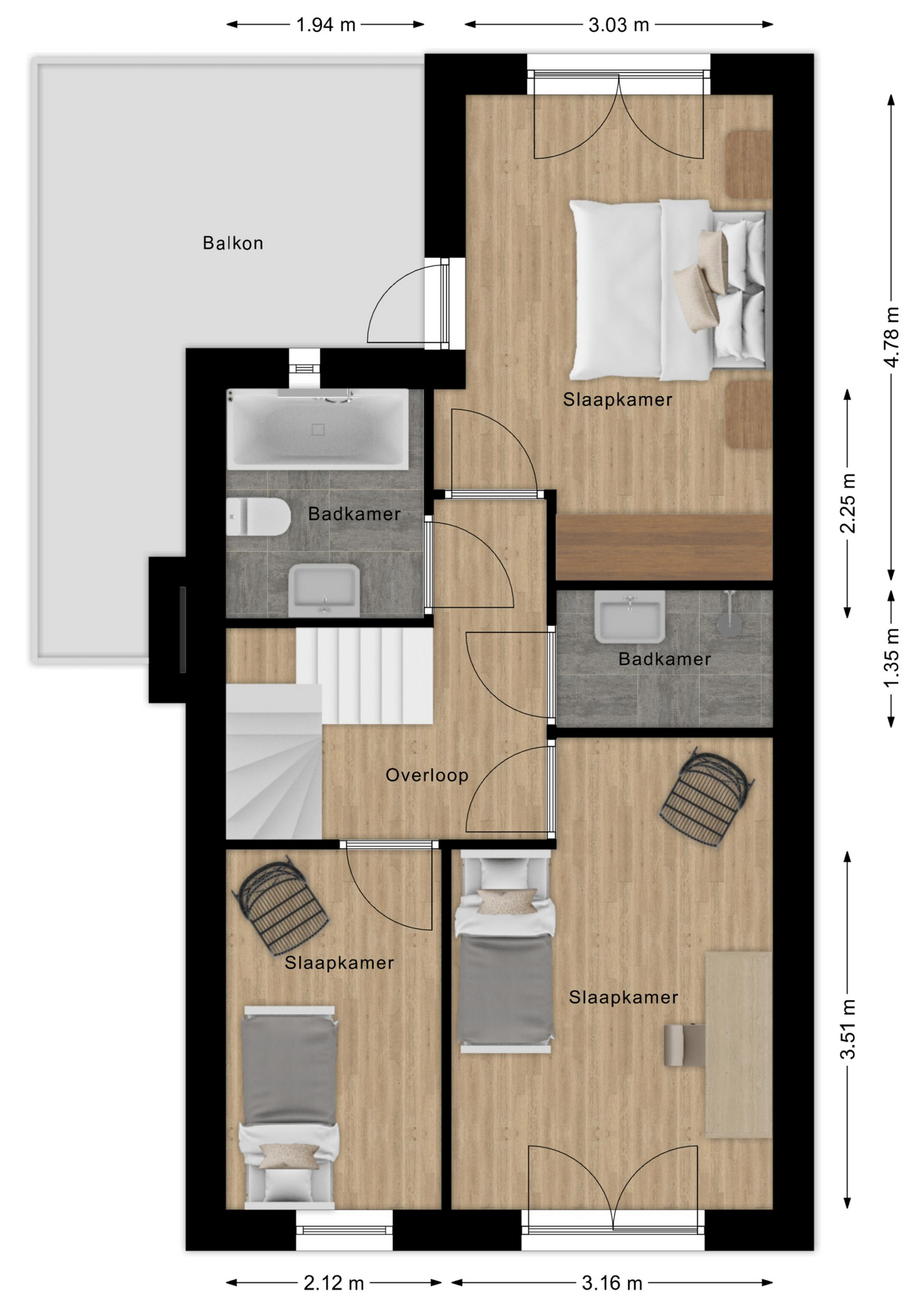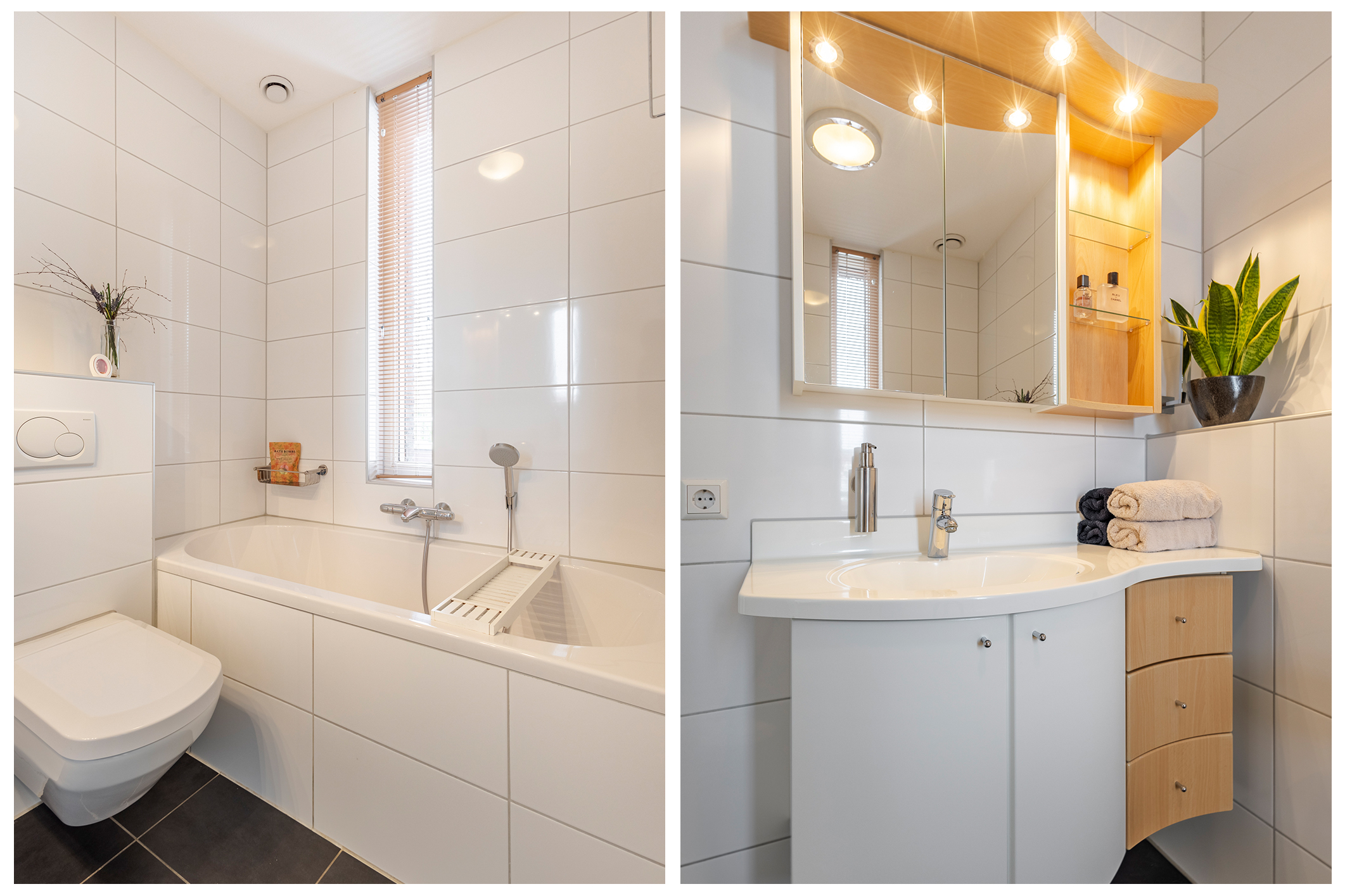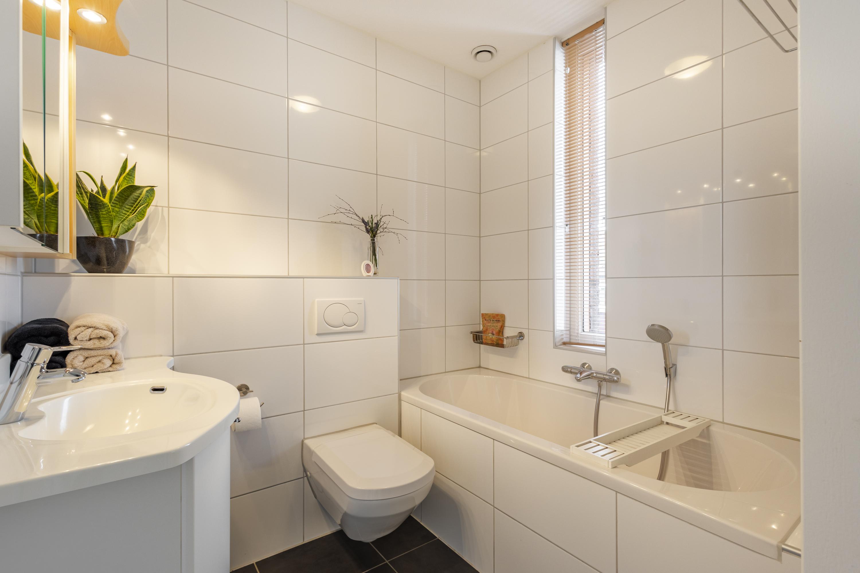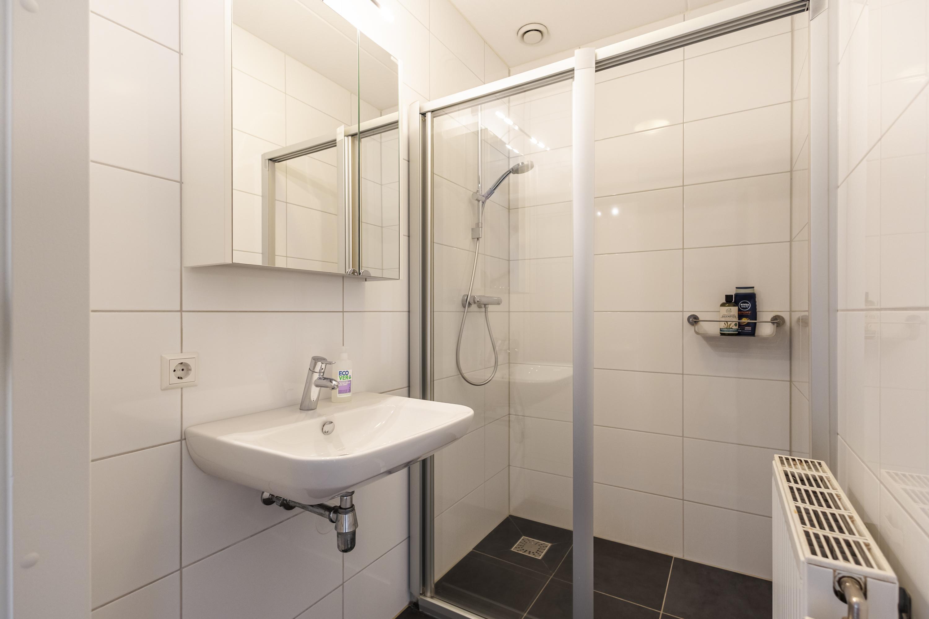 Op de eerste verdieping vindt u drie comfortabele slaapkamers en maar liefst twee badkamers. De eerste badkamer is compleet uitgerust met een ligbad, toilet en een stijlvol wastafelmeubel. De tweede badkamer beschikt over een inloopdouche en wastafel, ideaal voor een gezin of logés.