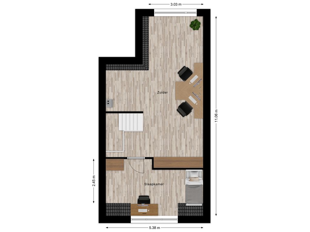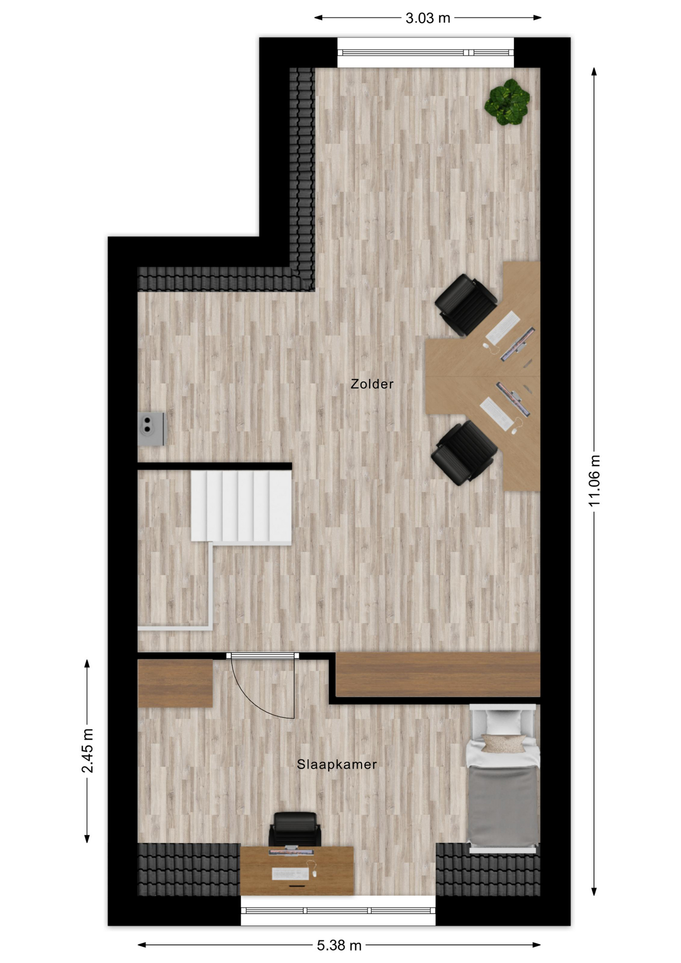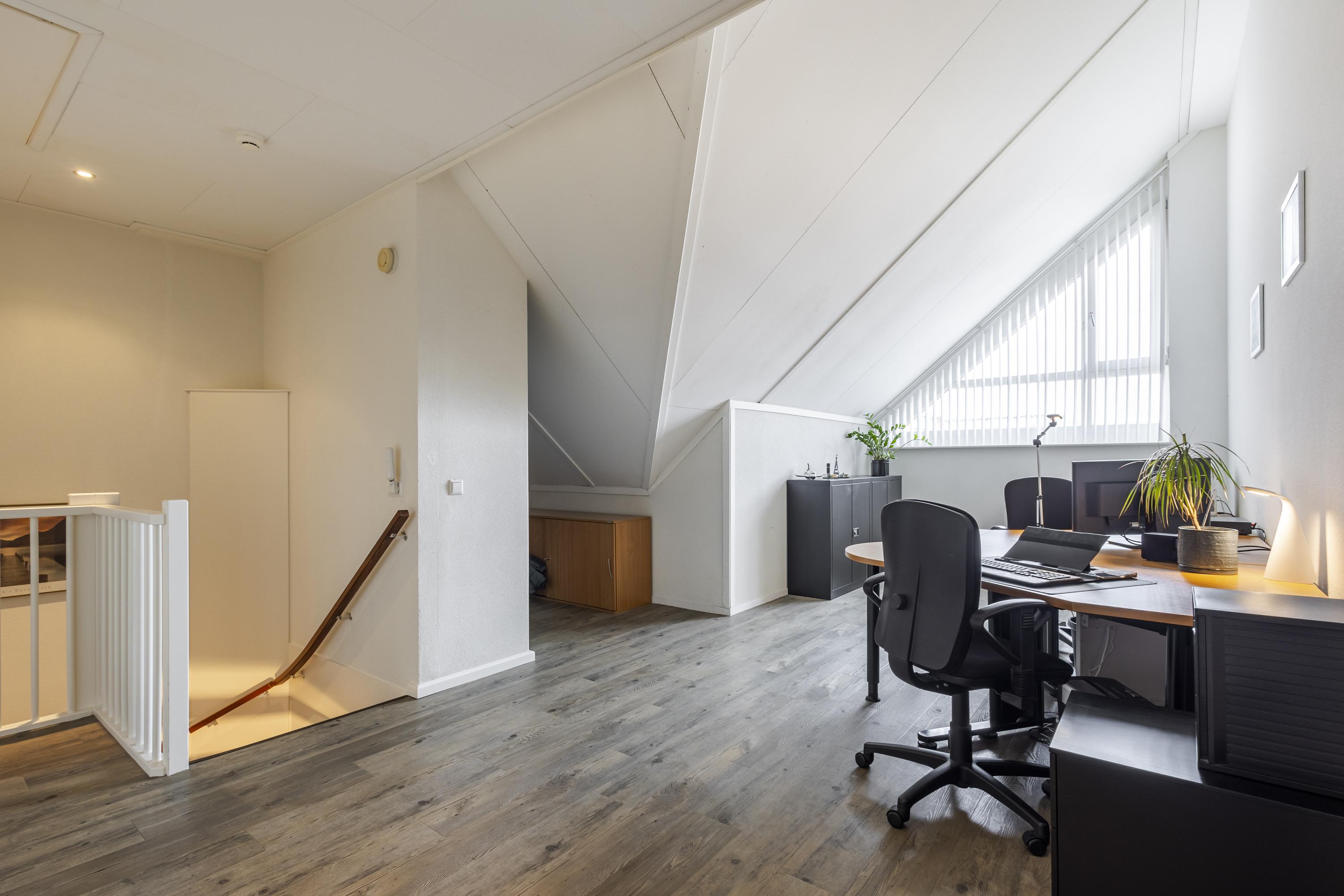 De tweede verdieping is grotendeels ingericht als open zolderruimte en momenteel in gebruik als werkplek, met toegang tot een vierde slaapkamer. De ruimte biedt diverse indelingsmogelijkheden, waaronder het realiseren van een extra (vijfde) slaapkamer. In een aparte ruime nis bevinden zich de cv- en mechanische ventilatie-installaties.