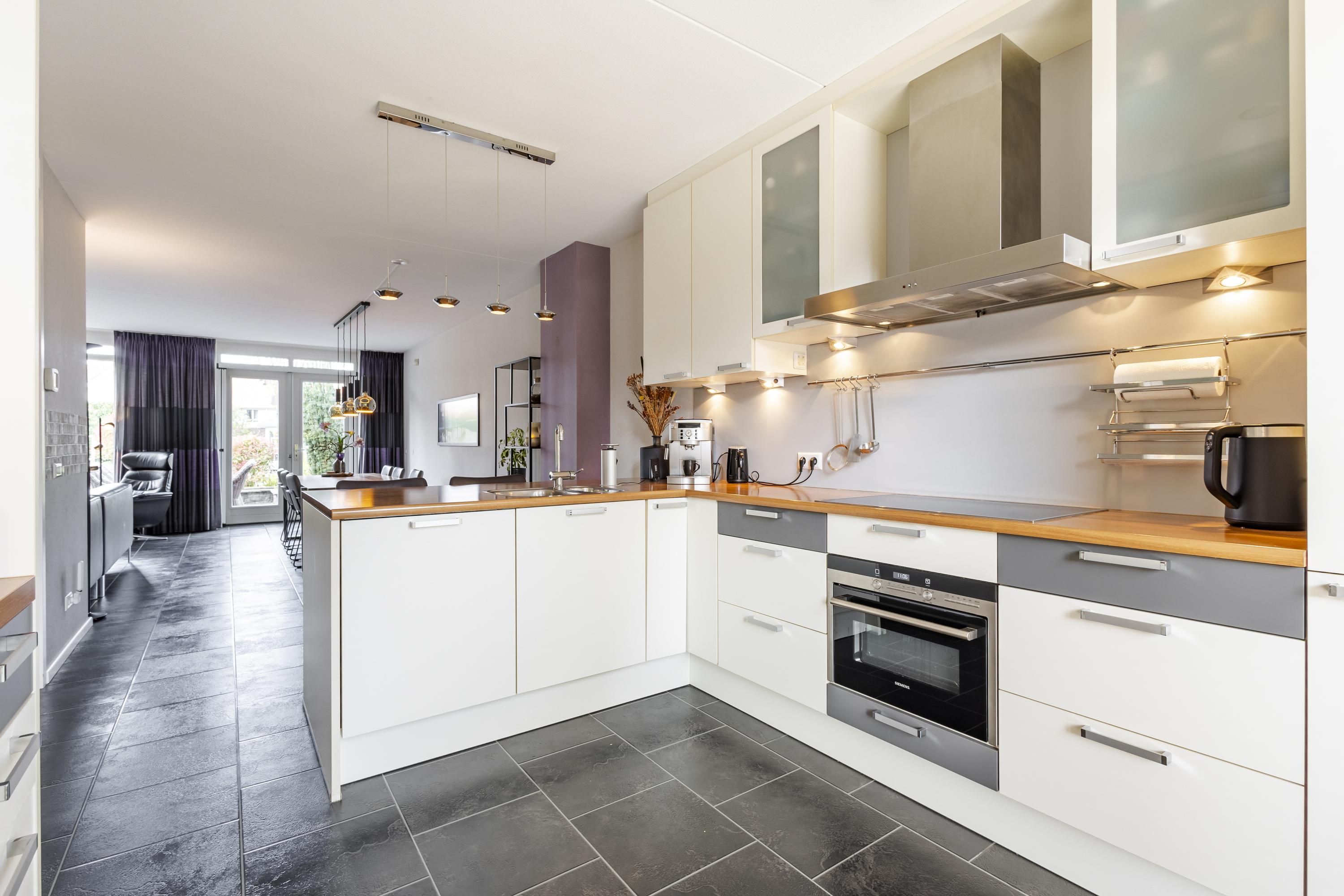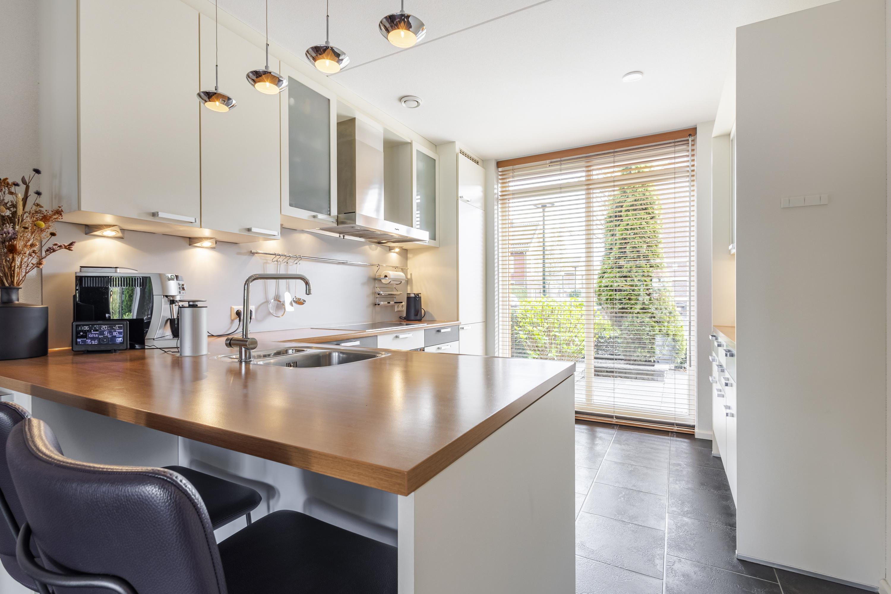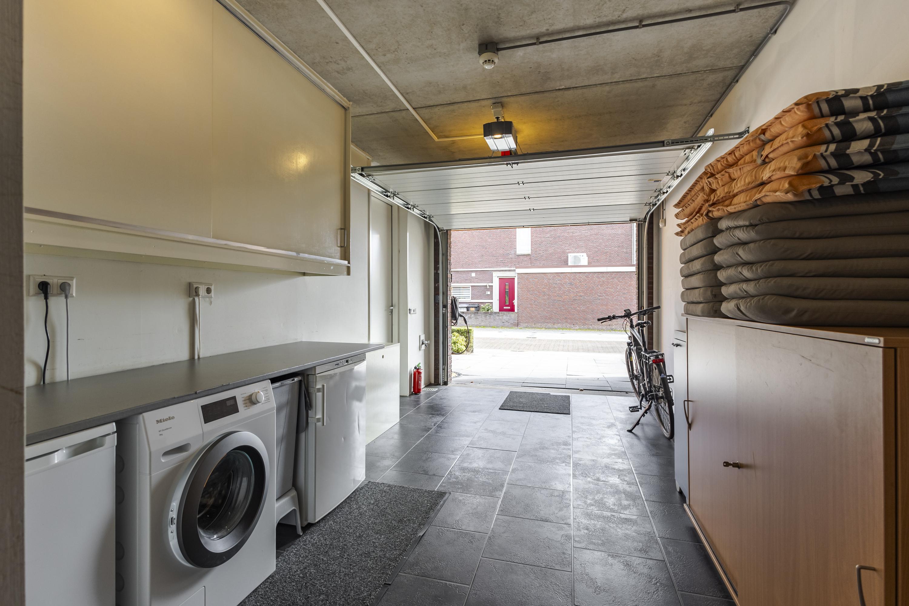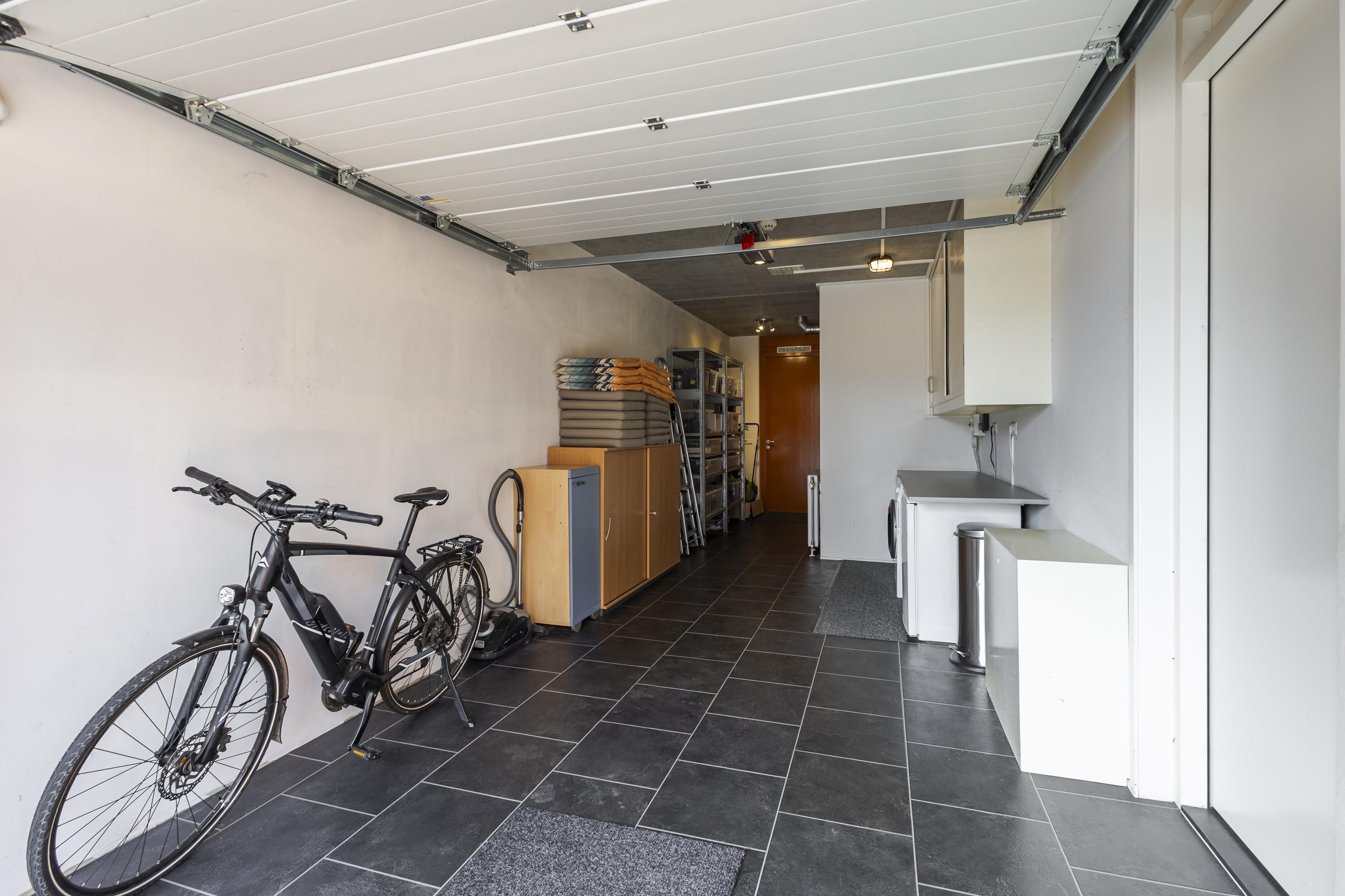 Op de begane grond aan de voorzijde van de woning bevindt zich de keuken, die dankzij de grote raampartijen tot aan de grond een prettige lichtinval heeft en een mooi zicht biedt op de straatzijde. De lichte woonkamer vormt het hart van de woning en staat in directe verbinding met de tuin via openslaande deuren. Ook vanuit de praktische berging, die naadloos overloopt vanuit de inpandige garage, is de tuin bereikbaar. De garage zelf is voorzien van een moderne sectionaaldeur die eenvoudig met vingerafdruk te openen is.