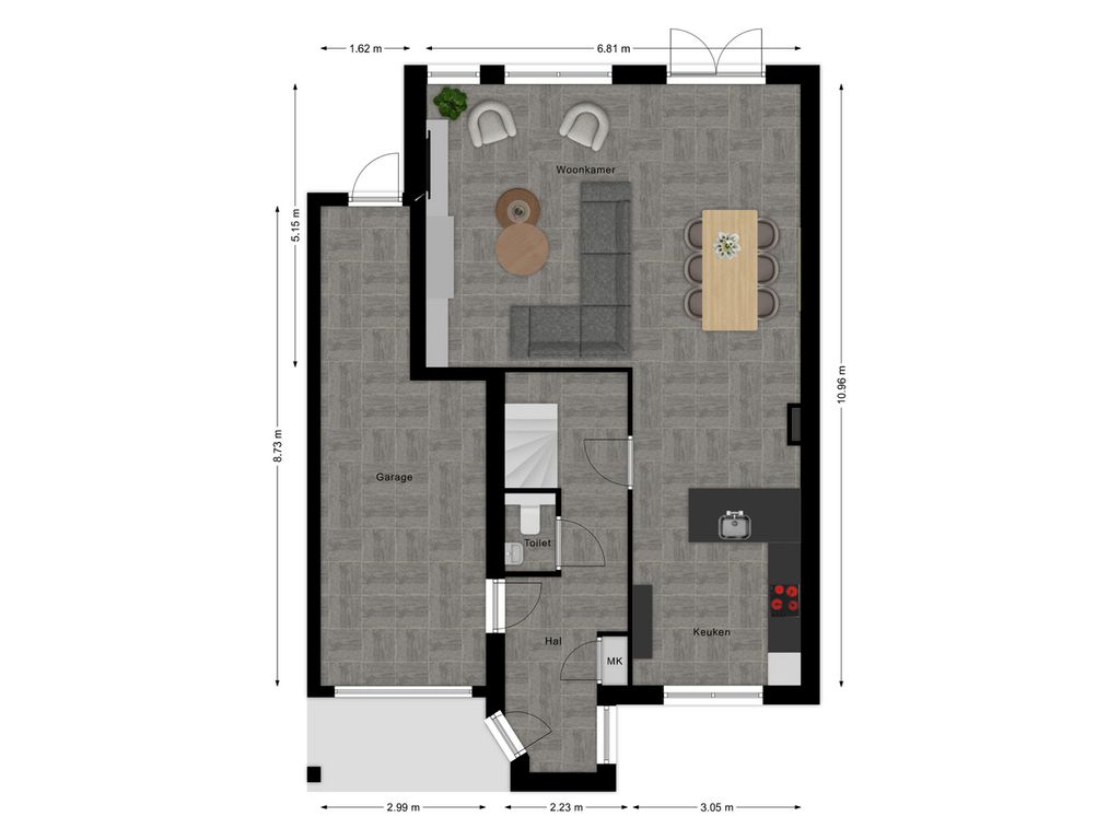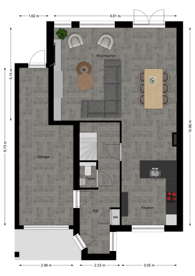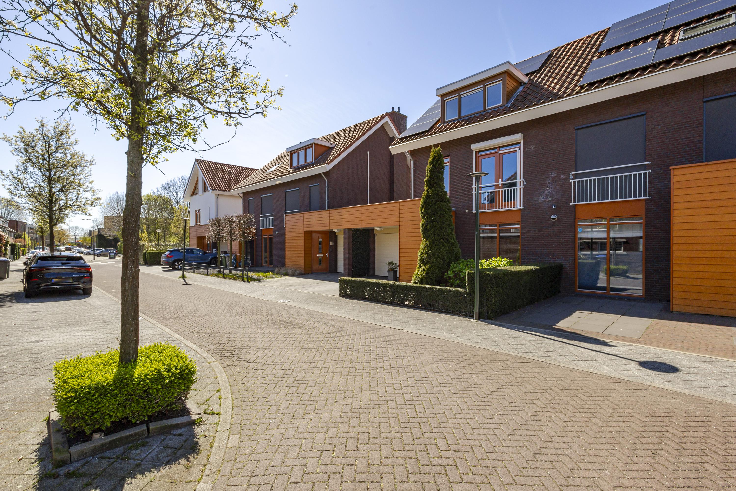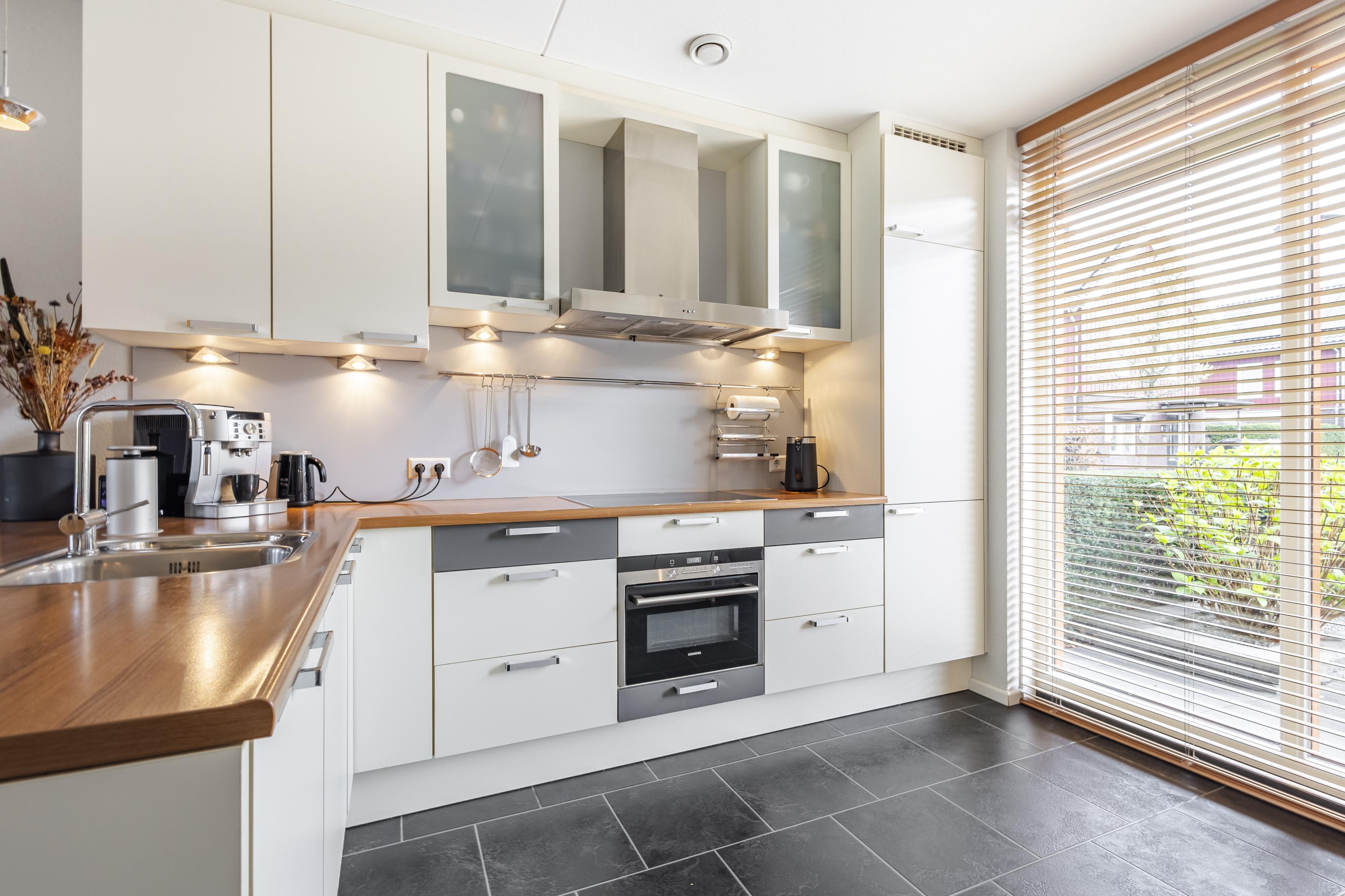 Op de begane grond aan de voorzijde van de woning bevindt zich de keuken, die dankzij de grote raampartijen tot aan de grond een prettige lichtinval heeft en een mooi zicht biedt op de straatzijde. De lichte woonkamer vormt het hart van de woning en staat in directe verbinding met de tuin via openslaande deuren. Ook vanuit de praktische berging, die naadloos overloopt vanuit de inpandige garage, is de tuin bereikbaar. De garage zelf is voorzien van een moderne sectionaaldeur die eenvoudig met vingerafdruk te openen is.