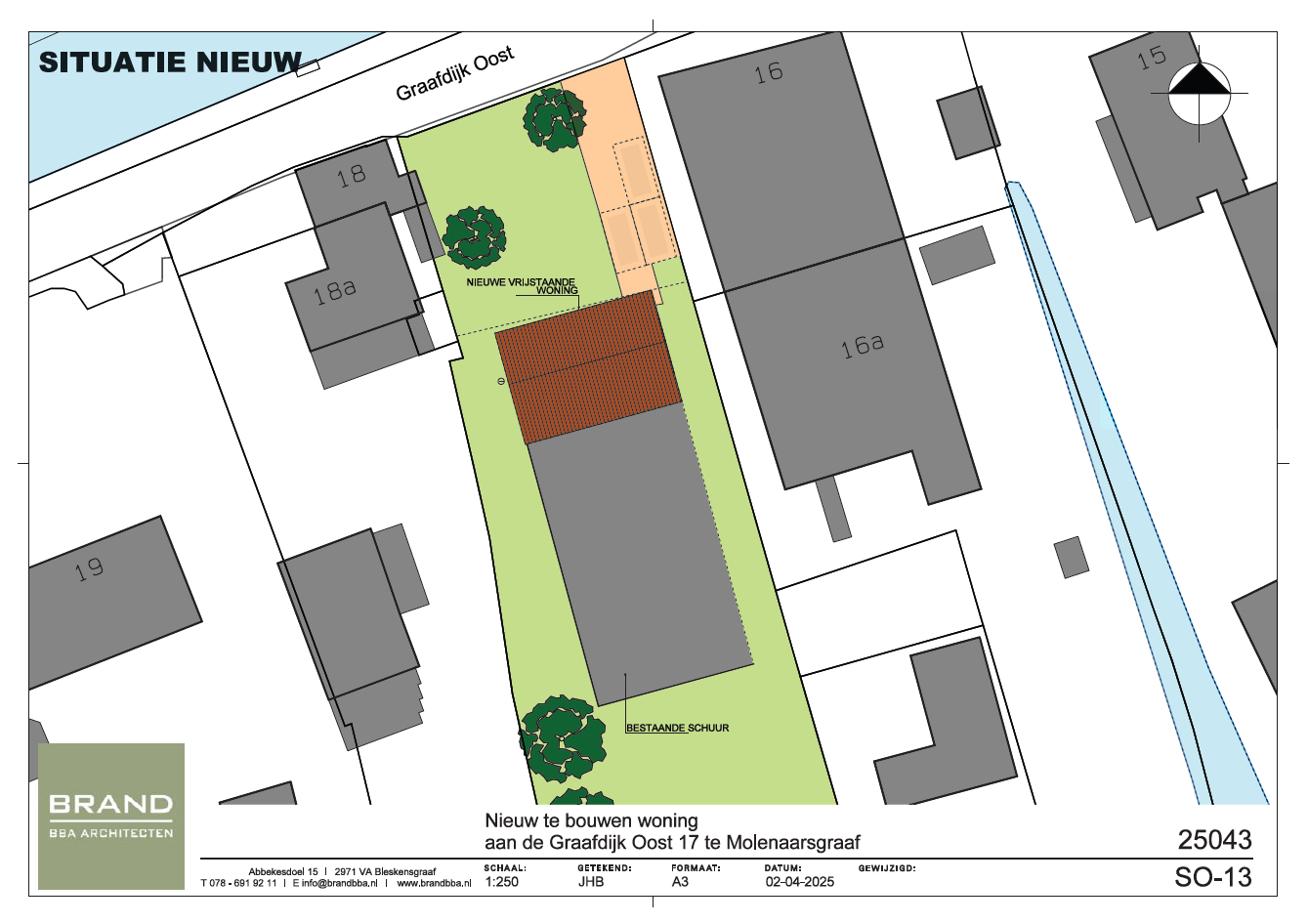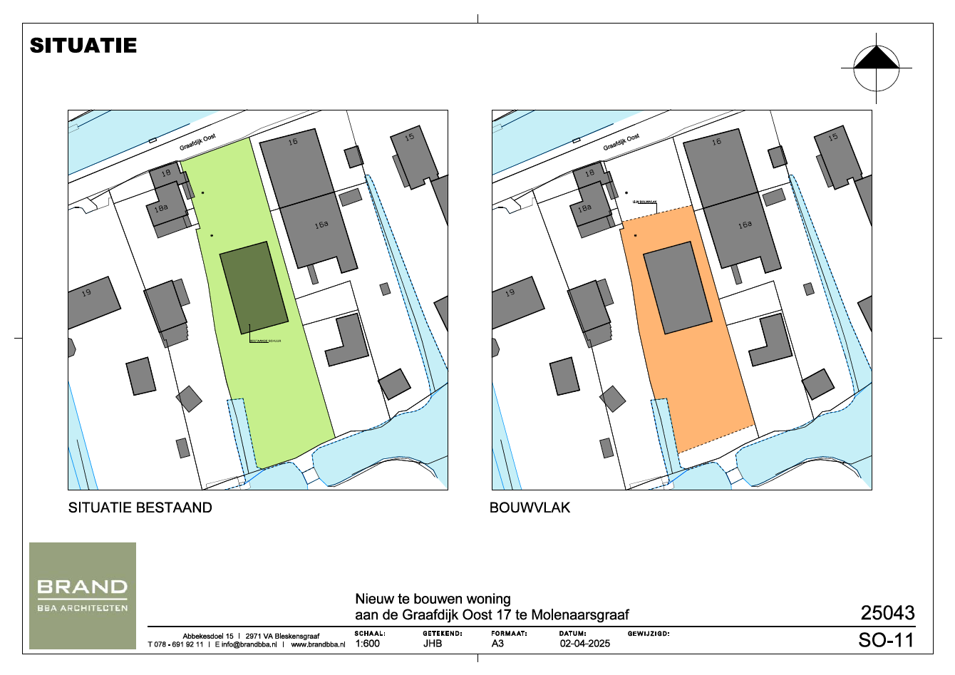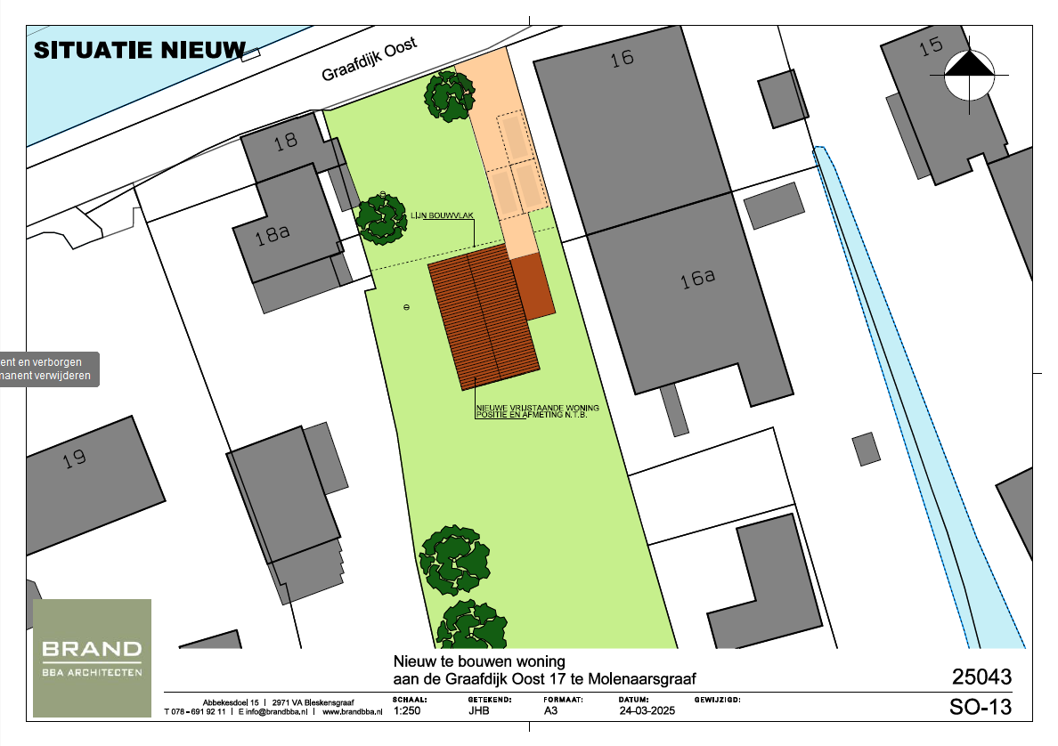 Brand BBA Architecten uit Bleskensgraaf heeft een vooronderzoek gedaan naar de mogelijkheid voor het realiseren van een nieuwbouwwoning op deze locatie. Dit onderzoek staat in de brochure.