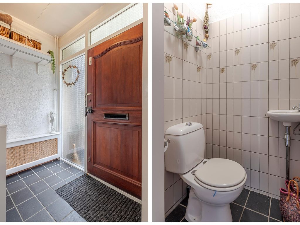 Je komt binnen via de entree met toegang tot het toilet. De ruime, Z-vormige woonkamer biedt een fijne leefruimte met veel lichtinval. Aan de achterzijde bevindt zich de keuken, met directe doorgang naar de praktische bijkeuken/berging – ideaal voor extra opbergruimte en voorzien van aansluitingen voor de wasmachine en droger.
