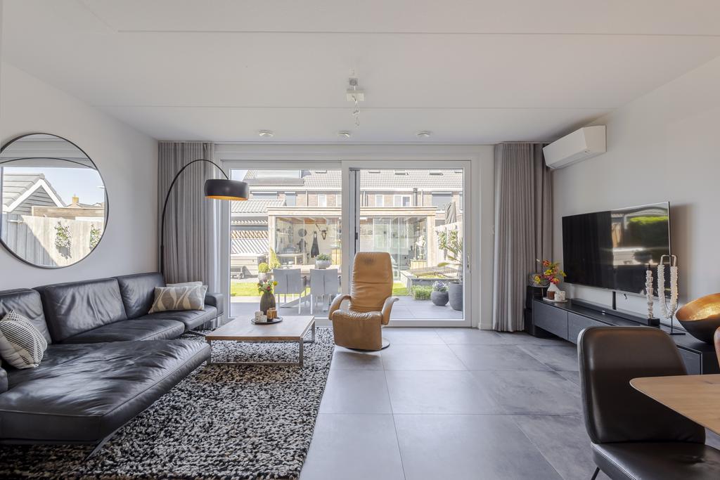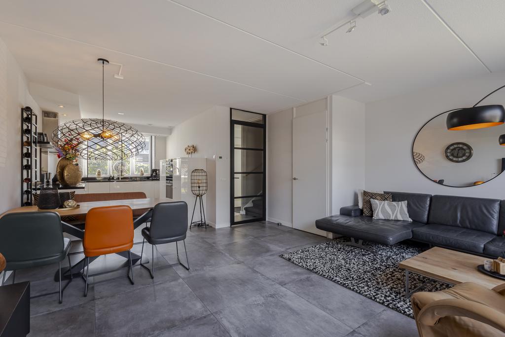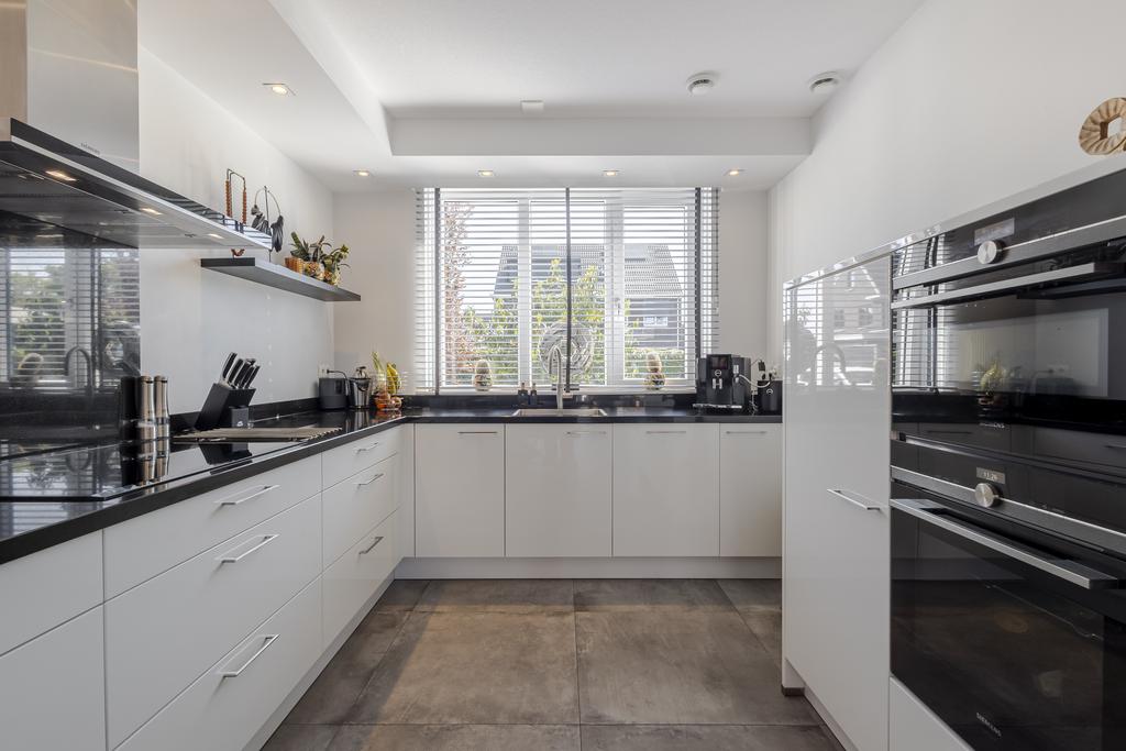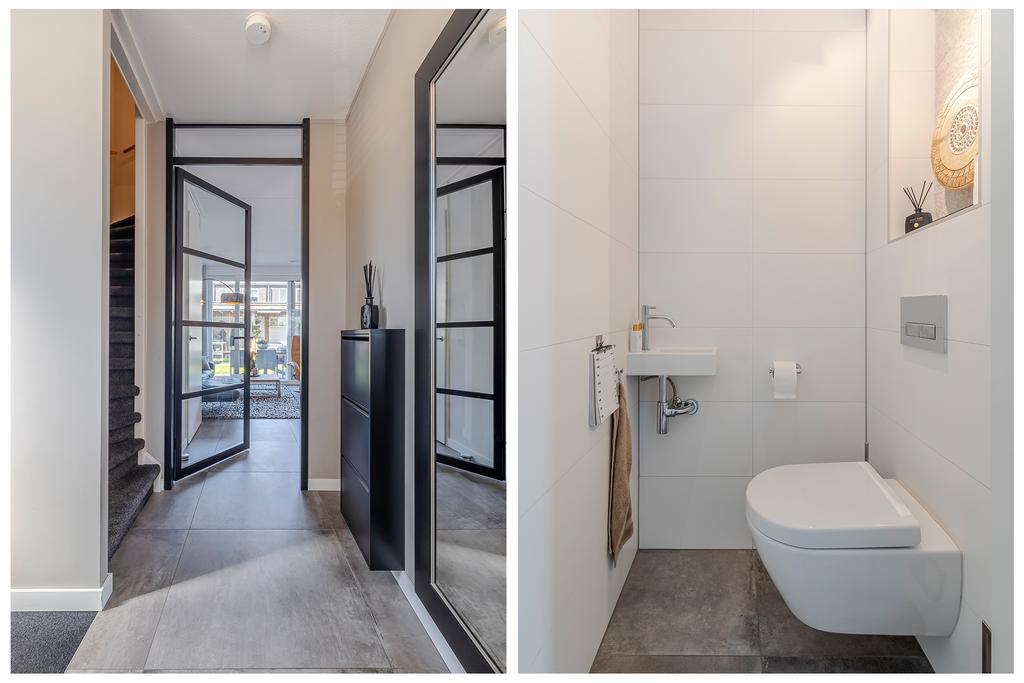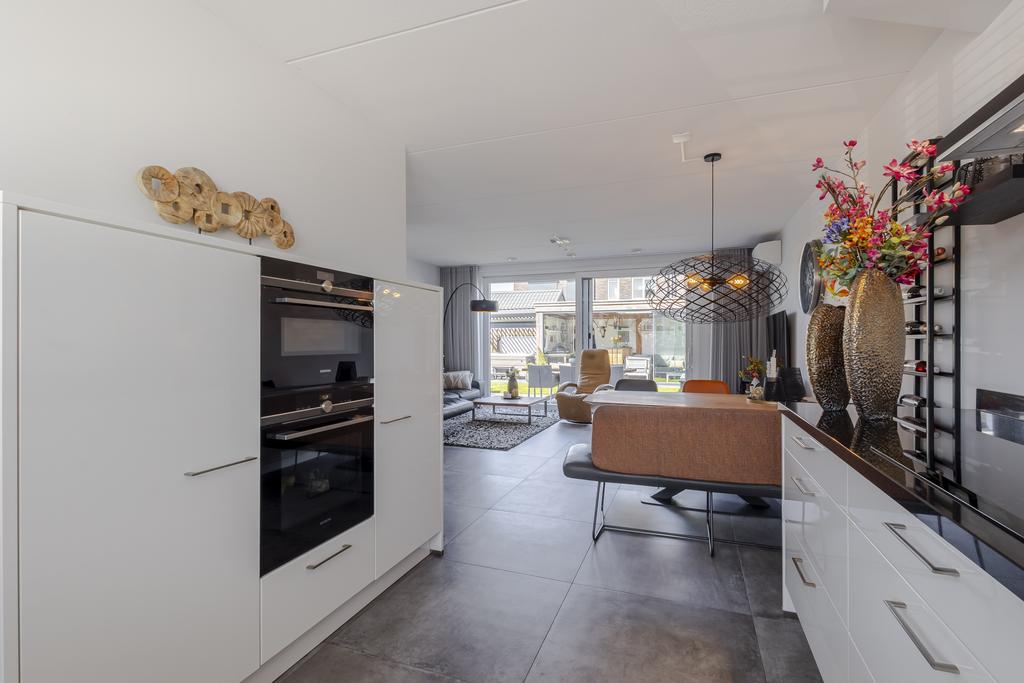 Begane grond: een praktische zijentree met aangrenzende hal voorzien van toilet, meterkast en toegang tot de 1e verdieping en de woonkamer. De lichte woonkamer met aangrenzend de open keuken heeft via een schuifpui toegang tot de achtertuin. De keuken is gesitueerd aan de voorzijde van de woning en voorzien van een moderne hoek- duo-opstelling met diverse inbouwapparatuur waaronder een vaatwasser, koelkast, vrieskast, inductiekookplaat, oven, combimagnetron en Quooker.