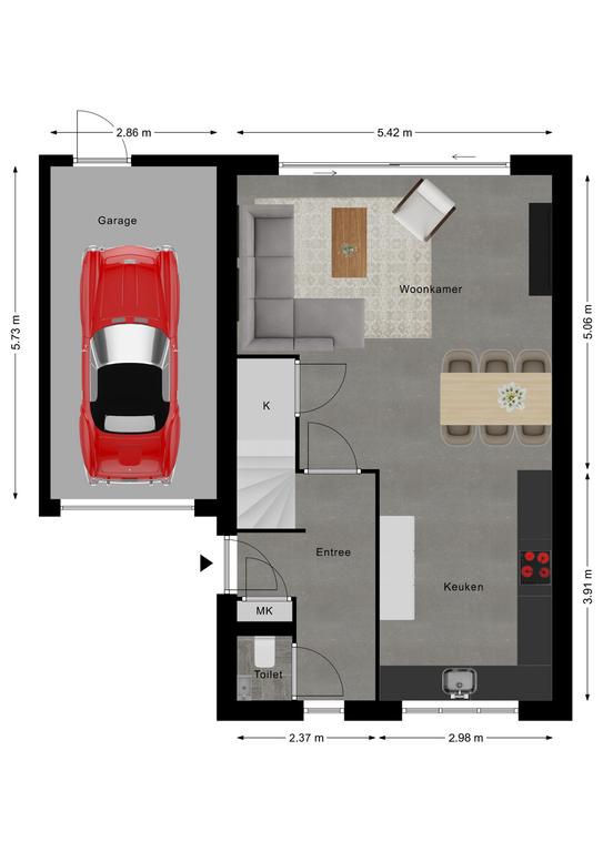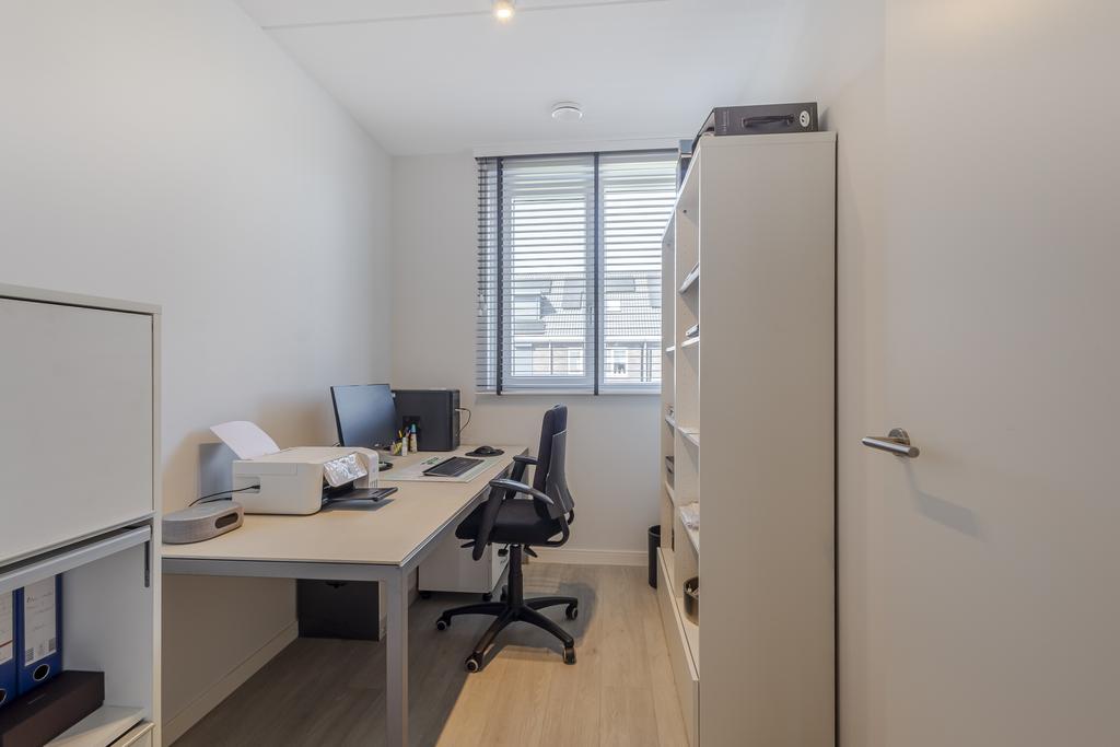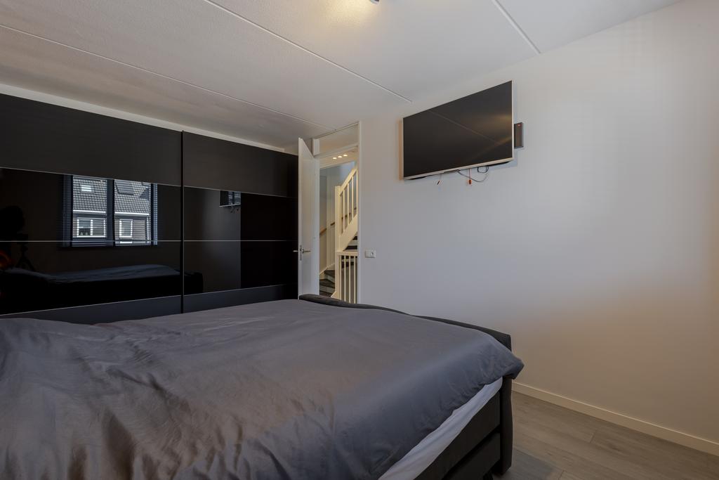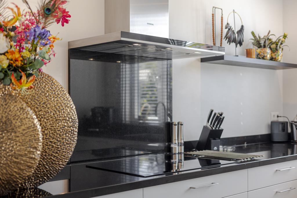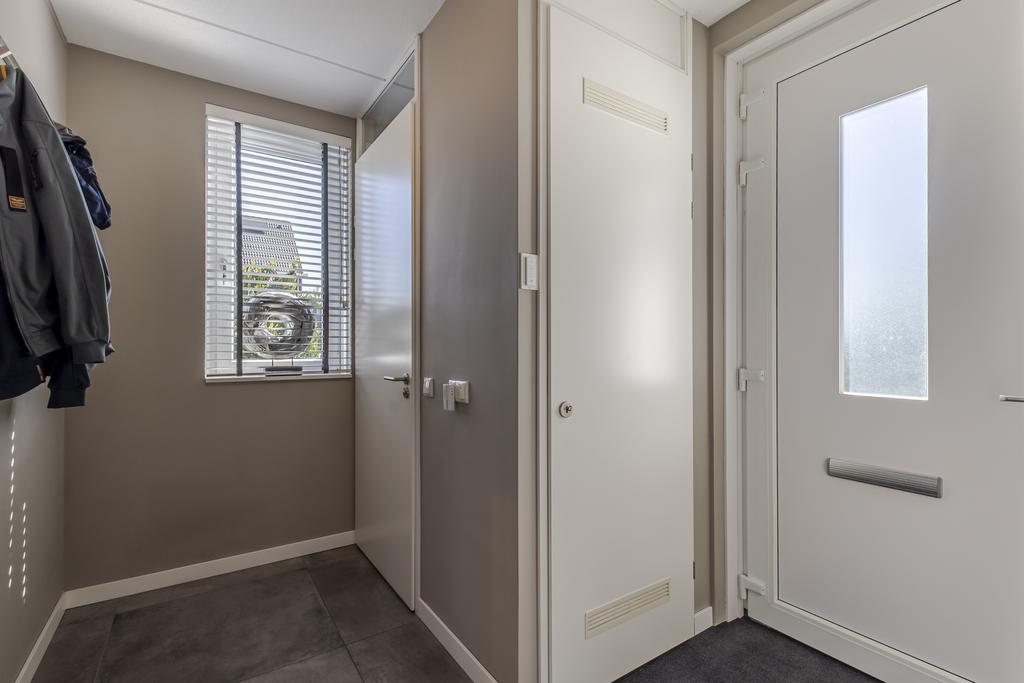 Begane grond: een praktische zijentree met aangrenzende hal voorzien van toilet, meterkast en toegang tot de 1e verdieping en de woonkamer. De lichte woonkamer met aangrenzend de open keuken heeft via een schuifpui toegang tot de achtertuin. De keuken is gesitueerd aan de voorzijde van de woning en voorzien van een moderne hoek- duo-opstelling met diverse inbouwapparatuur waaronder een vaatwasser, koelkast, vrieskast, inductiekookplaat, oven, combimagnetron en Quooker.