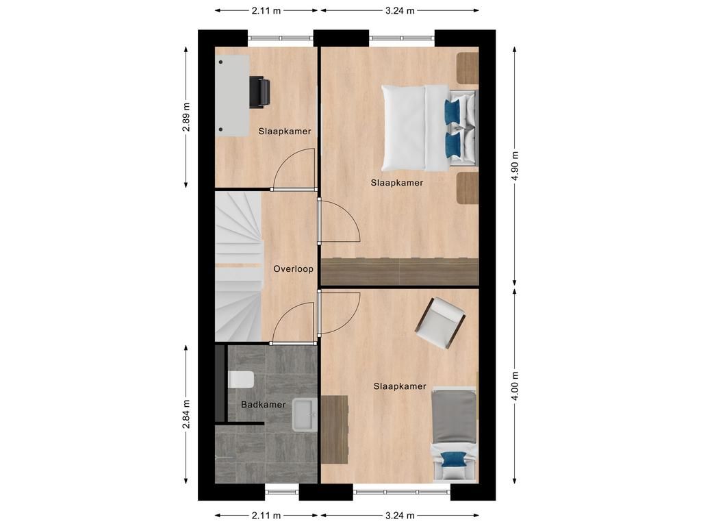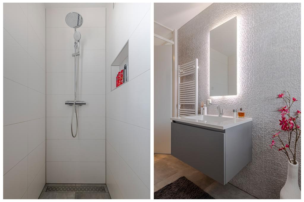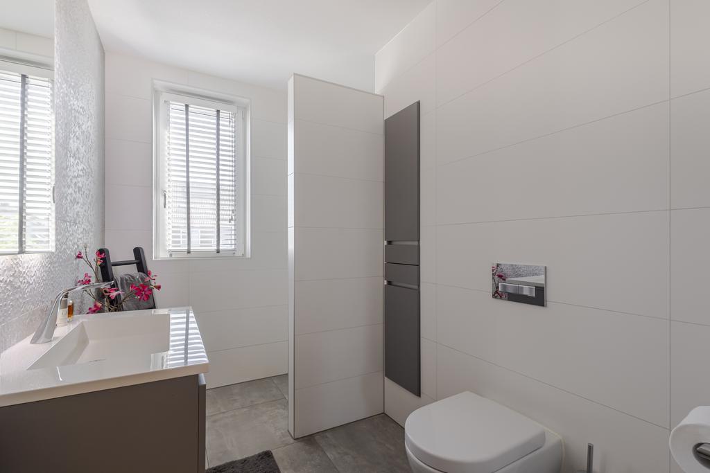 1e Verdieping: een overloop t.b.v. 3 slaapkamers, de badkamer en de vaste trap naar de 2e verdieping. De lichte en goed afgewerkte badkamer is voorzien van een grote inloopdouche, 2e toilet, wastafelmeubel, designradiator en vaste badkamerkast.