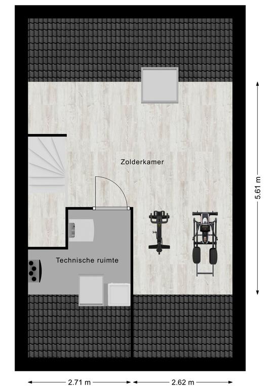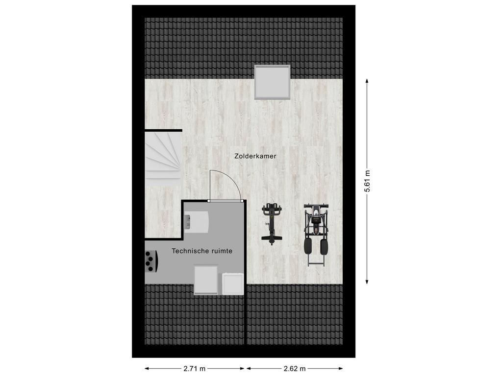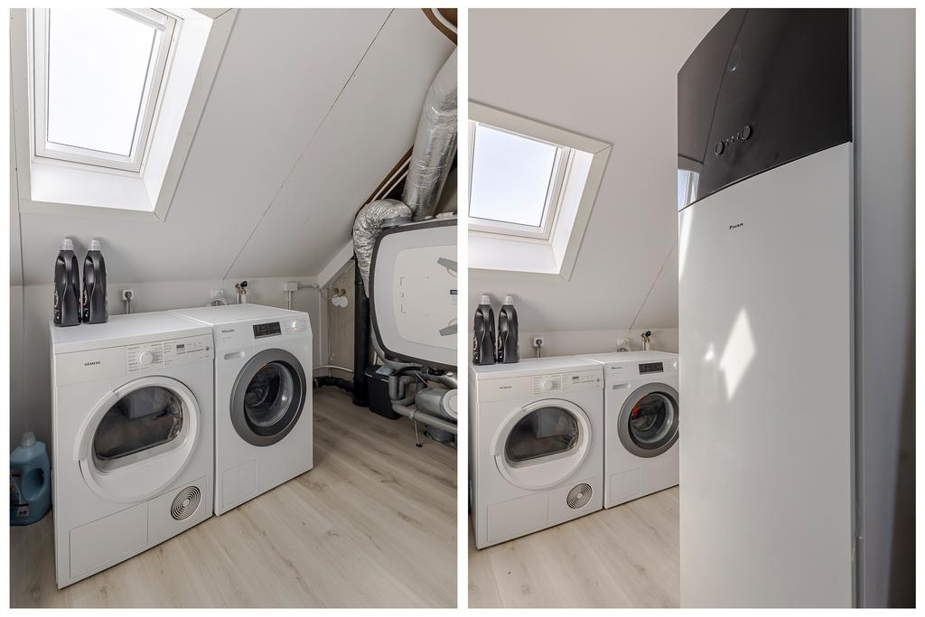 2e Verdieping: een ruime zolderkamer met Velux dakvenster en toegang tot de technische ruimte met warmtepomp, ventilatie-box en witgoedaansluitingen.