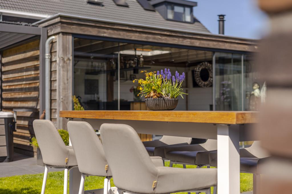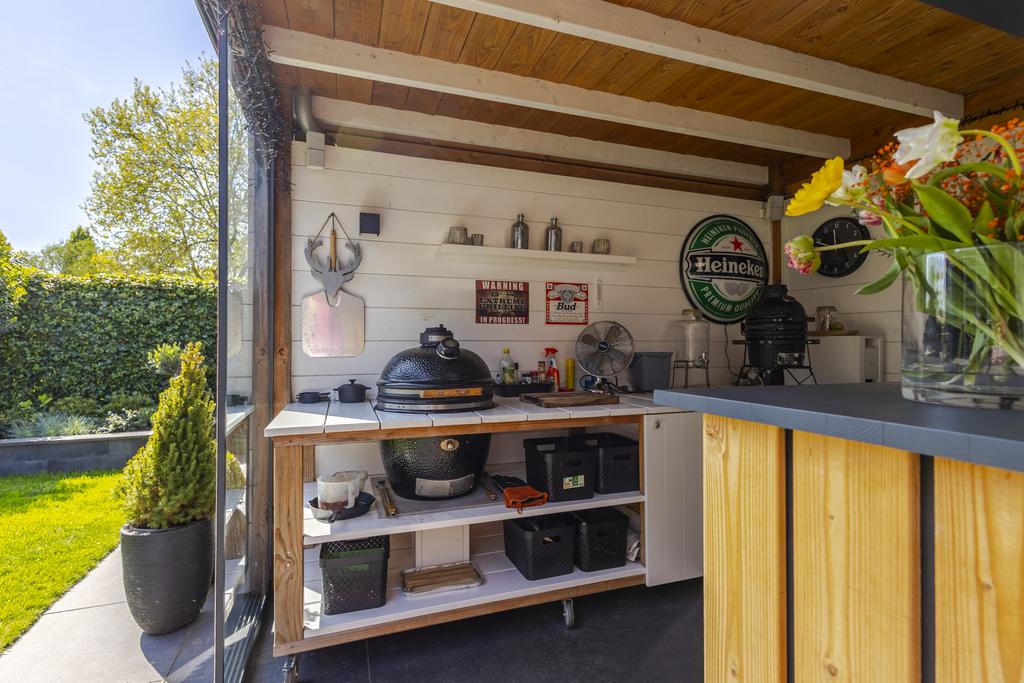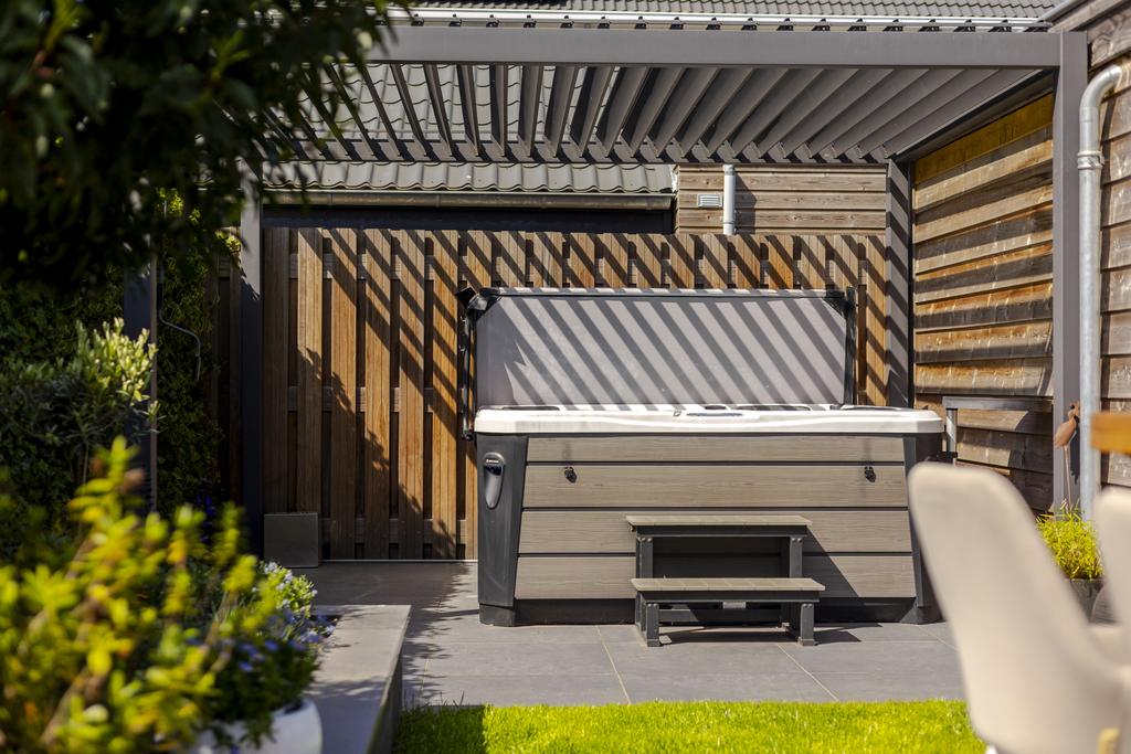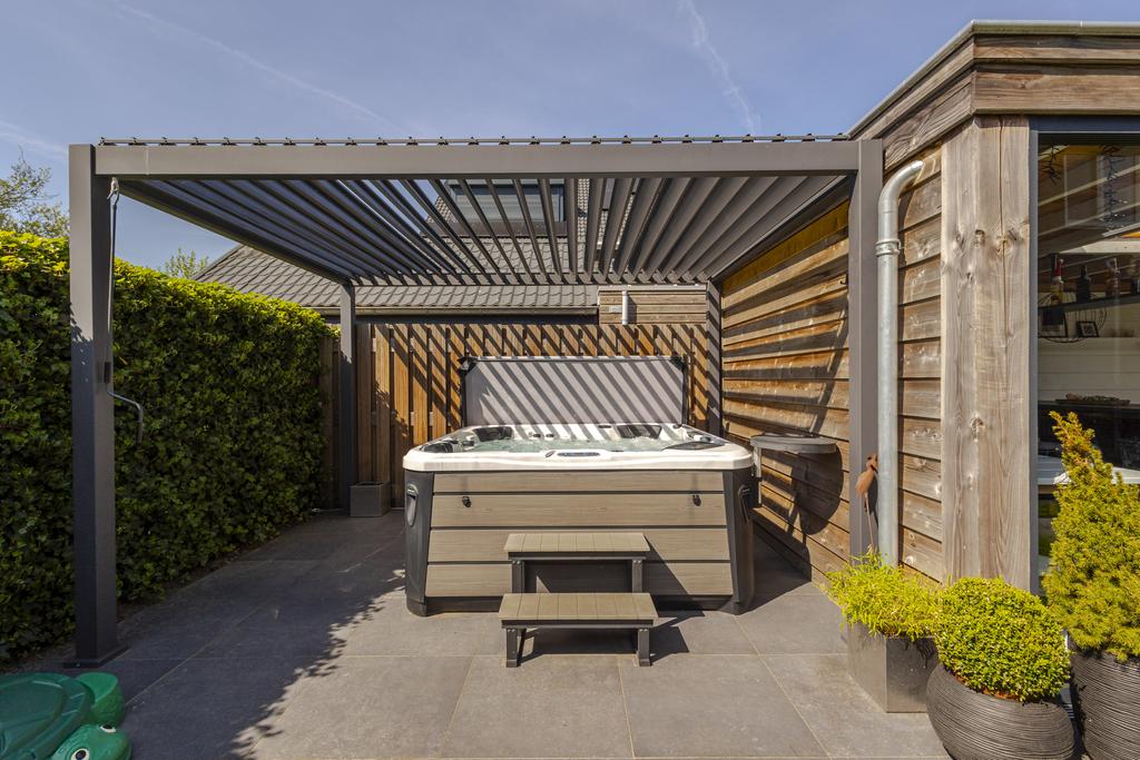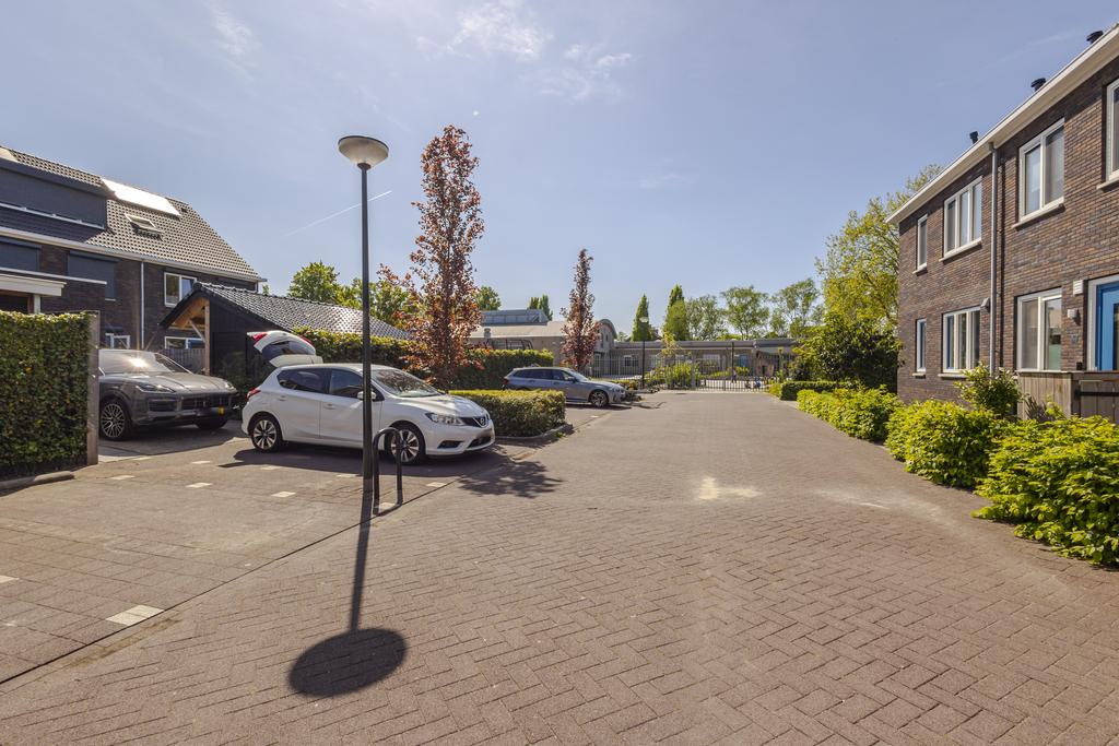 De woning ligt aan het einde van een verkeersluwe straat met diverse parkeervakken. Voor de garage is een praktische oprit waardoor je op eigen terrein kan parkeren of een boot, caravan of aanhanger kunt stallen. Naast de garage is er nog een ‘achterom’ naar de achtertuin. De achtertuin is fraai aangelegd en is naast de jacuzzi en tuinpaviljoen voorzien van een terras, gazon, vijverpartij, plantenborders en hardhouten erfafscheidingen. Een elektrisch bedienbaar zonnescherm en screens maken het plaatje compleet.