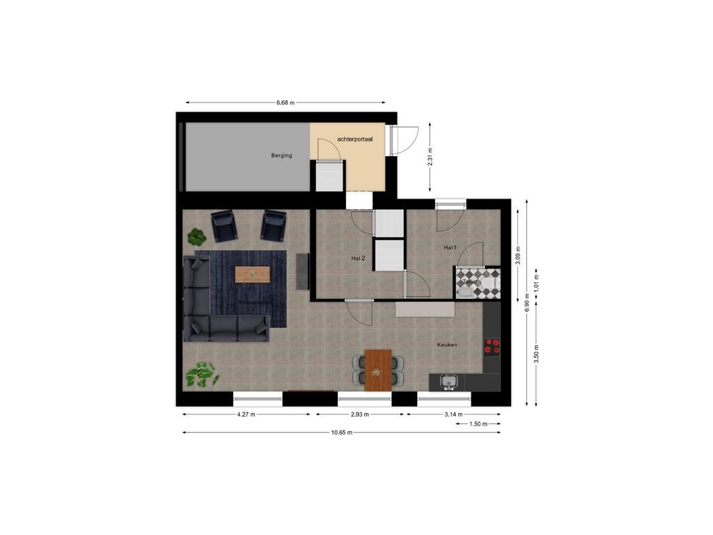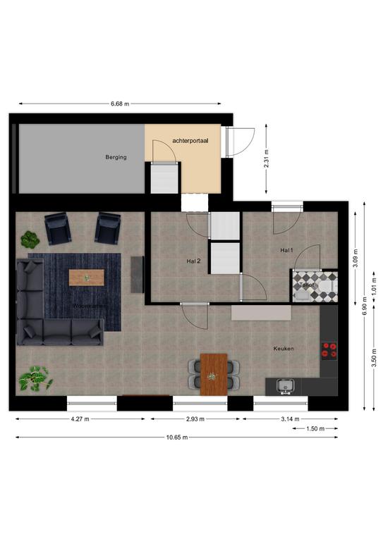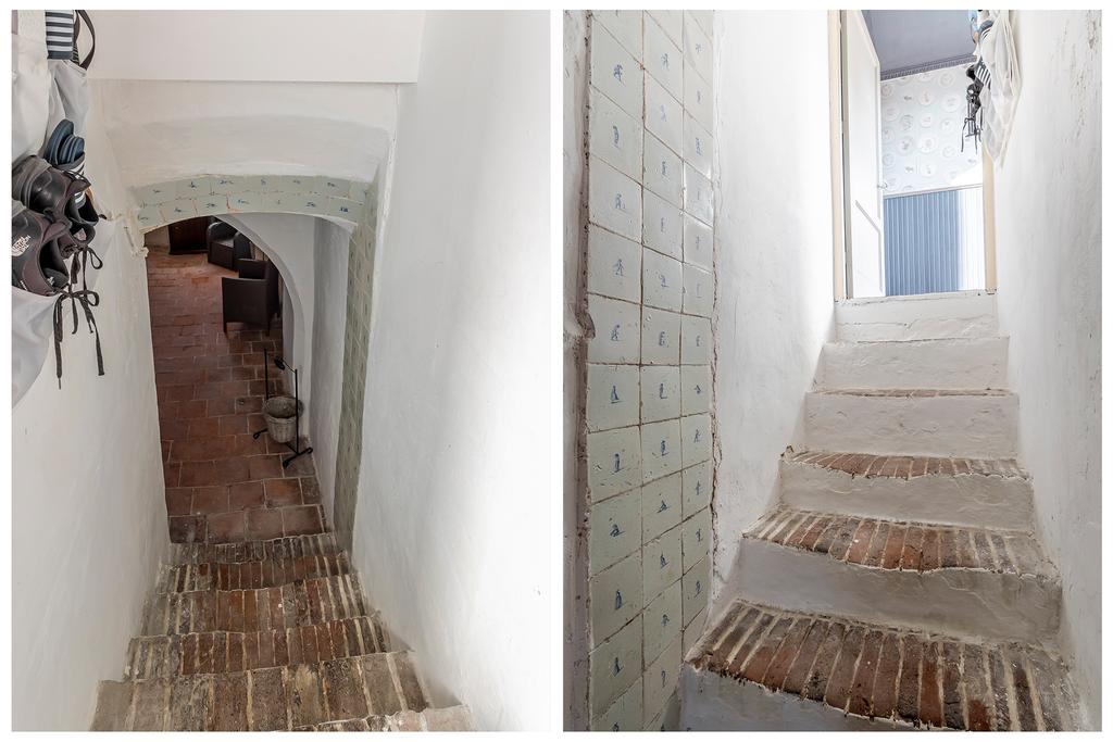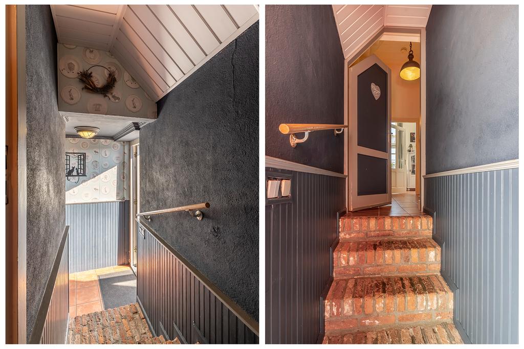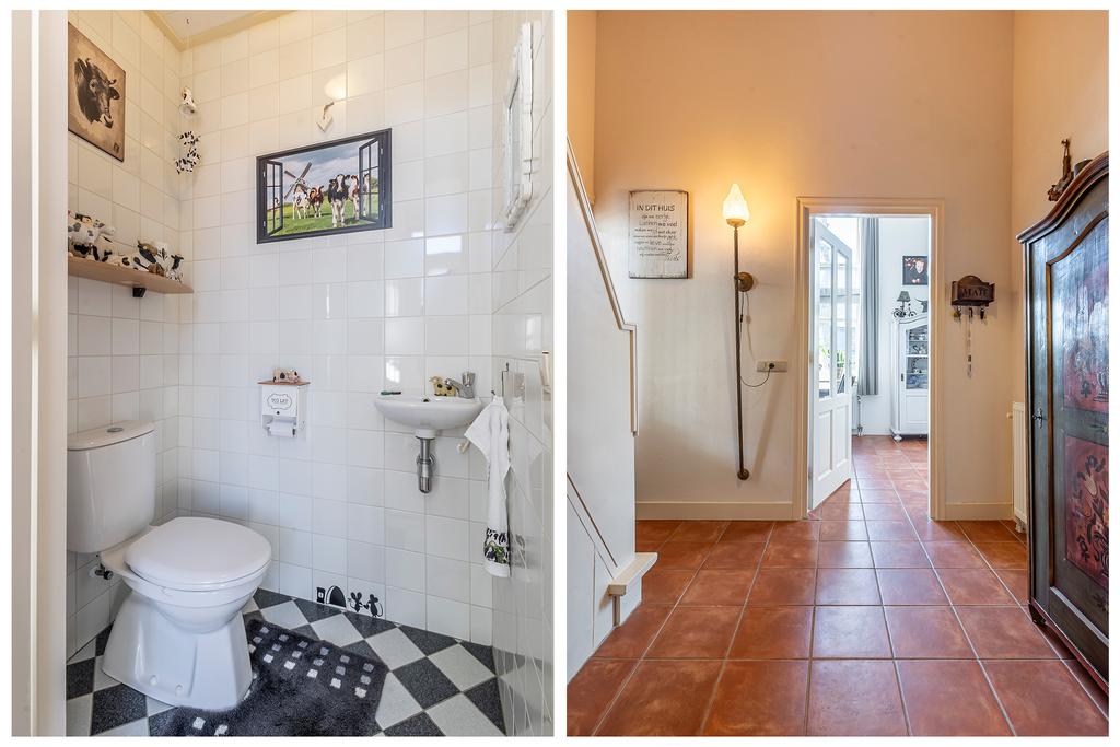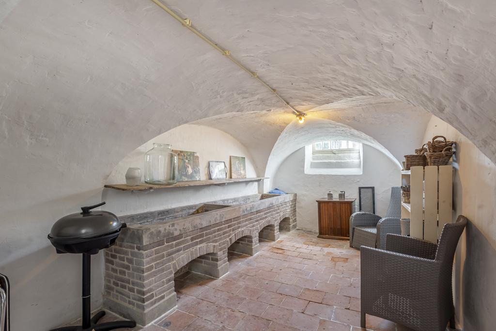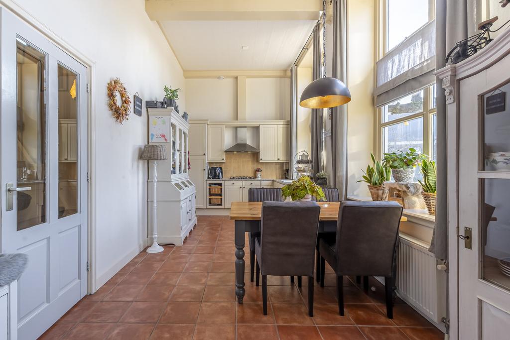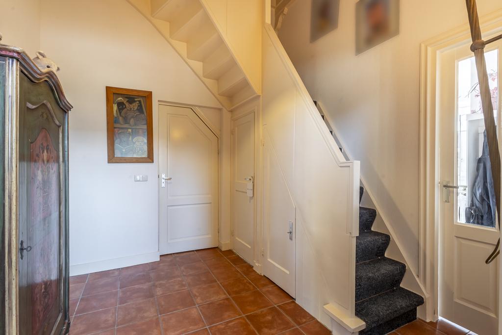 Begane grond: de hal/entree aan de achterzijde geeft toegang tot een hal (1) met toilet en meterkast, tussenhal (2) met trapopgang en toegang tot de woonkamer de kelder (1) en het achterportaal. Vanuit het achterportaal is de inpandige berging, kelder (2) en de tuin bereikbaar. De woonkamer met plavuizenvloer en vloerverwarming heeft bijzonder hoge plafonds (4.30 meter), hoge ramen en is voorzien van enorme antieke schouw met historische wandtegels (1850). De aangrenzende open keuken is voorzien van een hoekopstelling met diverse inbouwapparatuur. In de gewelfde kelders met stahoogte zijn de originele vloertegels, wandtegels en pekelbakken met kaasplank nog in goede staat aanwezig.