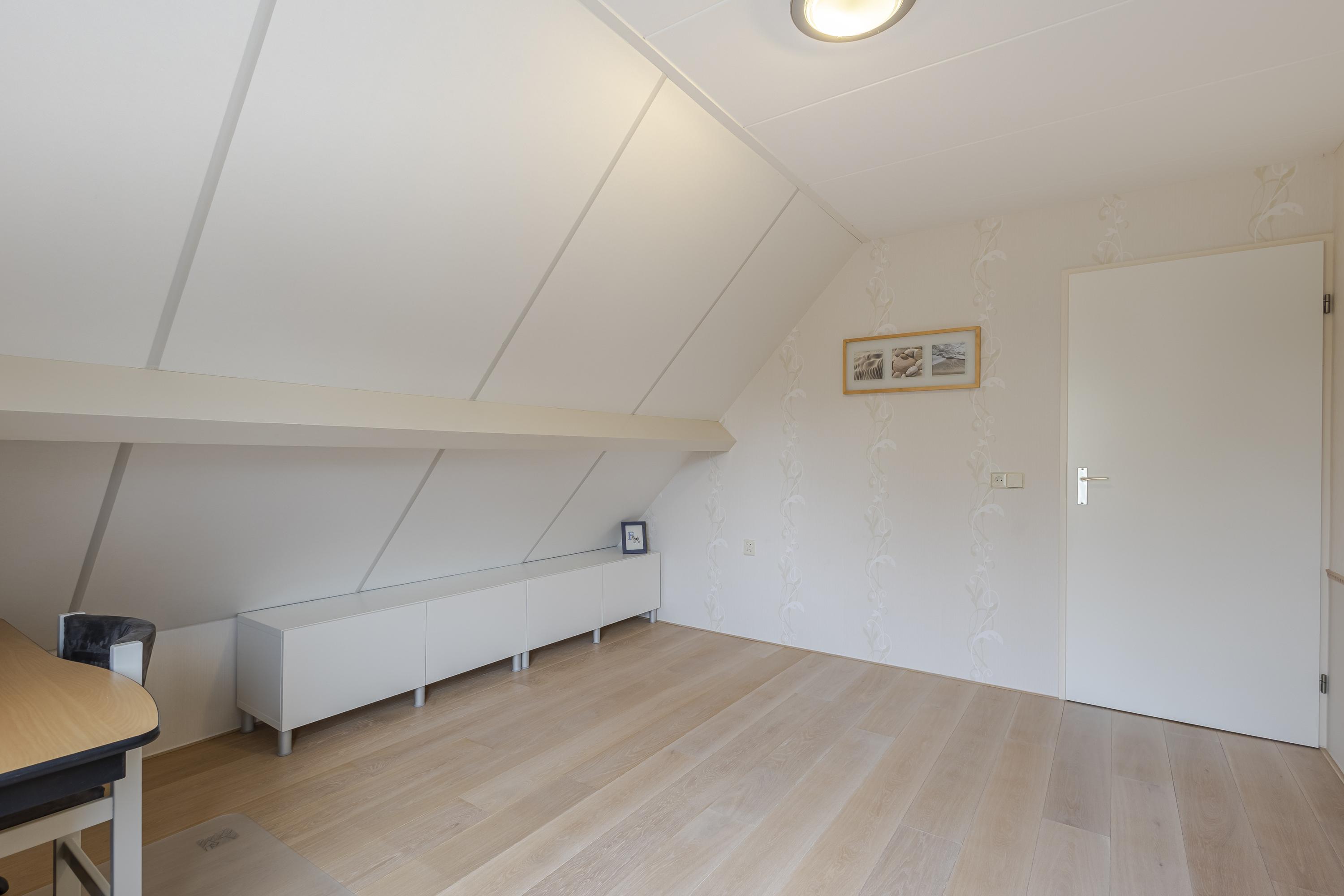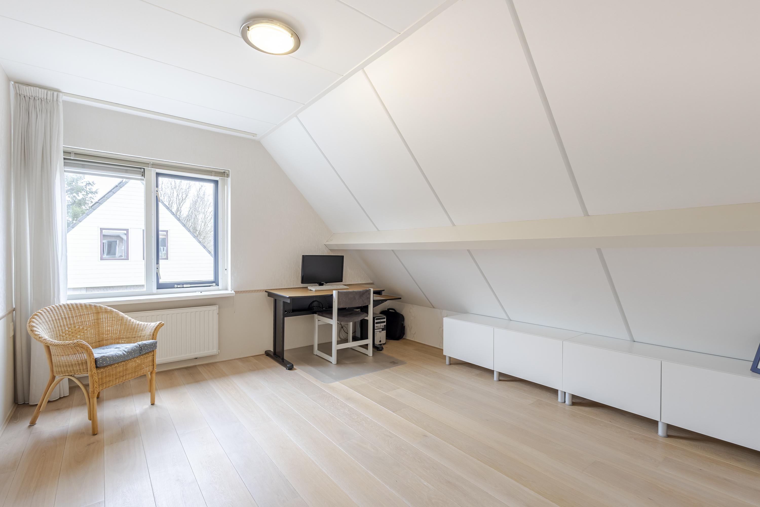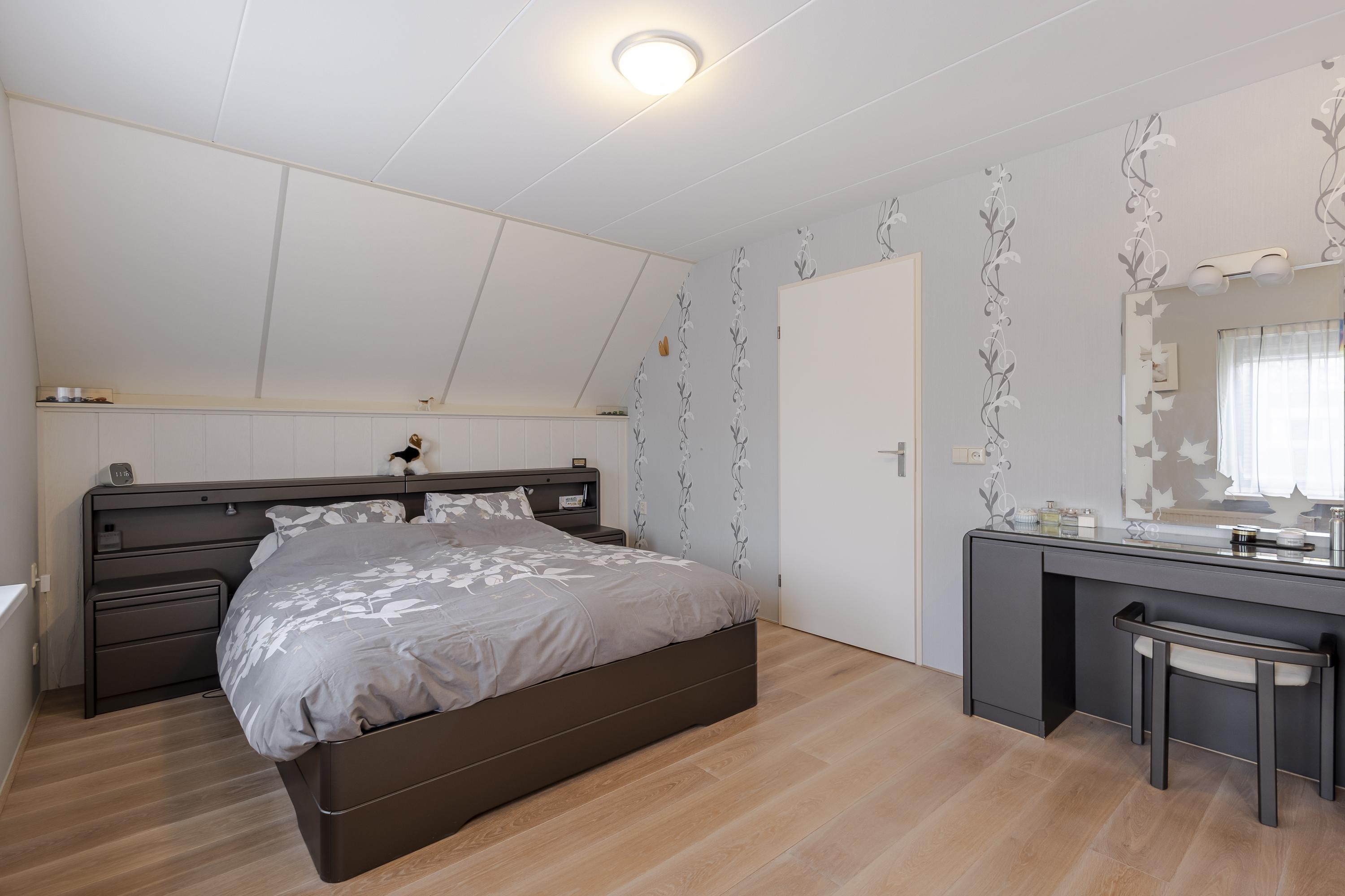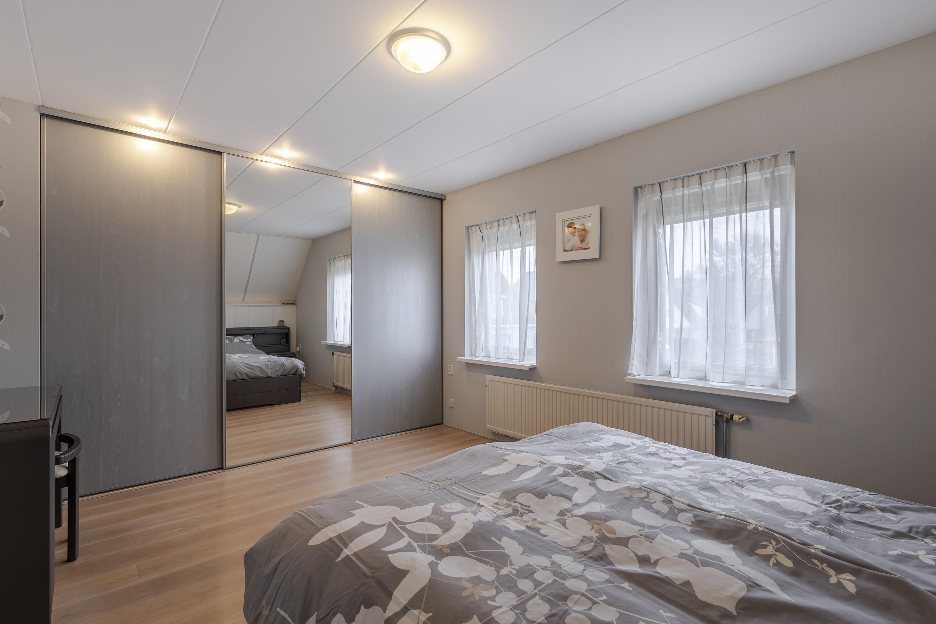 Op de eerste verdieping bevinden zich drie ruime slaapkamers met volop vaste bergruimte. De overloop beschikt over een grote kast en de masterbedroom is voorzien van een royale schuifwandkast. Daarnaast is er een ruime bergzolder, bereikbaar via een vlizotrap. De badkamer is compleet uitgevoerd met ligbad, douche, wastafelmeubel en tweede toilet.