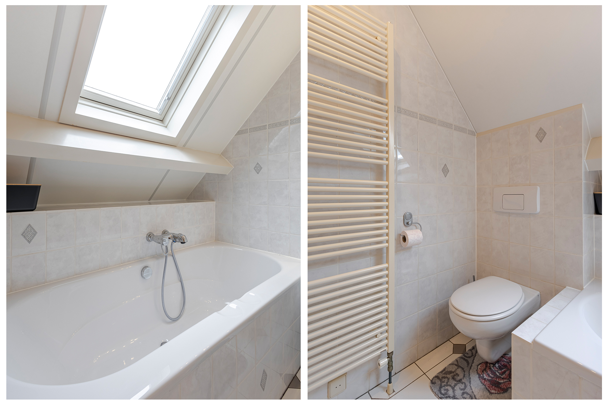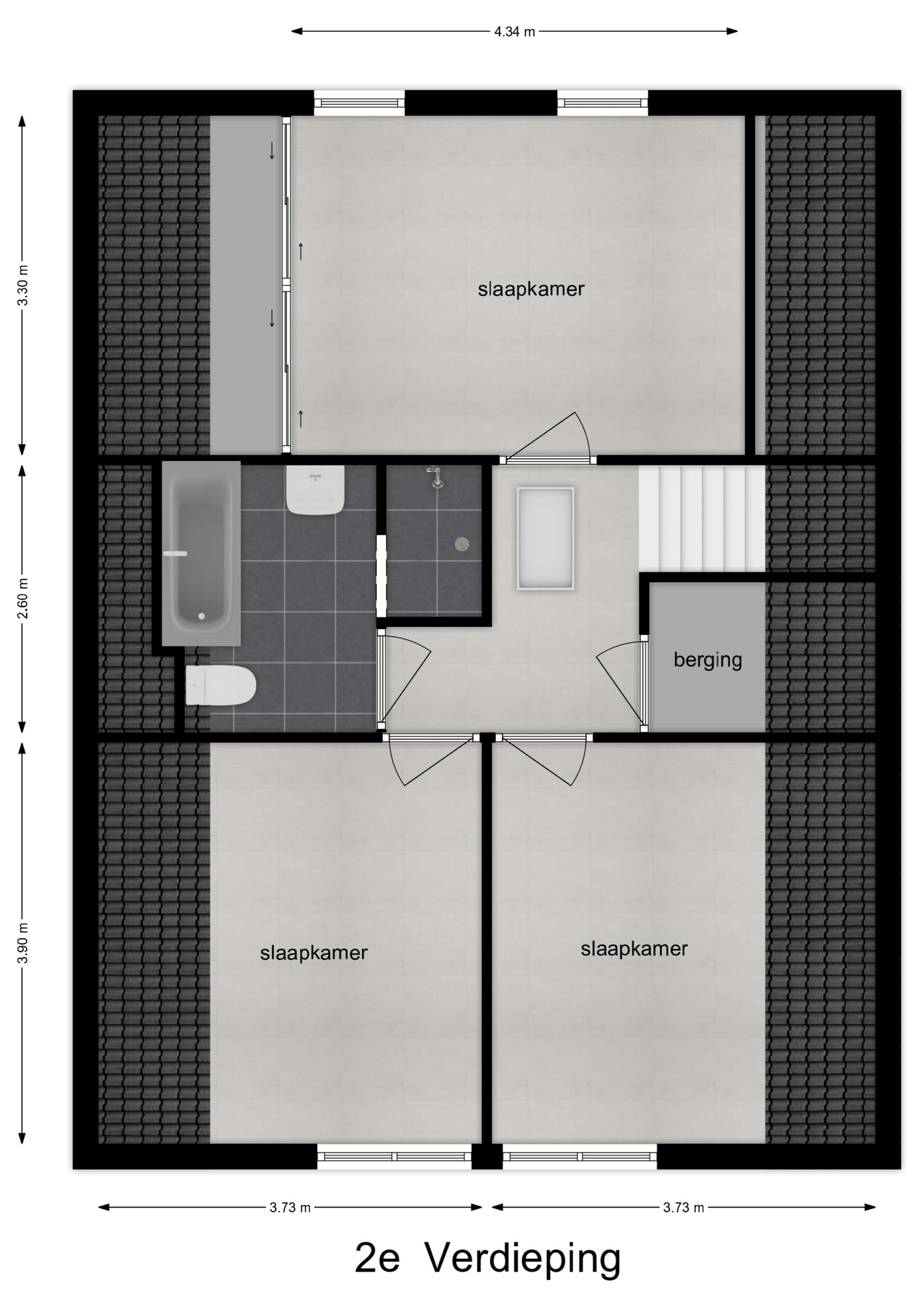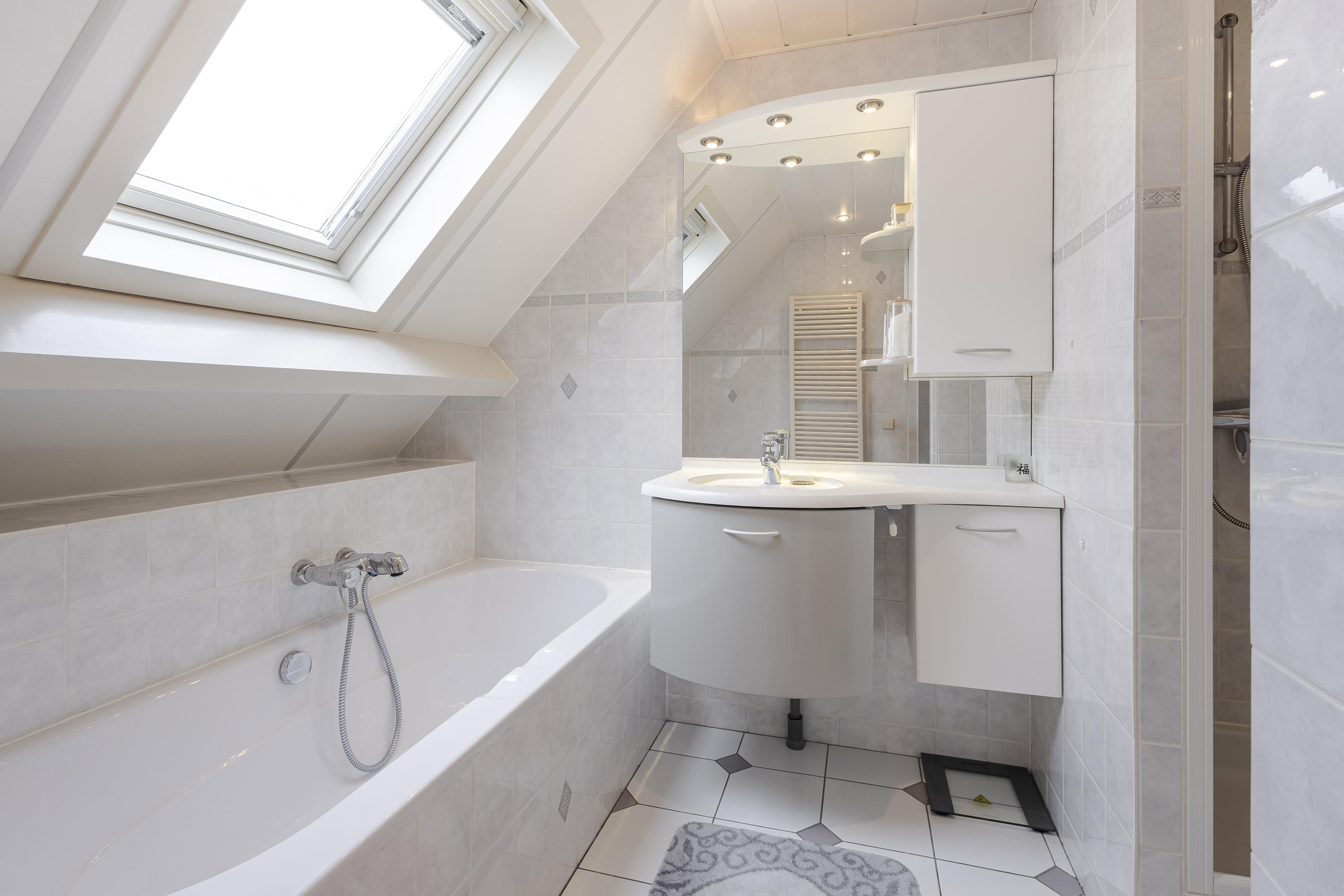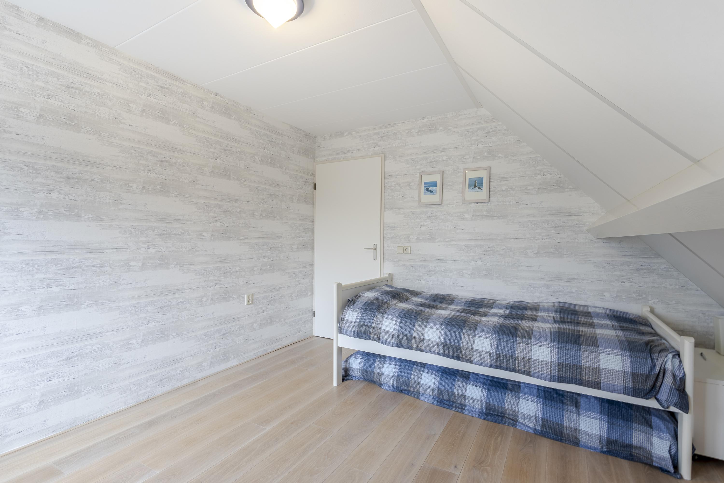 Op de eerste verdieping bevinden zich drie ruime slaapkamers met volop vaste bergruimte. De overloop beschikt over een grote kast en de masterbedroom is voorzien van een royale schuifwandkast. Daarnaast is er een ruime bergzolder, bereikbaar via een vlizotrap. De badkamer is compleet uitgevoerd met ligbad, douche, wastafelmeubel en tweede toilet.