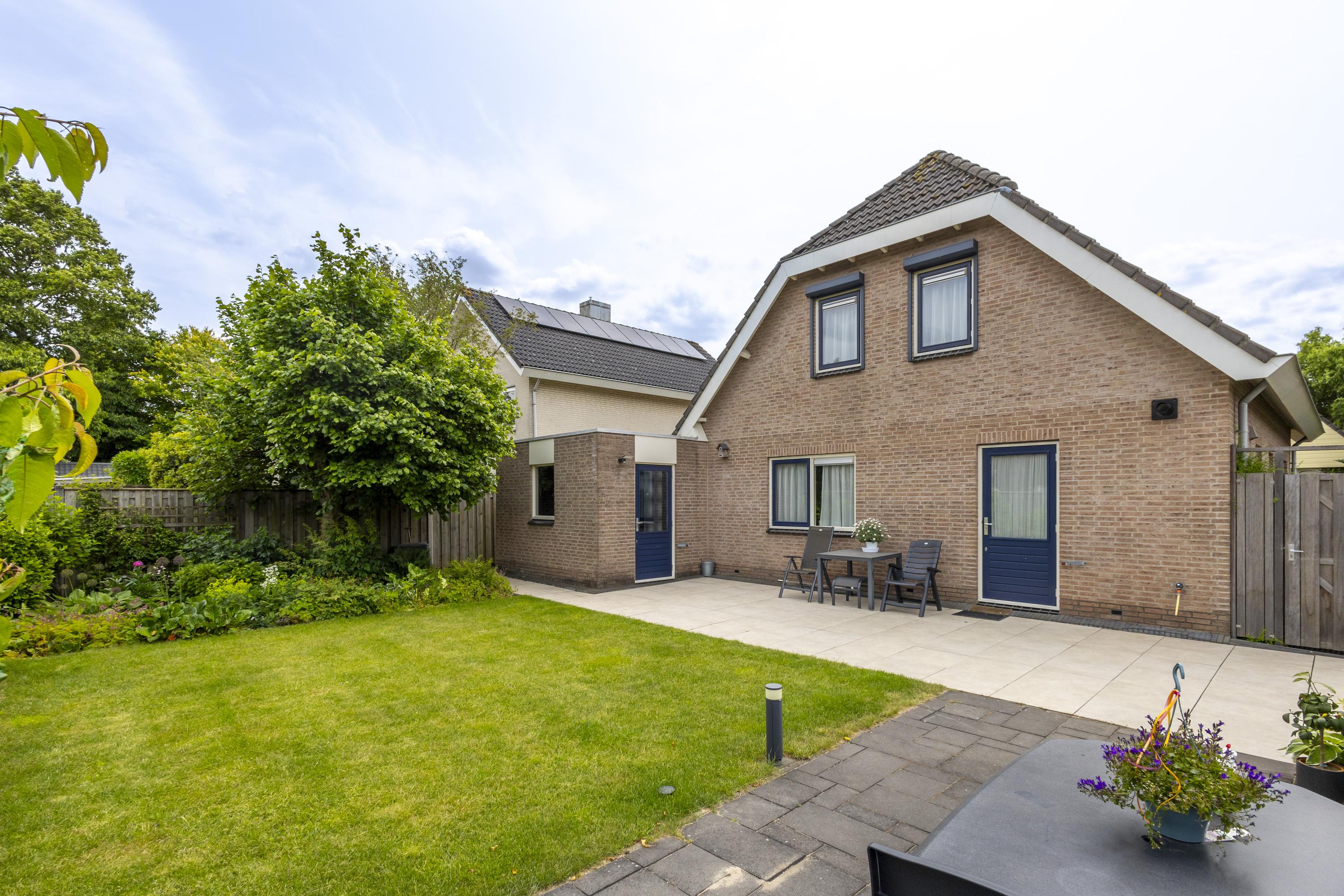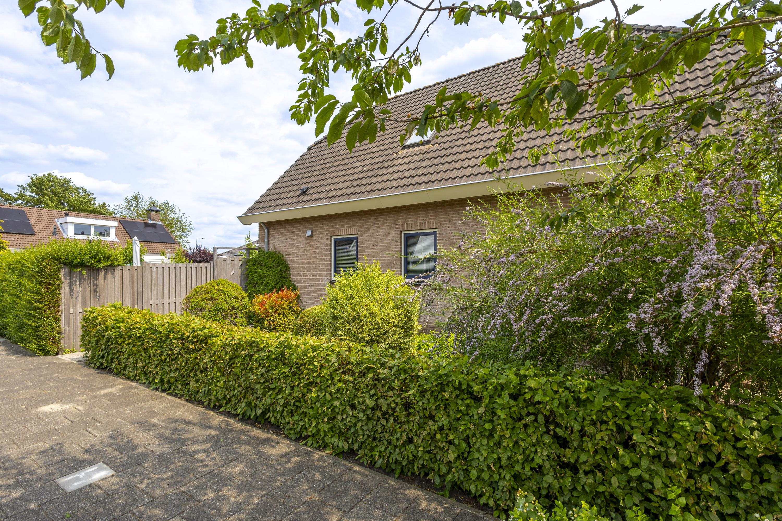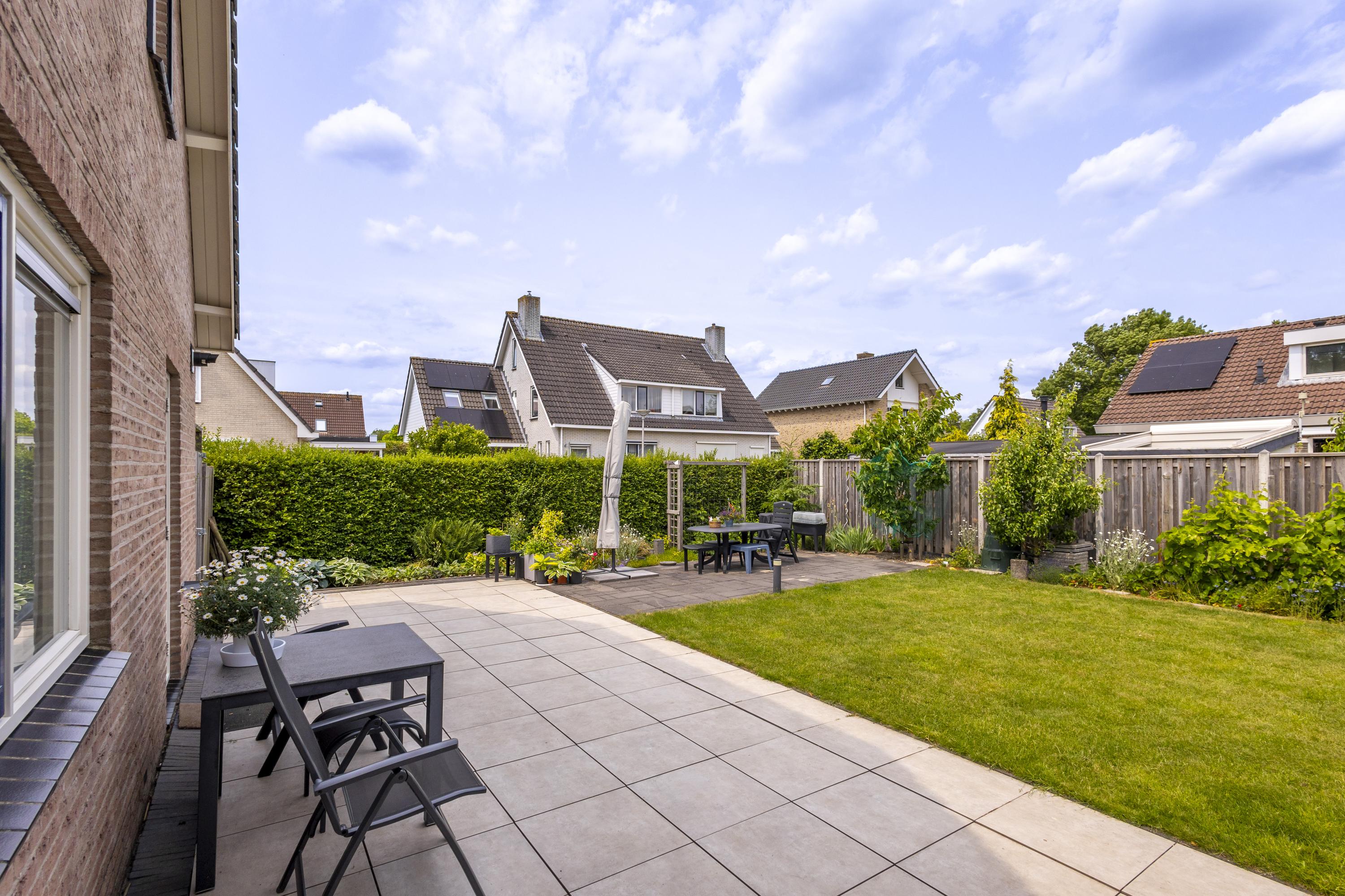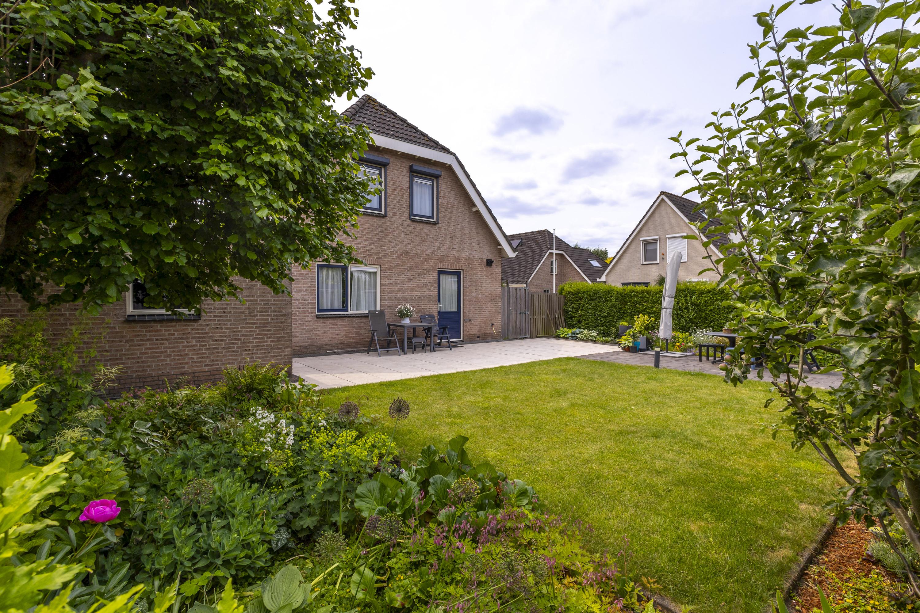 De tuin rondom de woning versterkt het gevoel van vrijheid. De achtertuin vormt het gezellige middelpunt, waar gazon, sierbestrating en kleurrijke plantenborders elkaar afwisselen. In de zomer ontstaat hier een prachtig groen decor om van te genieten.