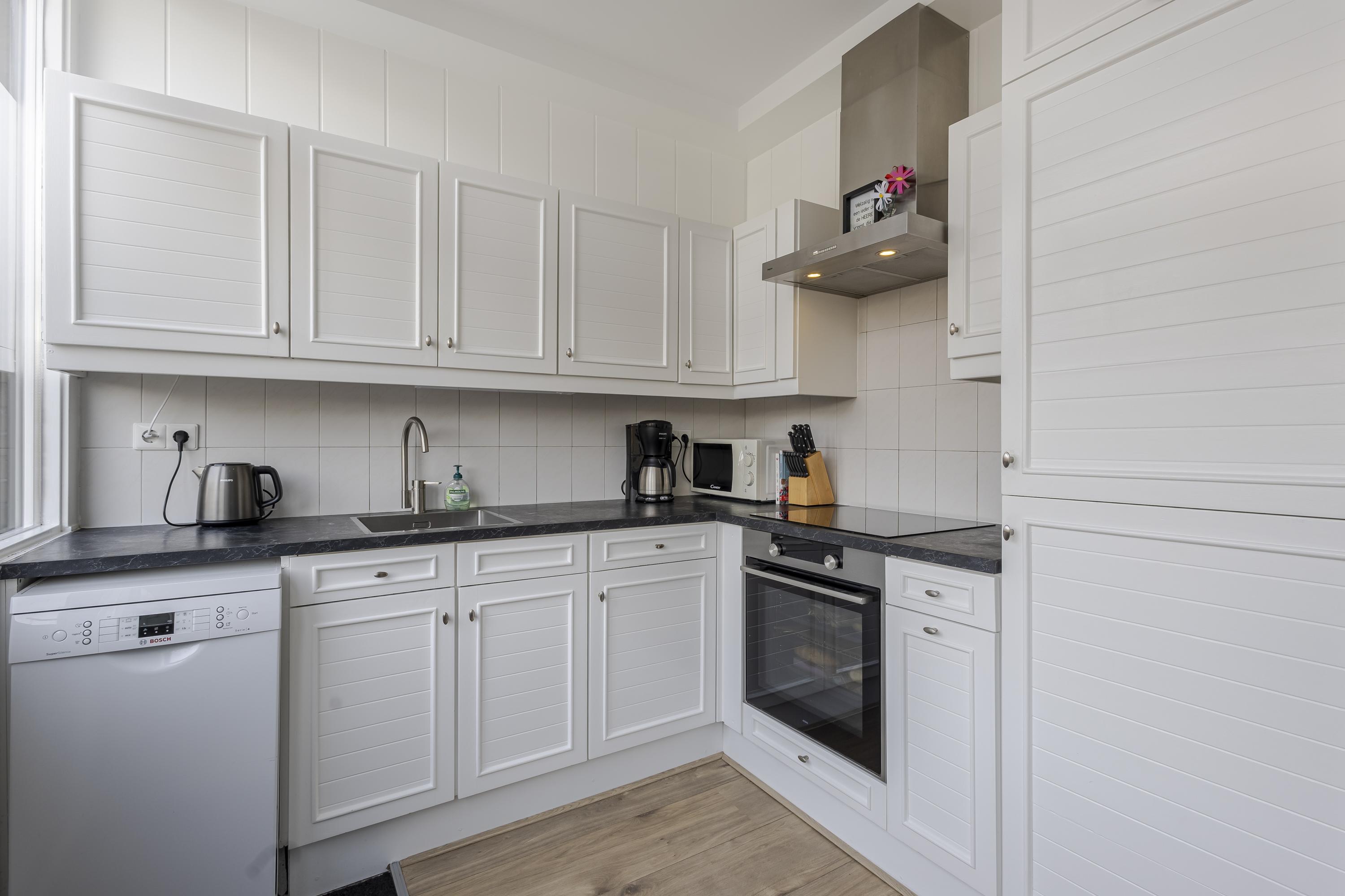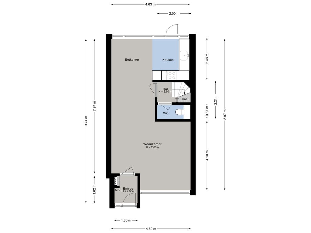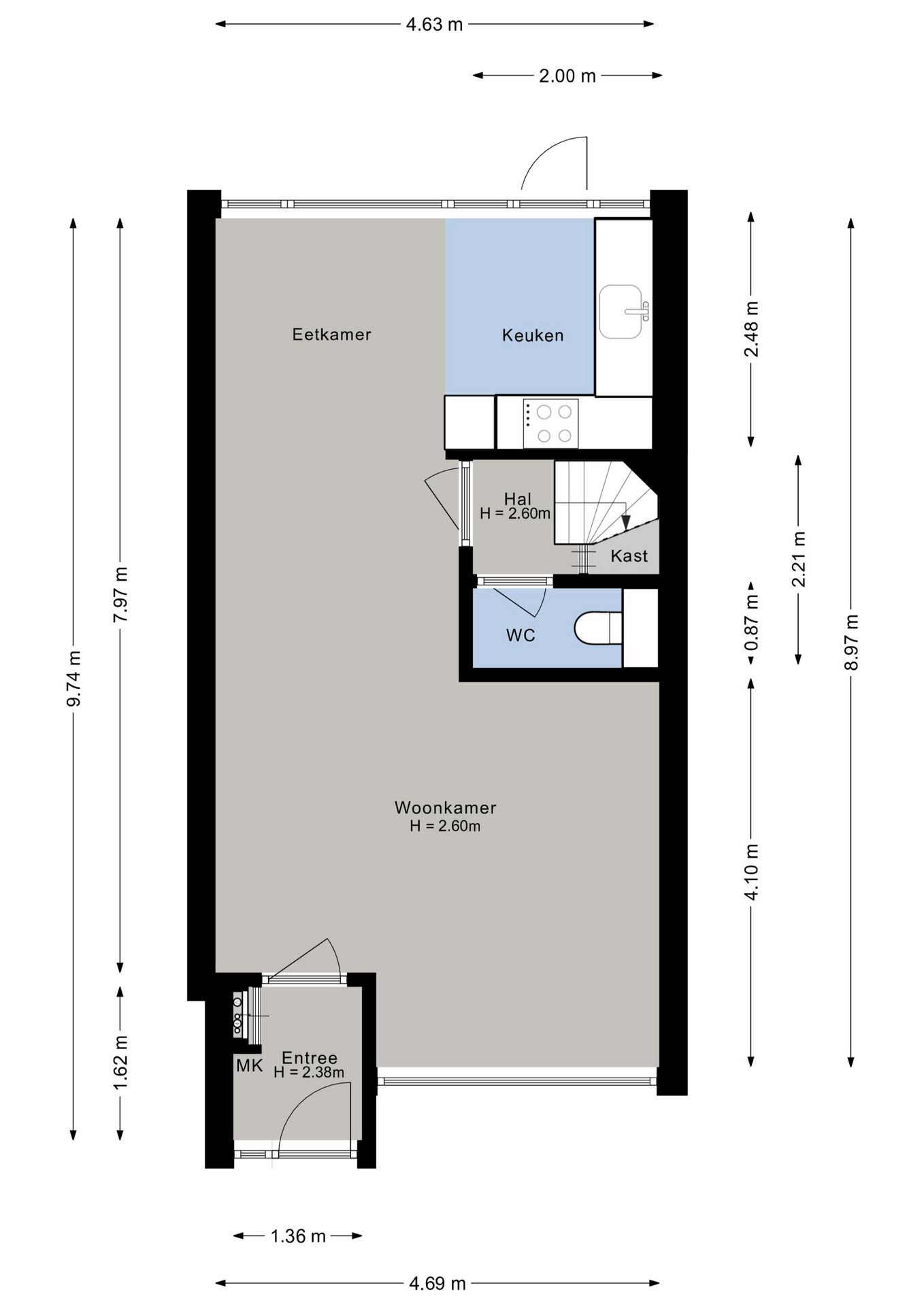 Via de hal met meterkast betreedt u de lichte woonkamer, waar grote raampartijen aan zowel de voor- als achterzijde zorgen voor een prettige lichtinval. De woonkamer staat in open verbinding met de keuken, die is uitgevoerd in een praktische hoekopstelling en voorzien is van diverse (inbouw)apparatuur. Vanuit het trapportaal zijn het toilet en de trap naar de eerste verdieping bereikbaar.