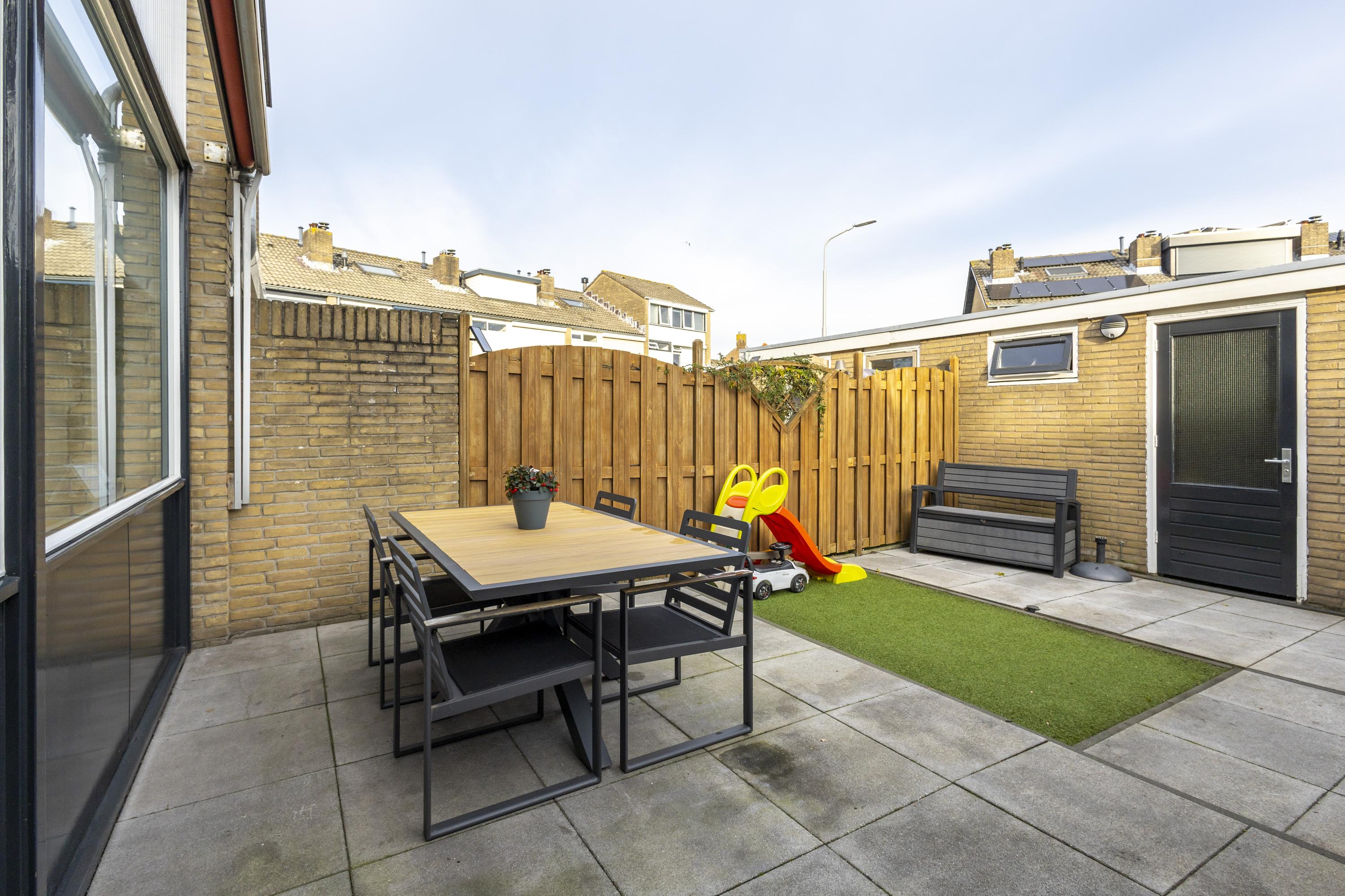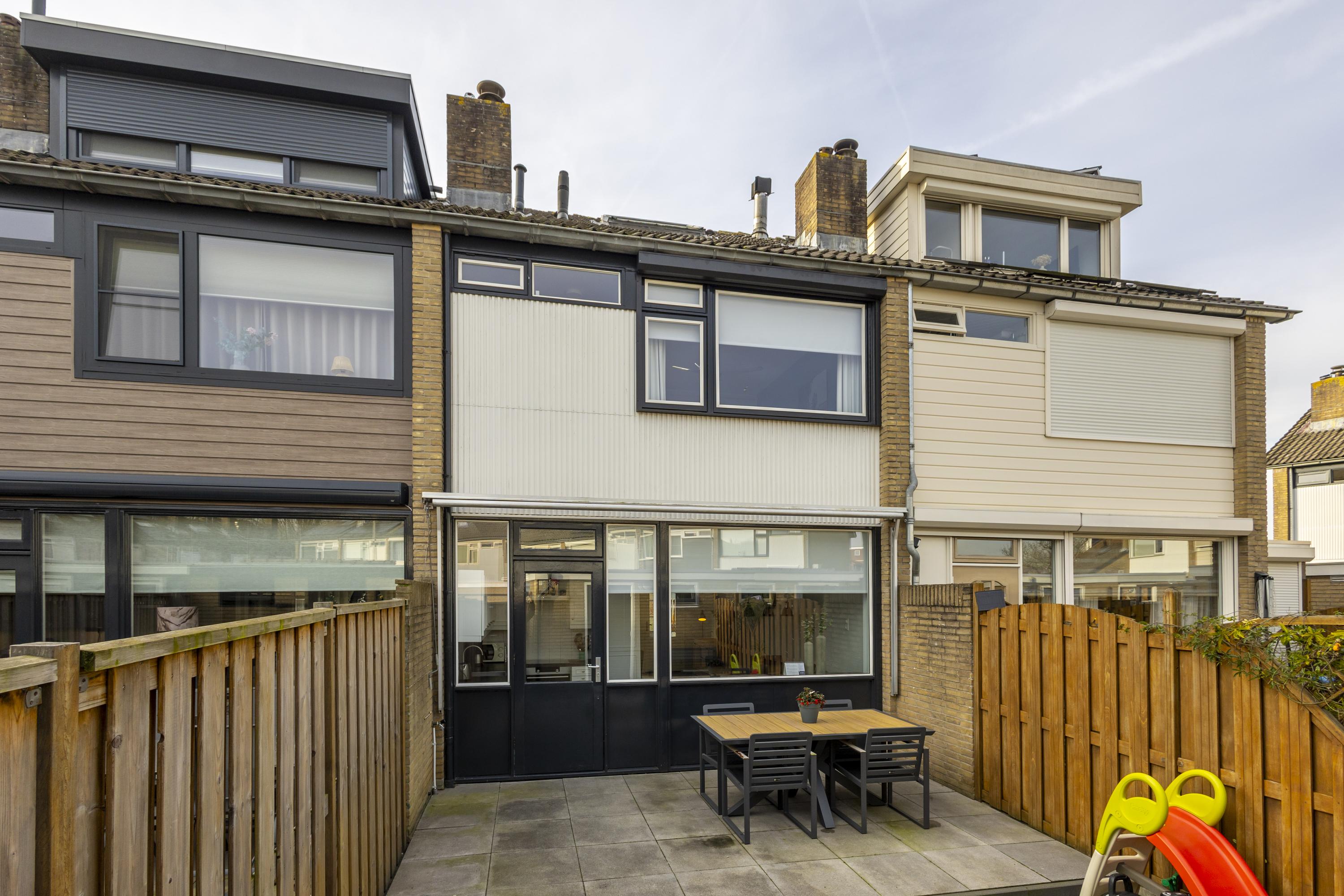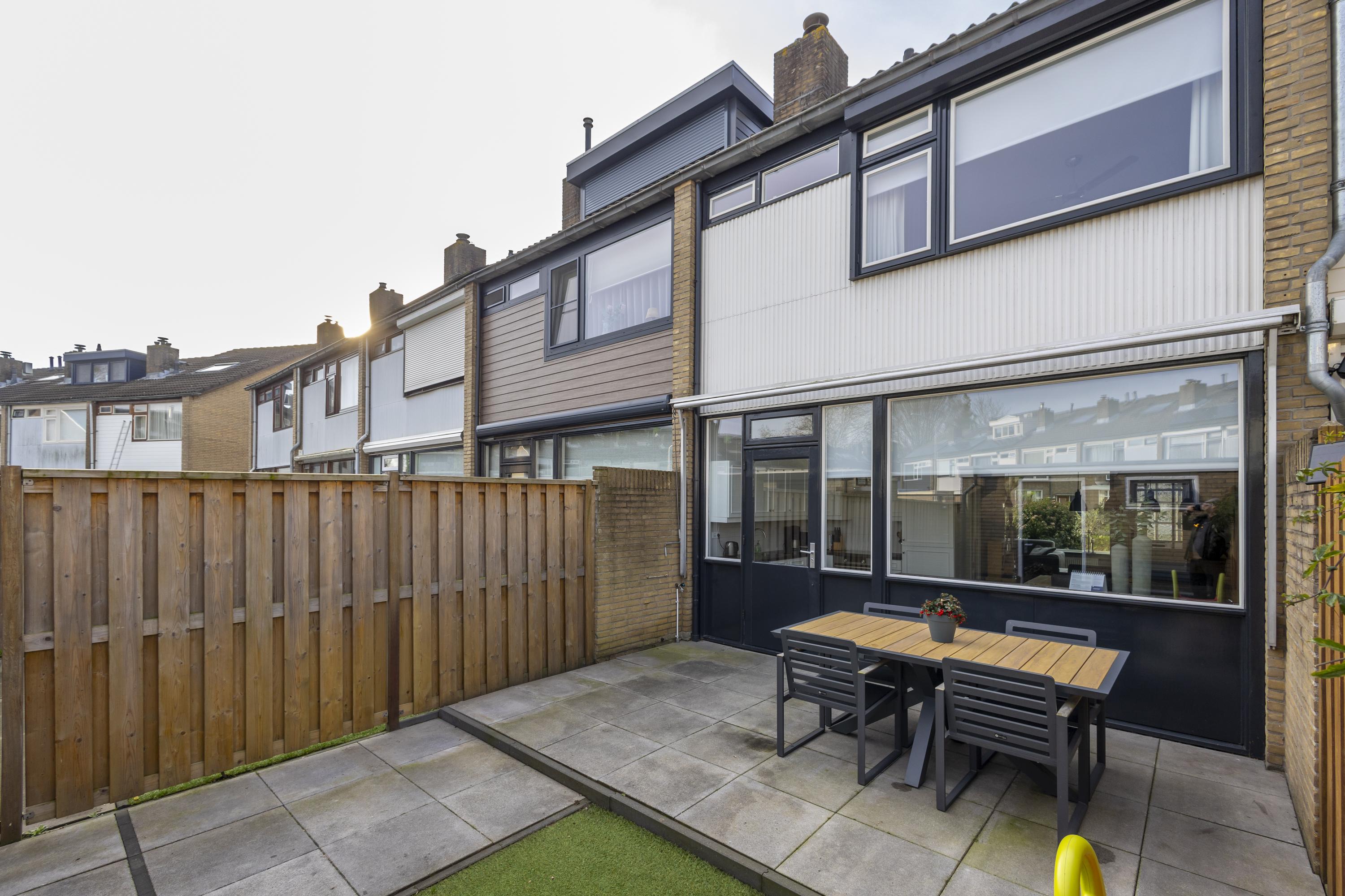De achtertuin is rustig gelegen en onderhoudsvriendelijk aangelegd met sierbestrating en kunstgras. Achterin de tuin staat een stenen berging met elektra en via de achterom bereikt u het achterliggende parkeerterrein.