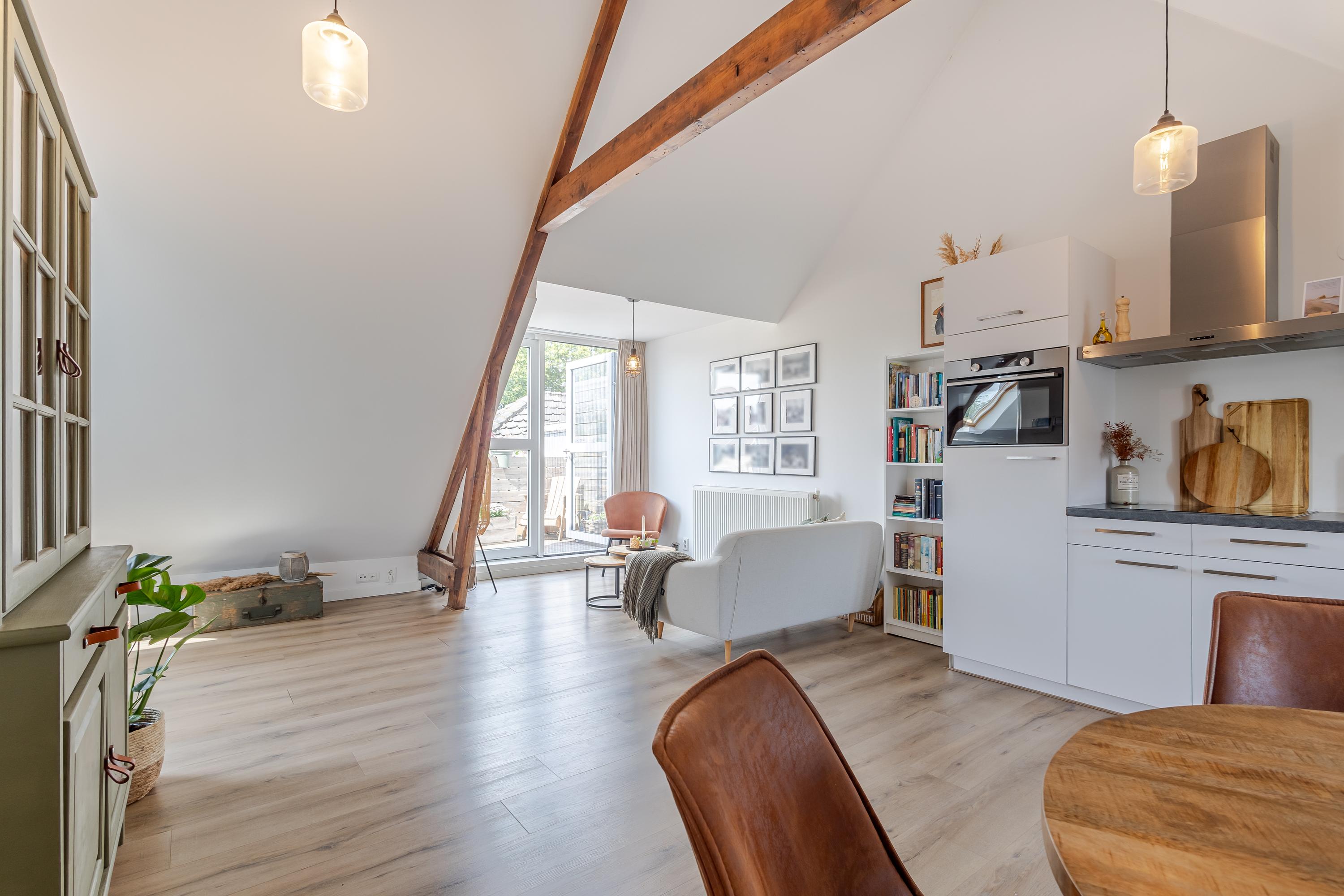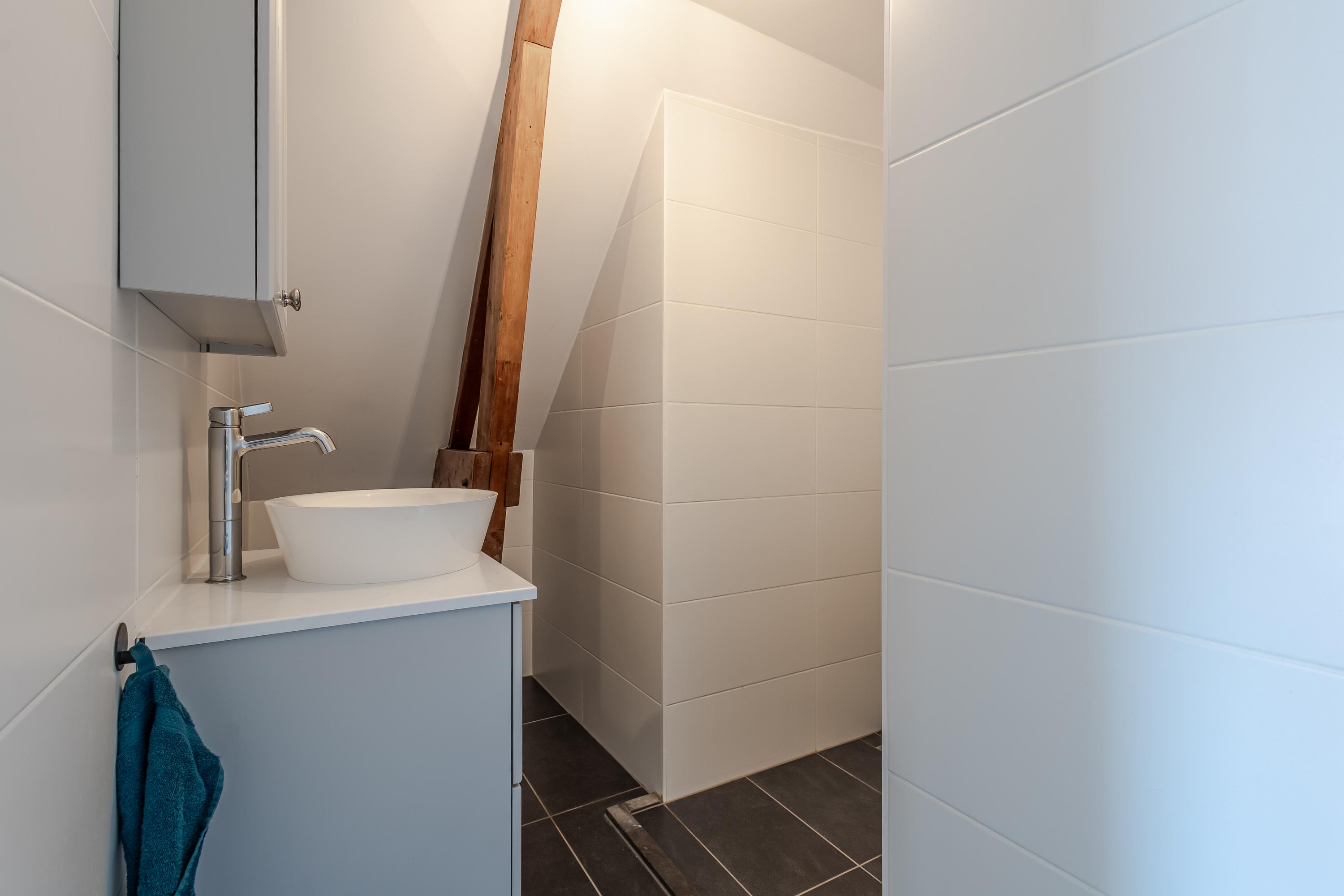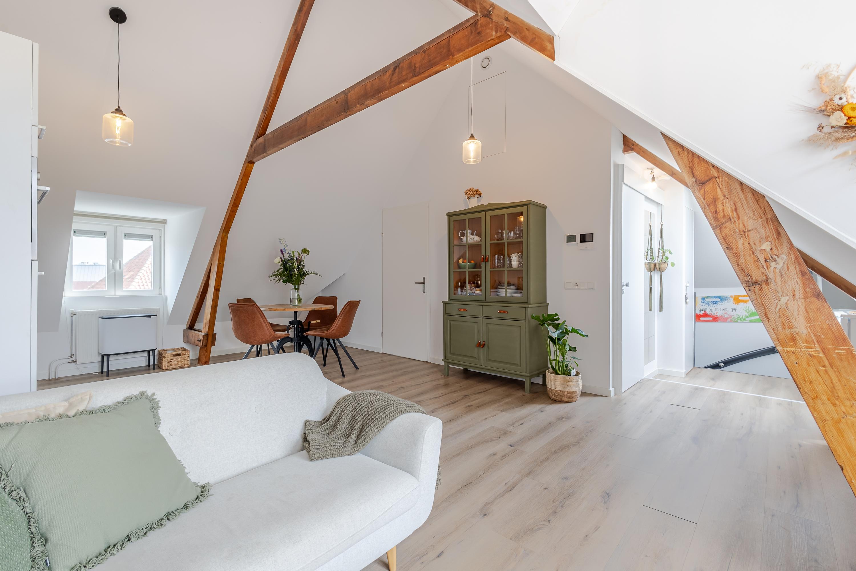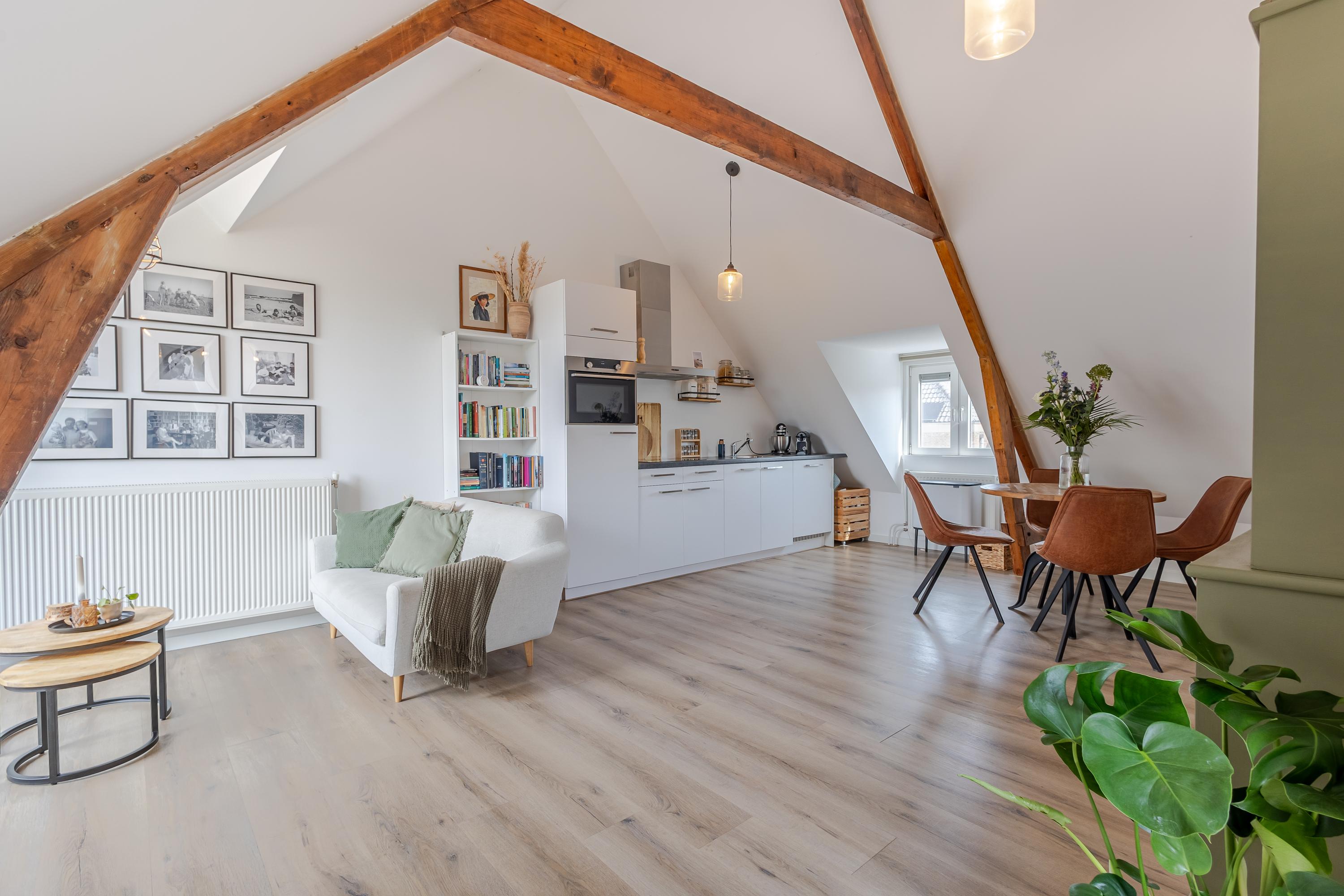 Hal met trap naar de woonverdieping. Onder de schuine kap is er aansluiting voor de wasapparatuur en aan de andere kant de meterkast en het toilet. Het appartement beschikt over een lichte woonkamer met sfeervolle houten balken. Er is een open keuken, wat zorgt voor een fijne leefruimte. De indeling is efficiënt en er is een slaapkamer met toegang tot de badkamer. De badkamer is netjes en compleet met een douche en wastafel. Boven de badkamer is een bergzolder gerealiseerd. Deze is toegankelijk via een luik in de woonkamer. Een extra pluspunt is het balkon, gesitueerd op het westen. Hier kun je na een drukke werkdag en de laatste zonnestralen meepikken!