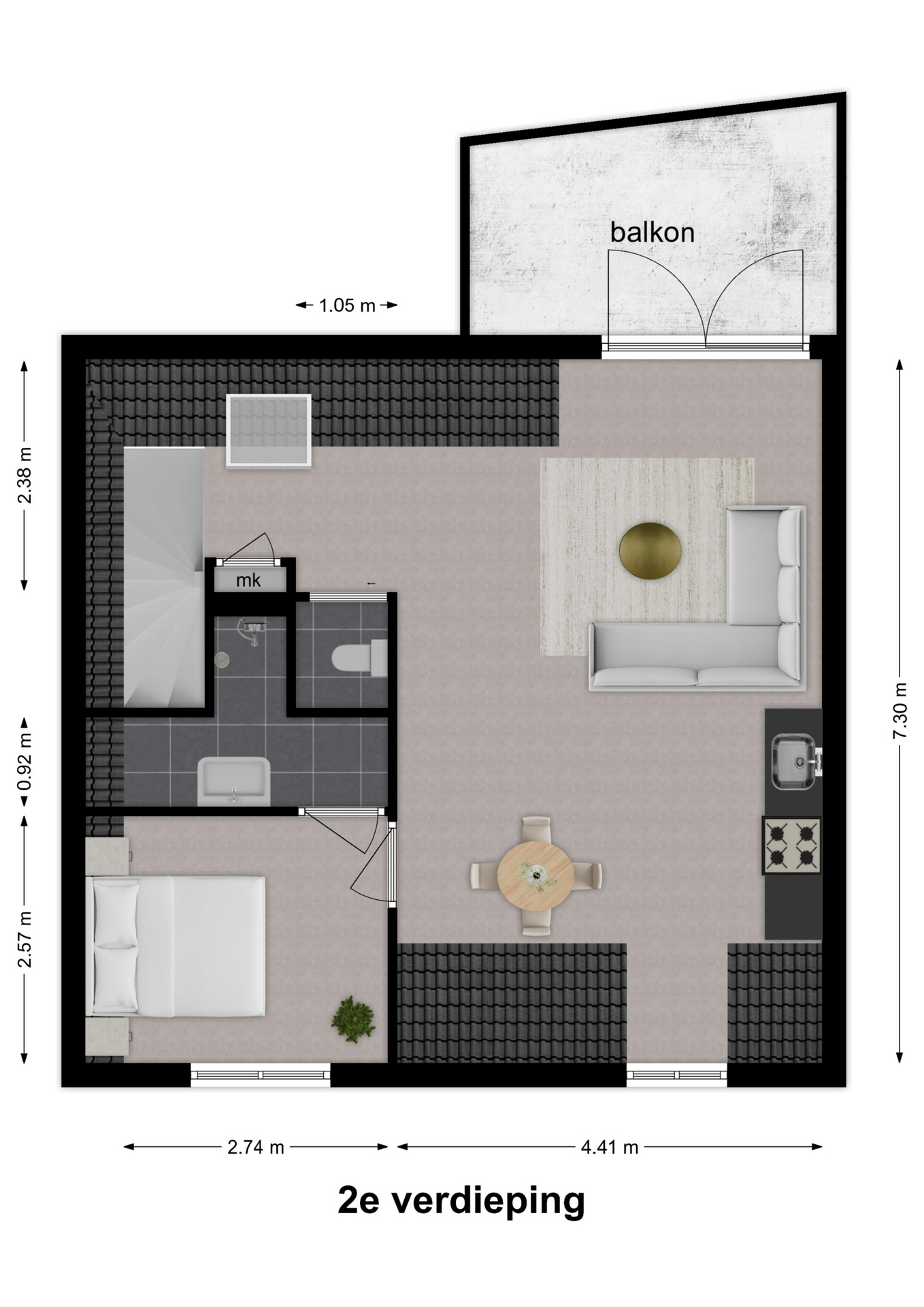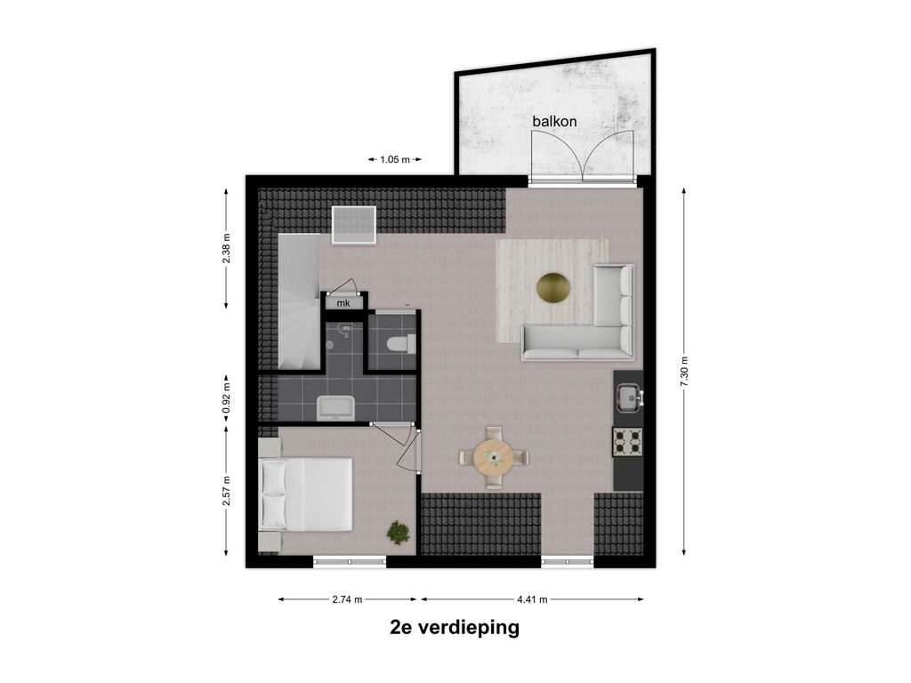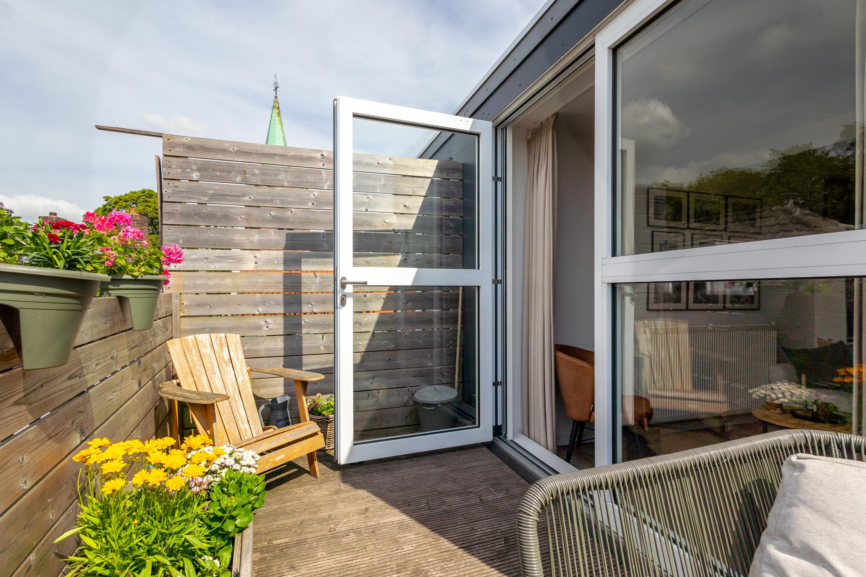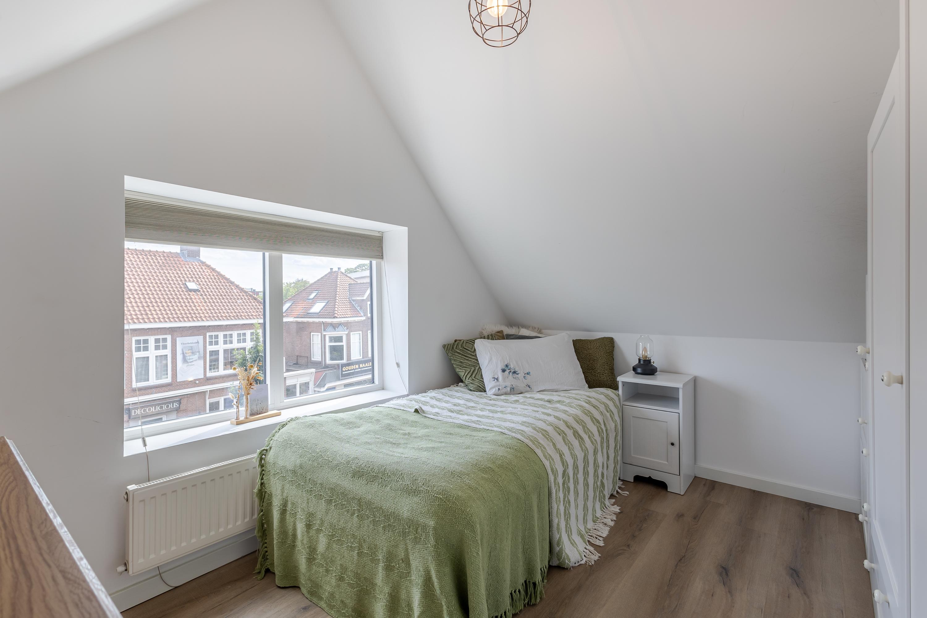 Hal met trap naar de woonverdieping. Onder de schuine kap is er aansluiting voor de wasapparatuur en aan de andere kant de meterkast en het toilet. Het appartement beschikt over een lichte woonkamer met sfeervolle houten balken. Er is een open keuken, wat zorgt voor een fijne leefruimte. De indeling is efficiënt en er is een slaapkamer met toegang tot de badkamer. De badkamer is netjes en compleet met een douche en wastafel. Boven de badkamer is een bergzolder gerealiseerd. Deze is toegankelijk via een luik in de woonkamer. Een extra pluspunt is het balkon, gesitueerd op het westen. Hier kun je na een drukke werkdag en de laatste zonnestralen meepikken!