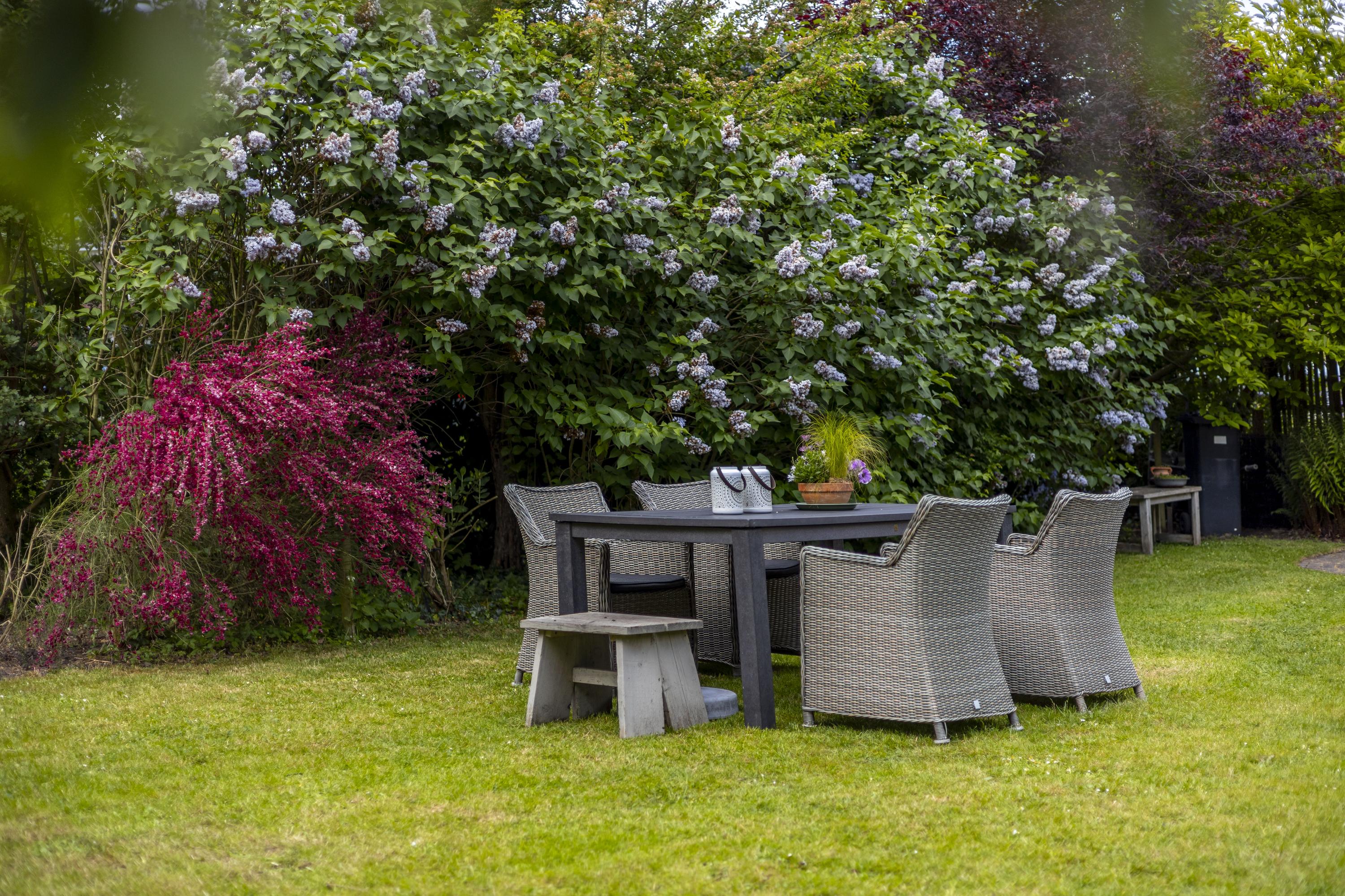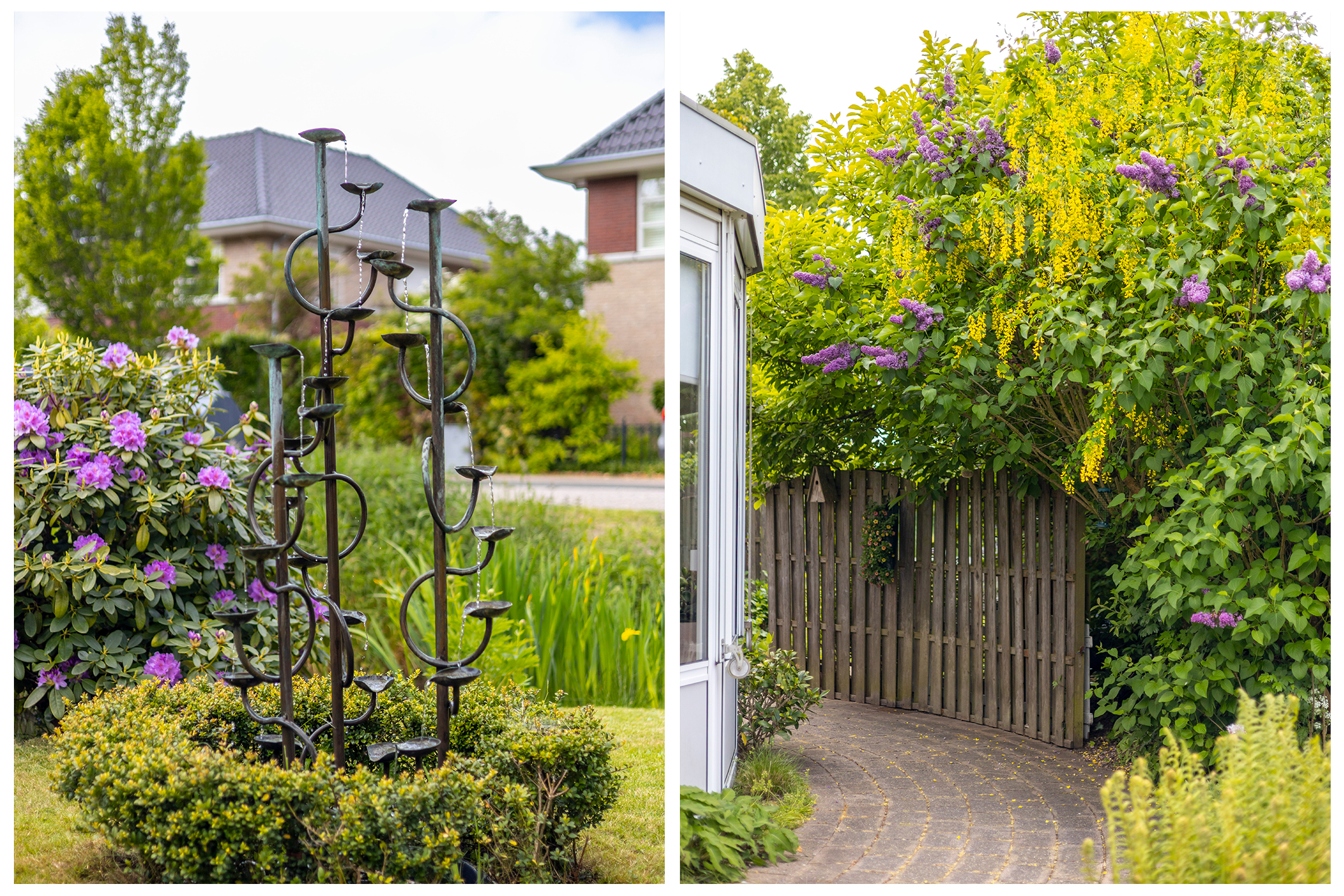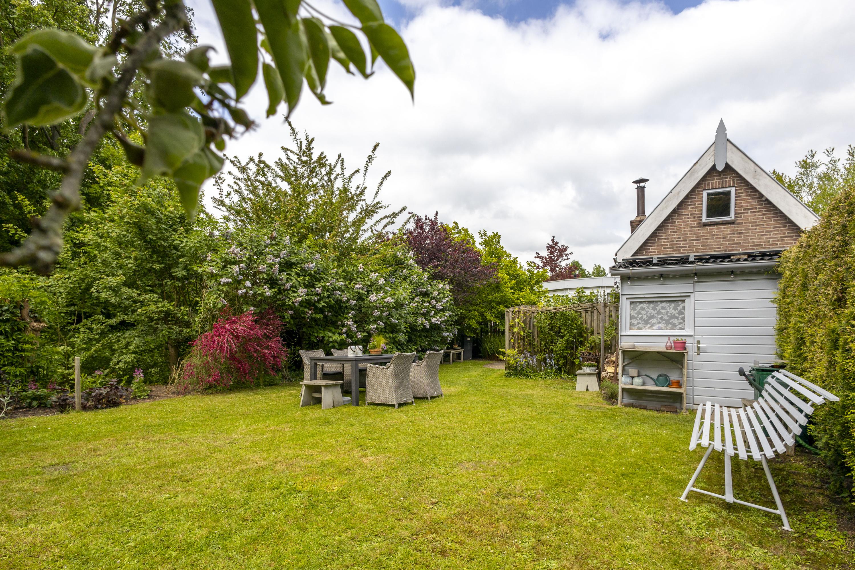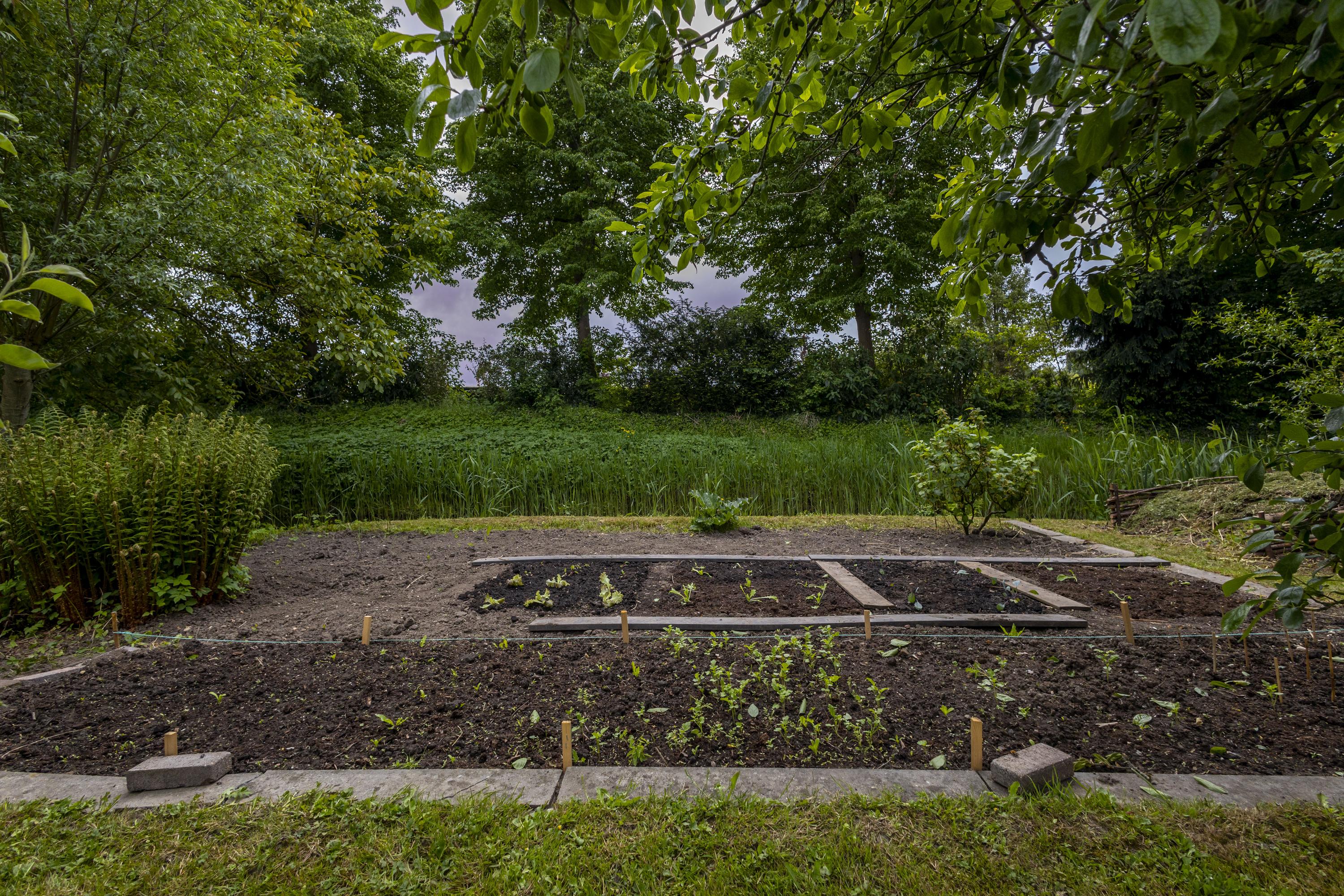De tuin rondom is een oase van rust en privacy. Met gazon, sierstruiken, hagen en fruitbomen is er altijd een plek om te ontspannen of te spelen. Een deel van de tuin is benut als moestuin, zodat u in eigen tuin verse groenten kunt oogsten. Vanuit de royale serre geniet u van licht, lucht en het uitzicht over het groen en het omringende water.