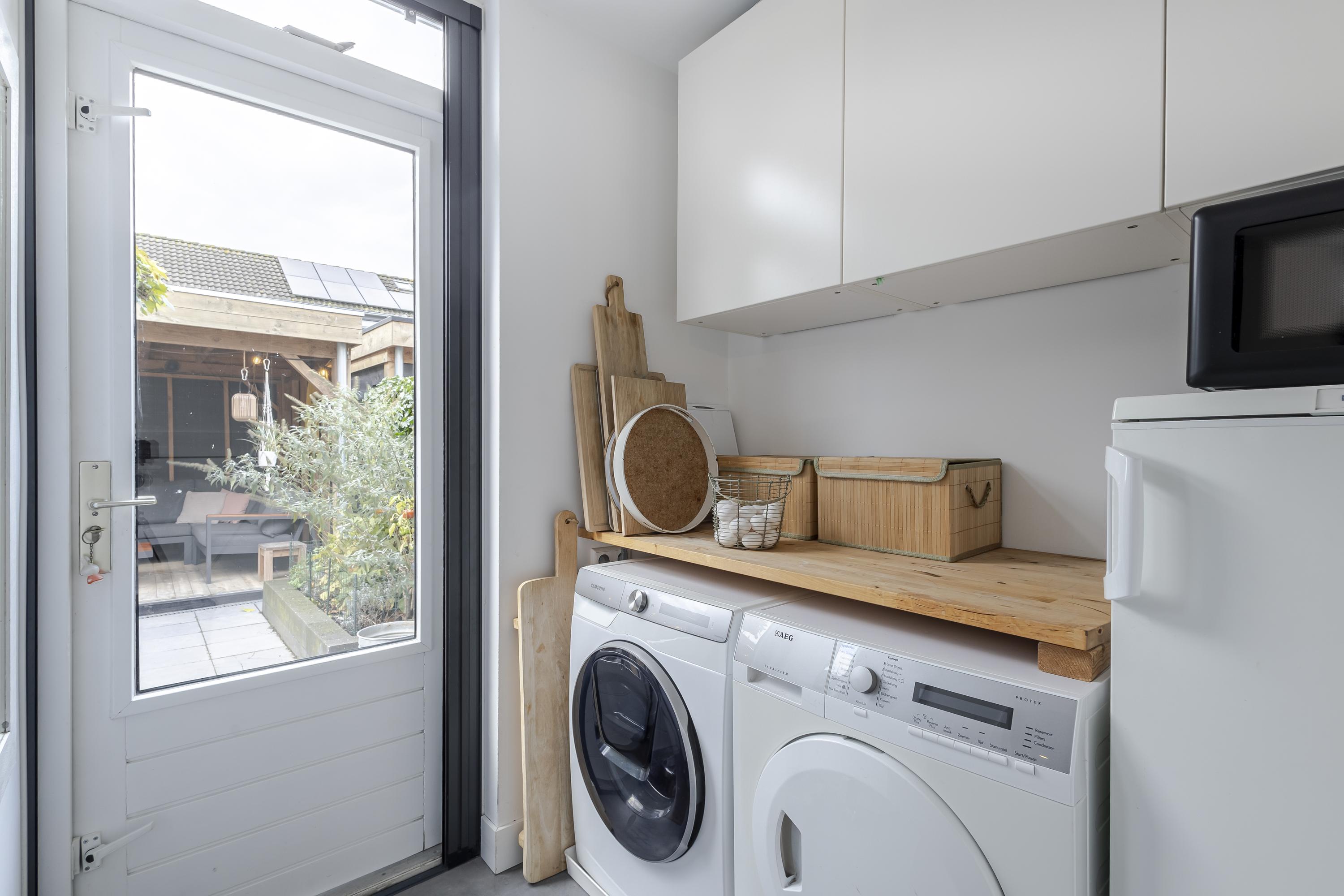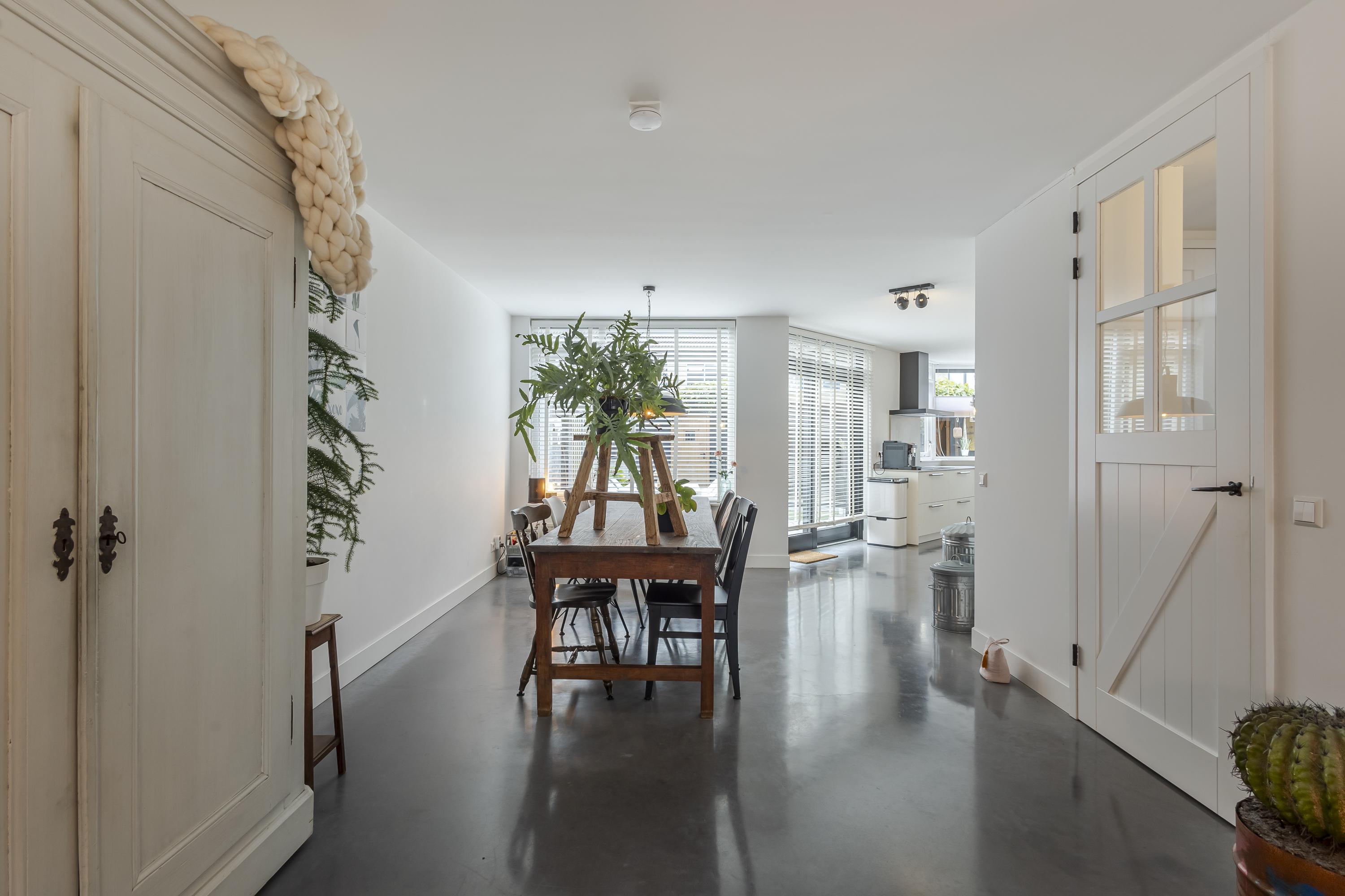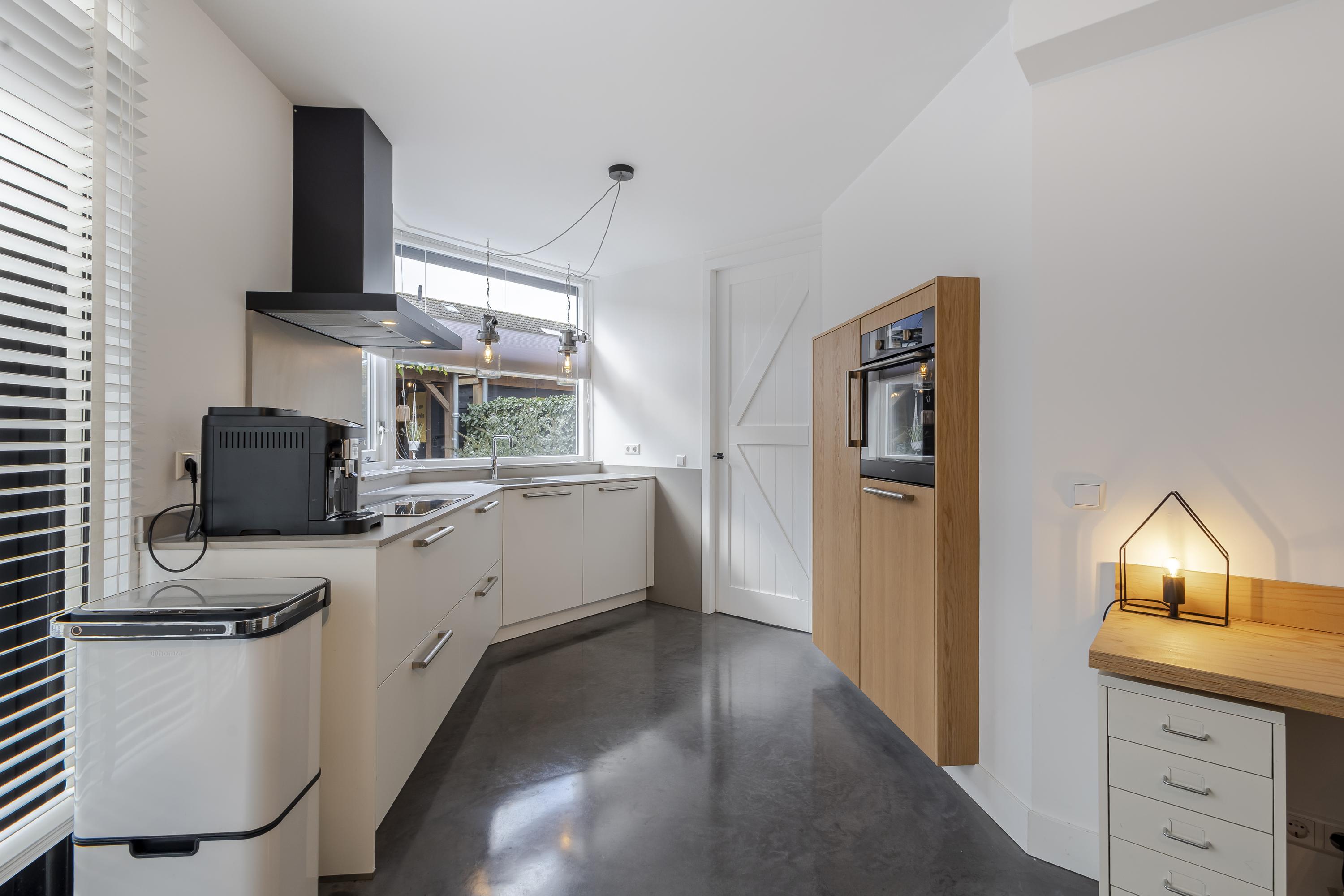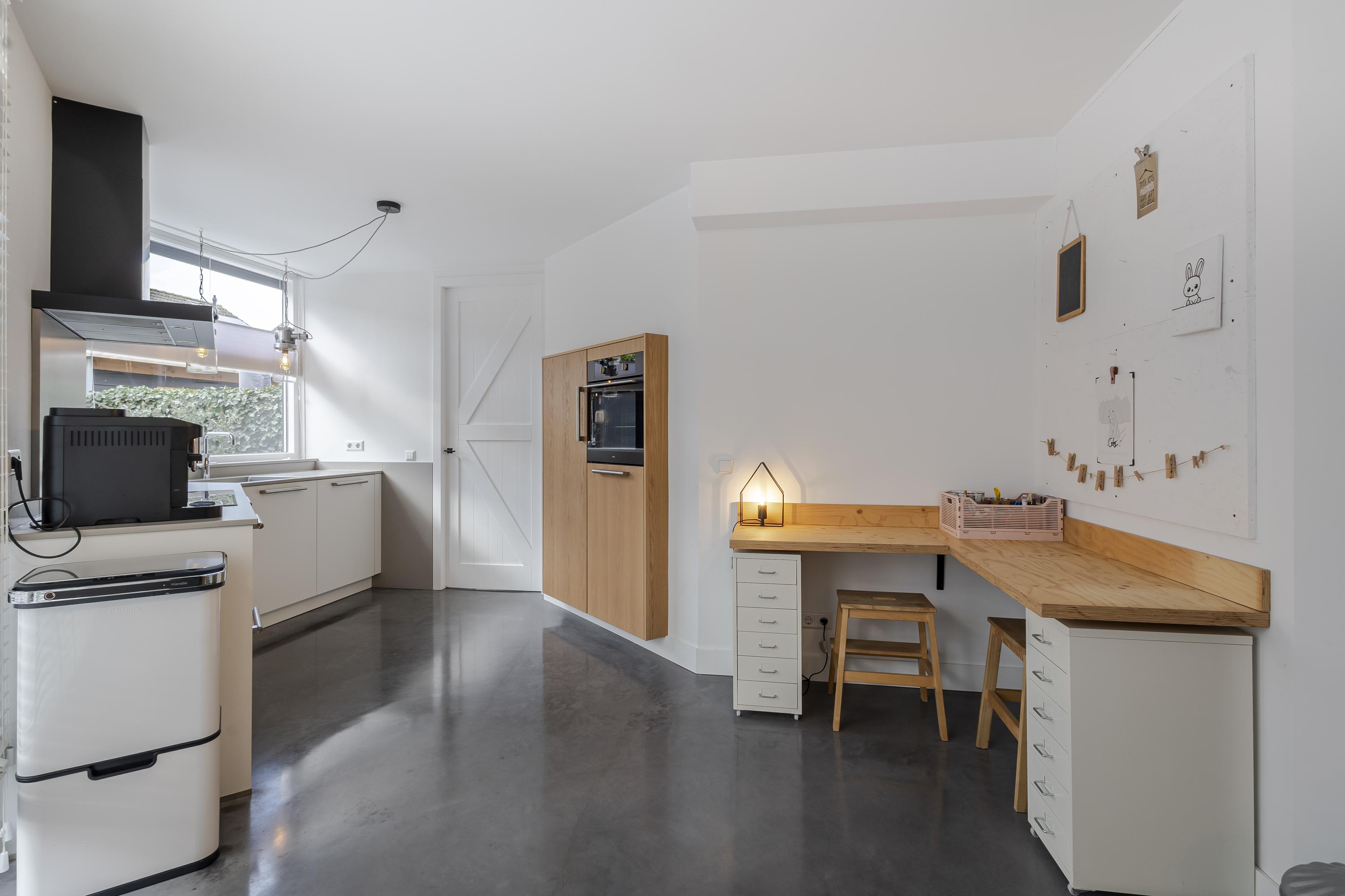 Binnen word je direct verwelkomd door een zee van daglicht. De ruime woonkamer met aangrenzende keuken is open en uitnodigend. Verder vind je op de begane grond een praktische hal met toilet en meterkast, een handige bijkeuken/achterportaal en een fijne werk-/kastenkamer in de voormalige garage. Deze is ideaal als thuiswerkplek of hobbyruimte.