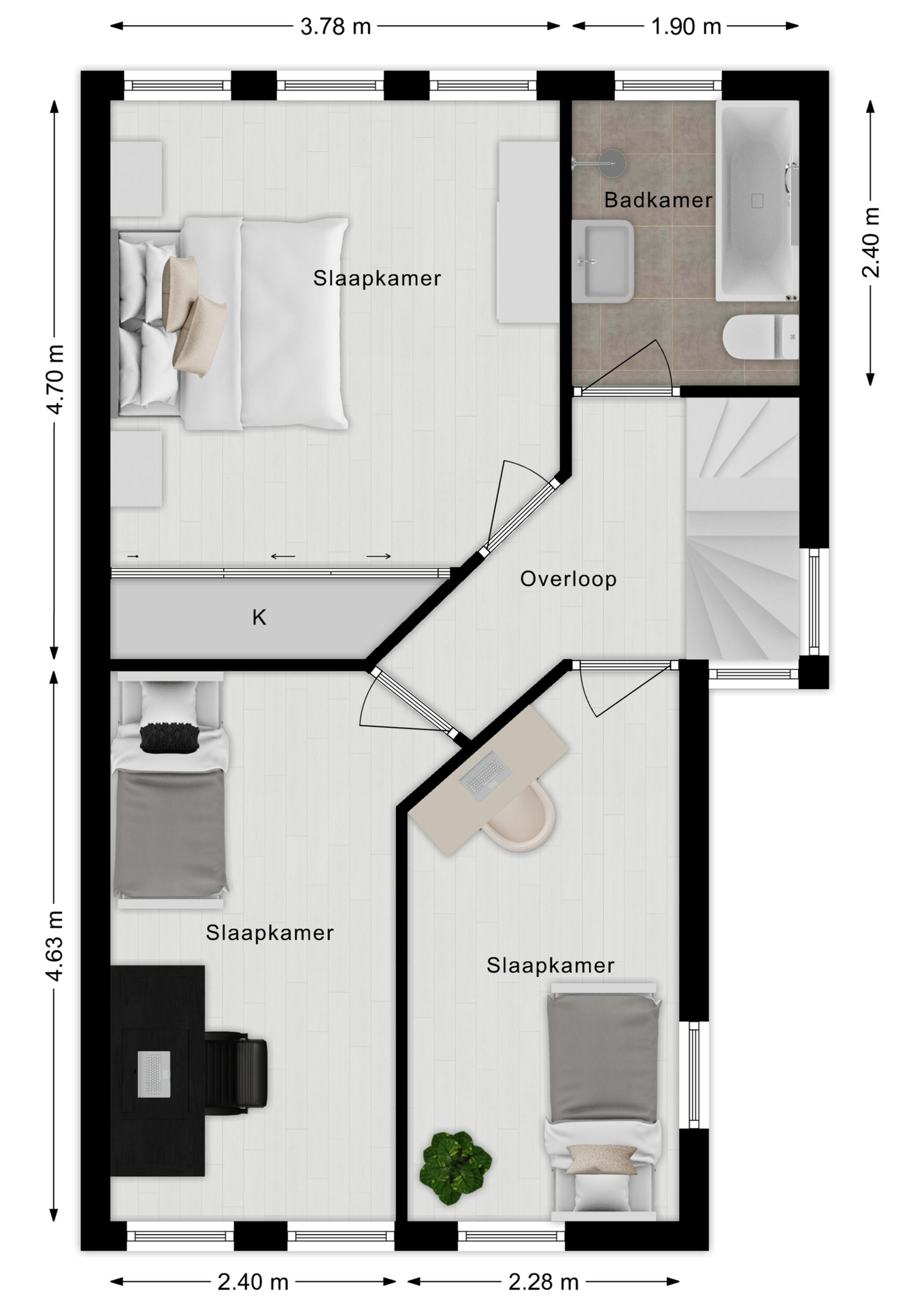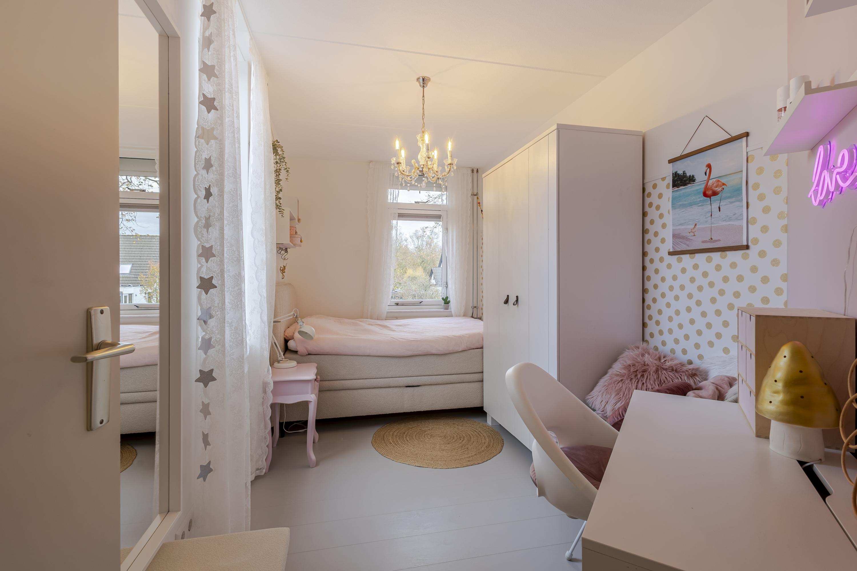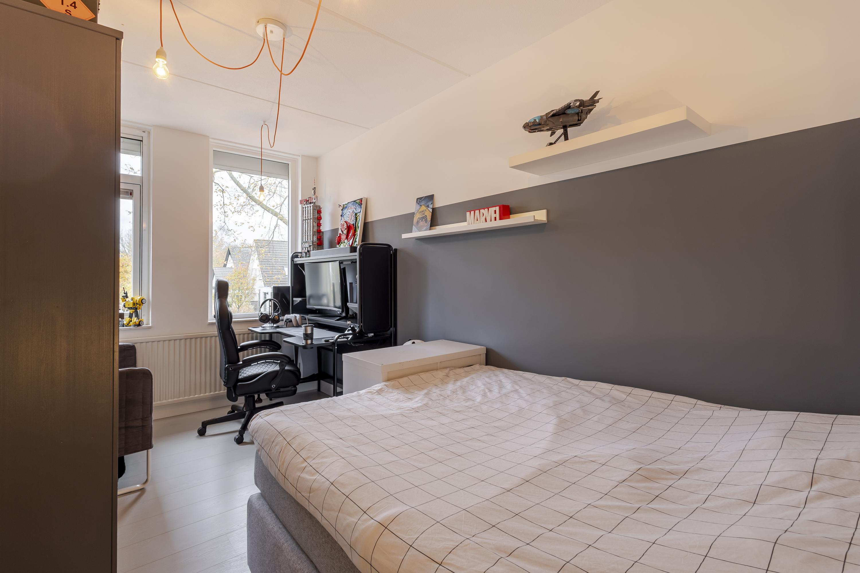 Op de eerste verdieping wachten drie verrassend ruime slaapkamers die stuk voor stuk groot genoeg zijn voor een tweepersoonsbed. De moderne badkamer met ligbad, inloopdouche en tweede toilet maakt het plaatje compleet. De tweede verdieping biedt nog meer woonplezier met een knusse speelkamer en een royale vierde slaapkamer.