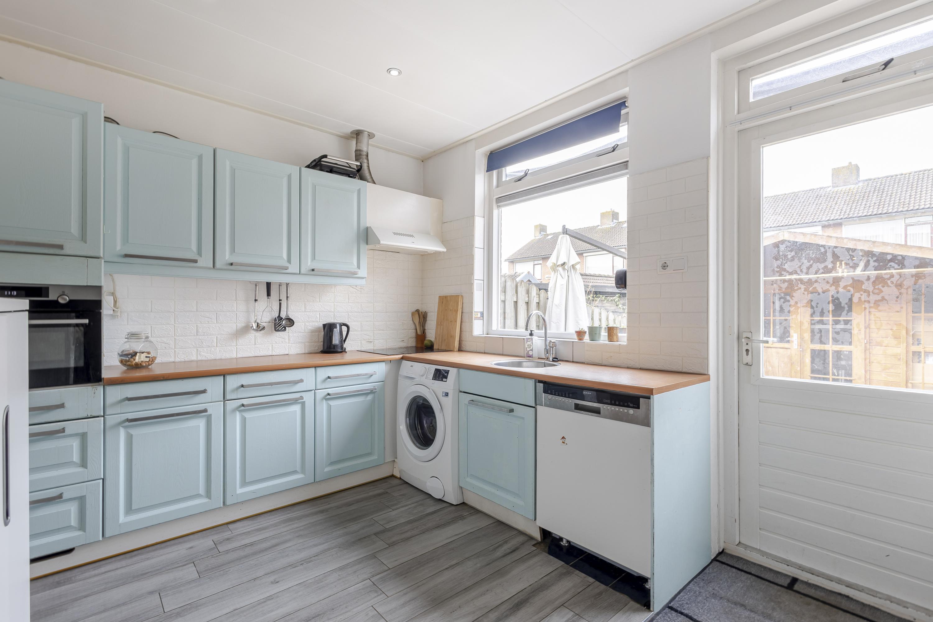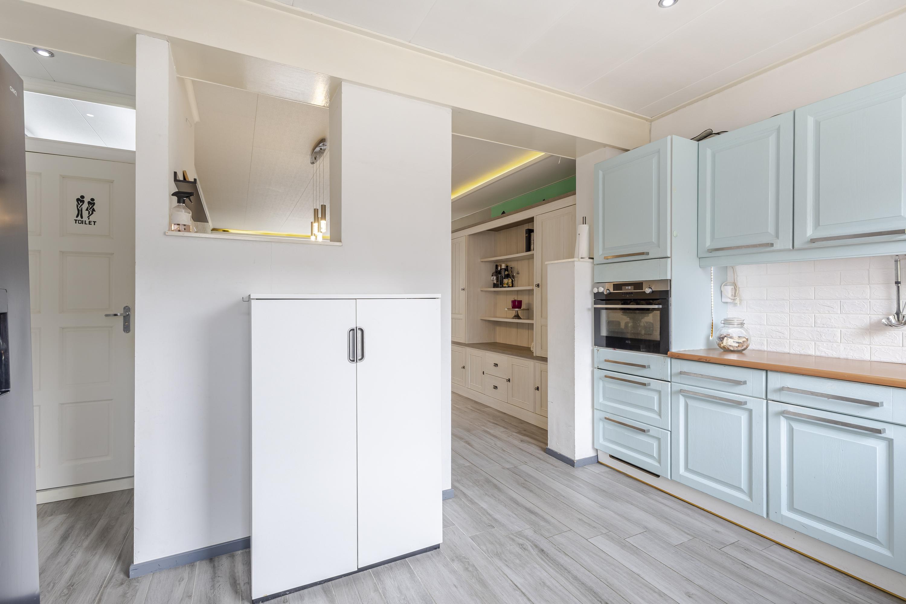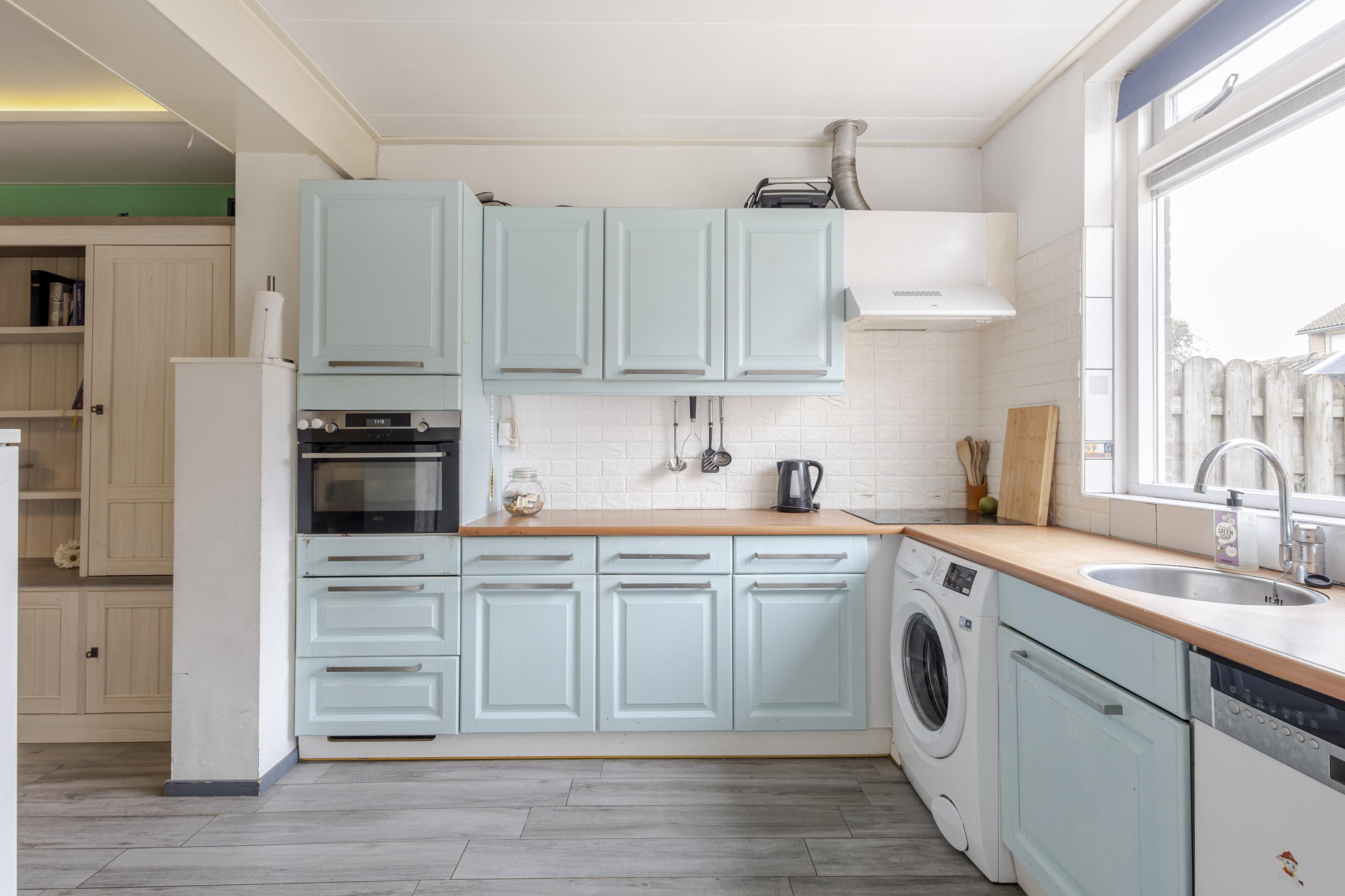 De hoekkeuken bevindt zich in de aanbouw en is voorzien van diverse (inbouw)apparatuur. Hier kook je met plezier terwijl je contact houdt met de woonkamer. Vanuit de keuken loop je, via een tussenruimte, zo het toilet in of stap je de zonnige achtertuin binnen. Praktisch en comfortabel.