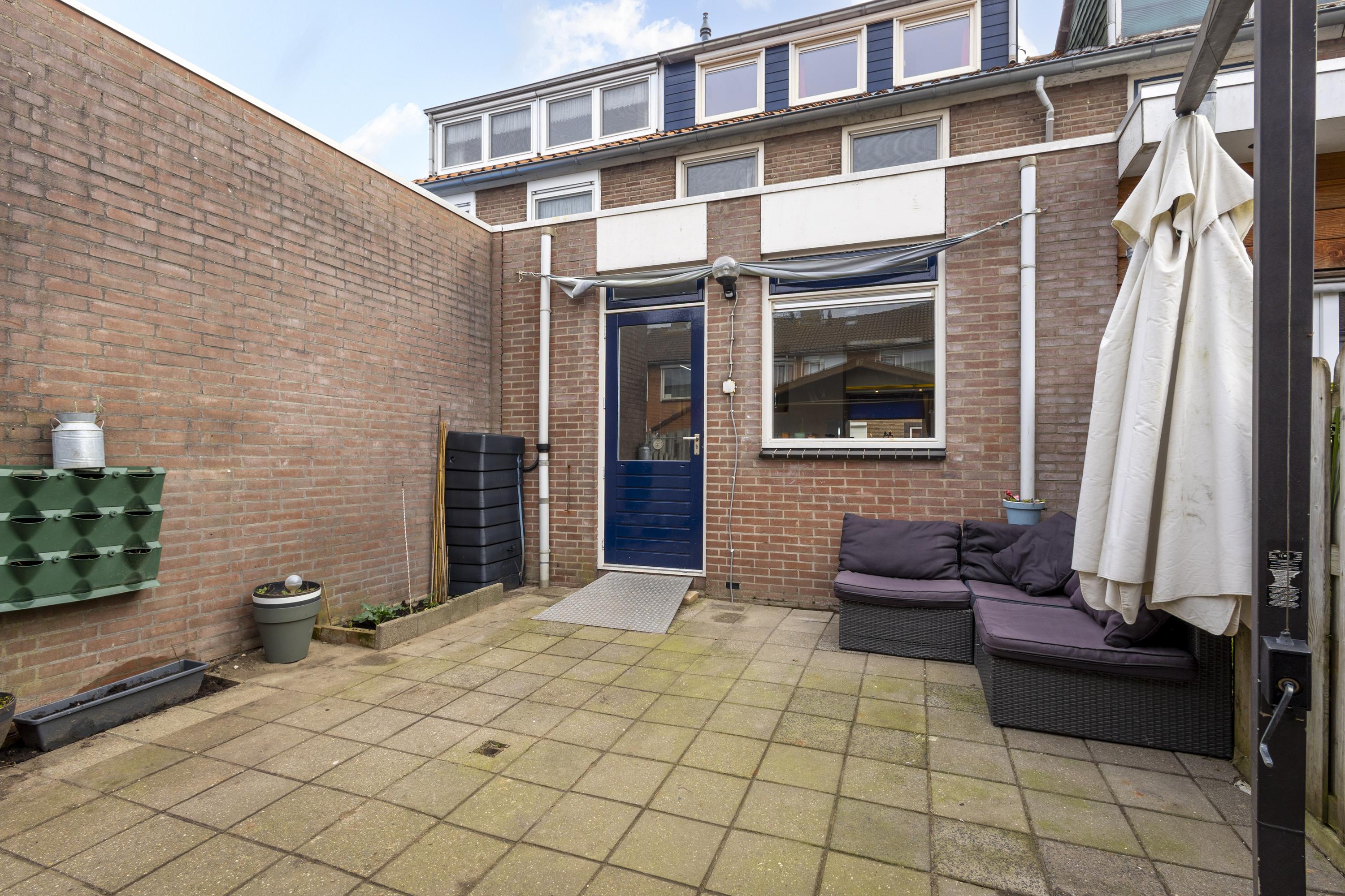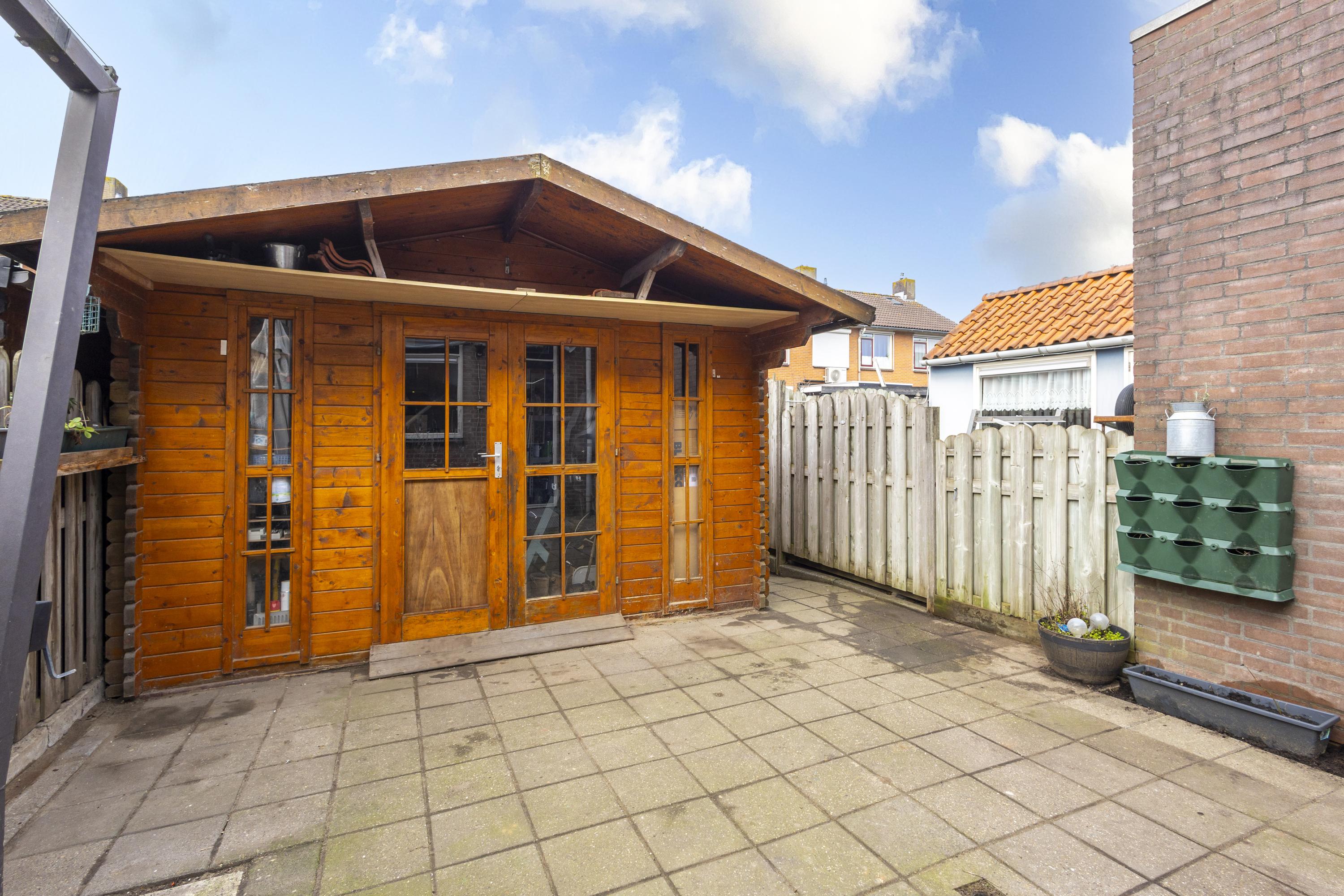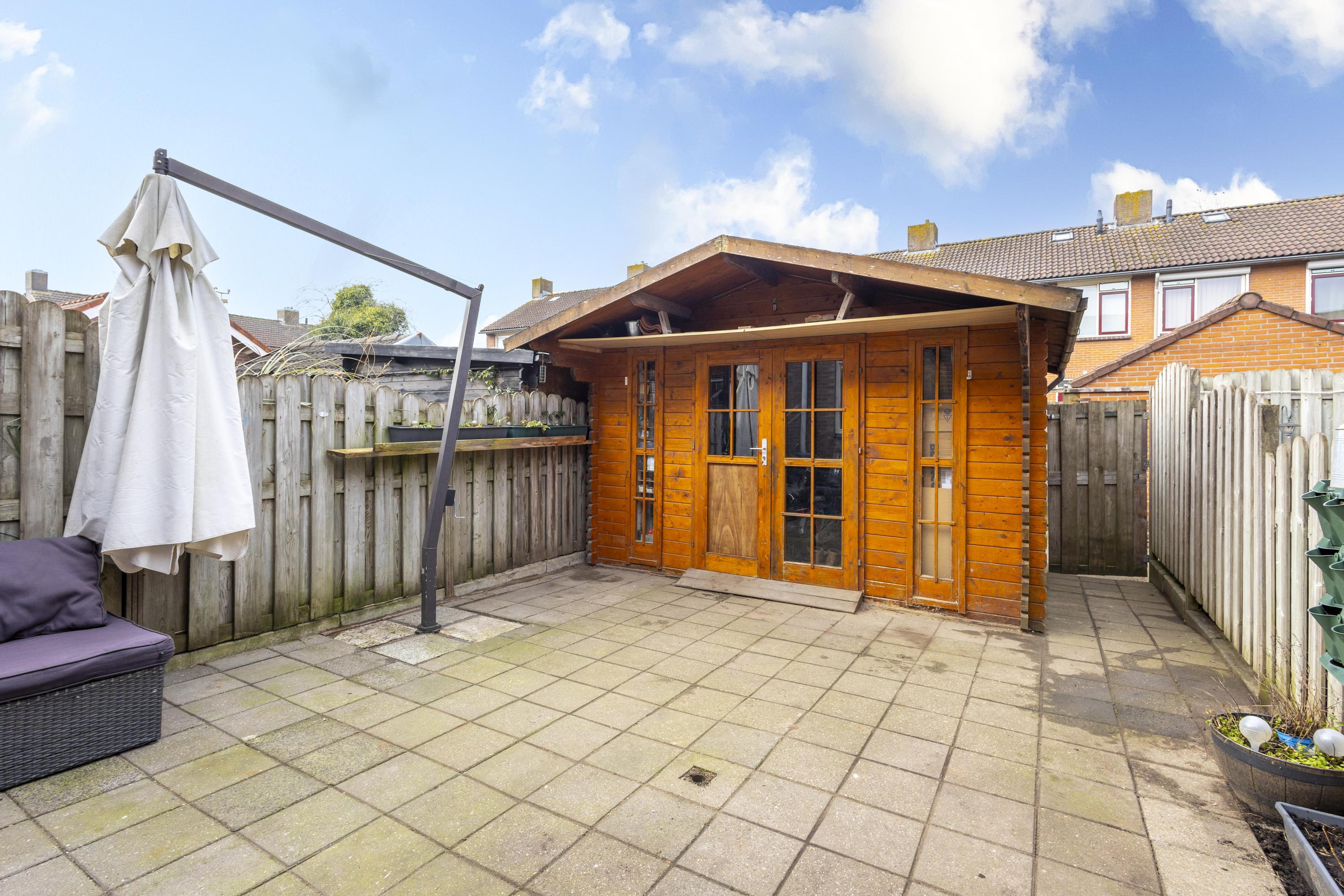 De achtertuin ligt op het westen, wat betekent: zon tot in de avonduren. Een fijne plek om na een lange dag nog even te genieten. De aanwezige blokhut zorgt voor extra bergruimte voor fietsen en tuingereedschap.