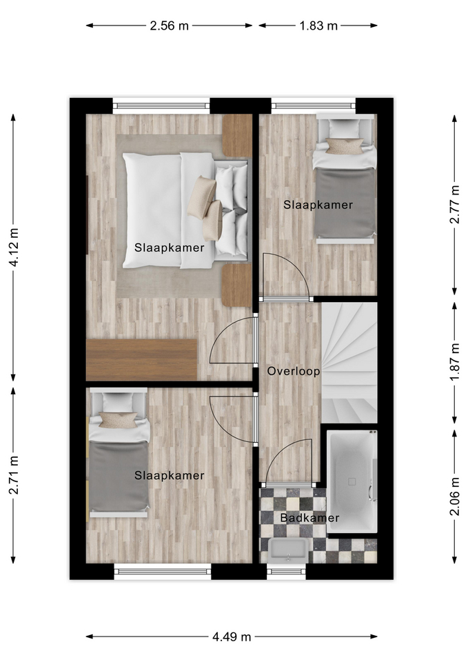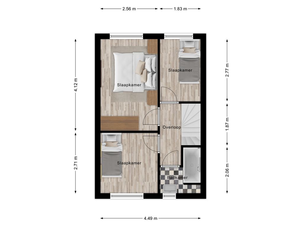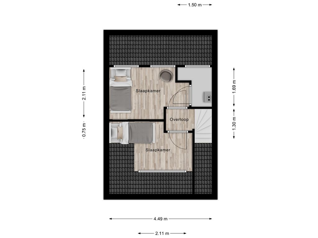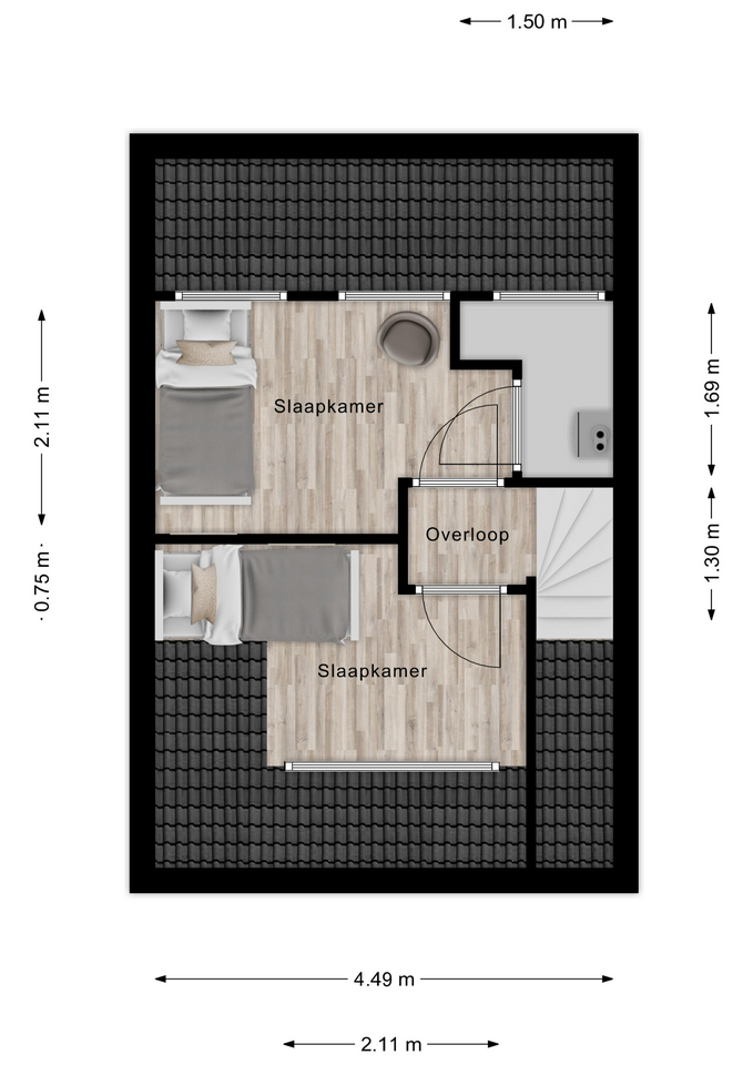 En dan de tweede verdieping… ook hier is de ruimte optimaal benut. Dankzij de vaste trap én de dakkapellen aan zowel de voor- als achterzijde zijn hier nog eens twee volwaardige slaapkamers gerealiseerd. Perfect als kinder-, werk- of hobbykamer. Daarnaast is er een aparte bergruimte met de cv-ketel.
