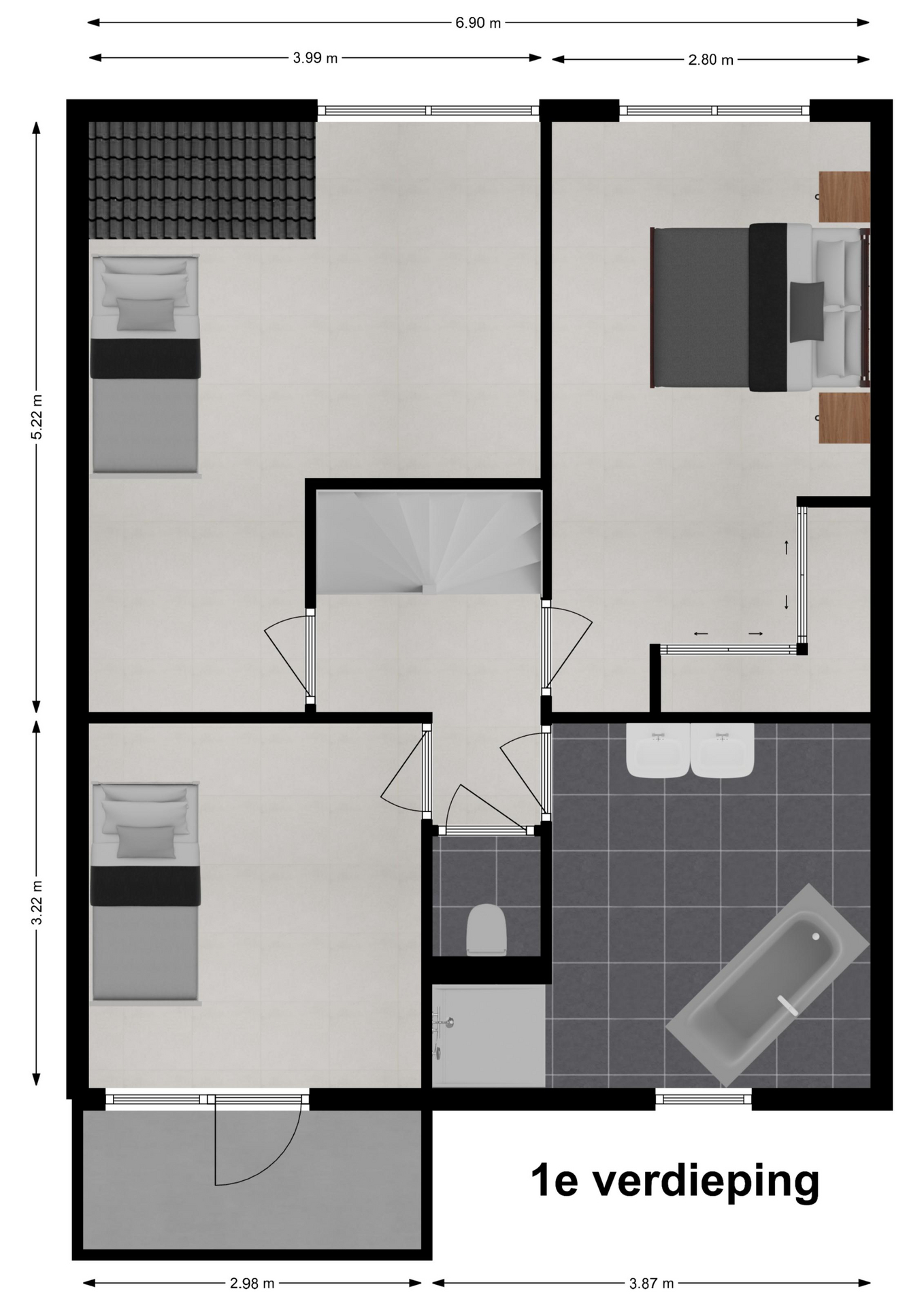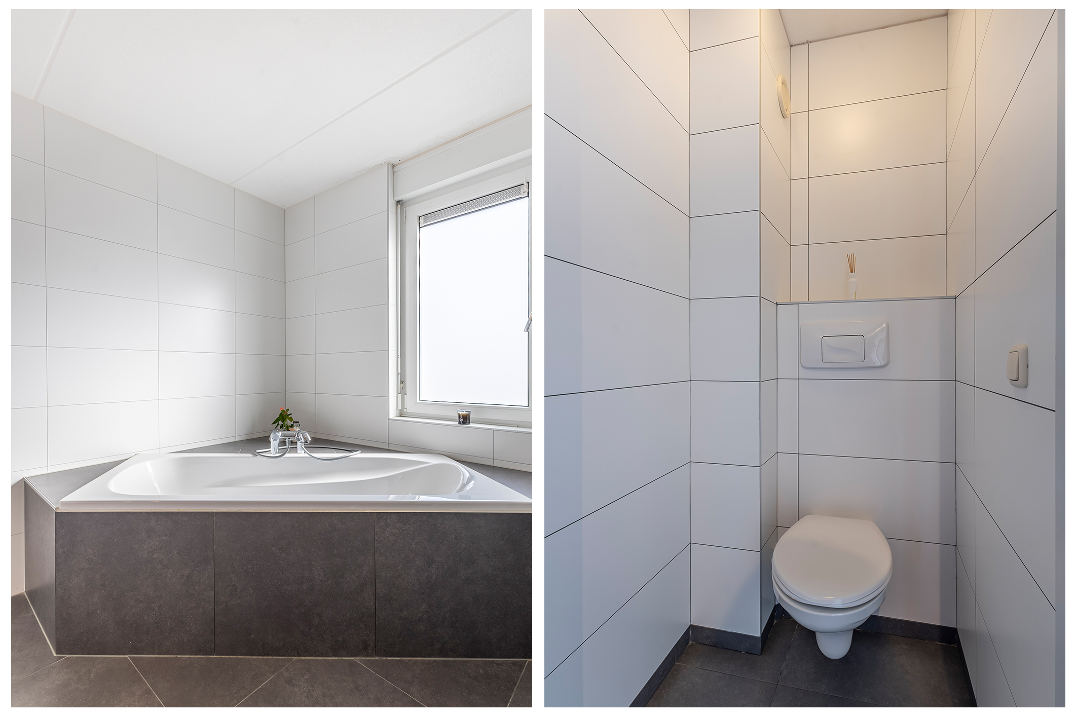 Op de eerste verdieping zijn 3 ruime slaapkamers met aan de achterzijde kunststof kozijnen. De royale badkamer is naast een ligbad ook voorzien van een inloopdouche en een dubbel wastafelmeubel. Het toilet is afzonderlijk, naast de badkamer gesitueerd. De slaapkamer aan de voorzijde geeft toegang tot het balkon.