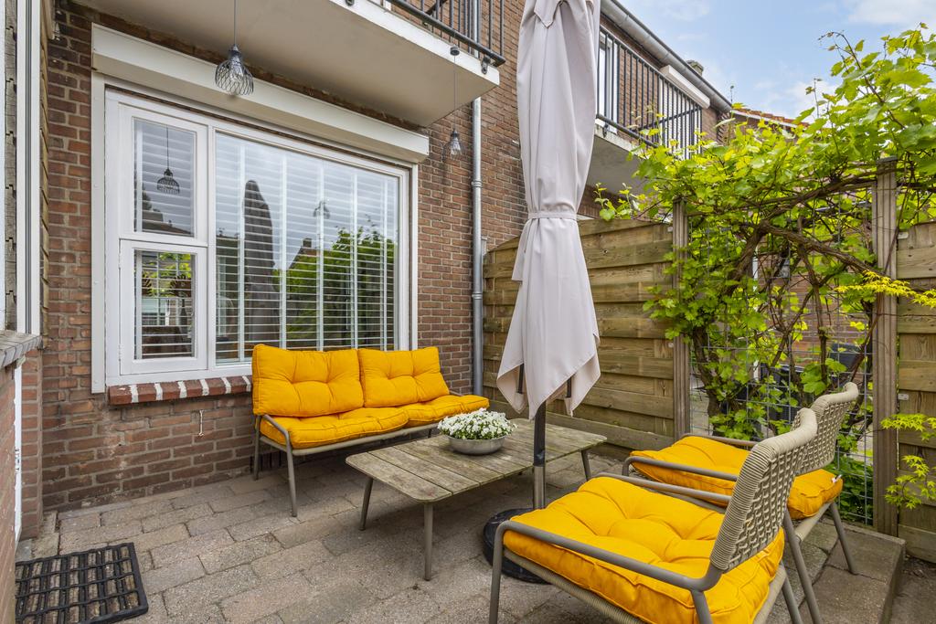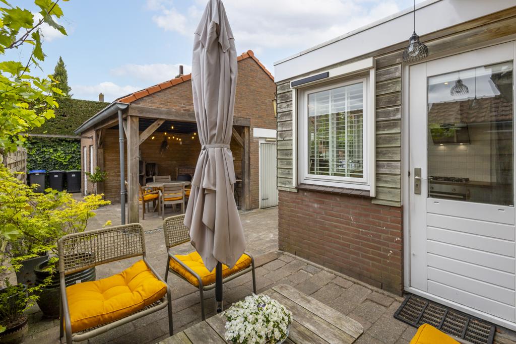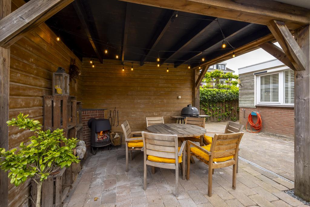 De west gesitueerde tuin beschikt over een gezellige loungehoek met houtkachel onder een sfeervolle overkapping — een heerlijke plek om het hele jaar door van buiten te genieten.