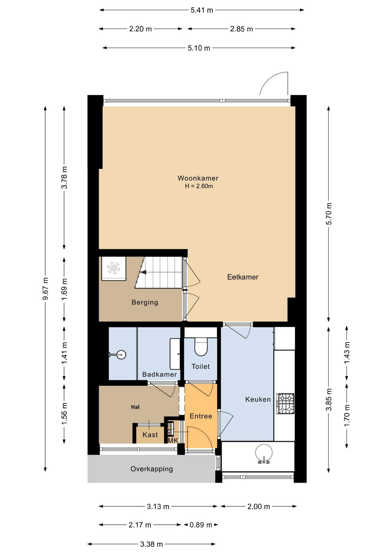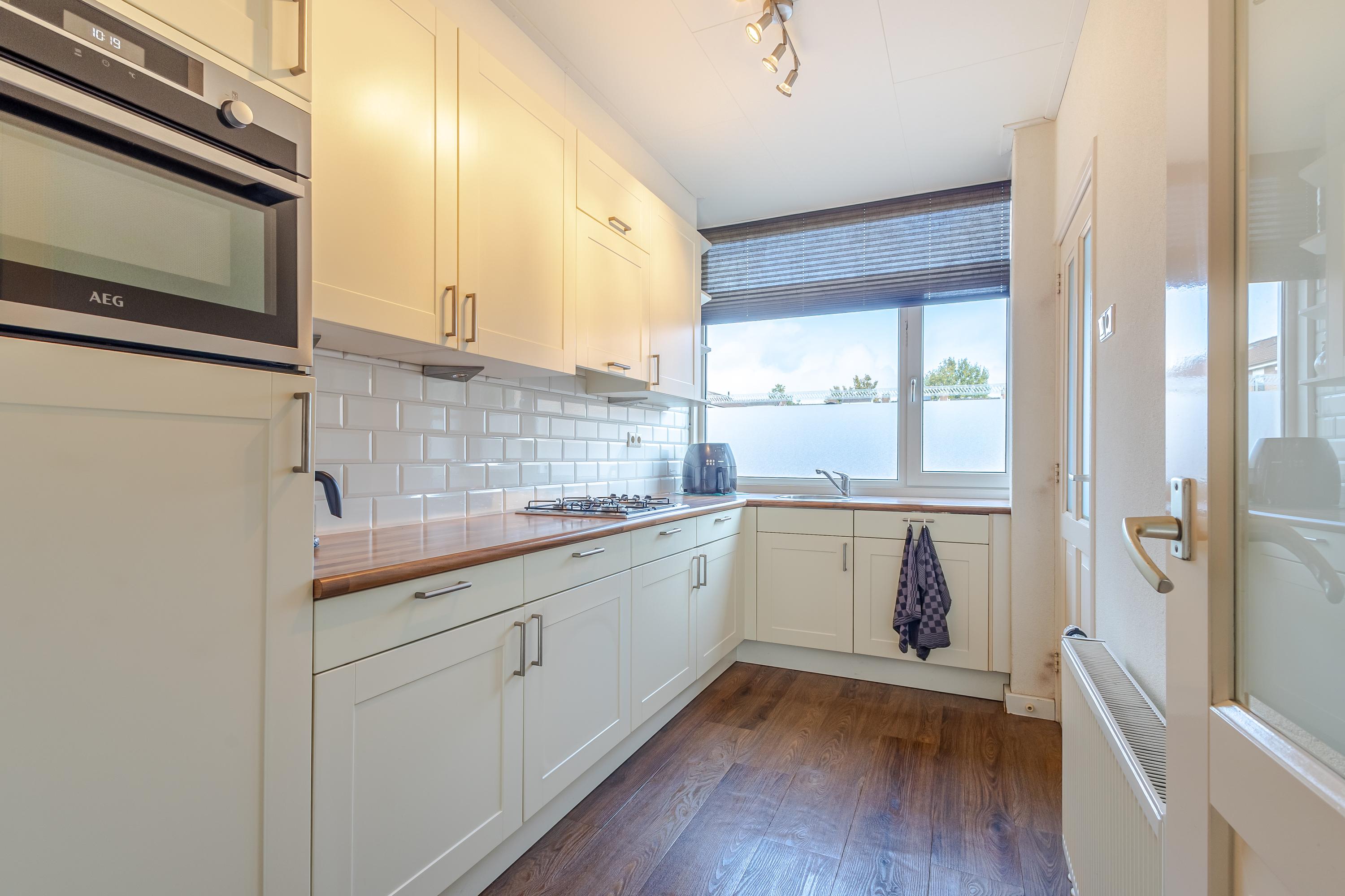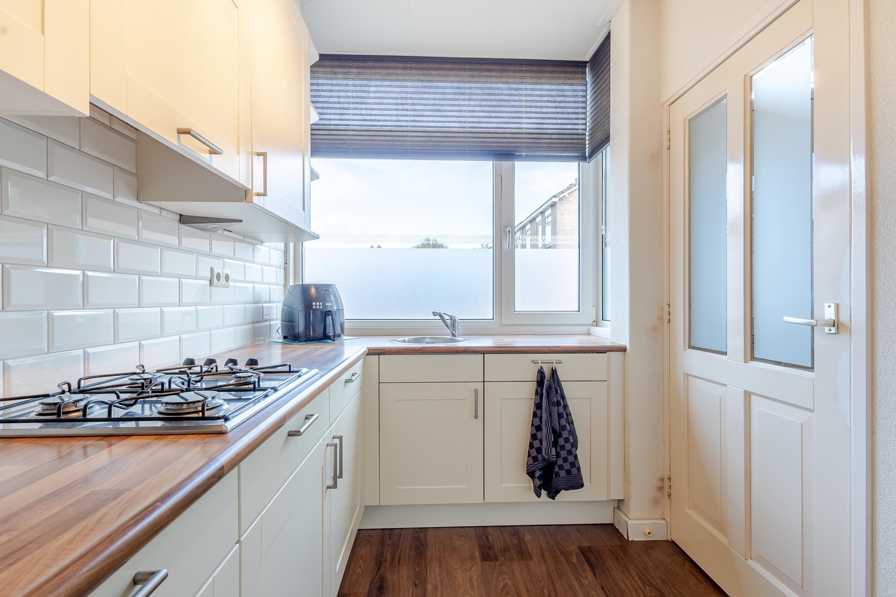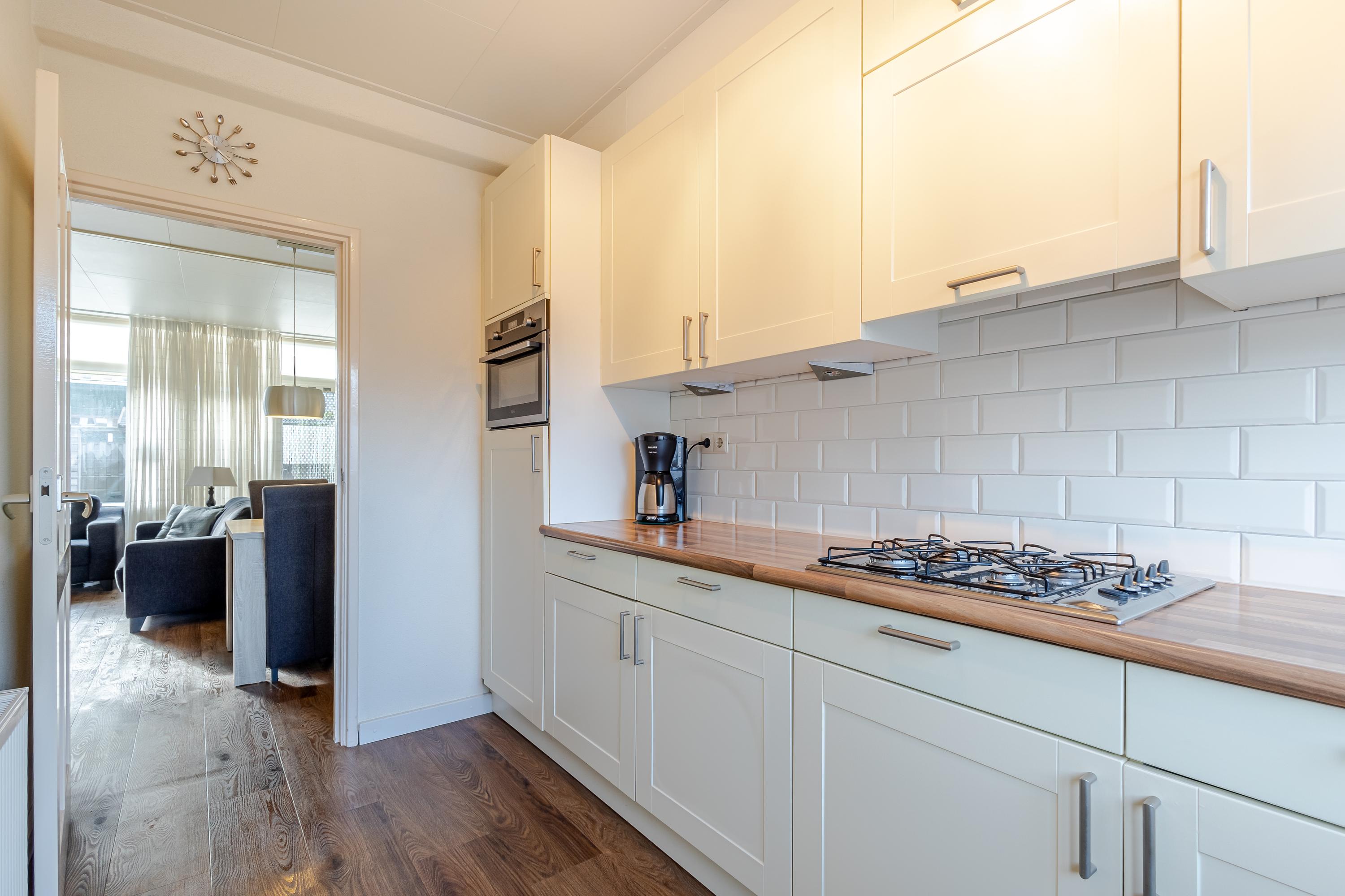 Op de begane grond word je verwelkomd in een lichte woonkamer met een groot raampartij en openslaande deuren naar de zonnige tuin op het zuidoosten. De gesloten keuken is voorzien van alle gemakken, zoals een koelkast, (combi)magnetron, vaatwasser, afzuigkap en 4-pits gaskookplaat. De moderne badkamer is luxe afgewerkt met een inloopdouche, wastafelmeubel en designradiator, en daarnaast is er een apart toilet aanwezig.