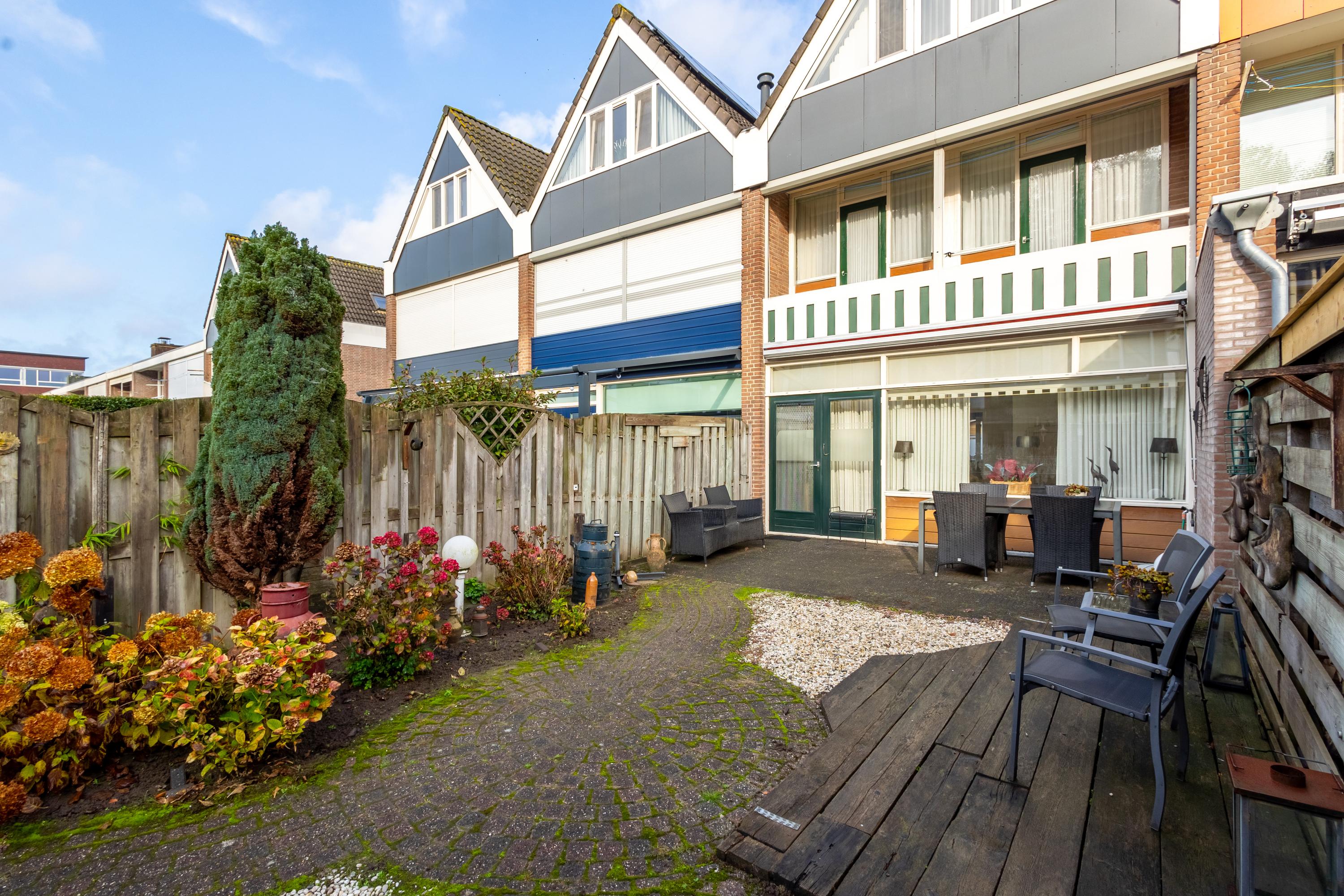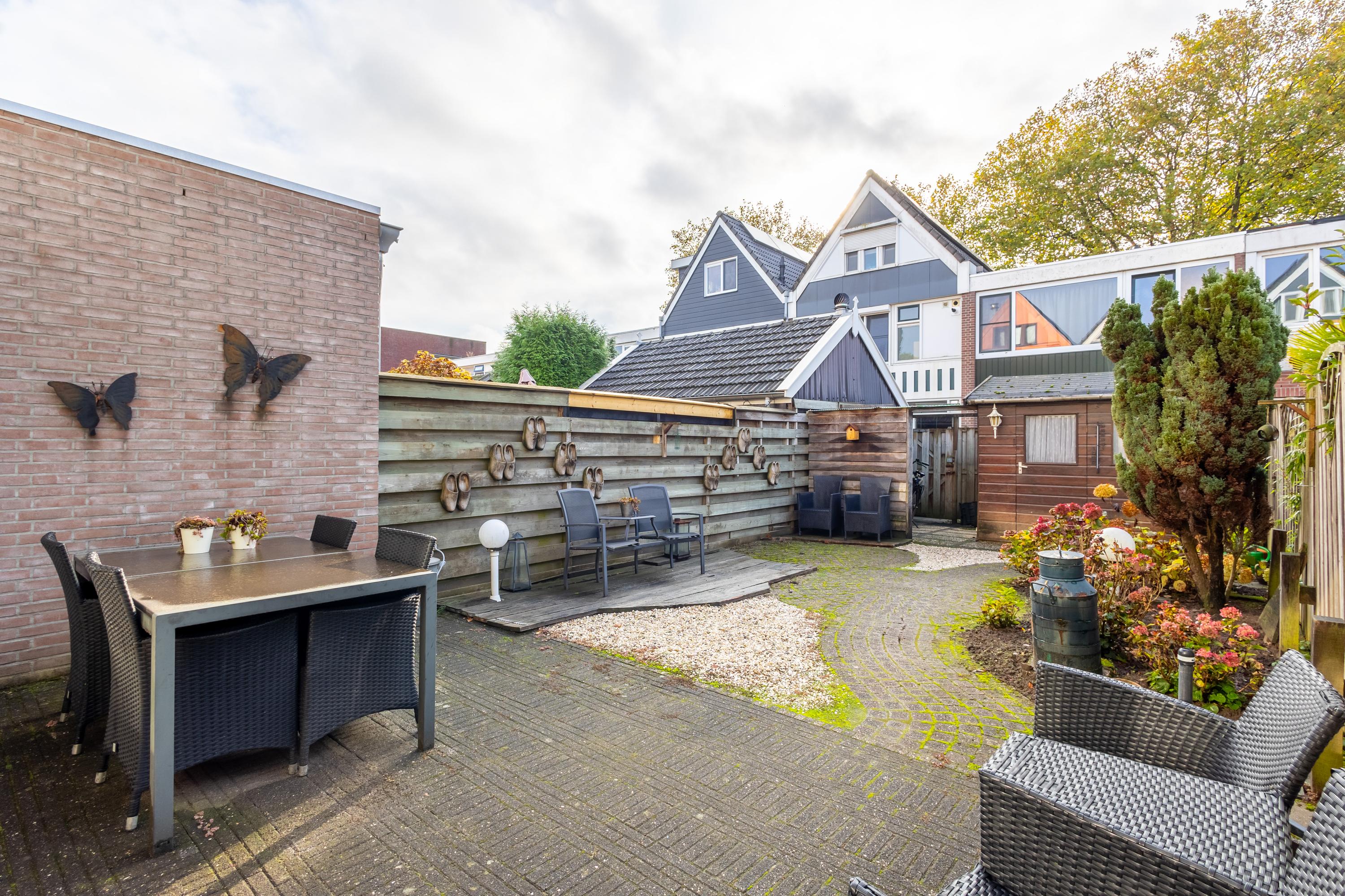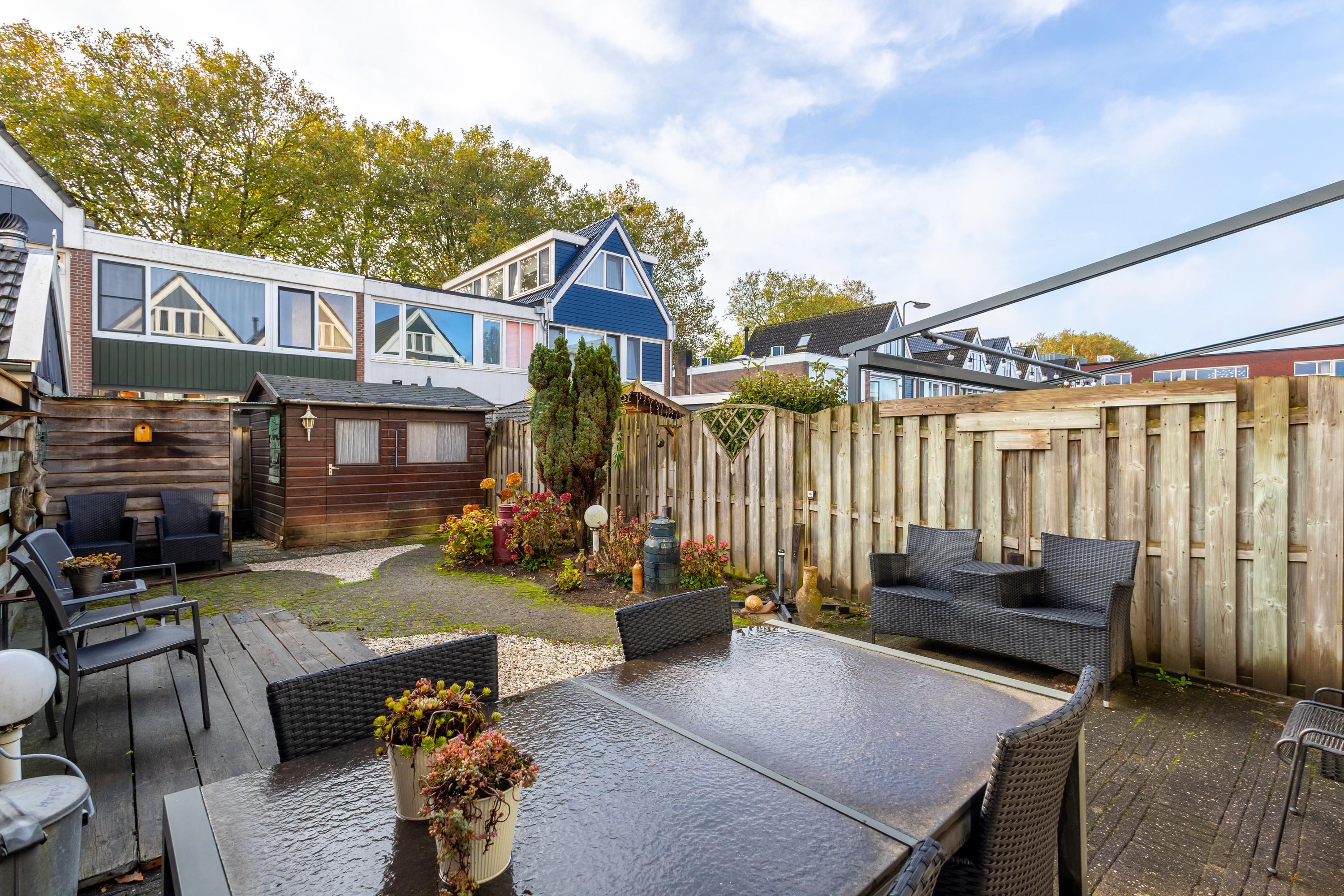 De tuin op het zuidoosten biedt volop zon en is voorzien van een berging met overkapping én een achterom – ideaal voor fietsen of tuinspullen.