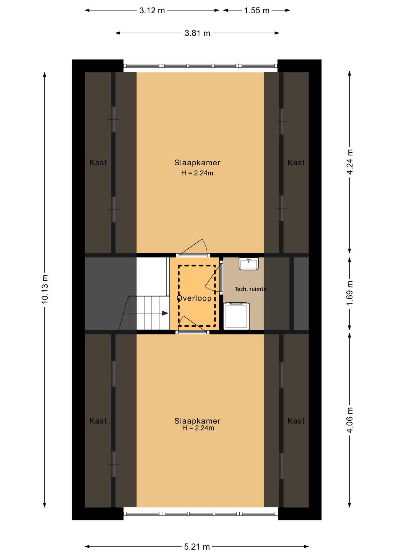 Op de tweede verdieping zijn door de dakopbouw nog twee ruime slaapkamers ontstaan, samen met een praktische technische ruimte met uitstortgootsteen en wasmachineaansluiting.