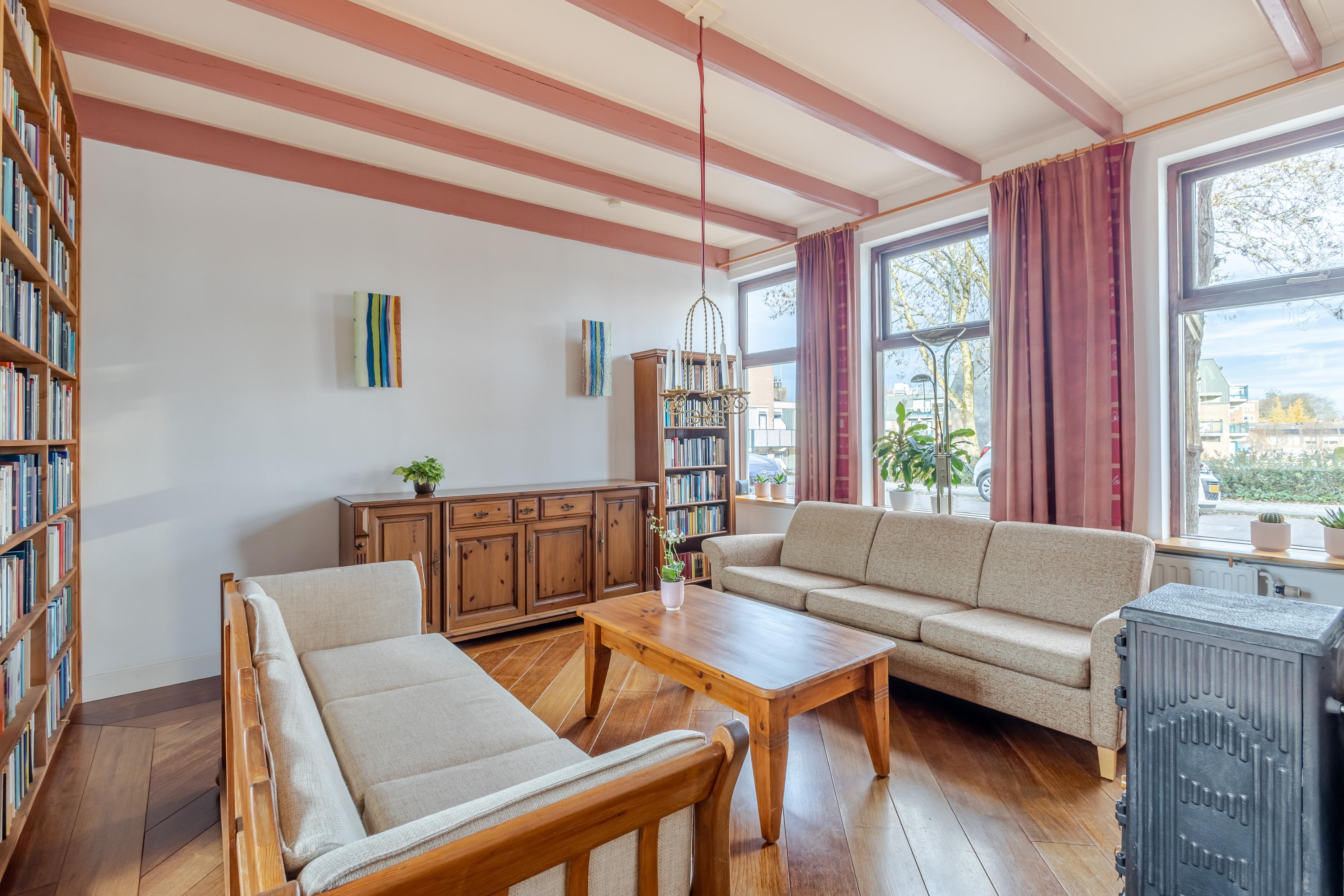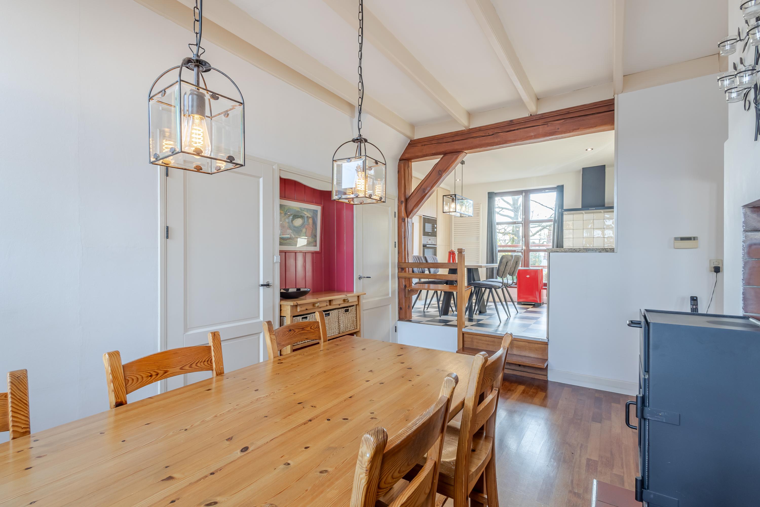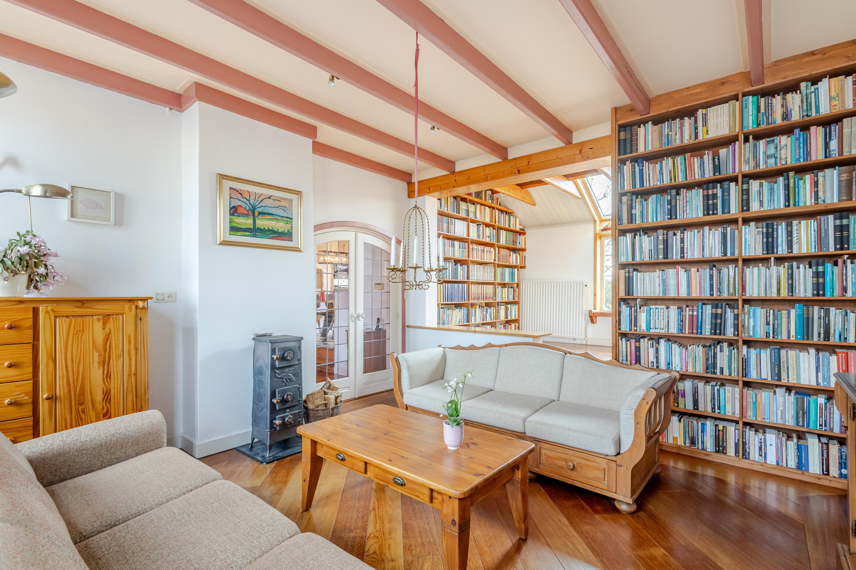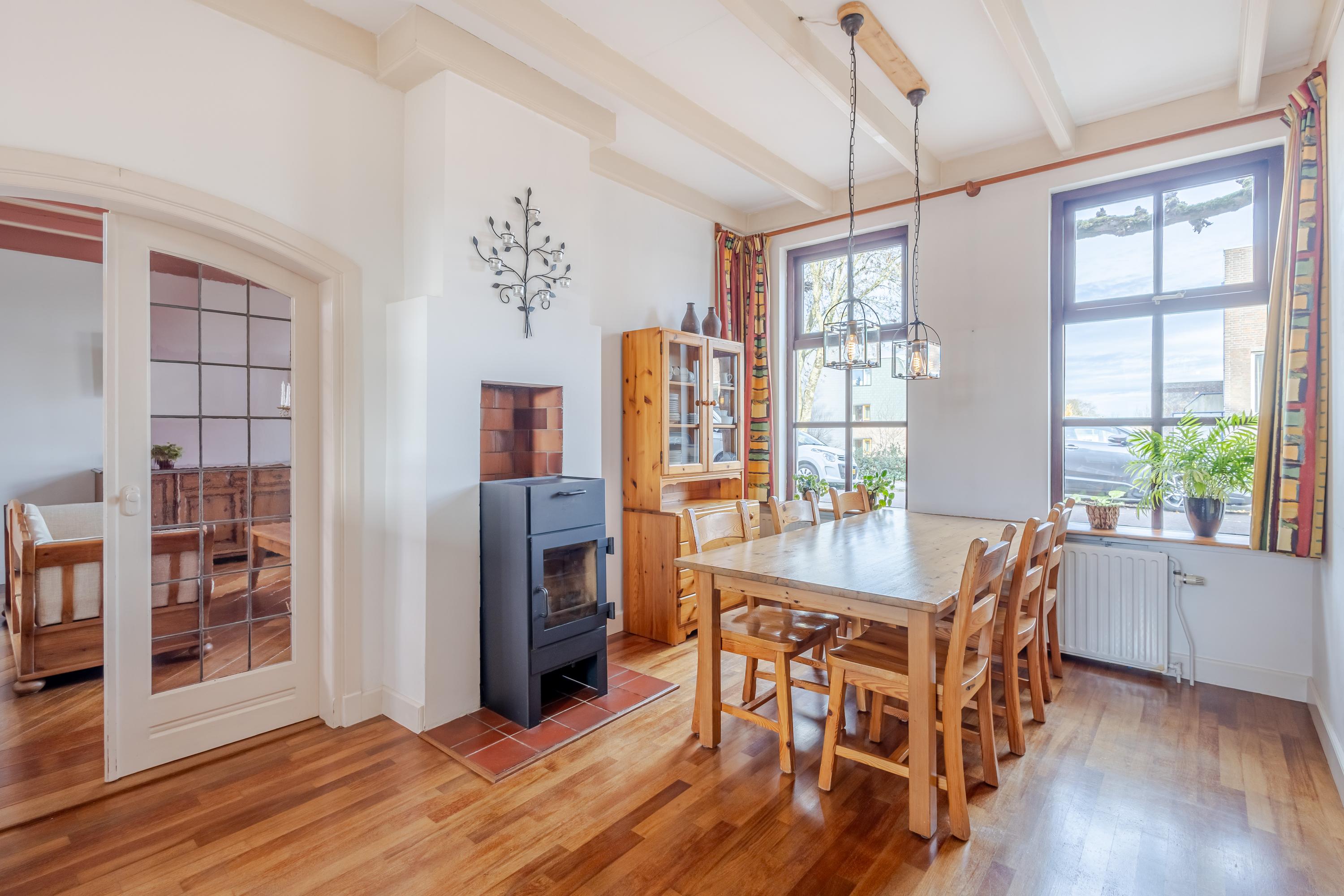 Achter de gevel schuilt een speels ingedeelde woning met veel meer ruimte dan je op het eerste gezicht vermoedt. Vanuit de hal bereik je de lichte eetkamer met gezellige houtkachel aan de linkerzijde van het huis. Vanuit hier bereik je de iets hoger gelegen keuken, de aangrenzende woonkamer en het onderhuis. De keuken aan de achterzijde is voorzien van een fijne hoek-/duo-opstelling met moderne inbouwapparatuur en biedt directe toegang tot het balkon met uitzicht over de tuin. Ook de woonkamer aan de rechterzijde van de woning beschikt over een sfeervolle houtkachel en een verhoogde bibliotheek-/ontspanningsruimte die een heerlijke plek biedt om tot rust te komen.