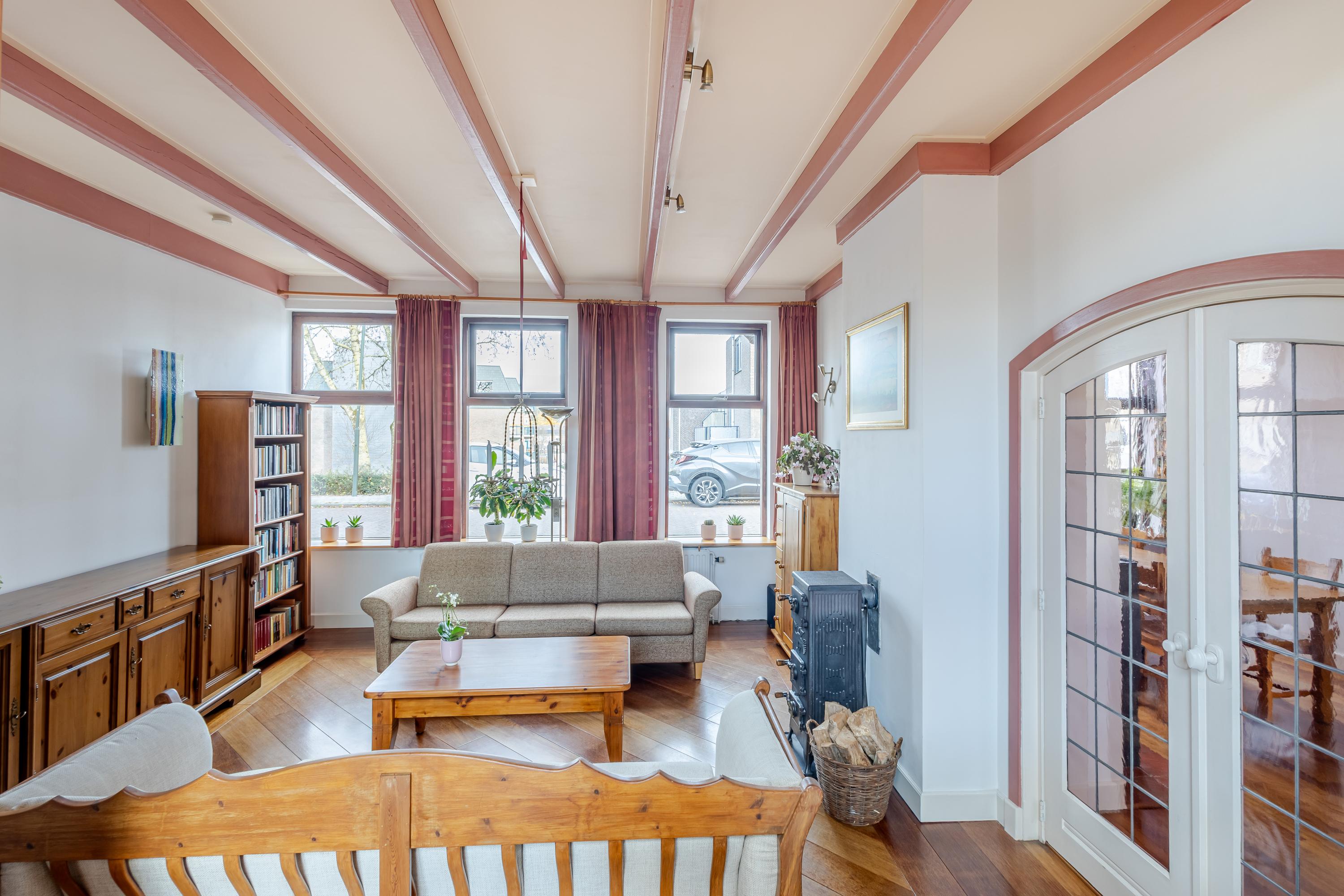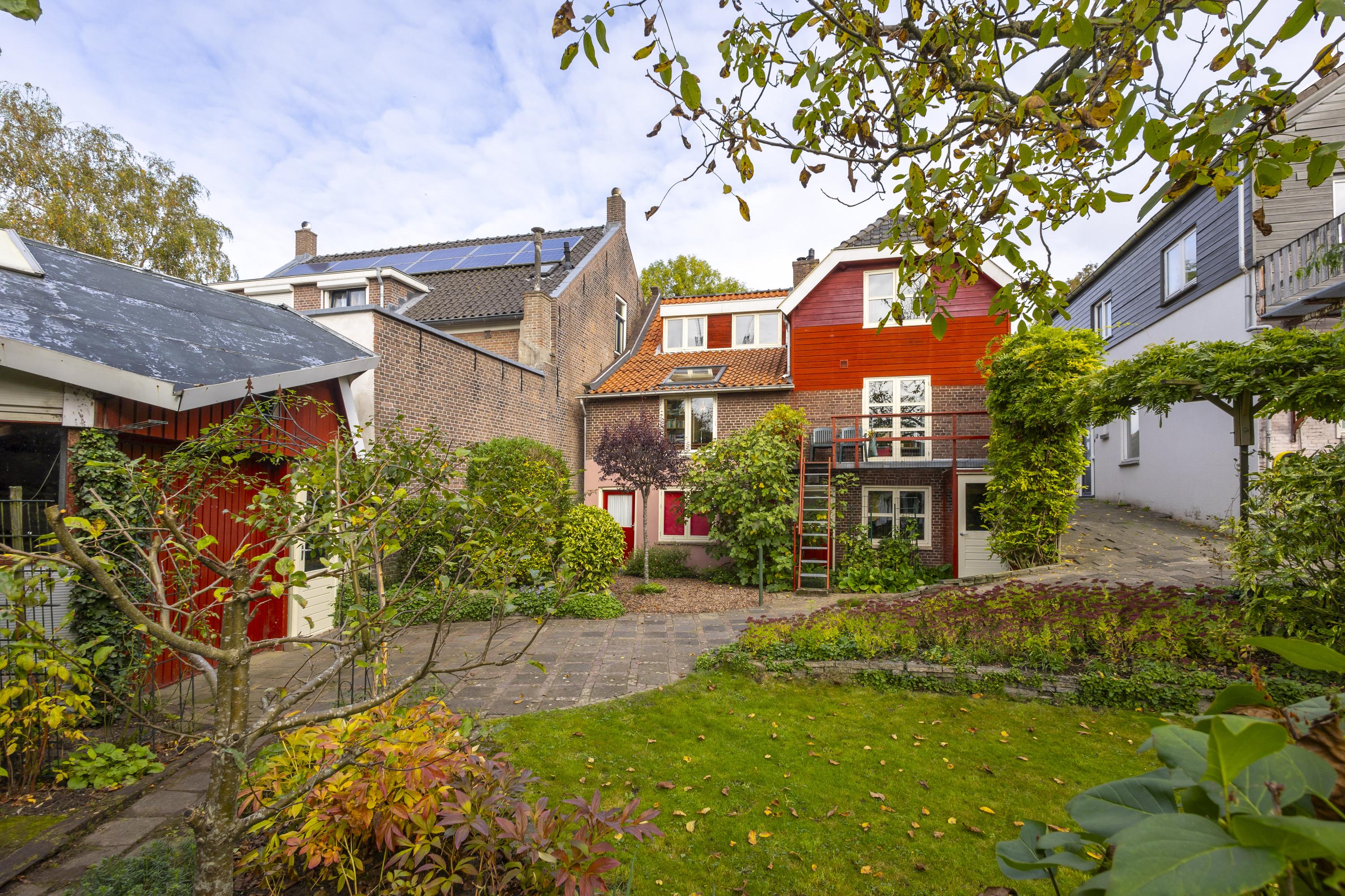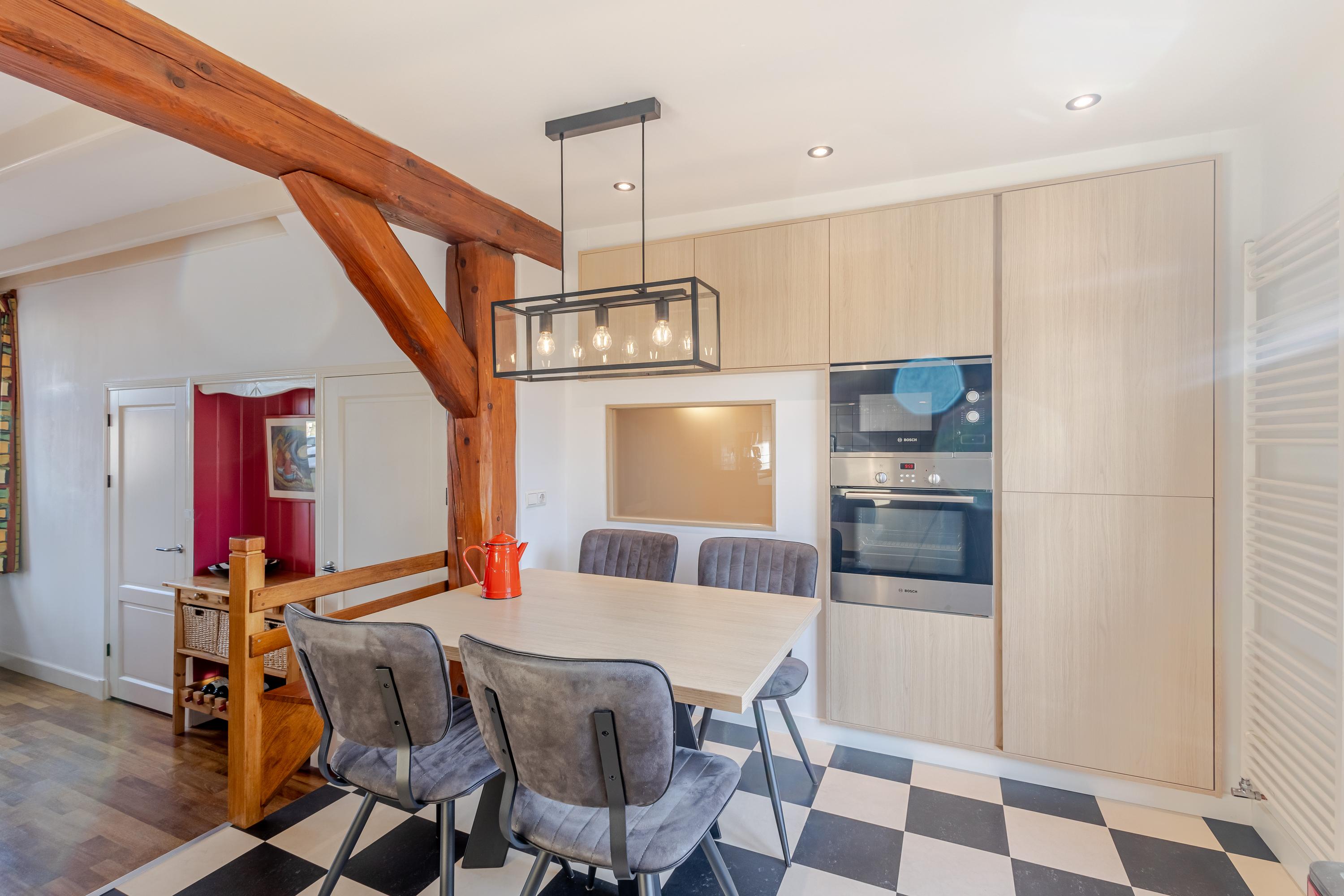 Achter de gevel schuilt een speels ingedeelde woning met veel meer ruimte dan je op het eerste gezicht vermoedt. Vanuit de hal bereik je de lichte eetkamer met gezellige houtkachel aan de linkerzijde van het huis. Vanuit hier bereik je de iets hoger gelegen keuken, de aangrenzende woonkamer en het onderhuis. De keuken aan de achterzijde is voorzien van een fijne hoek-/duo-opstelling met moderne inbouwapparatuur en biedt directe toegang tot het balkon met uitzicht over de tuin. Ook de woonkamer aan de rechterzijde van de woning beschikt over een sfeervolle houtkachel en een verhoogde bibliotheek-/ontspanningsruimte die een heerlijke plek biedt om tot rust te komen.