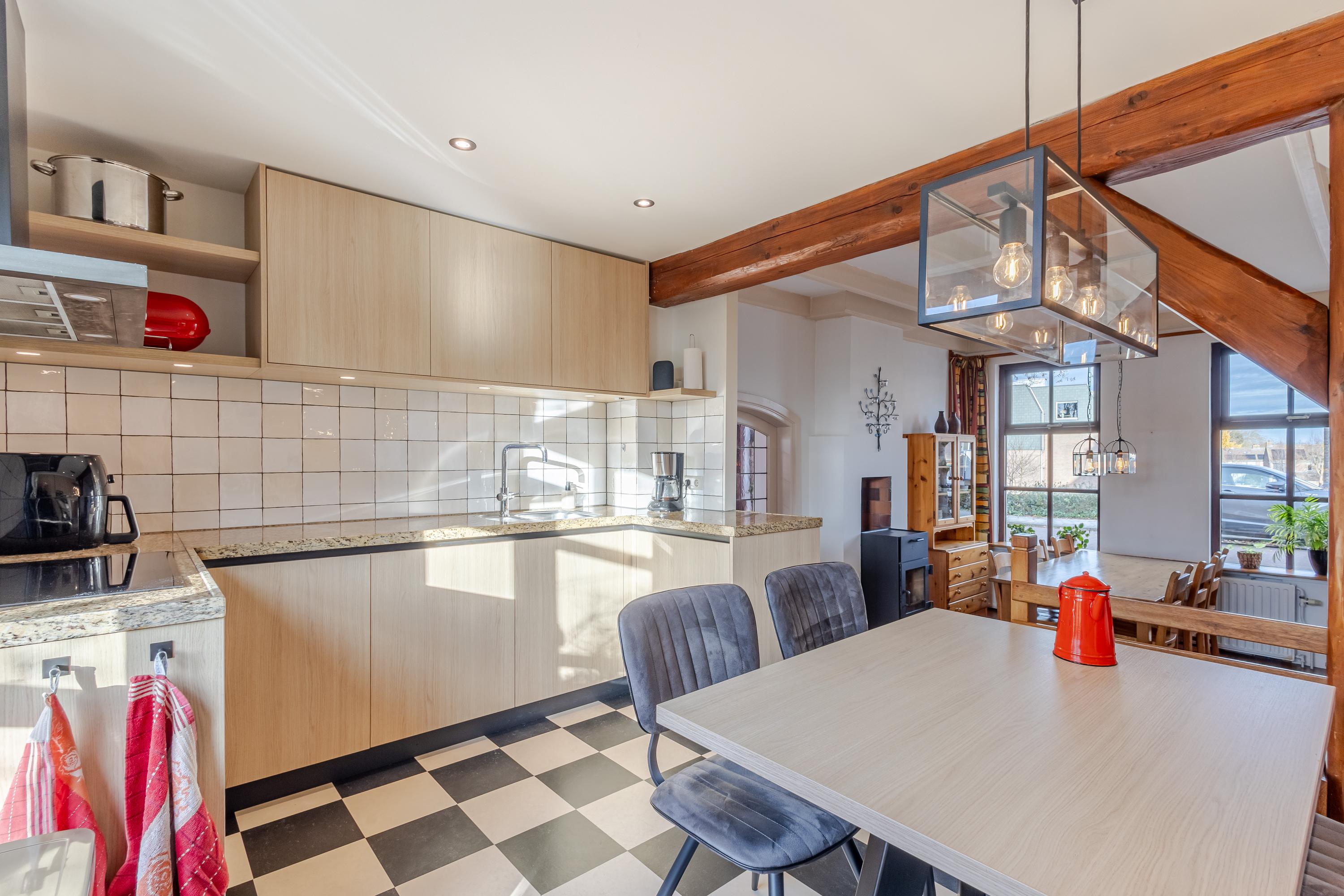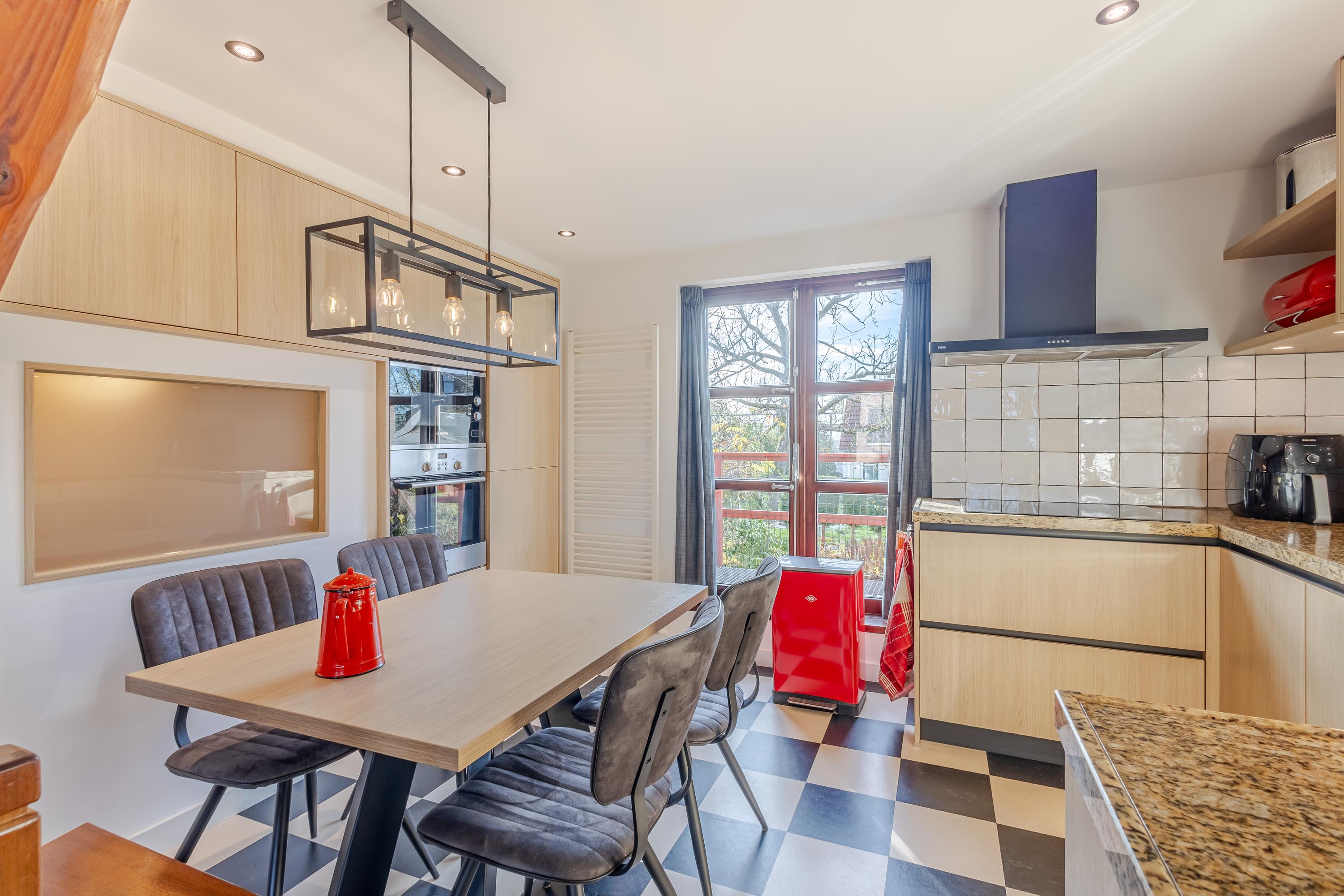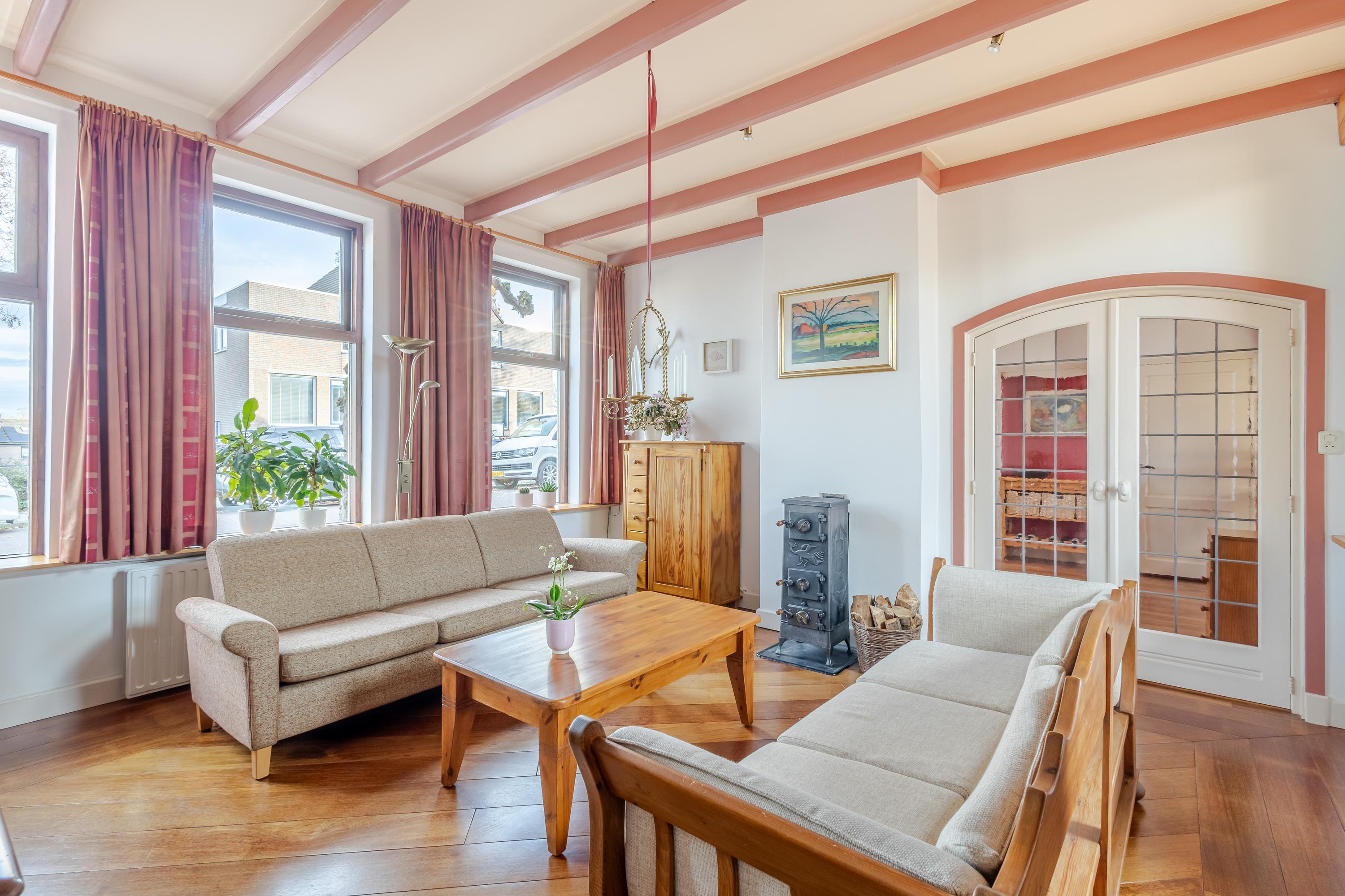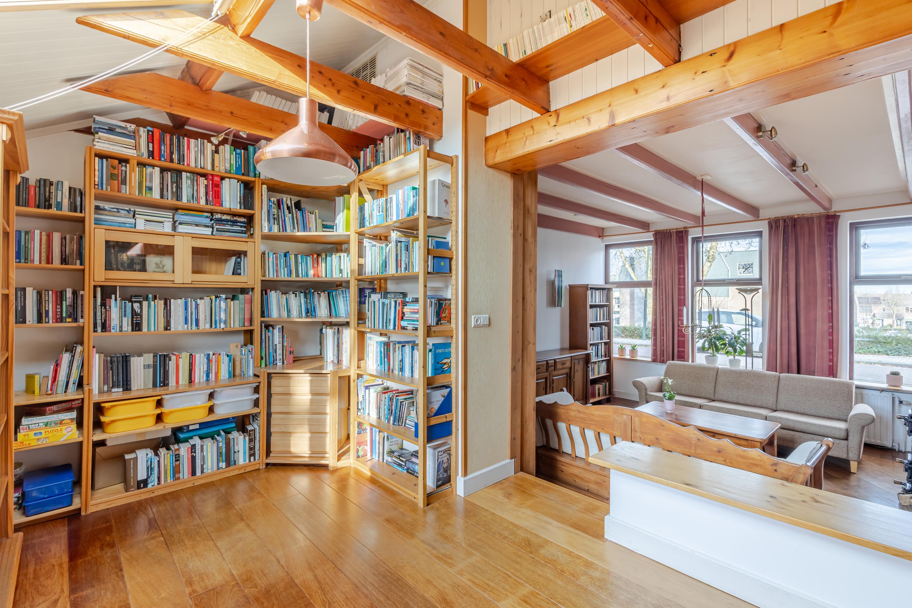Achter de gevel schuilt een speels ingedeelde woning met veel meer ruimte dan je op het eerste gezicht vermoedt. Vanuit de hal bereik je de lichte eetkamer met gezellige houtkachel aan de linkerzijde van het huis. Vanuit hier bereik je de iets hoger gelegen keuken, de aangrenzende woonkamer en het onderhuis. De keuken aan de achterzijde is voorzien van een fijne hoek-/duo-opstelling met moderne inbouwapparatuur en biedt directe toegang tot het balkon met uitzicht over de tuin. Ook de woonkamer aan de rechterzijde van de woning beschikt over een sfeervolle houtkachel en een verhoogde bibliotheek-/ontspanningsruimte die een heerlijke plek biedt om tot rust te komen.