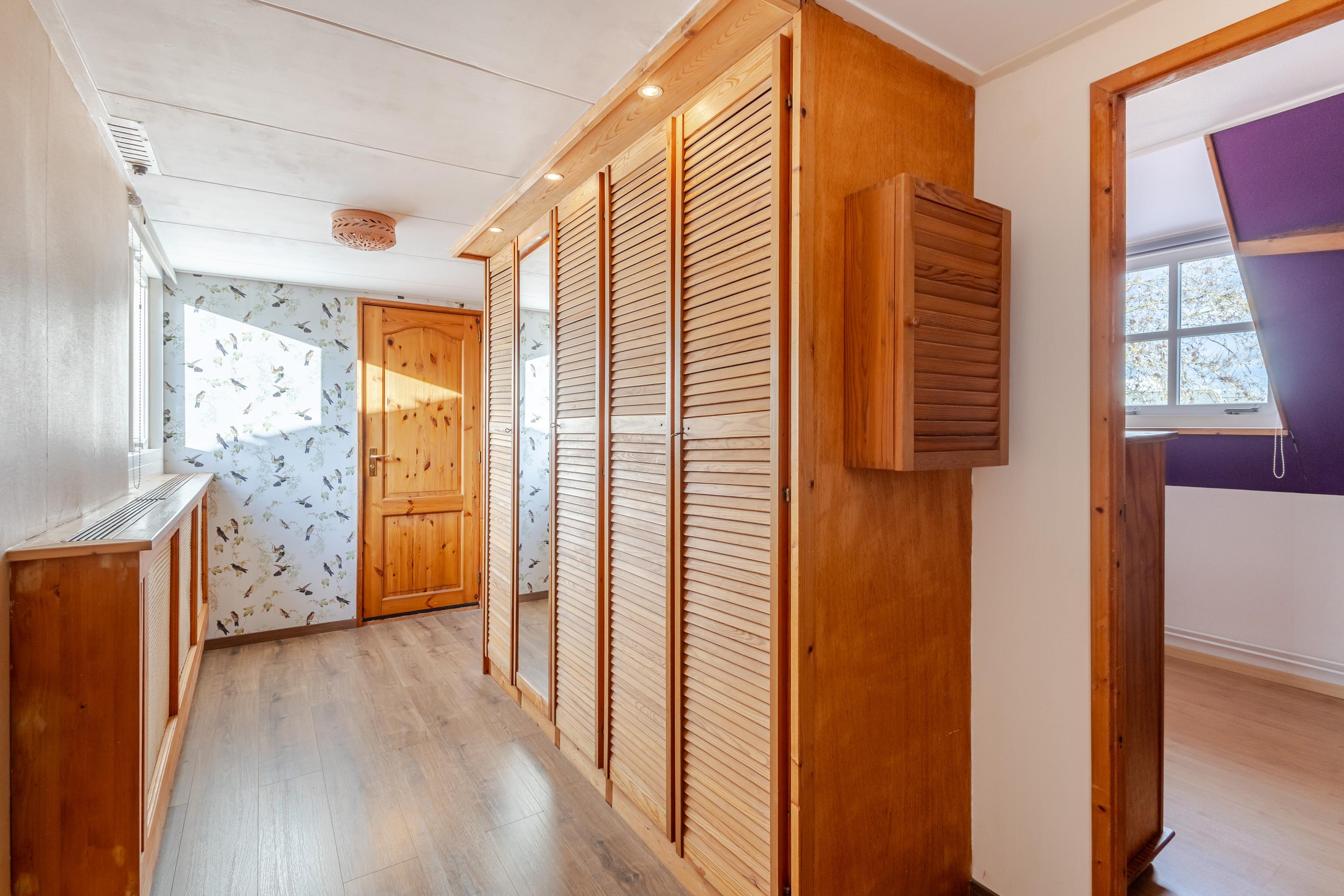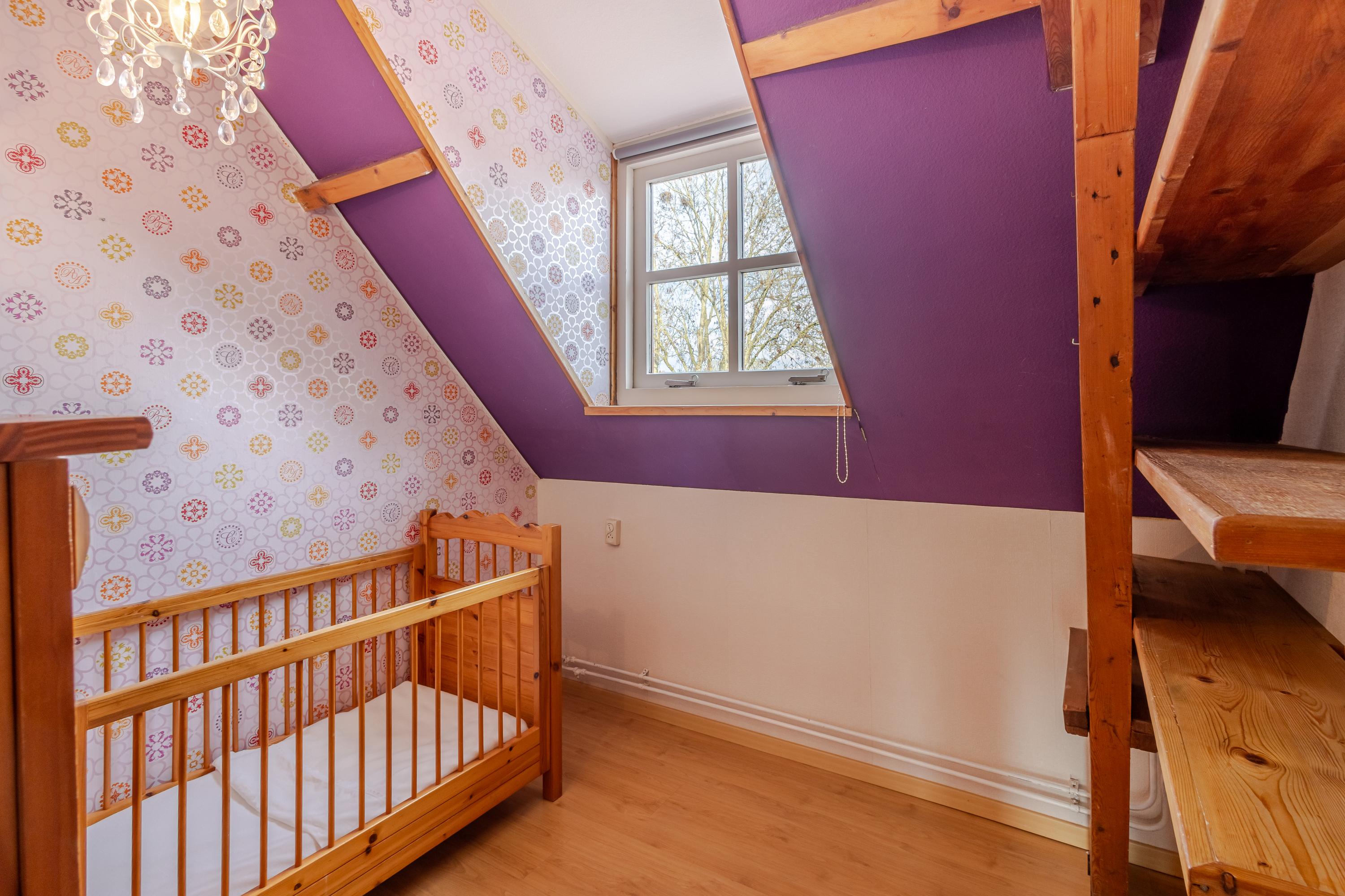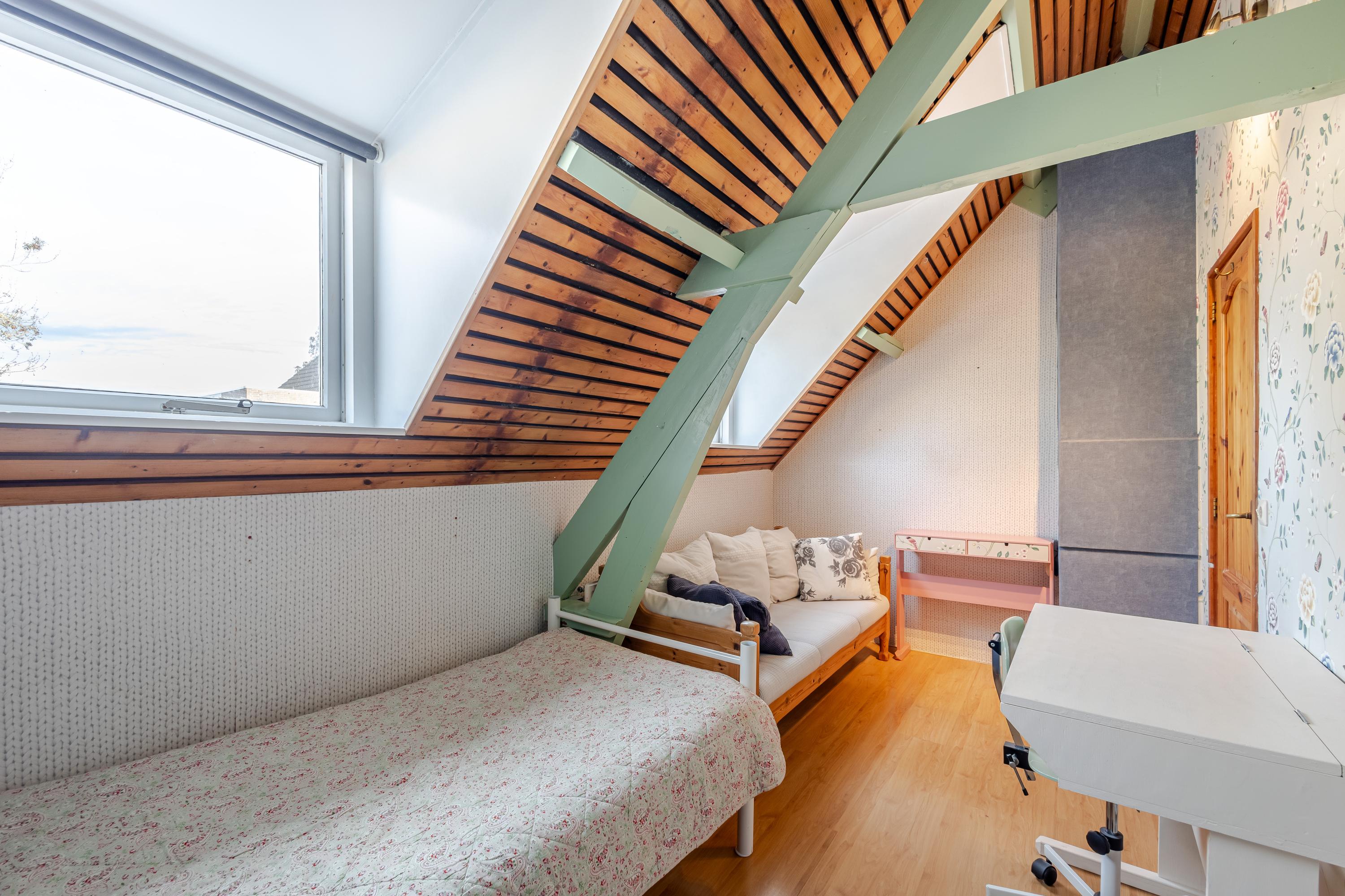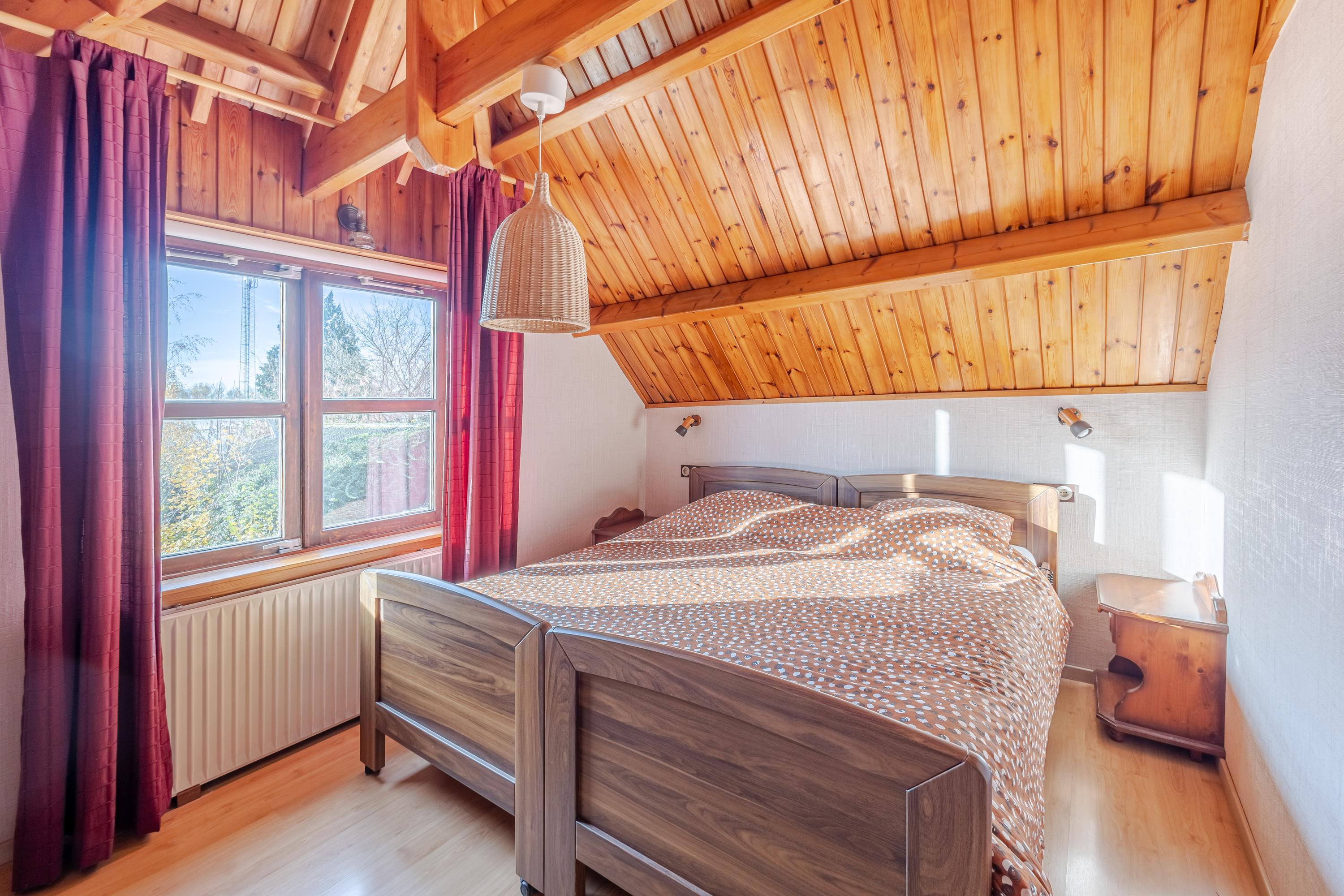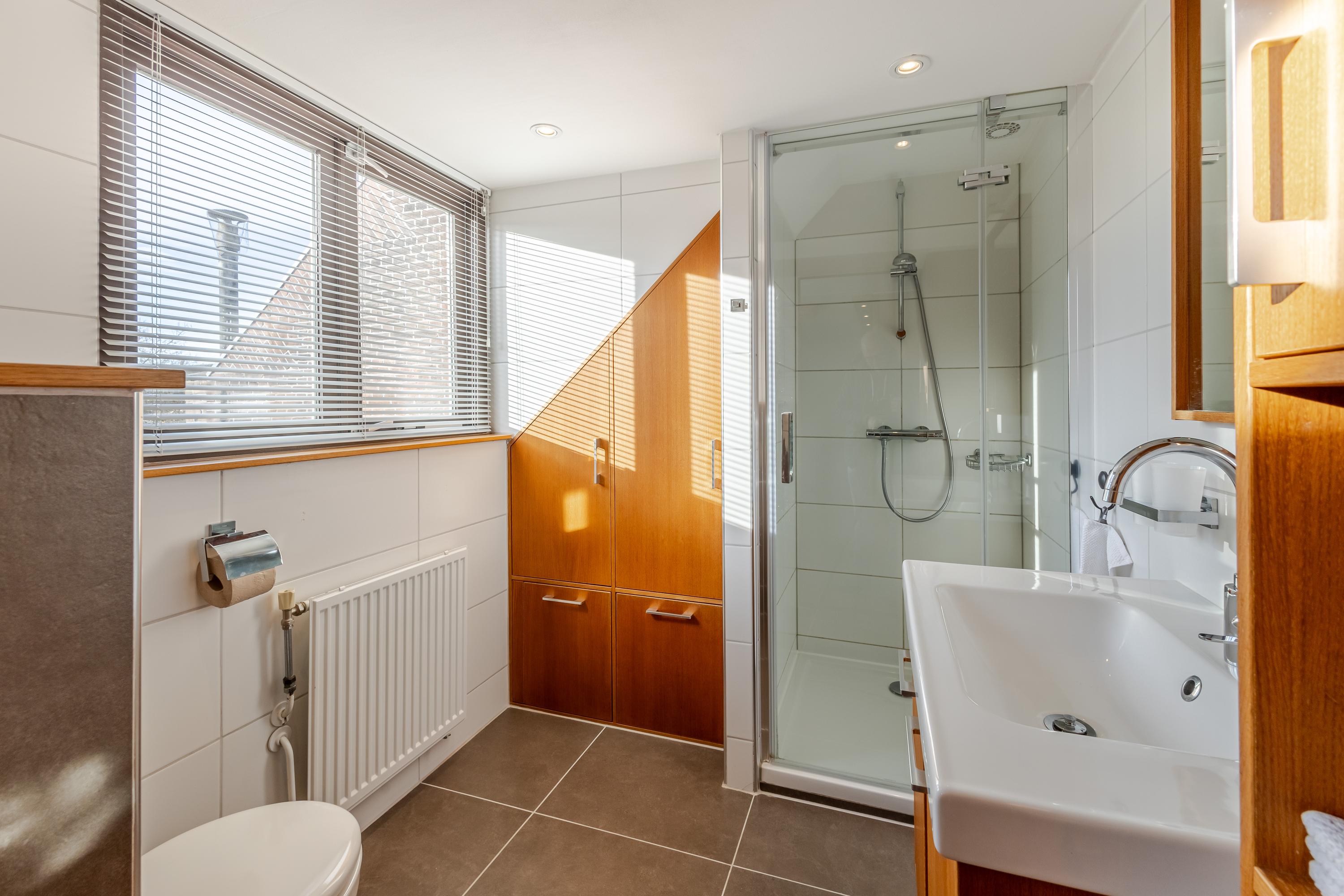 Op de eerste verdieping bevinden zich maar liefst vier slaapkamers en een comfortabele badkamer met ruime douche, tweede toilet en eikenhouten maatwerk wastafelmeubel. De gedeeltelijk hoge plafonds tot in de nok, zichtbare spanten en mooi houtwerk zorgen voor een warme, landelijke sfeer op deze verdieping.