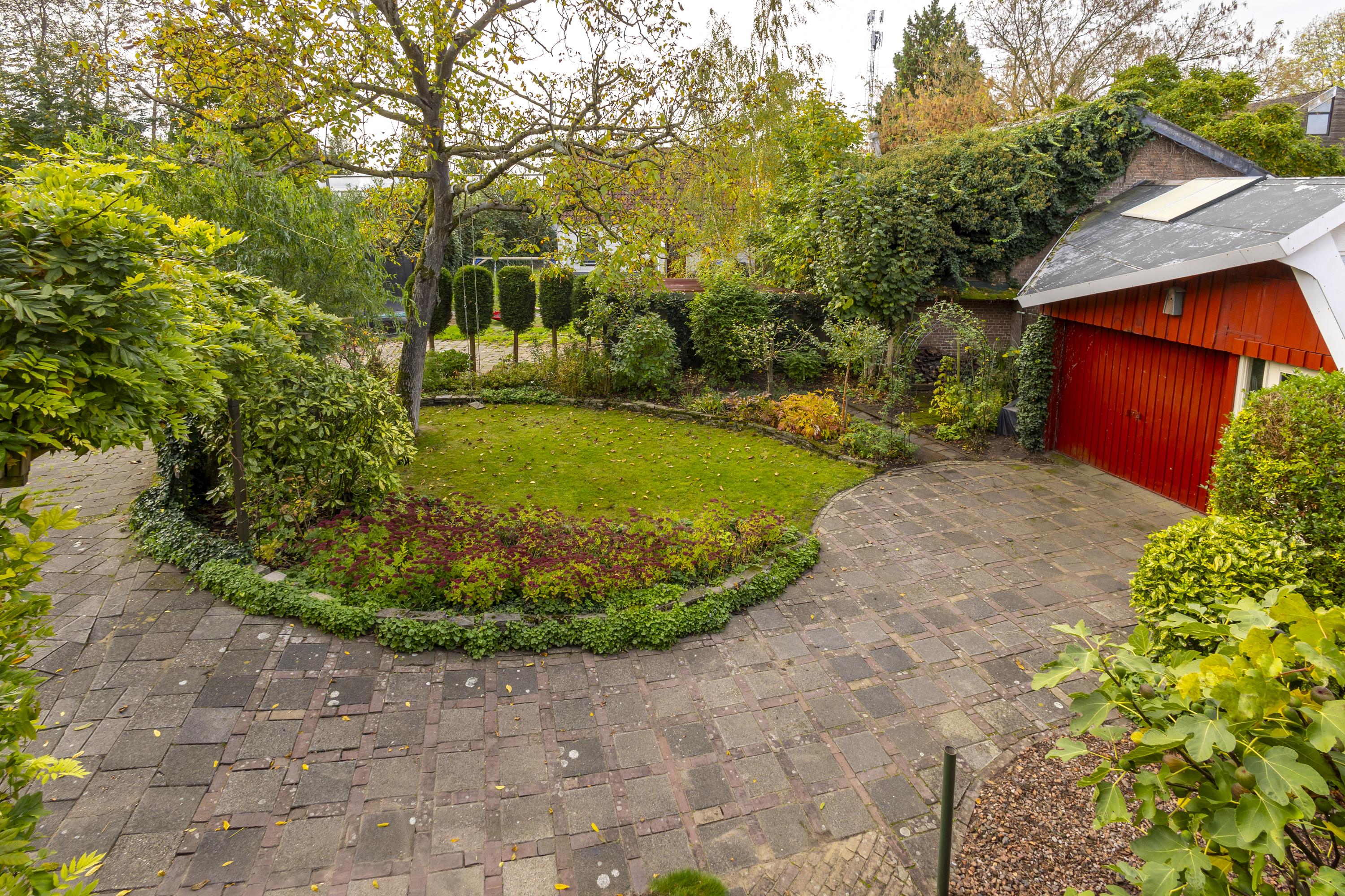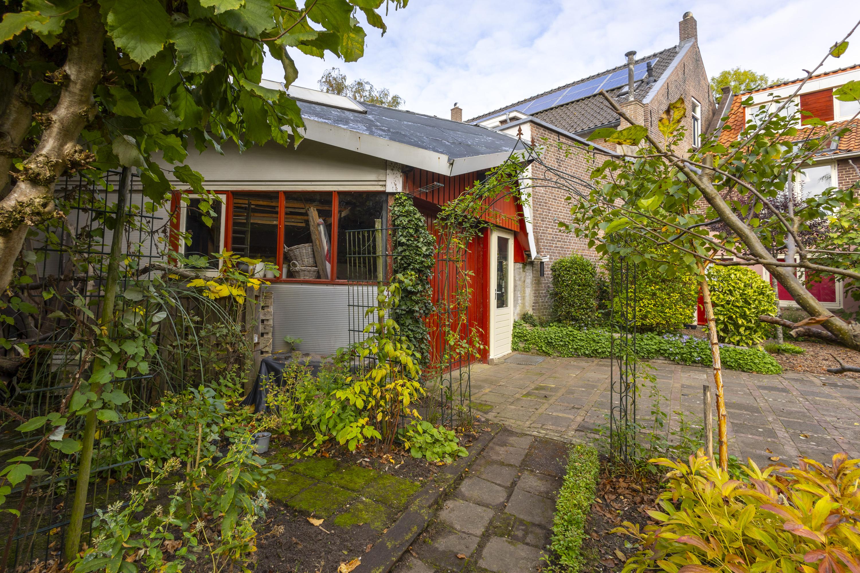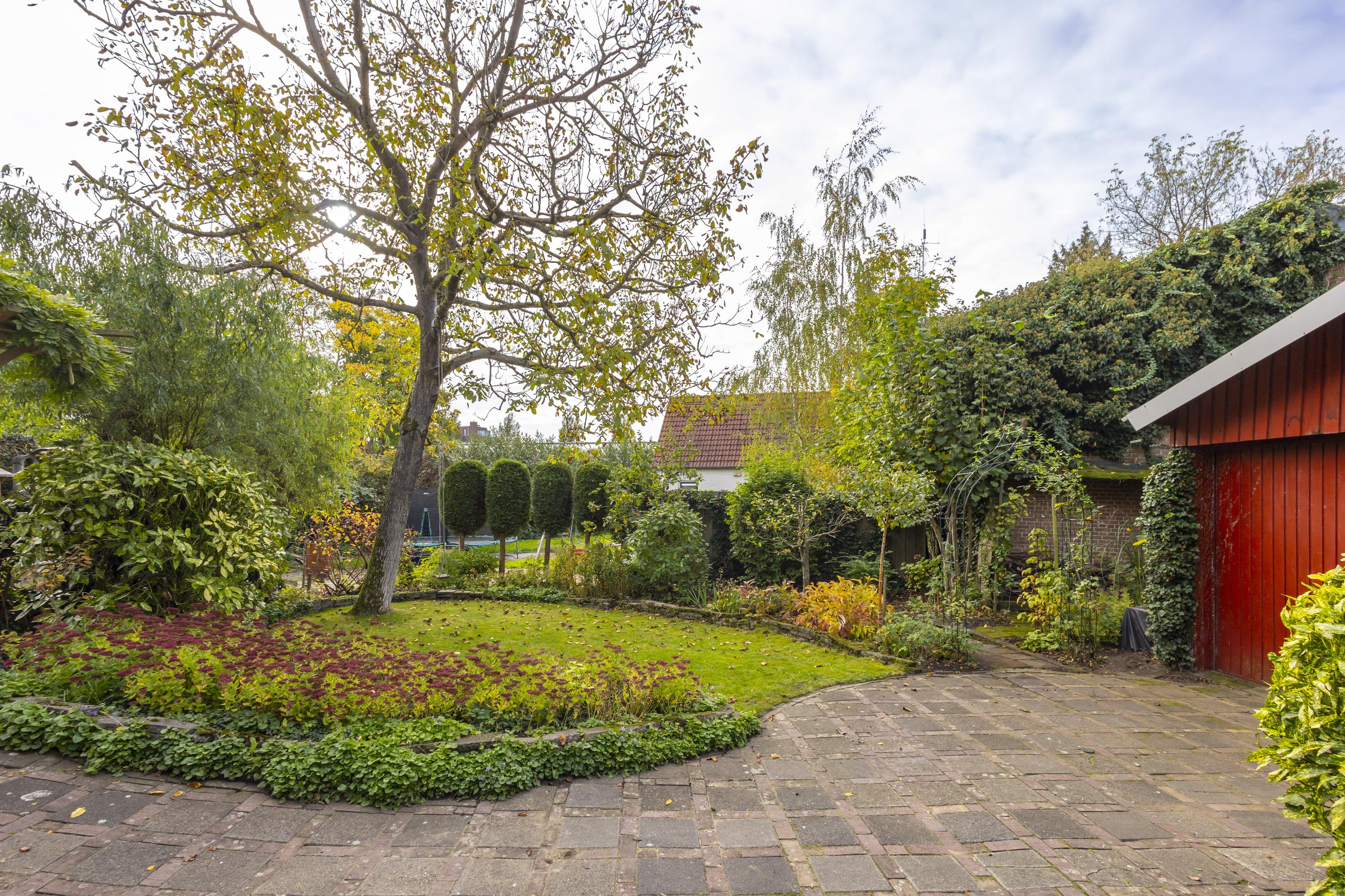 De royale, op het zuiden gelegen tuin is een snoepje voor degene met ‘groene’ vingers. Met grindpartijen, gazon, kleurrijke bloemenperken, sierstraatwerk, heesters, een pergola en zelfs een vijgenboom, past deze tuin perfect bij het karakter van de woning. De grote schuur van ca. 42 m² maakt het plaatje compleet en zal iedere doe-het-zelver of hobbyist blij maken.