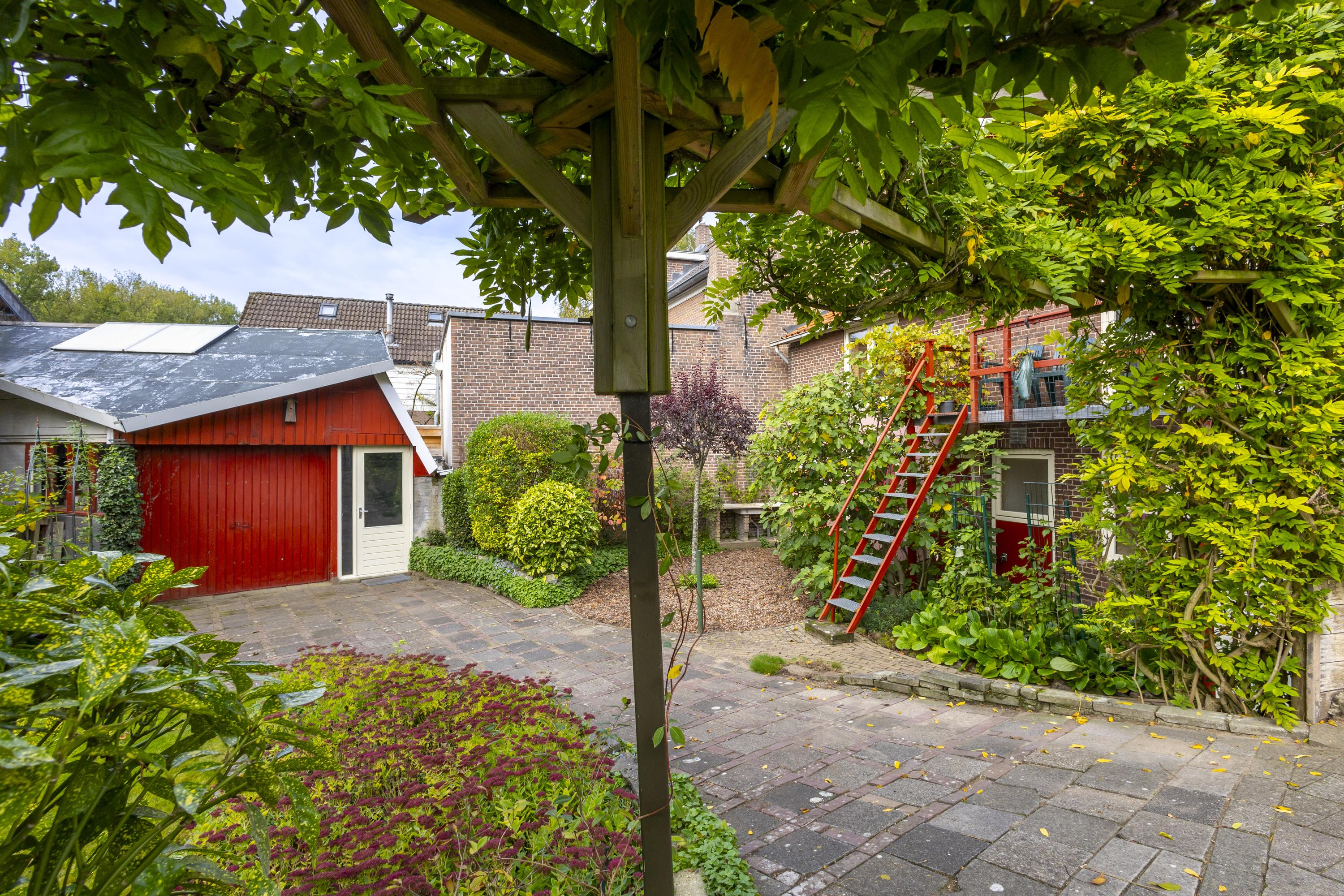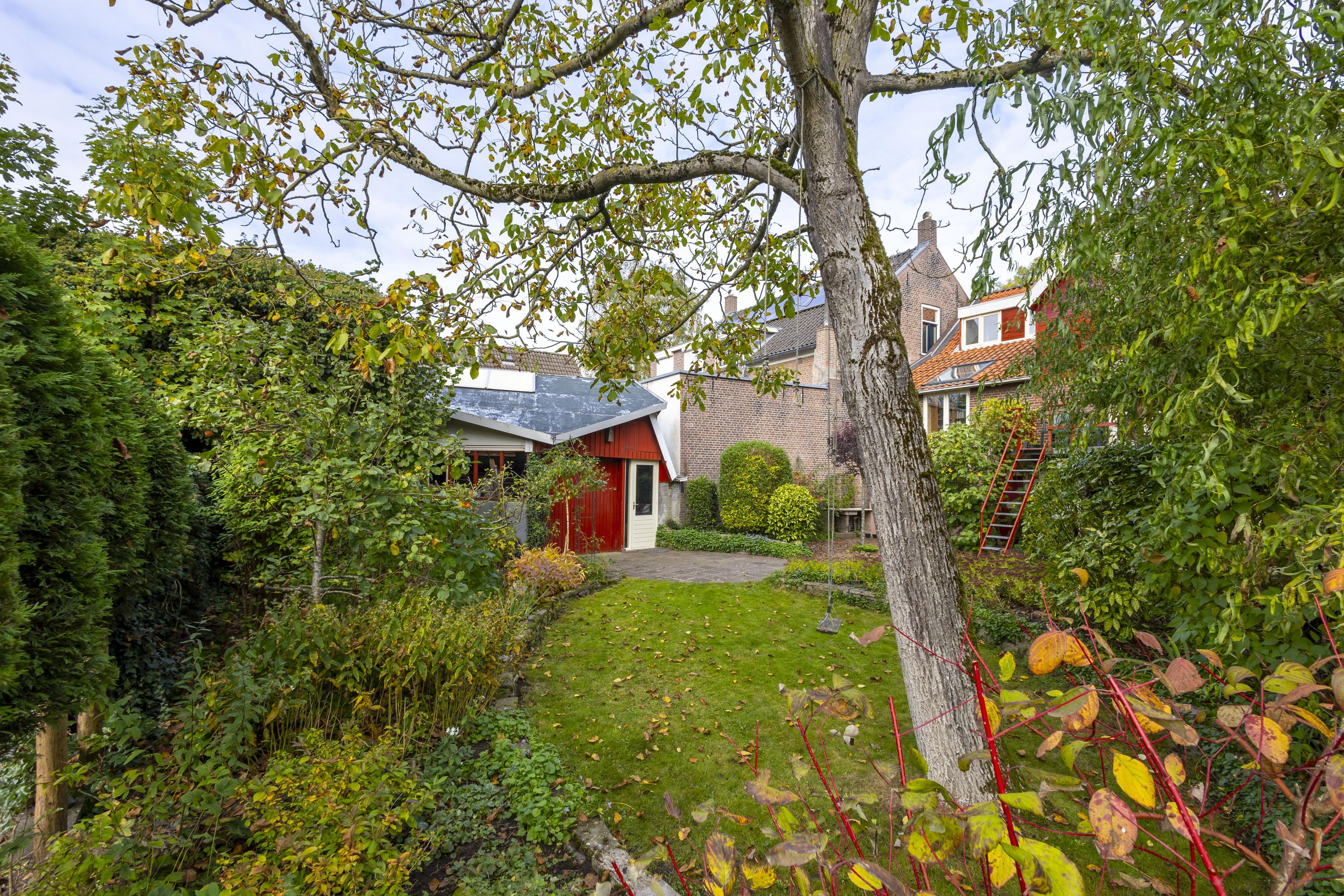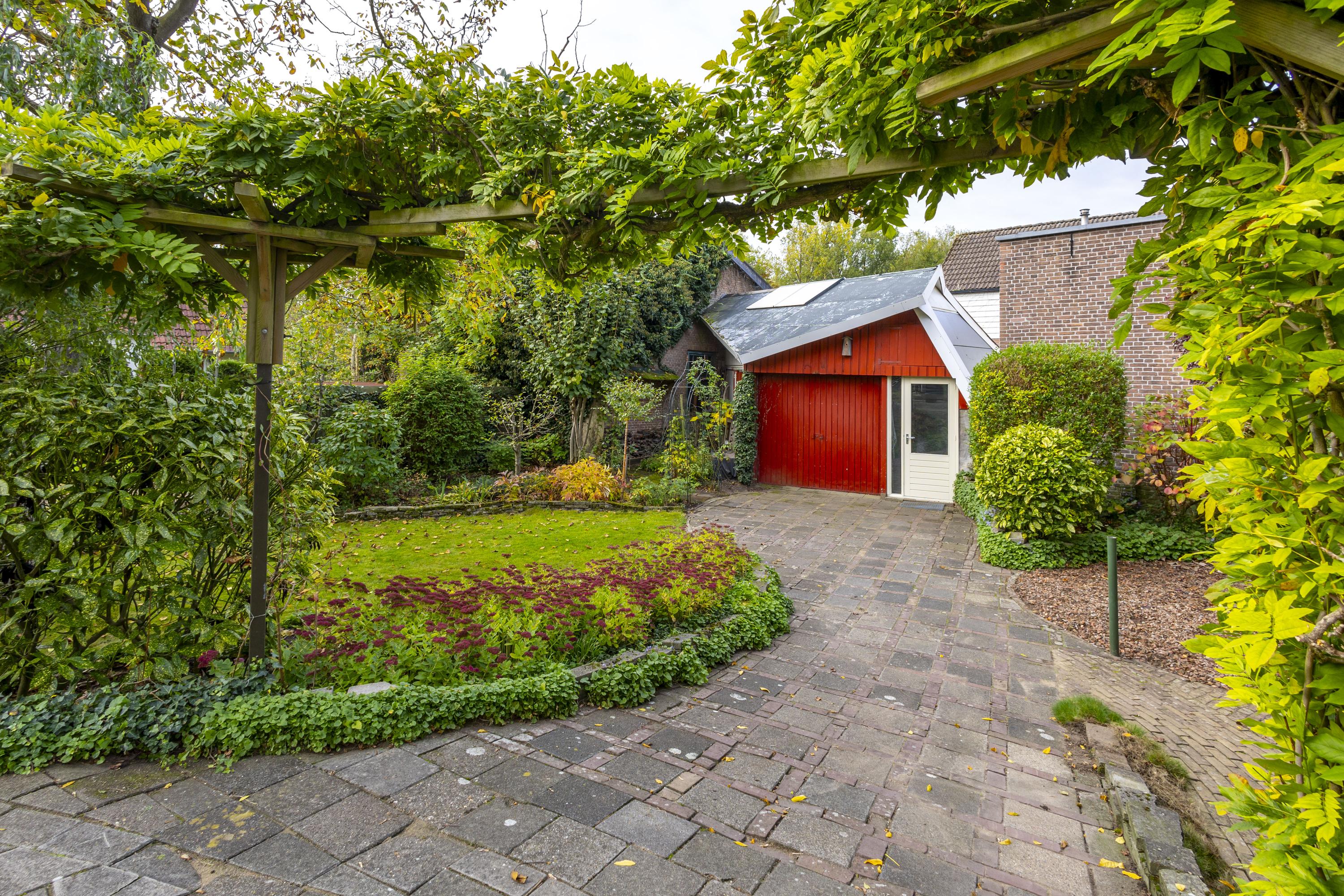 De royale, op het zuiden gelegen tuin is een snoepje voor degene met ‘groene’ vingers. Met grindpartijen, gazon, kleurrijke bloemenperken, sierstraatwerk, heesters, een pergola en zelfs een vijgenboom, past deze tuin perfect bij het karakter van de woning. De grote schuur van ca. 42 m² maakt het plaatje compleet en zal iedere doe-het-zelver of hobbyist blij maken.