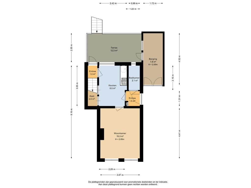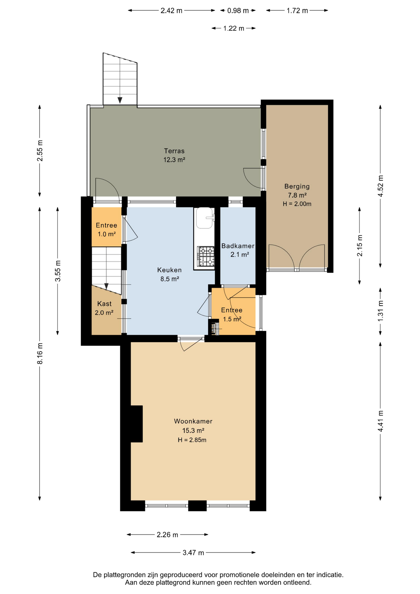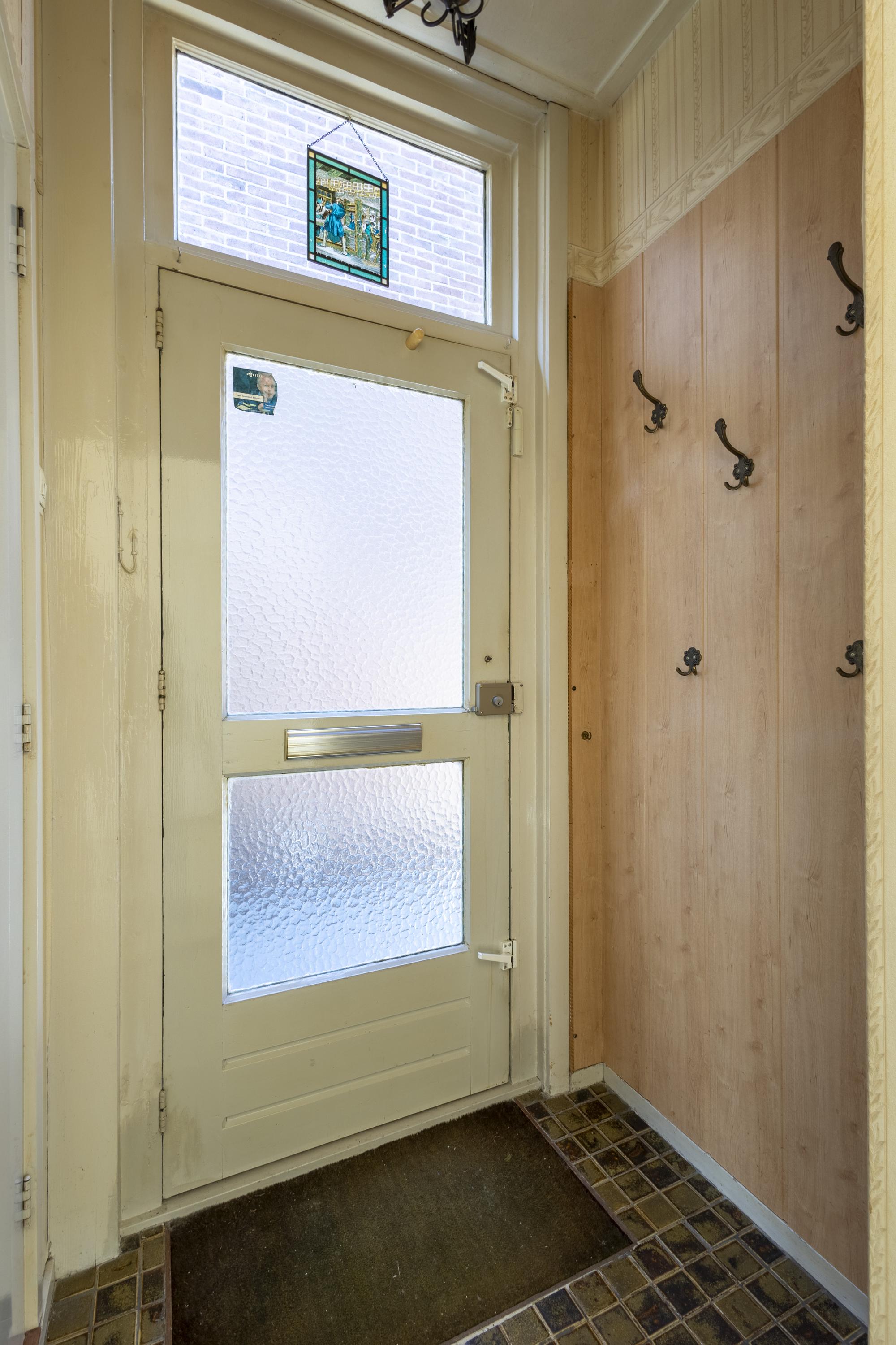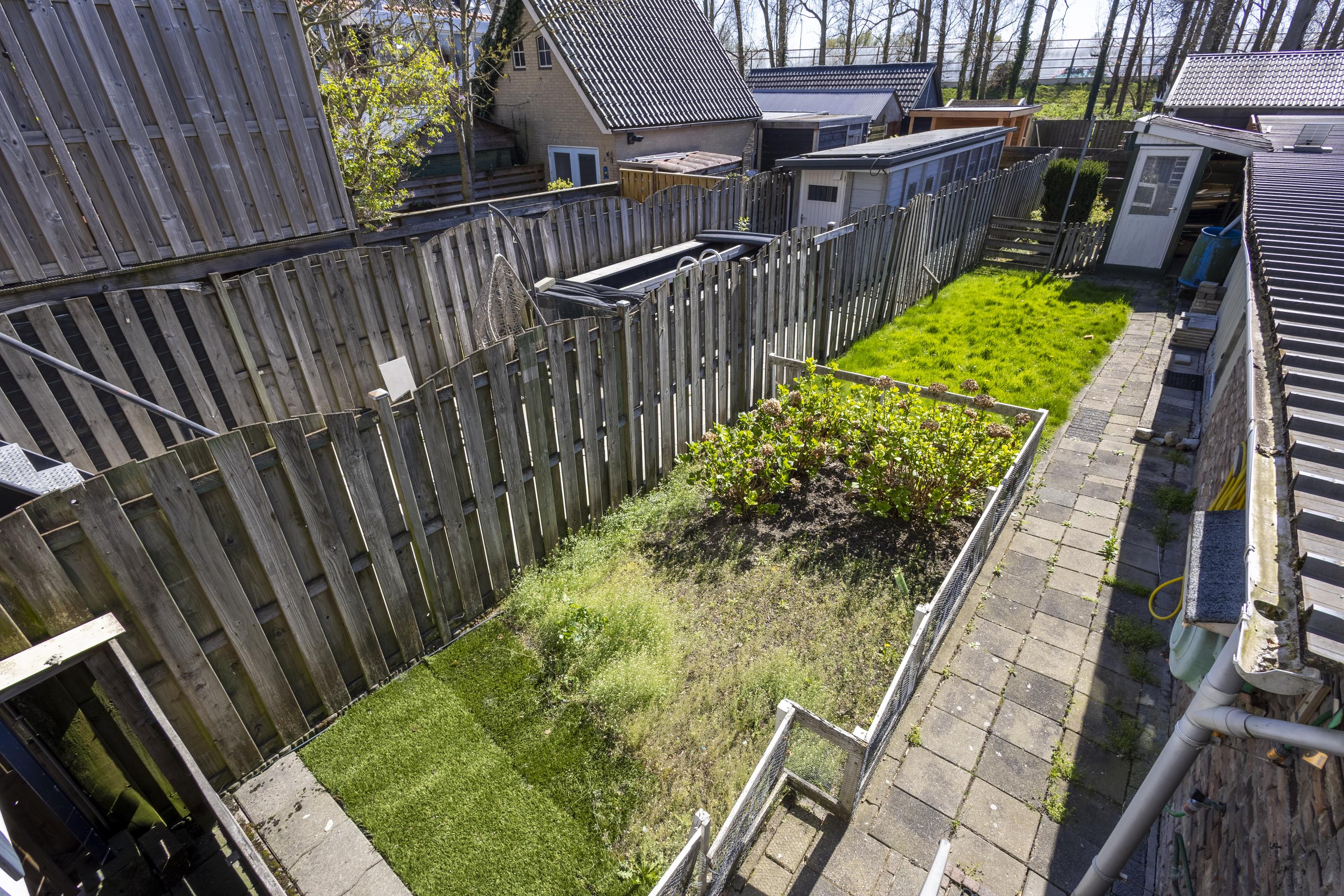 De entree bevindt zich aan de zijkant van de woning en leidt naar de hal met meterkast en toegang tot de keuken en badkamer, voorzien van douchekuip en toilet. De keuken staat in verbinding met de woonkamer aan de voorzijde, waar aansluitingen voor een gaskachel aanwezig zijn. Vanuit de keuken bereik je het achterportaal met toegang tot zowel de eerste verdieping als de tuin.